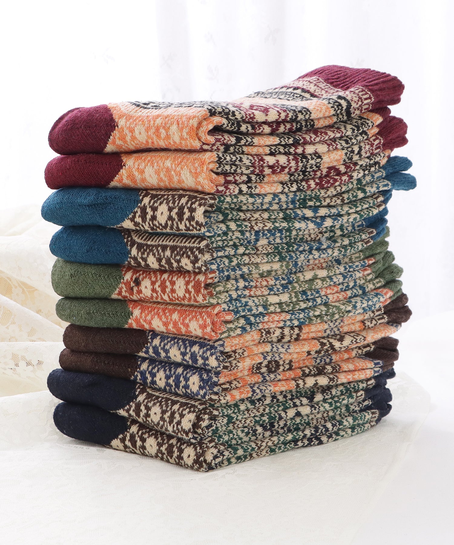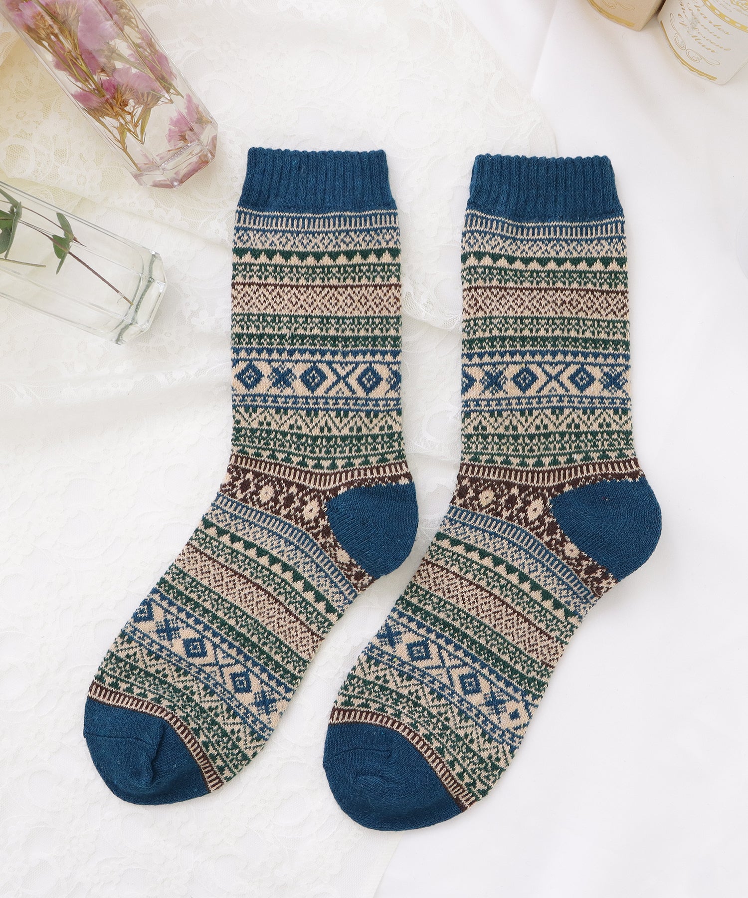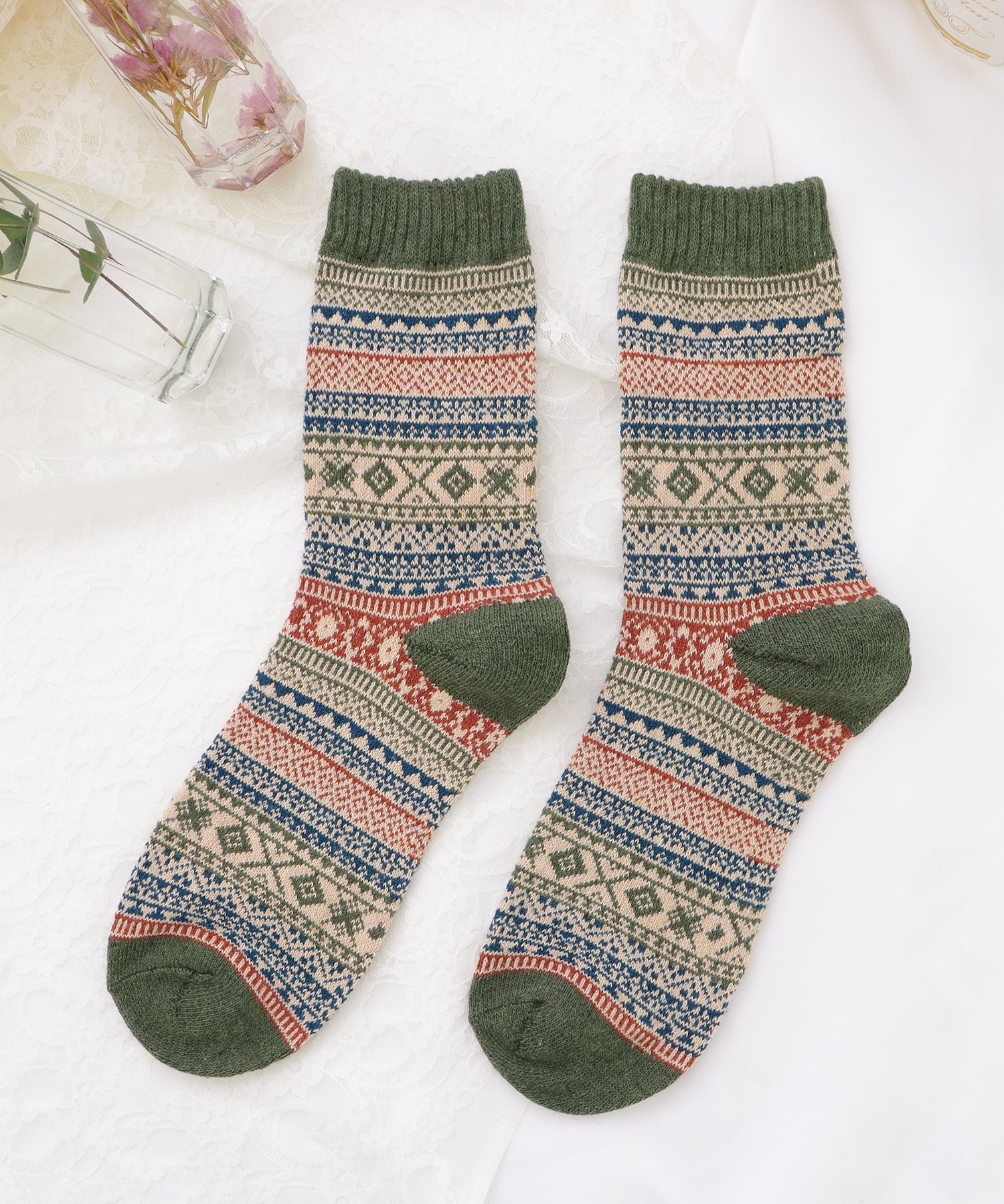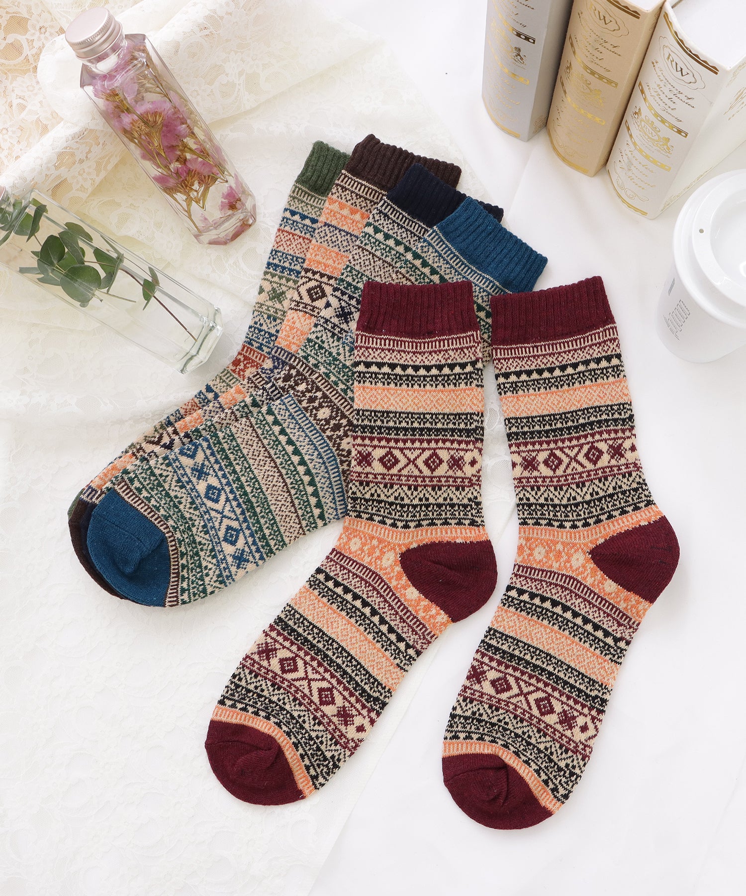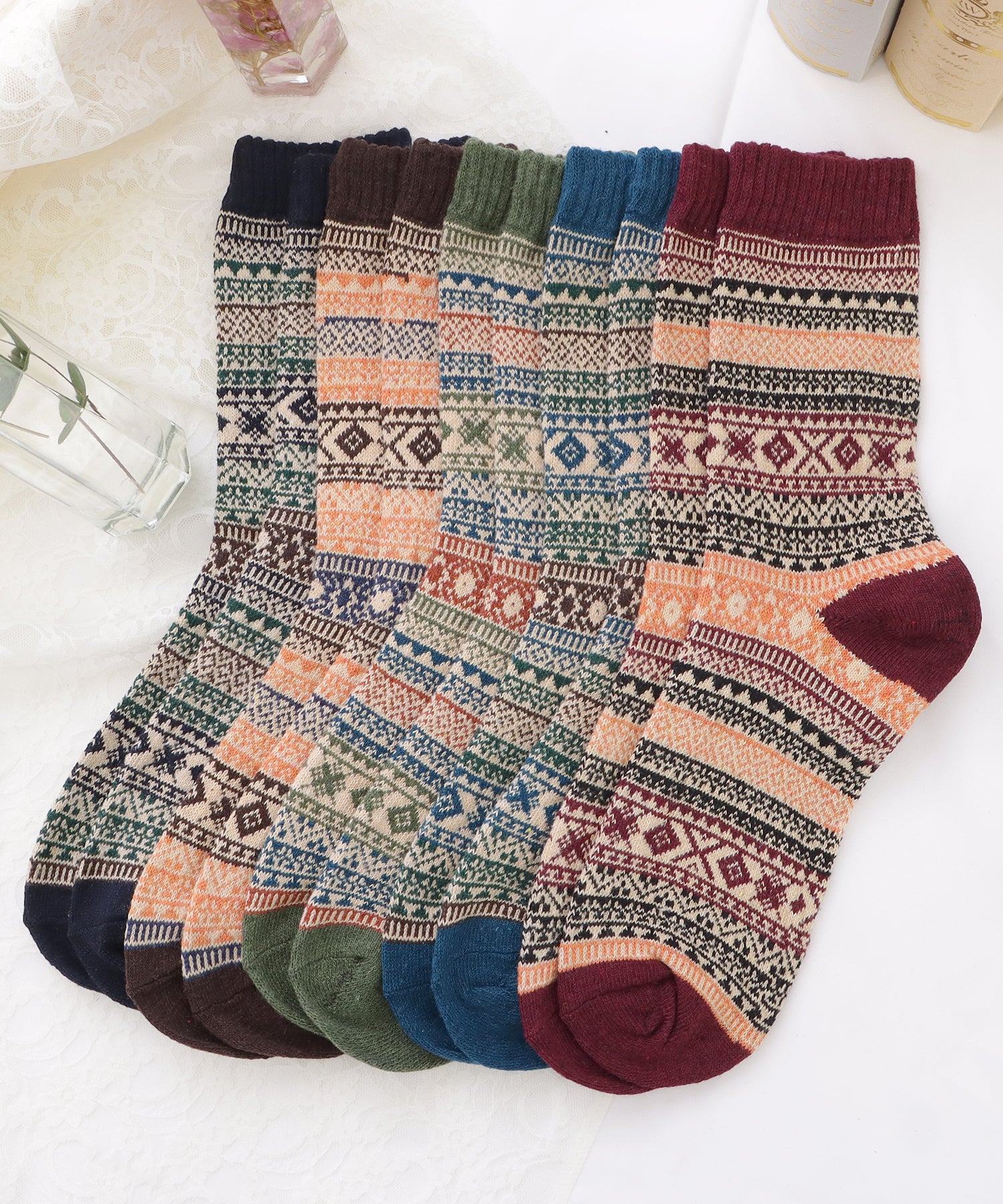 幾何学模様の組み合わせで民族調のルックスに仕上げた靴下。