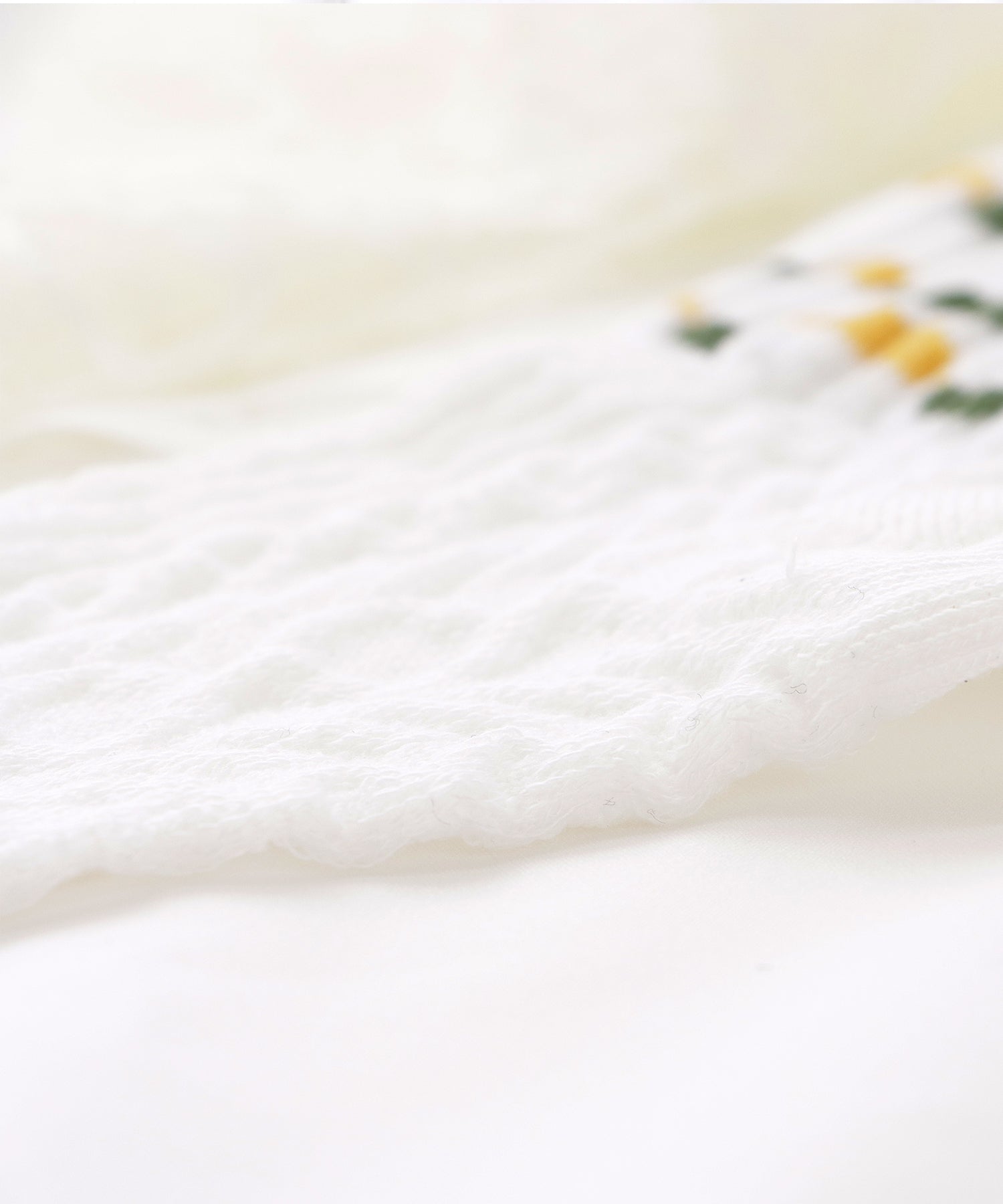 花やクマなどのポップなモチーフに、立体的なチェーン編みの生地で表情豊かに仕上げたデザイン。
