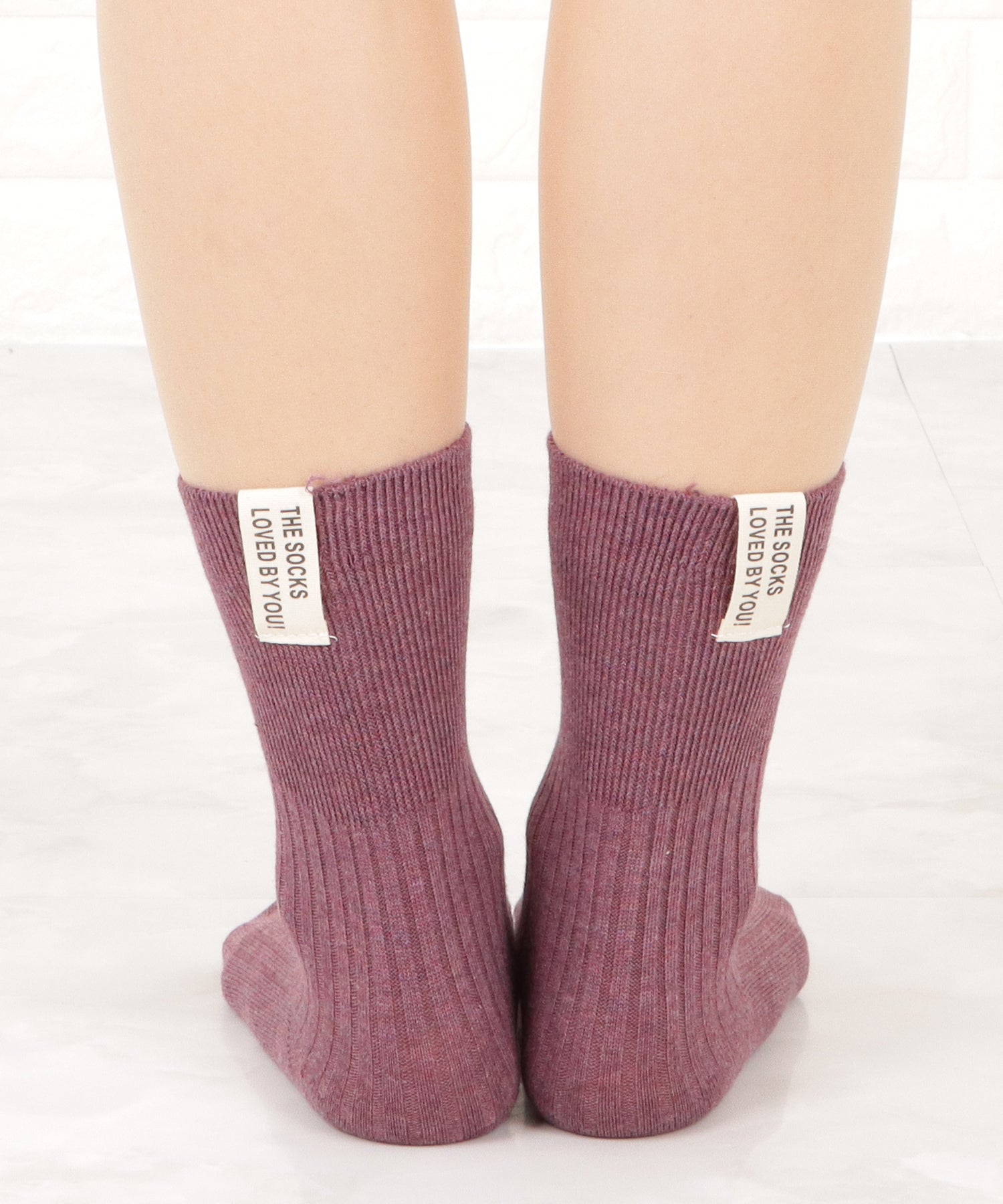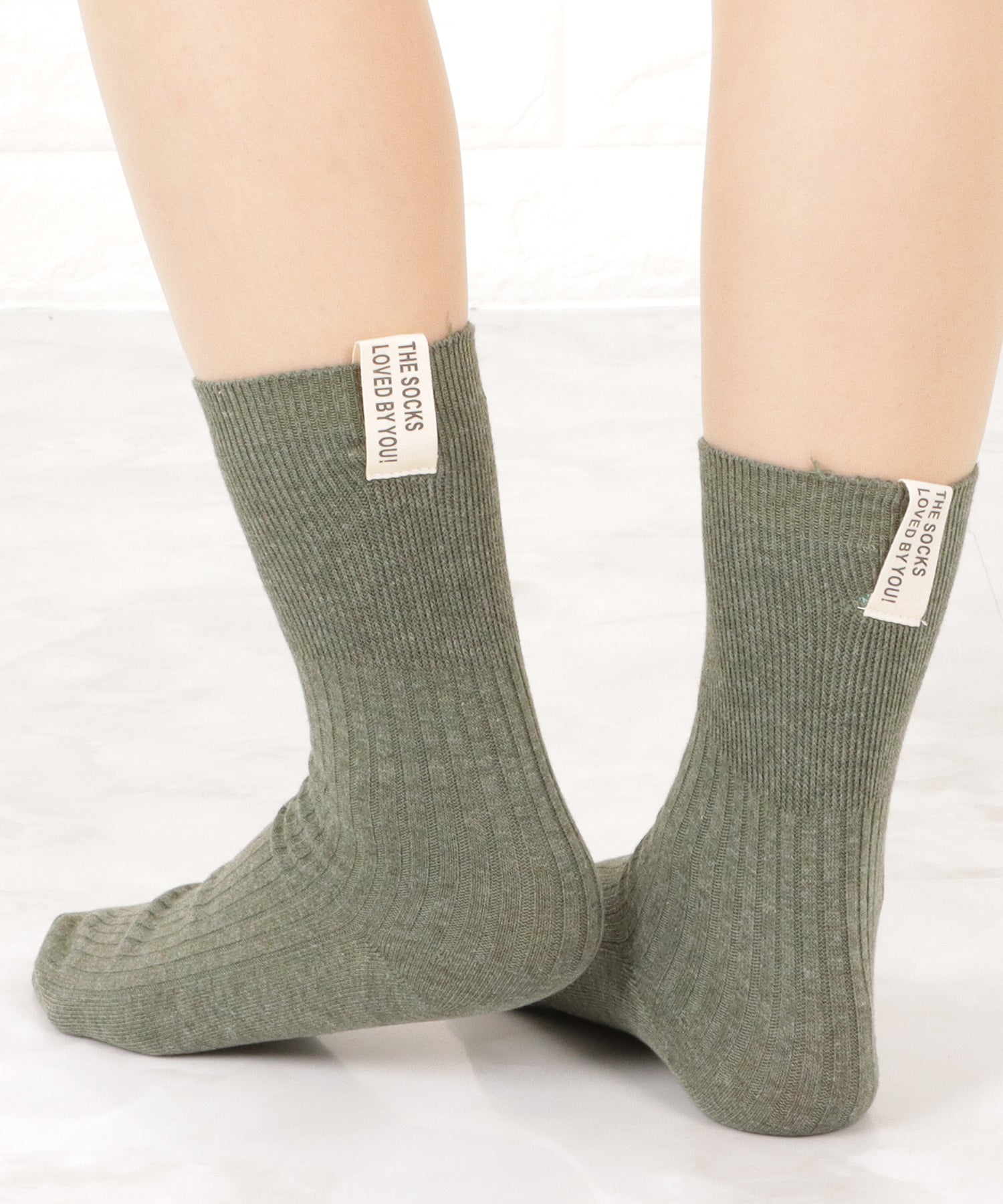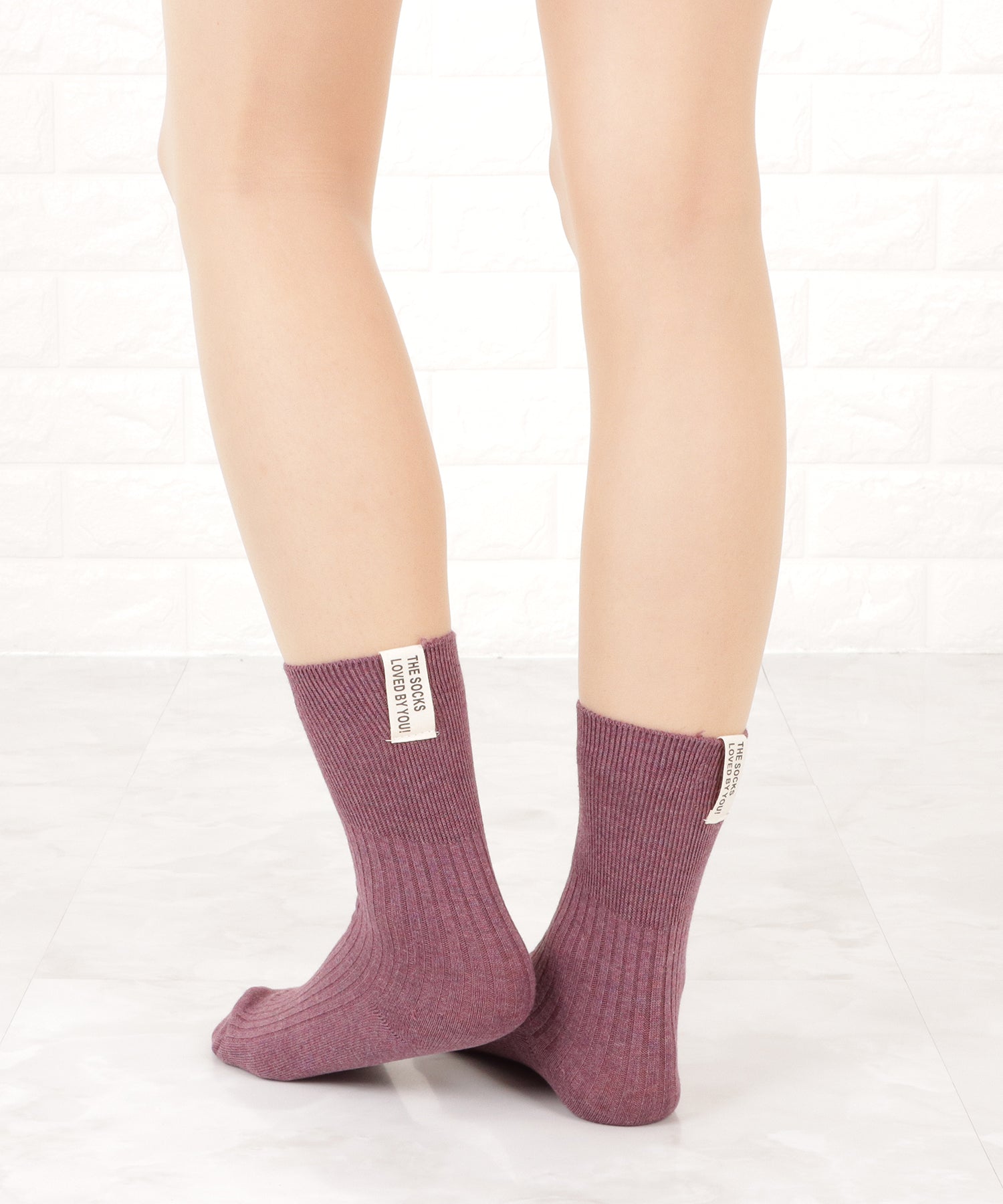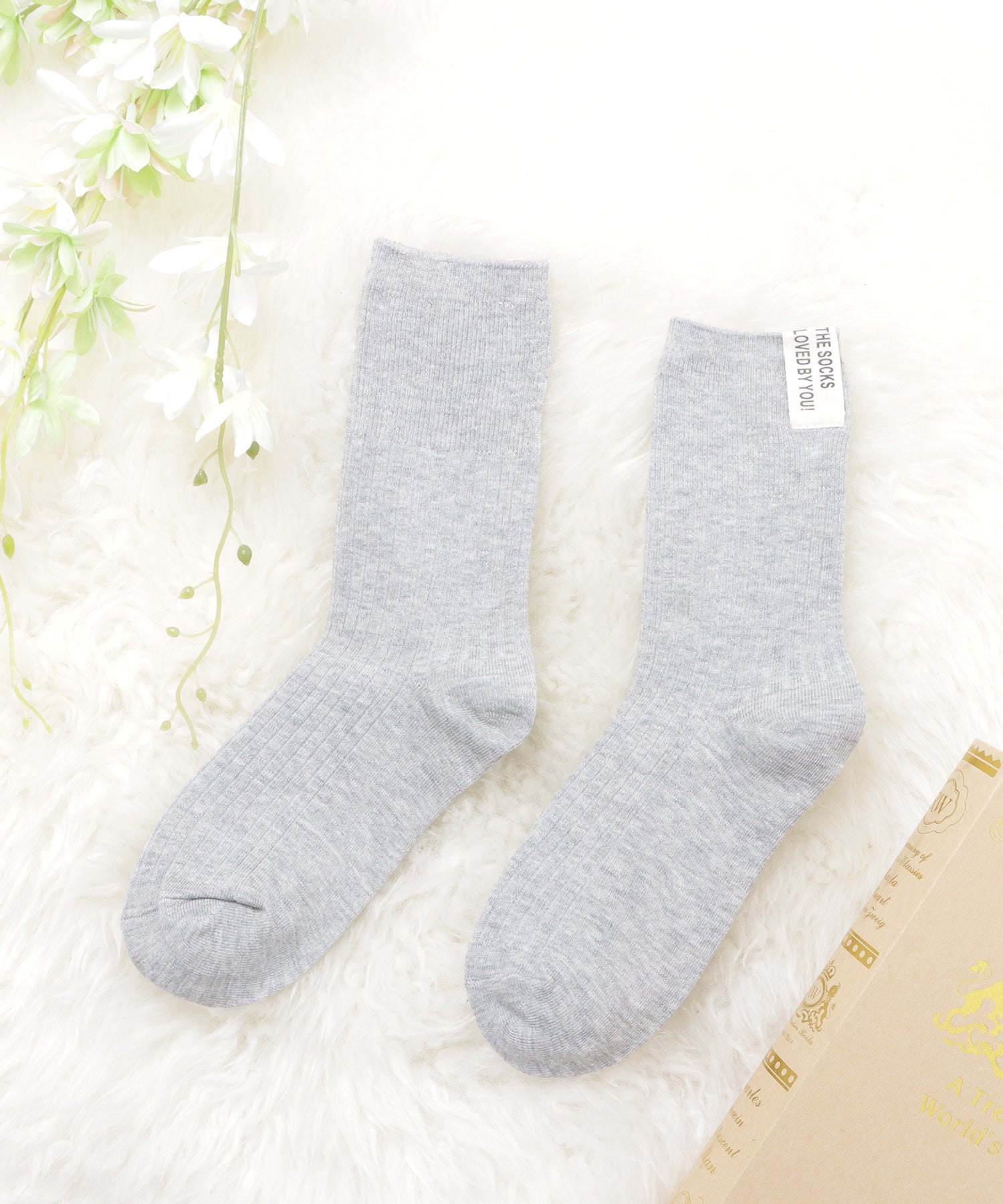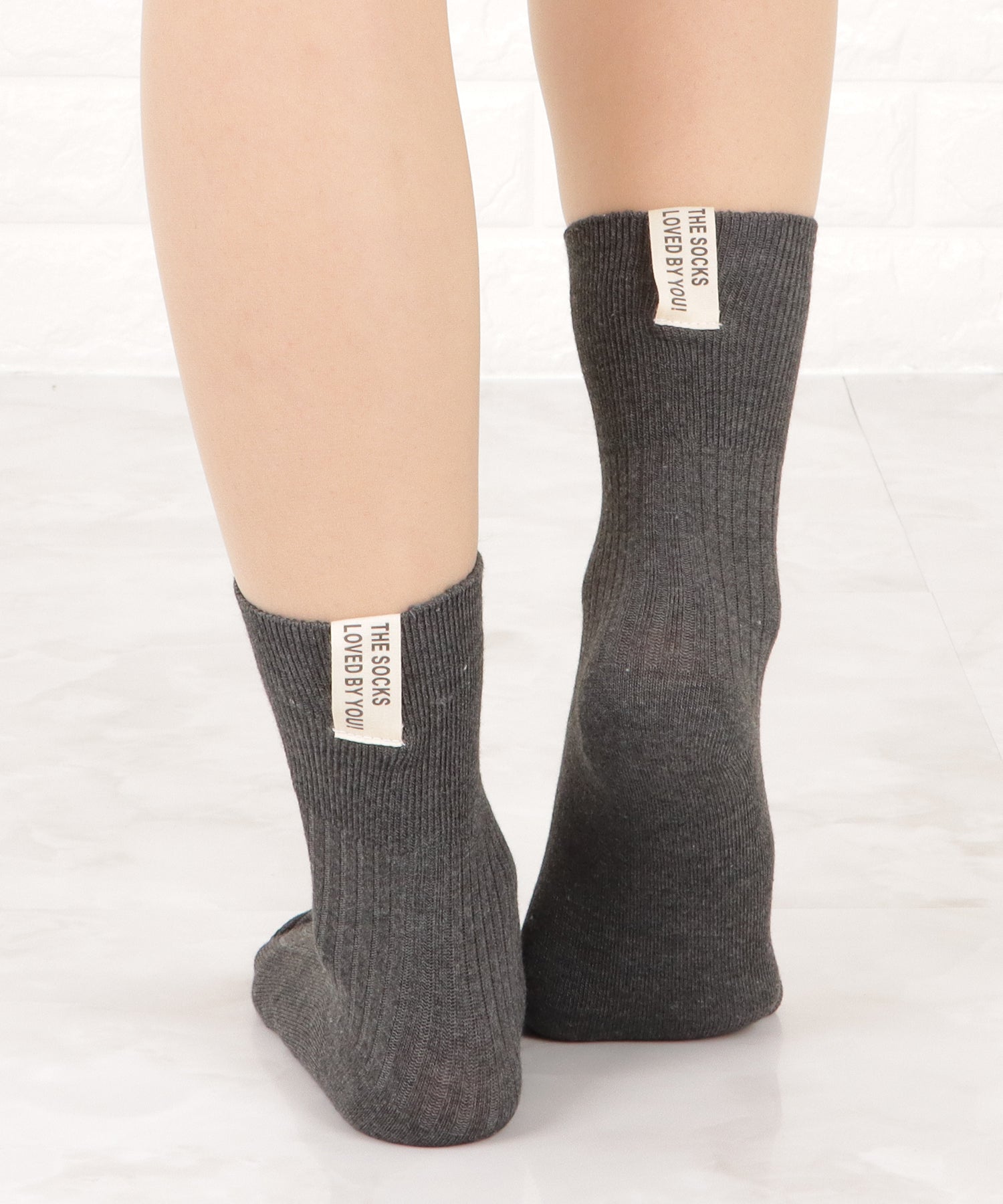 ナチュラルな風合いのリブ素材に、タグのデザインがアクセントになったクルーソックス