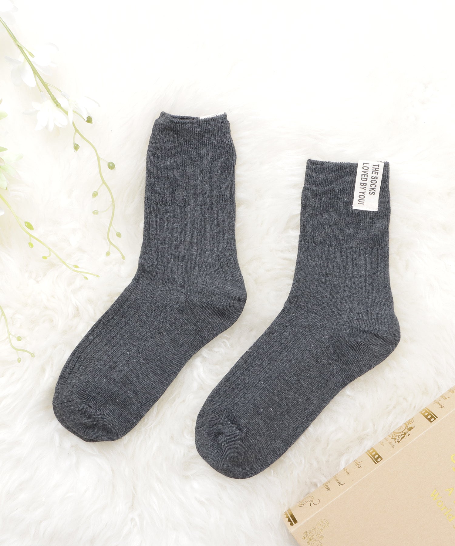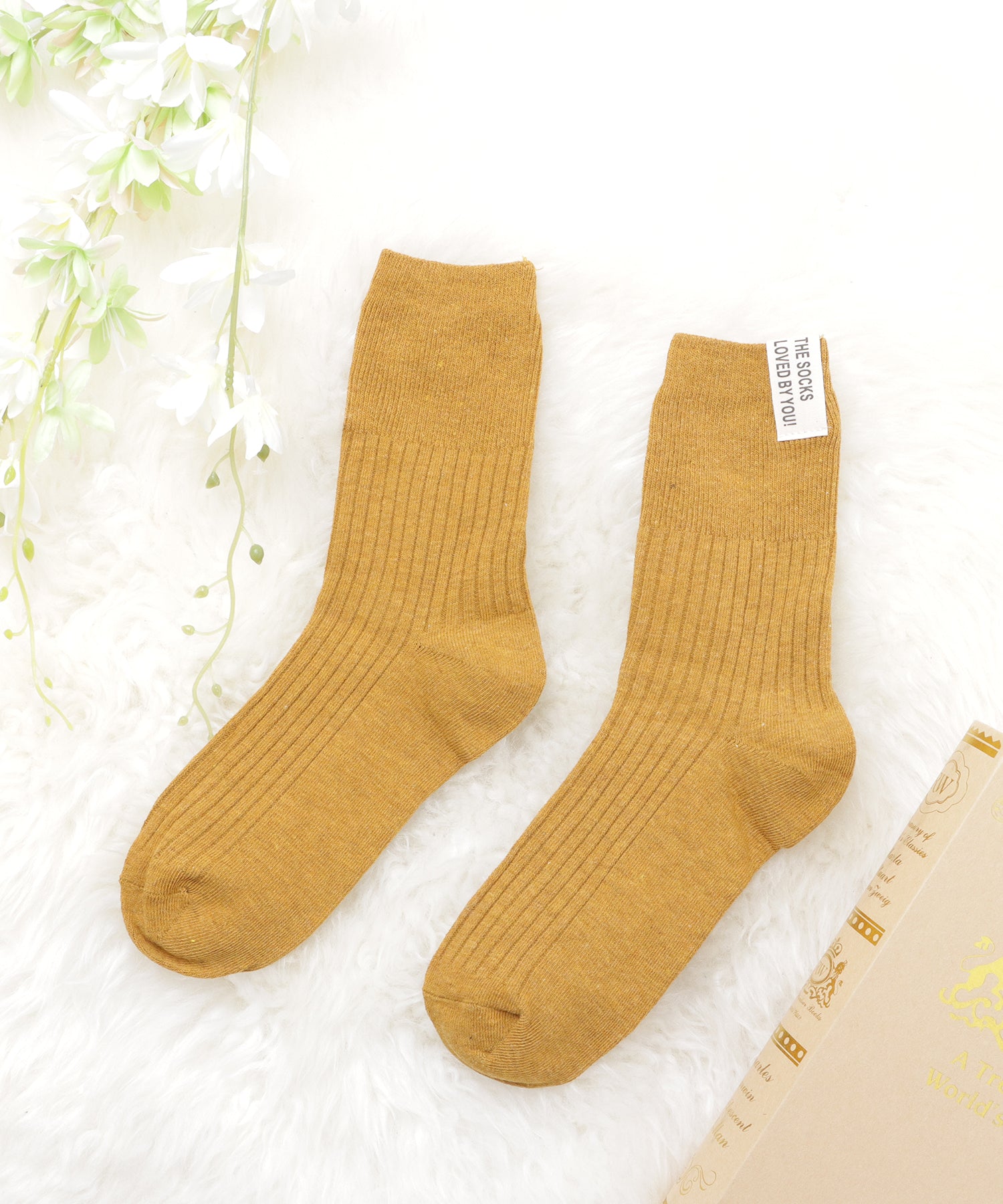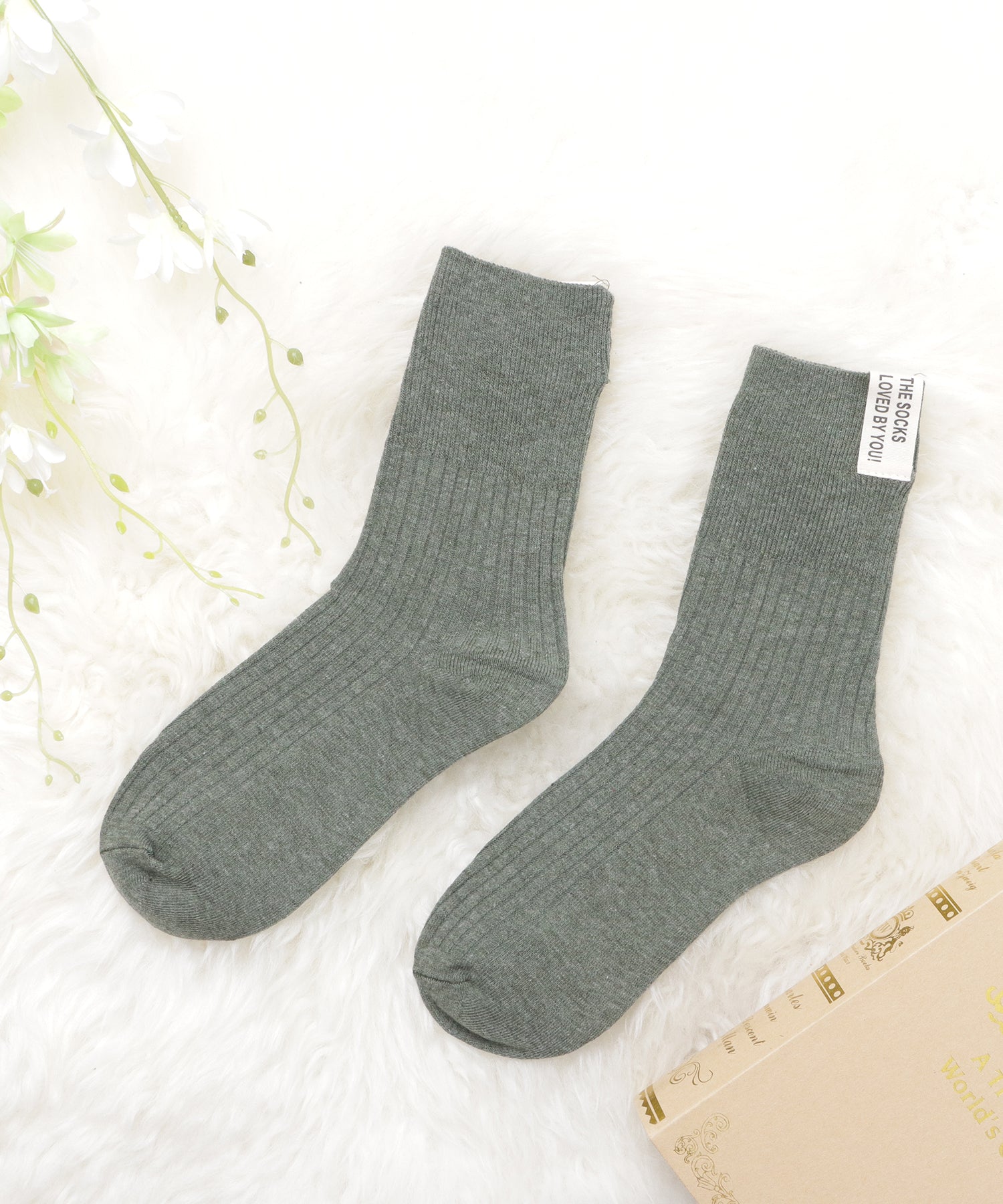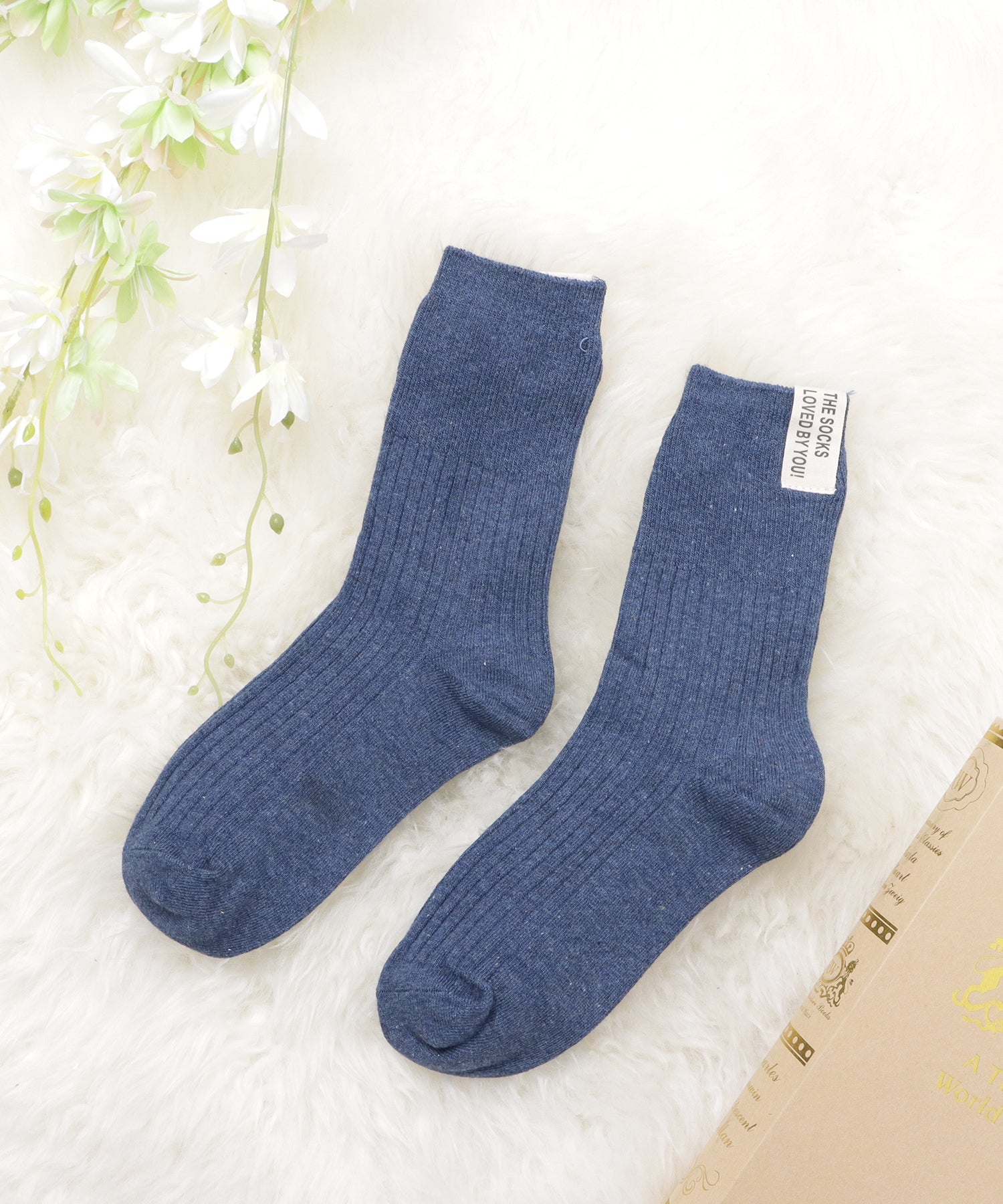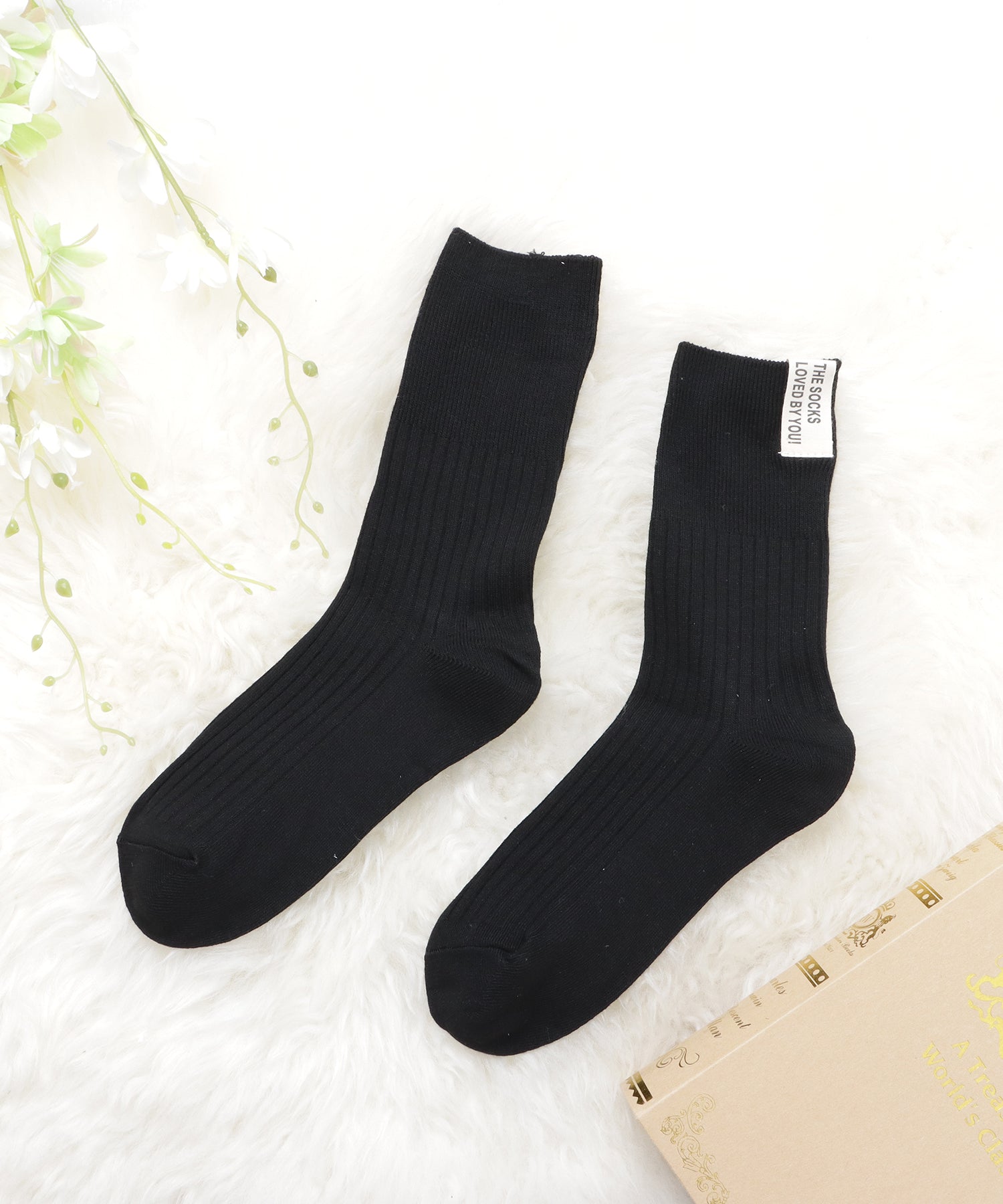ナチュラルな風合いのリブ素材に、タグのデザインがアクセントになったクルーソックス