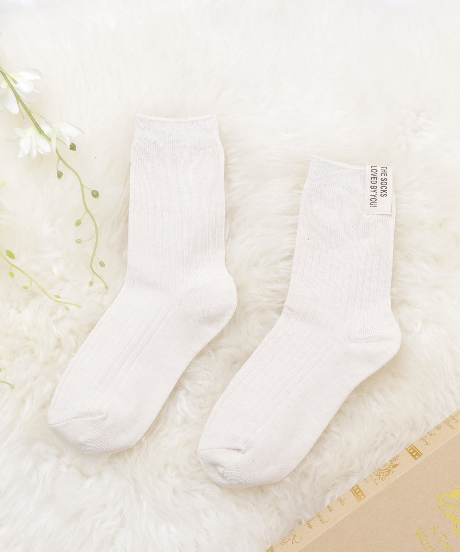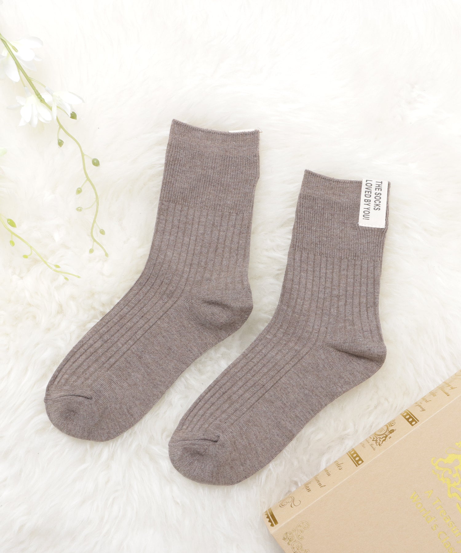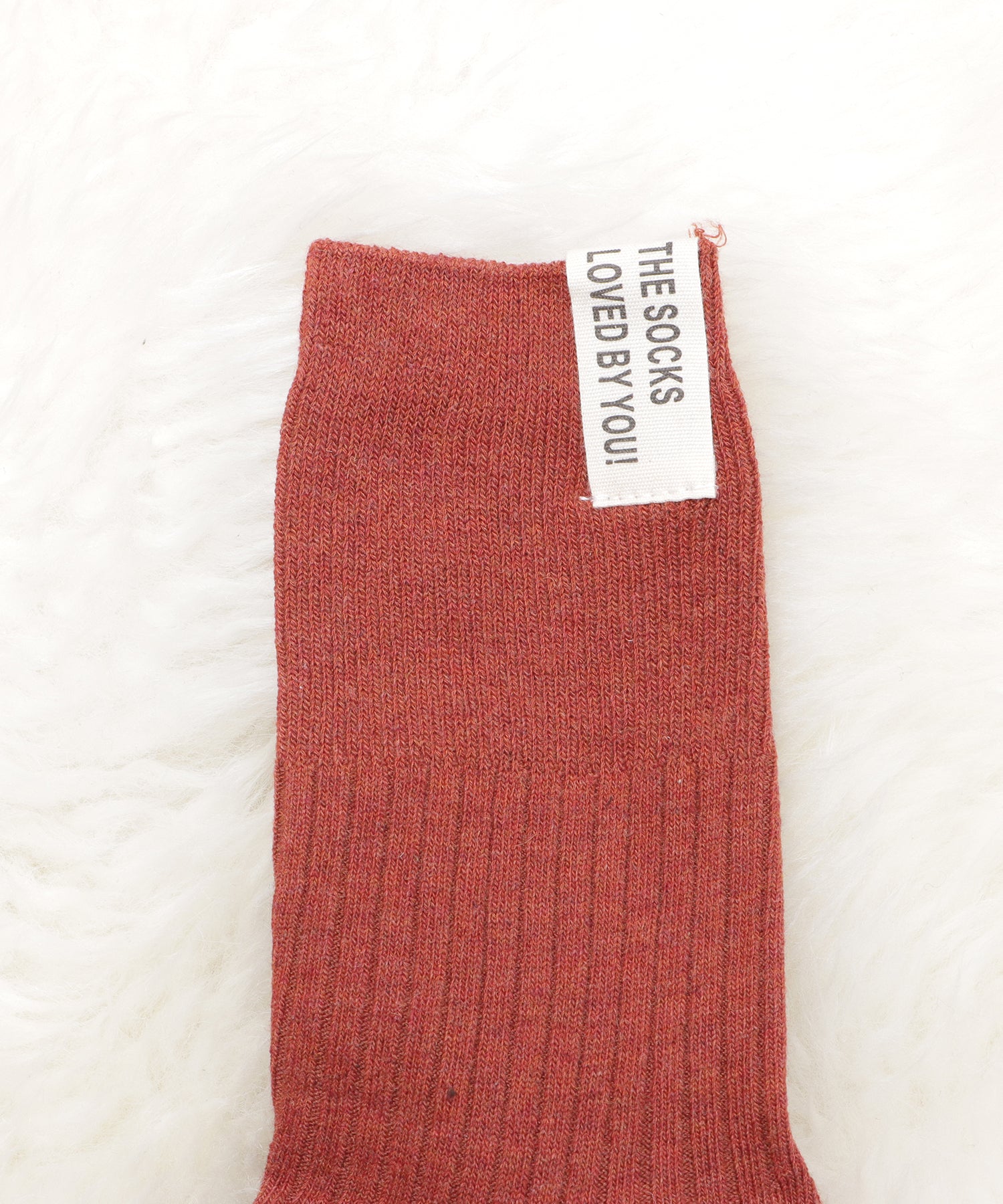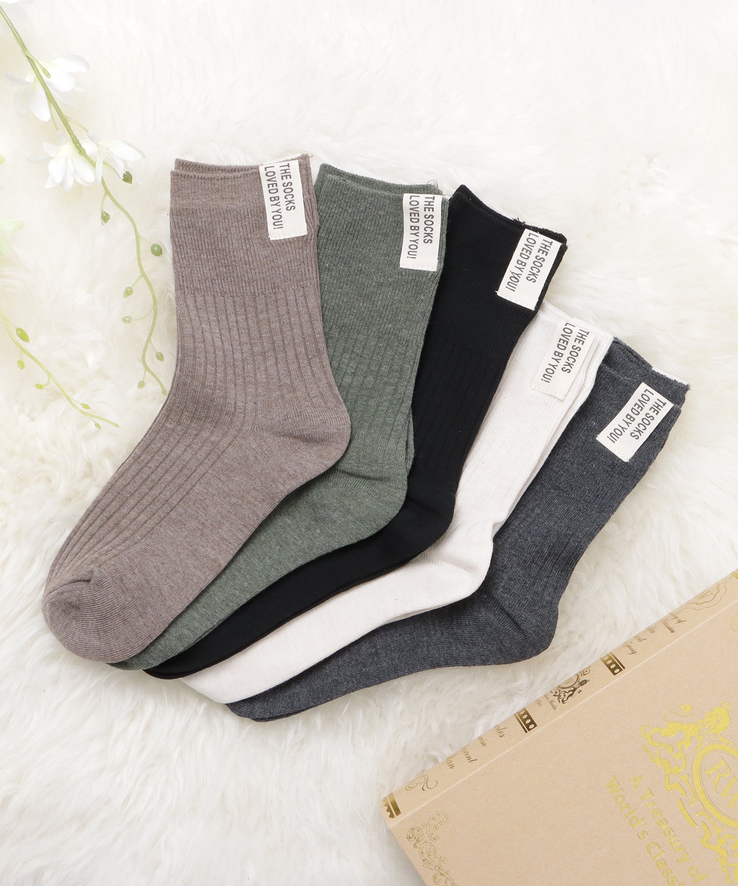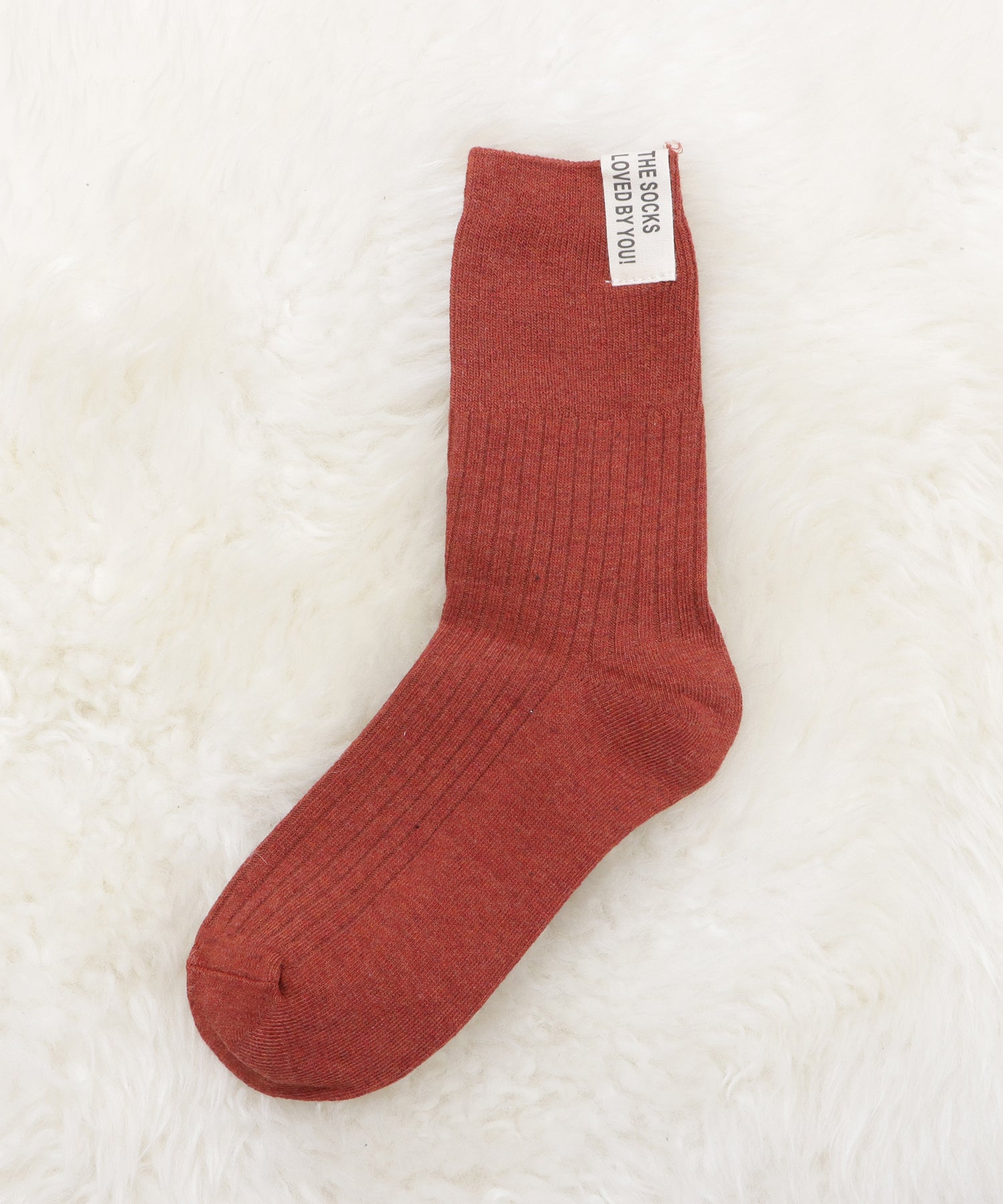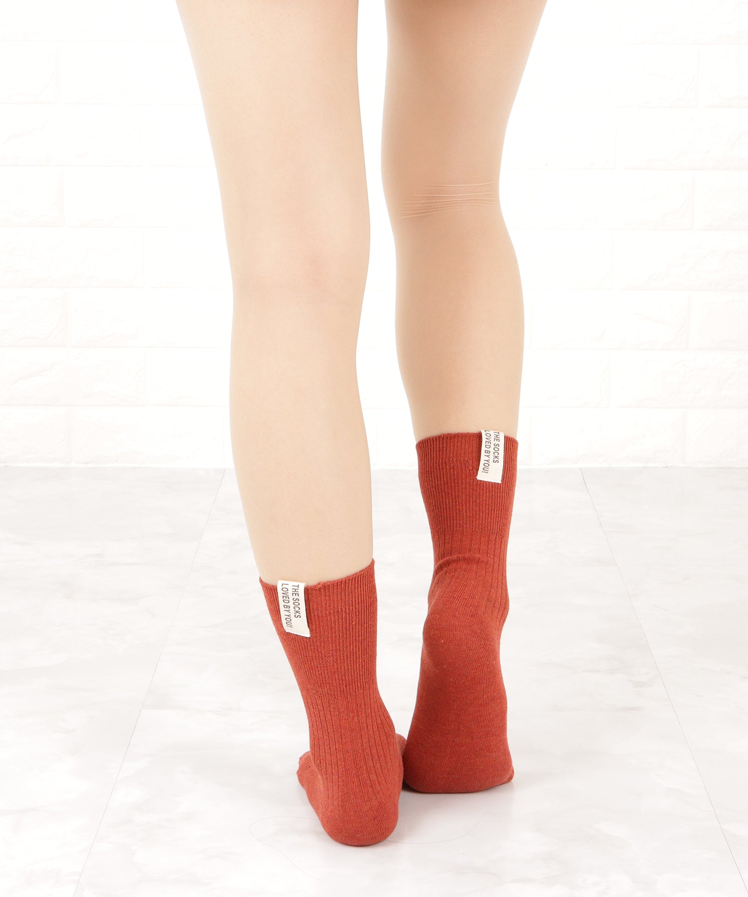 ナチュラルな風合いのリブ素材に、タグのデザインがアクセントになったクルーソックス