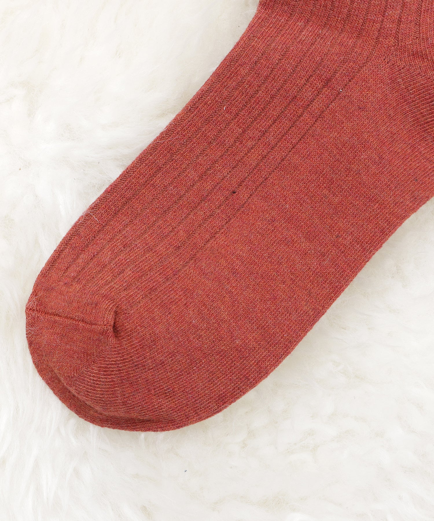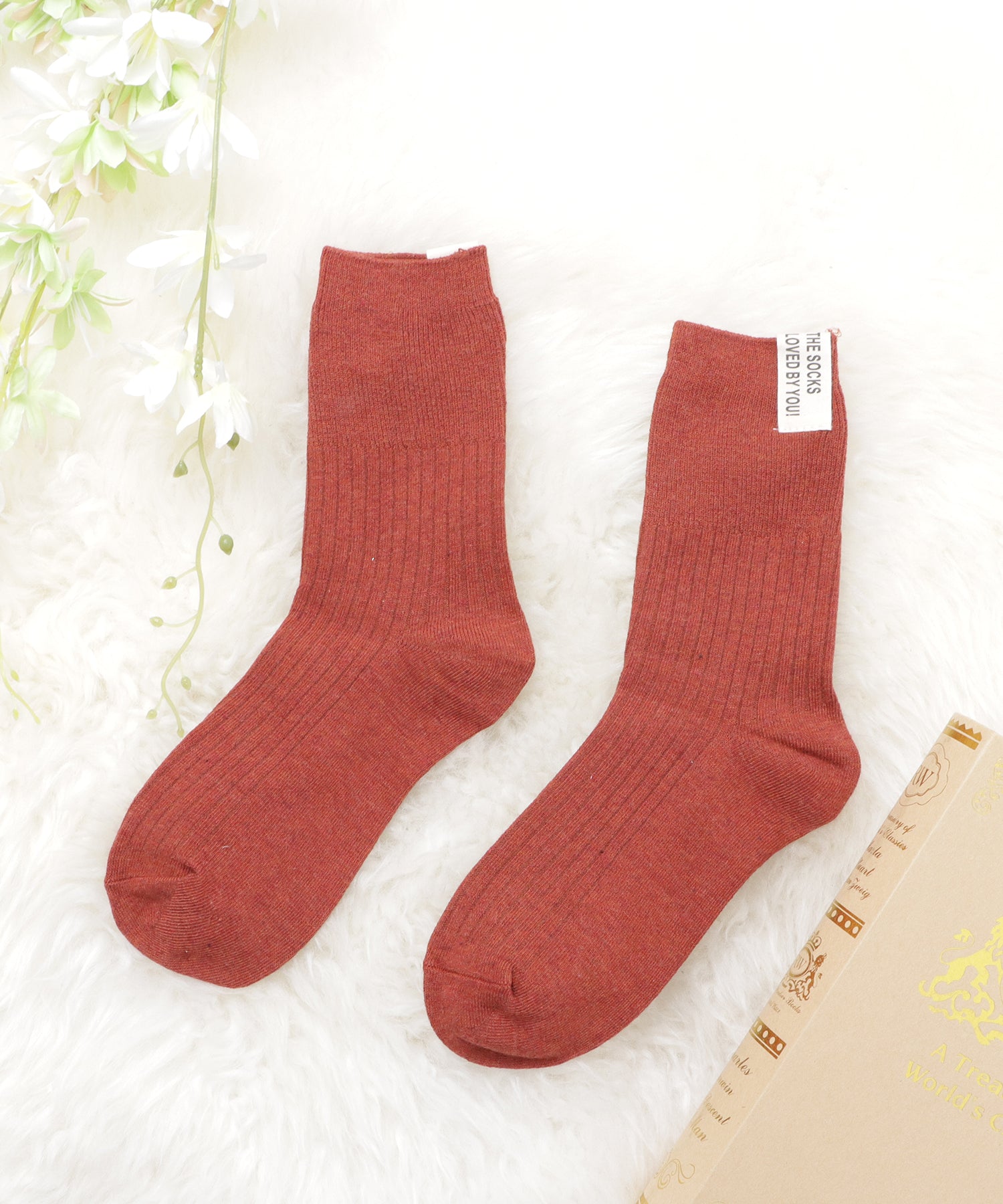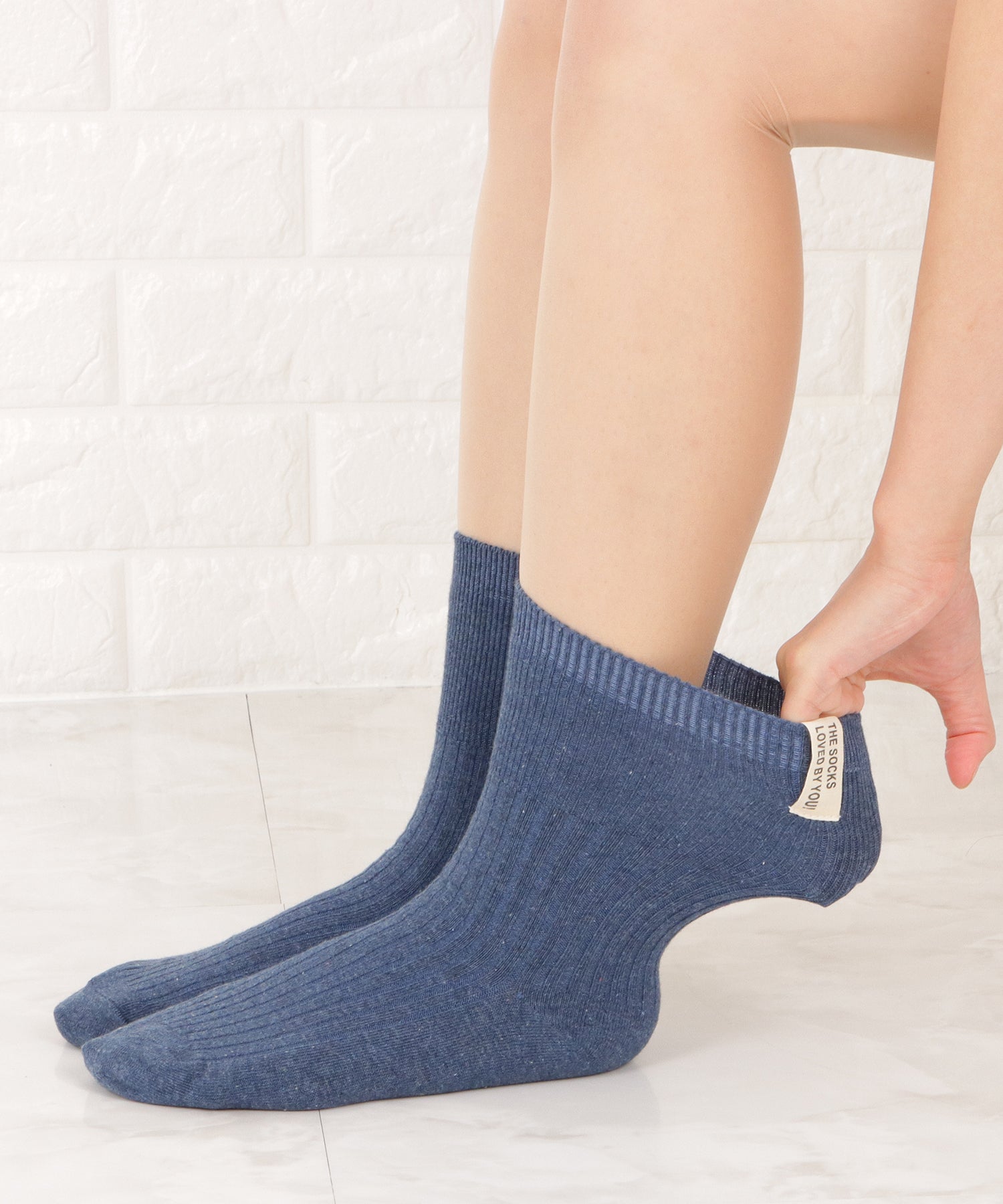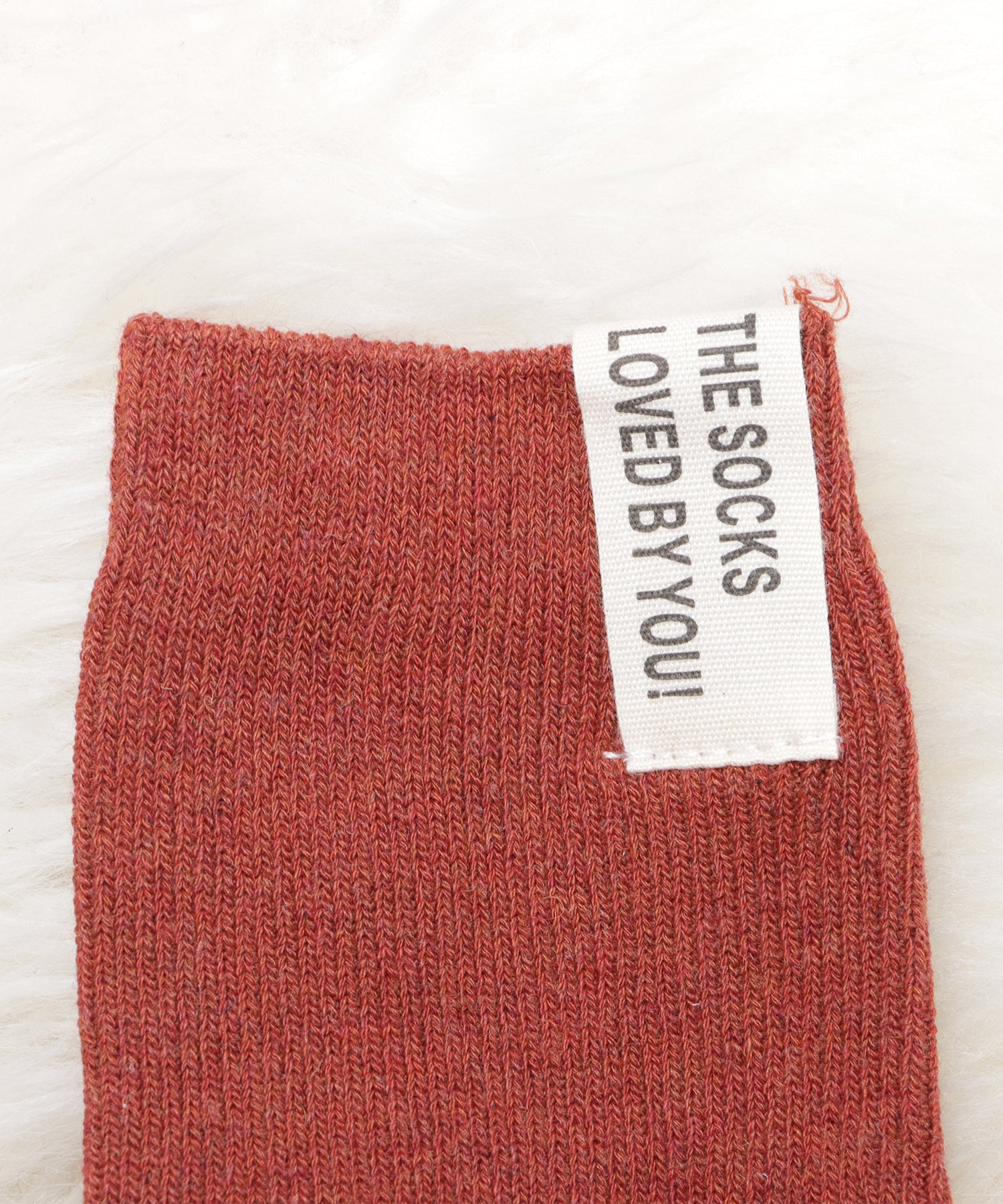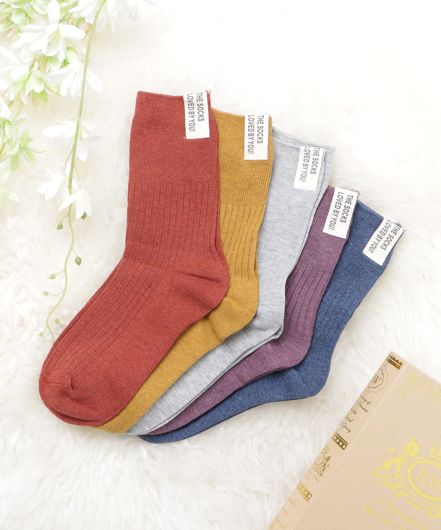 ナチュラルな風合いのリブ素材に、タグのデザインがアクセントになったクルーソックス