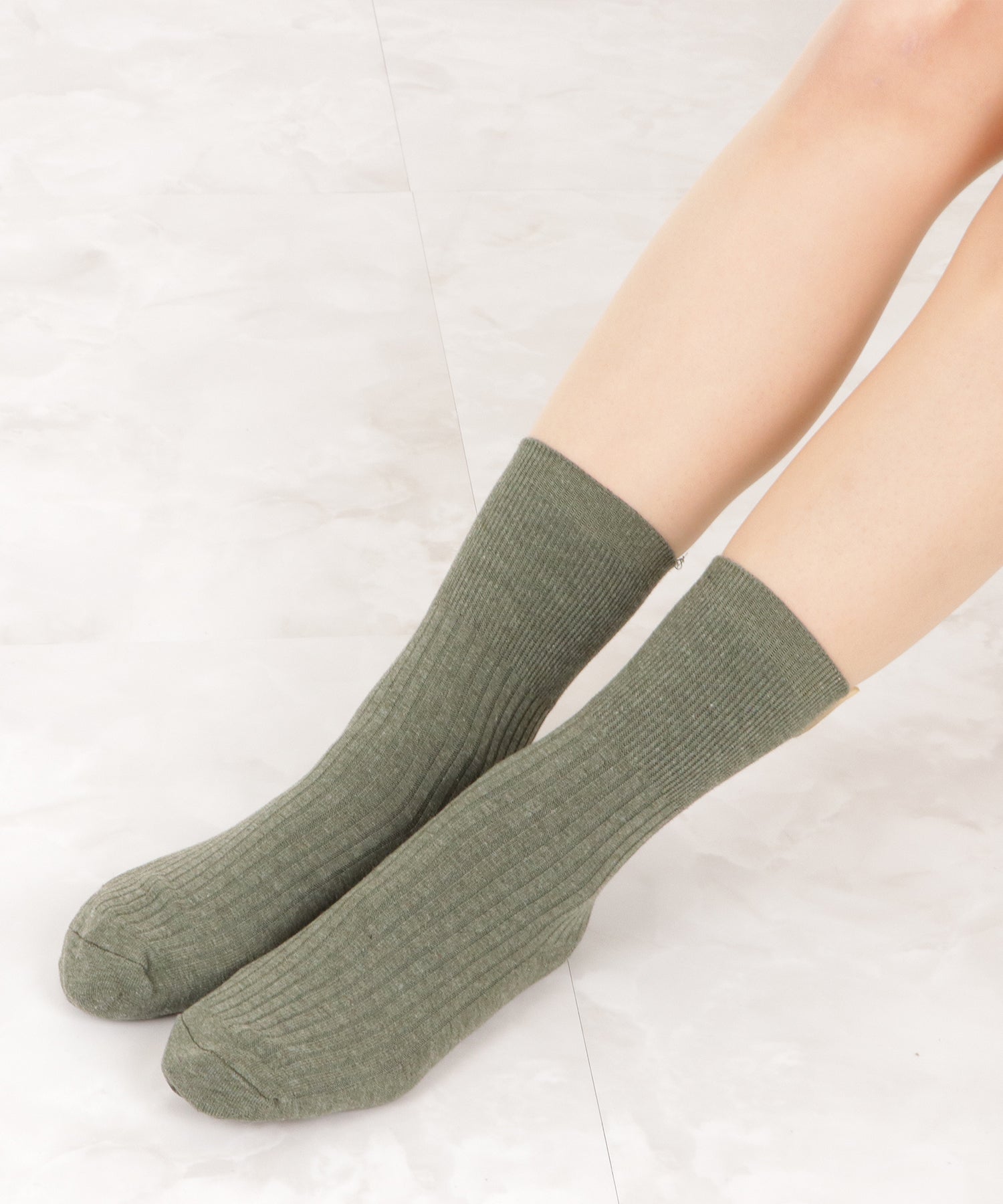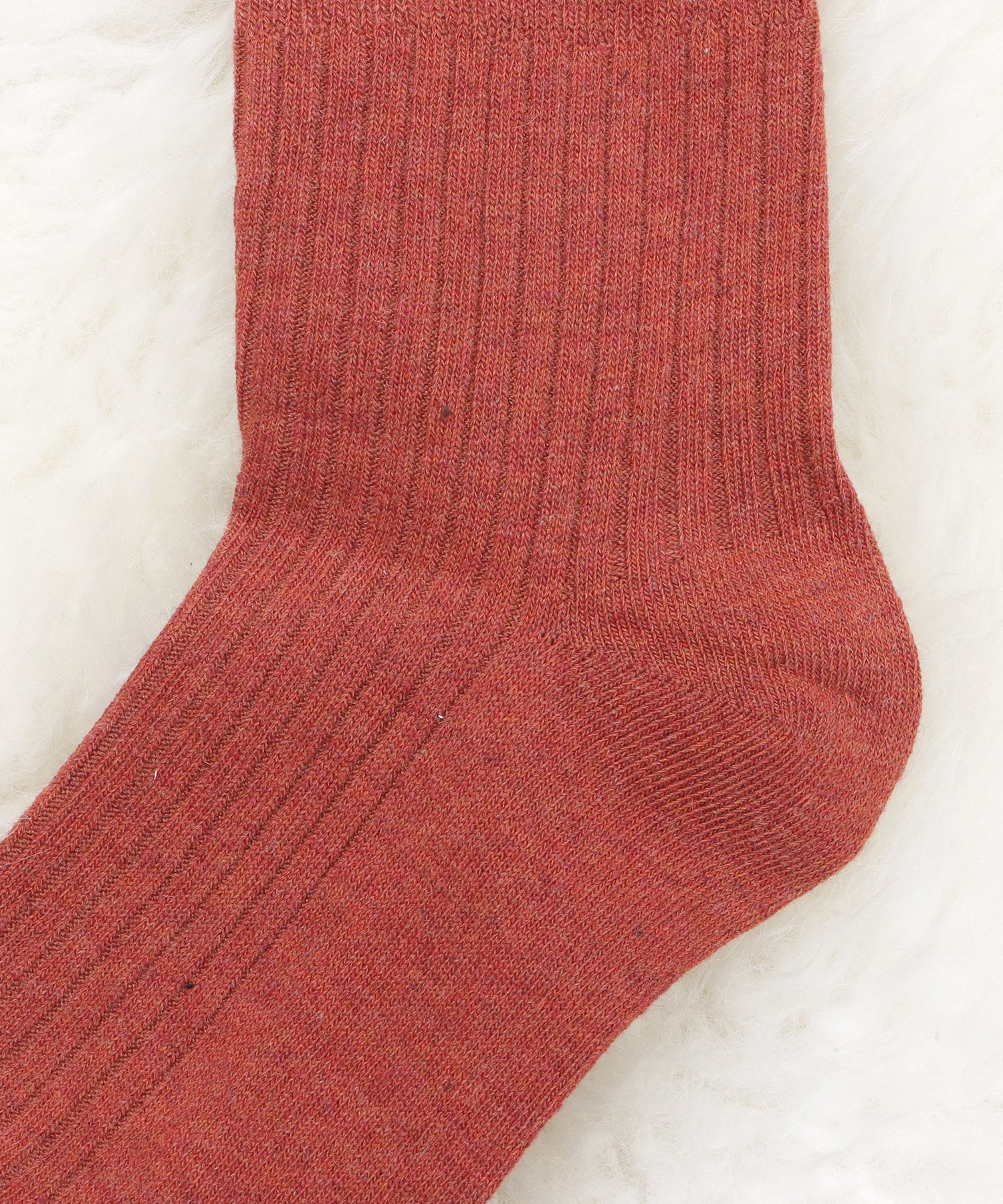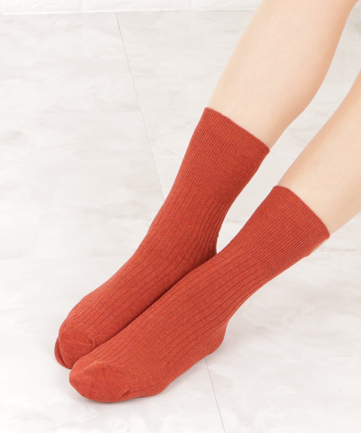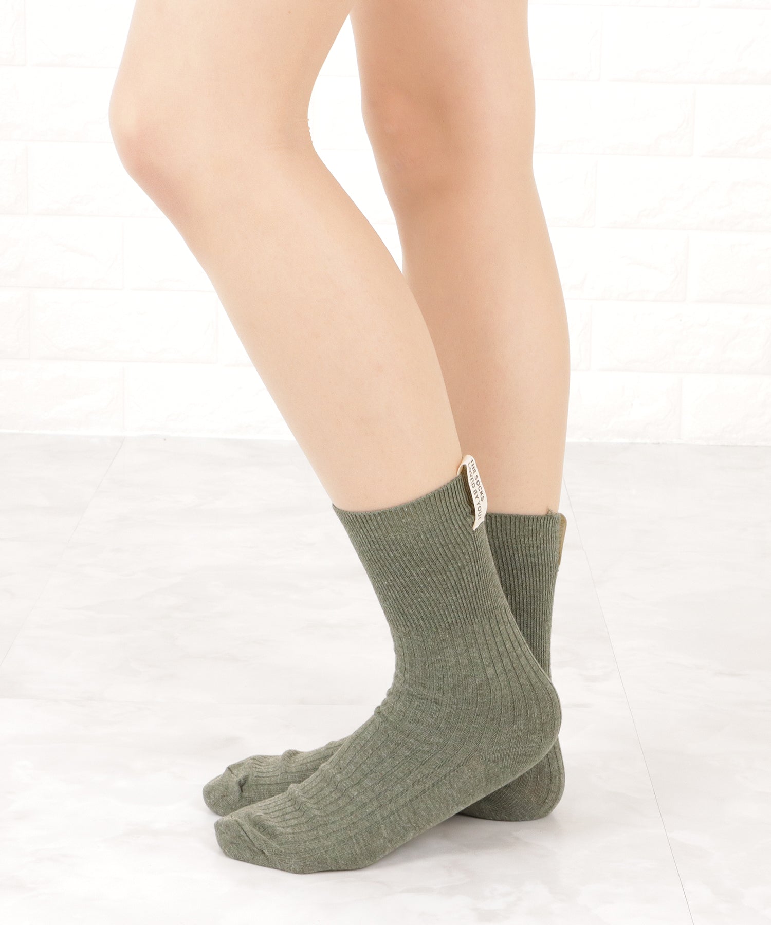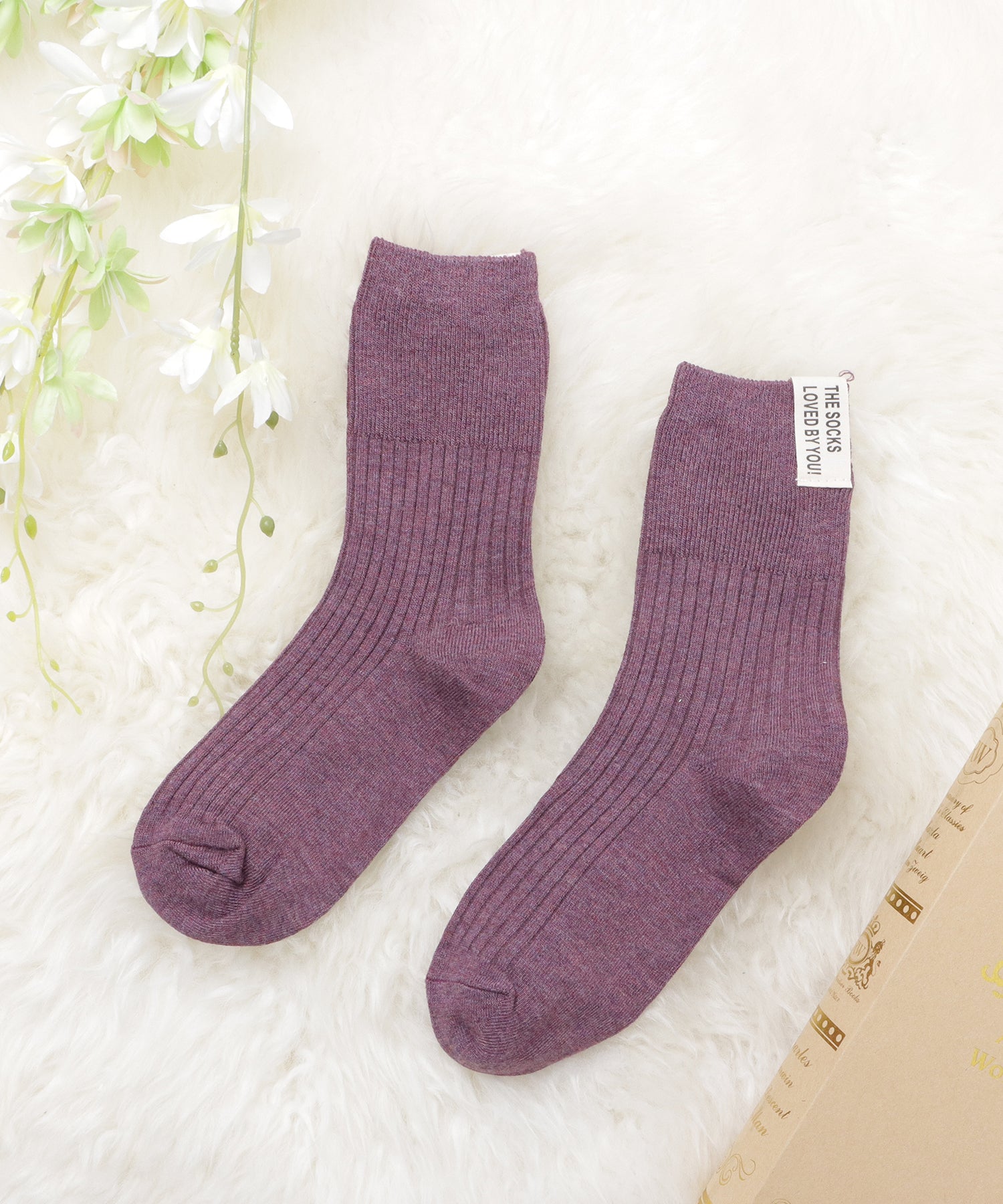 ナチュラルな風合いのリブ素材に、タグのデザインがアクセントになったクルーソックス
