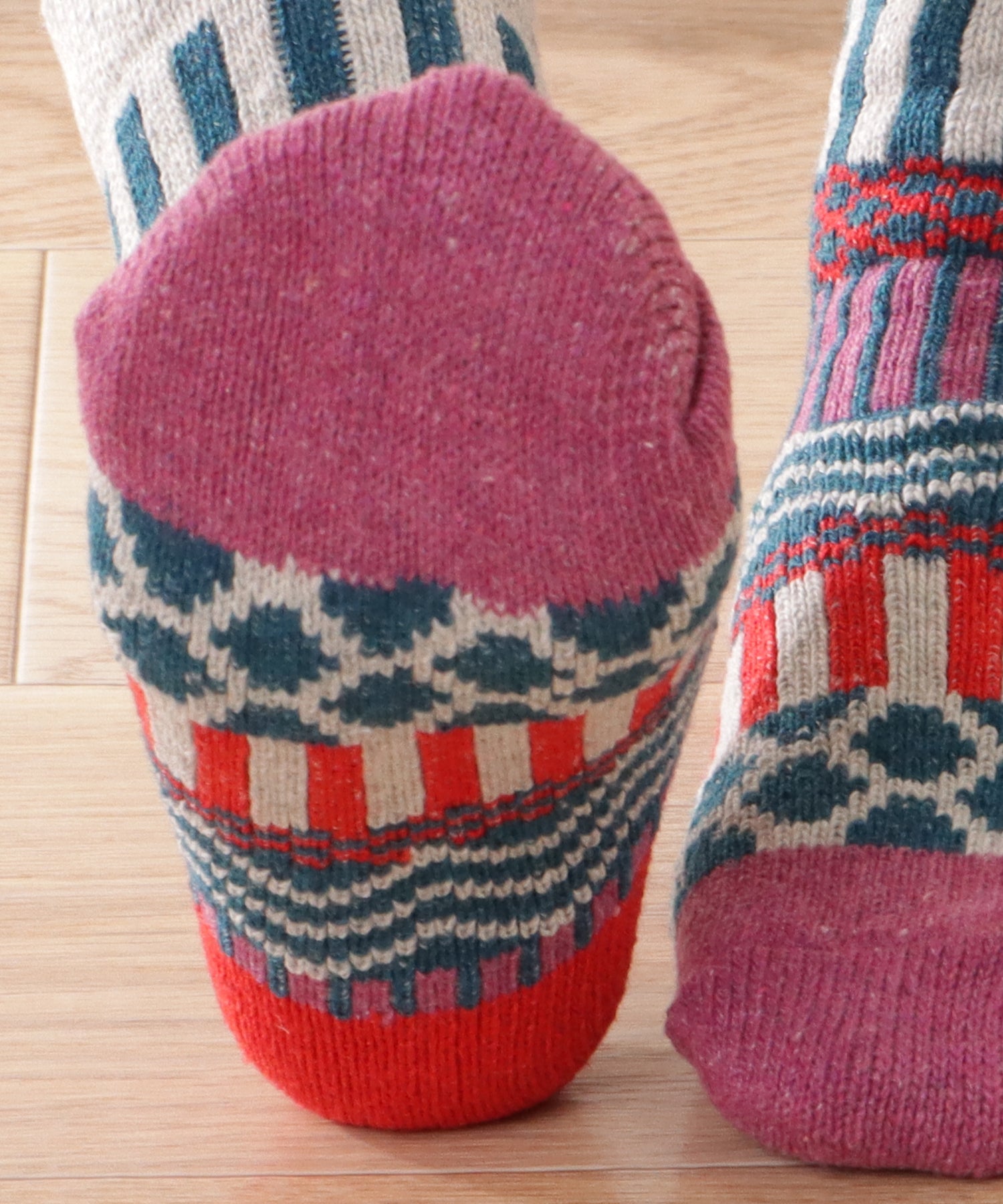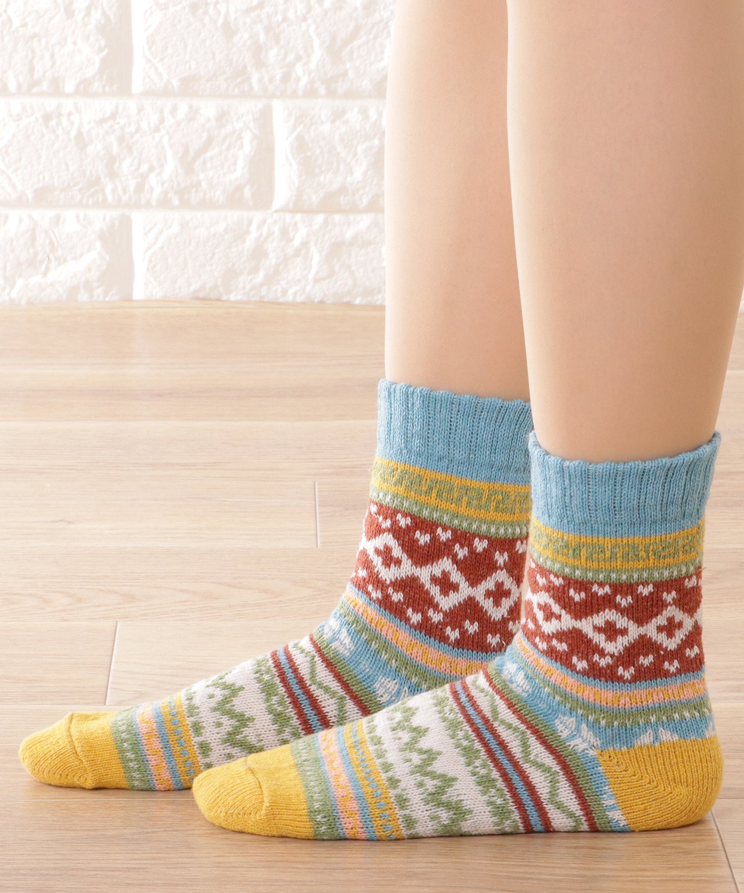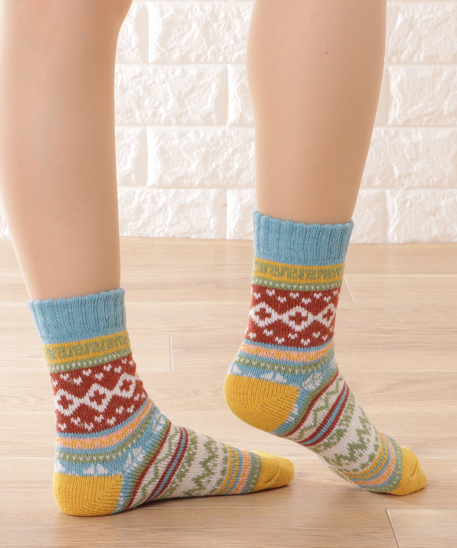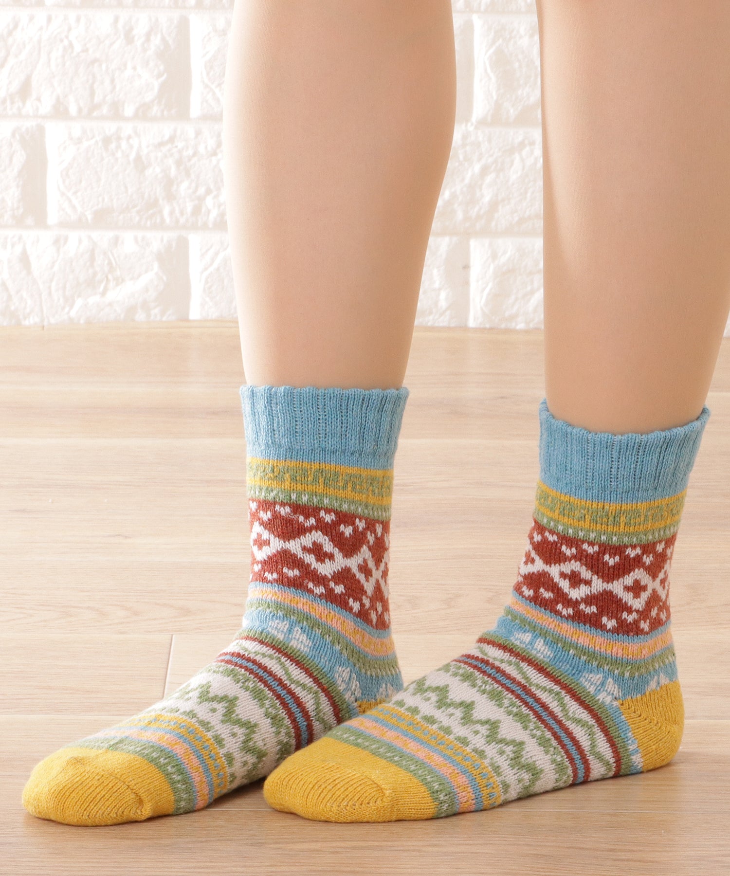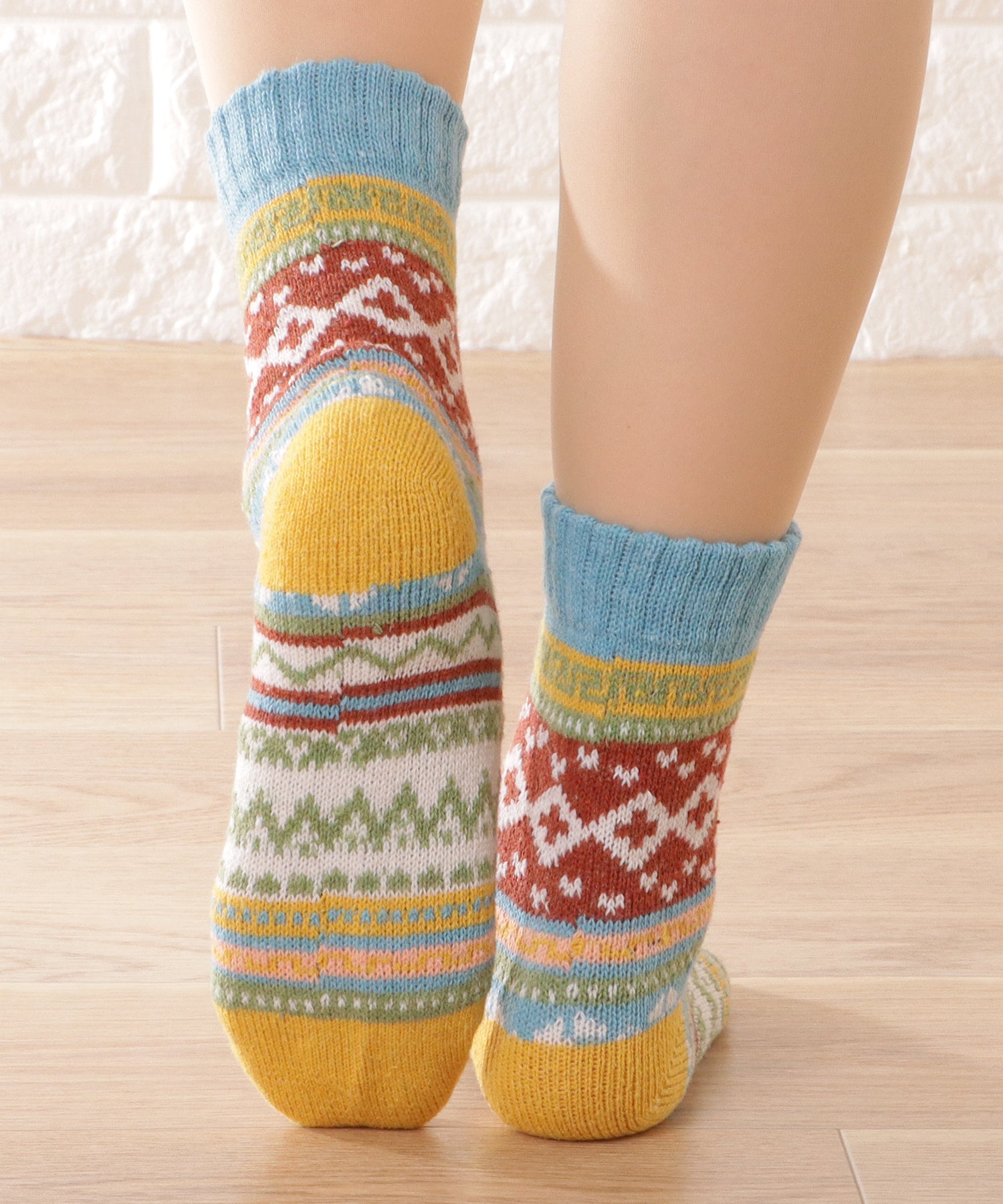 秋冬らしい民族調のデザインでおつくりした、見た目にもウォーミーなクルー丈ソックス。