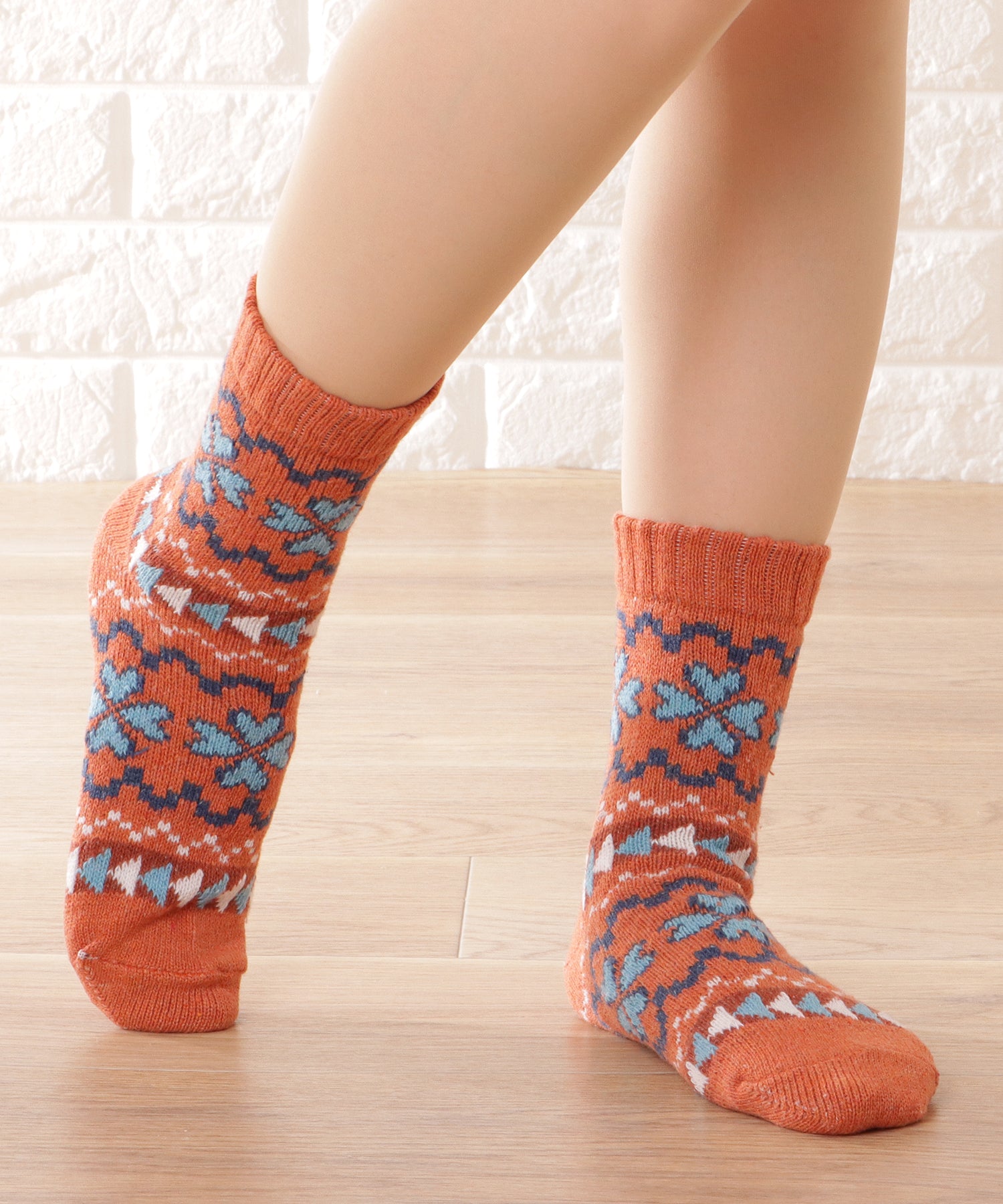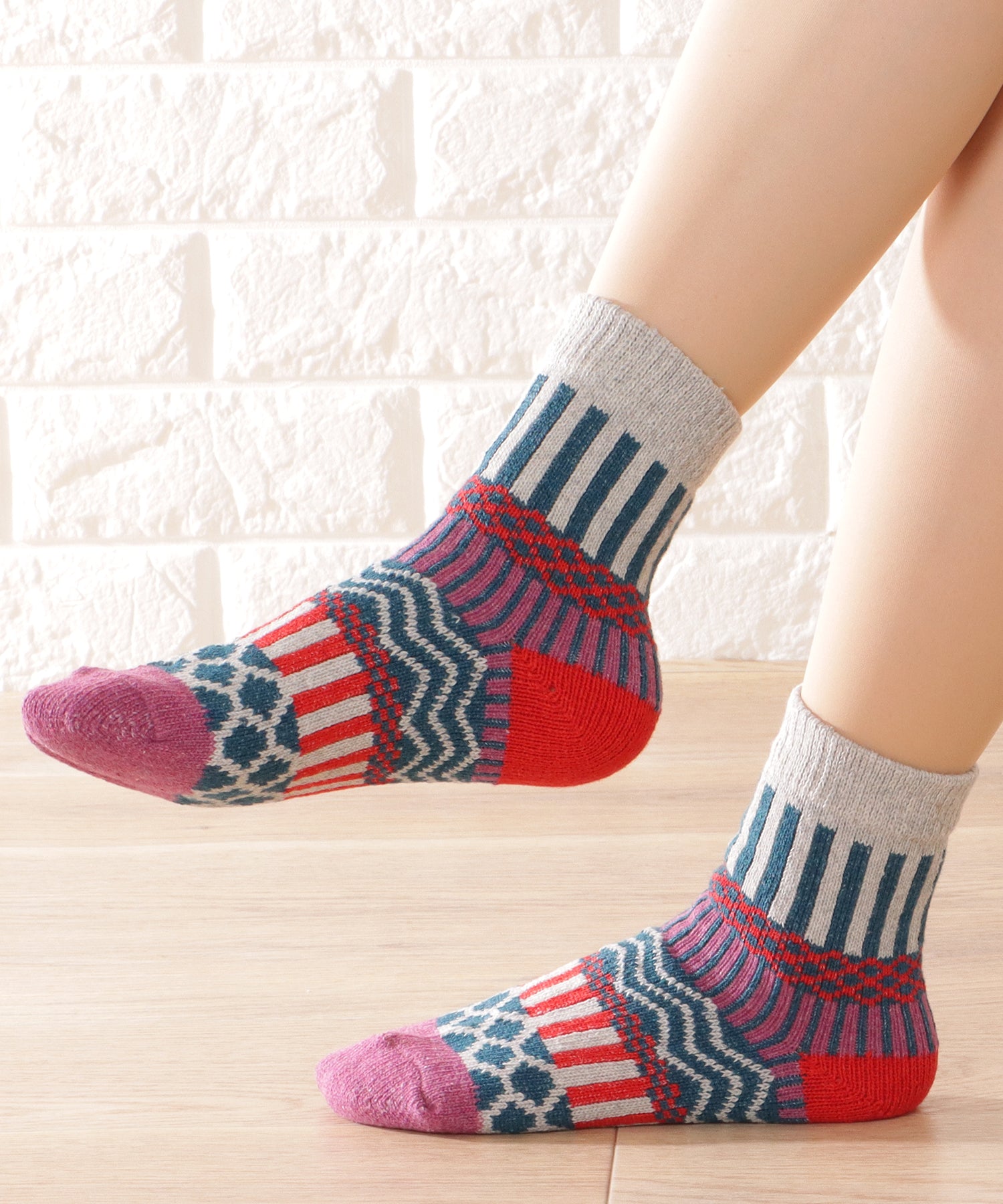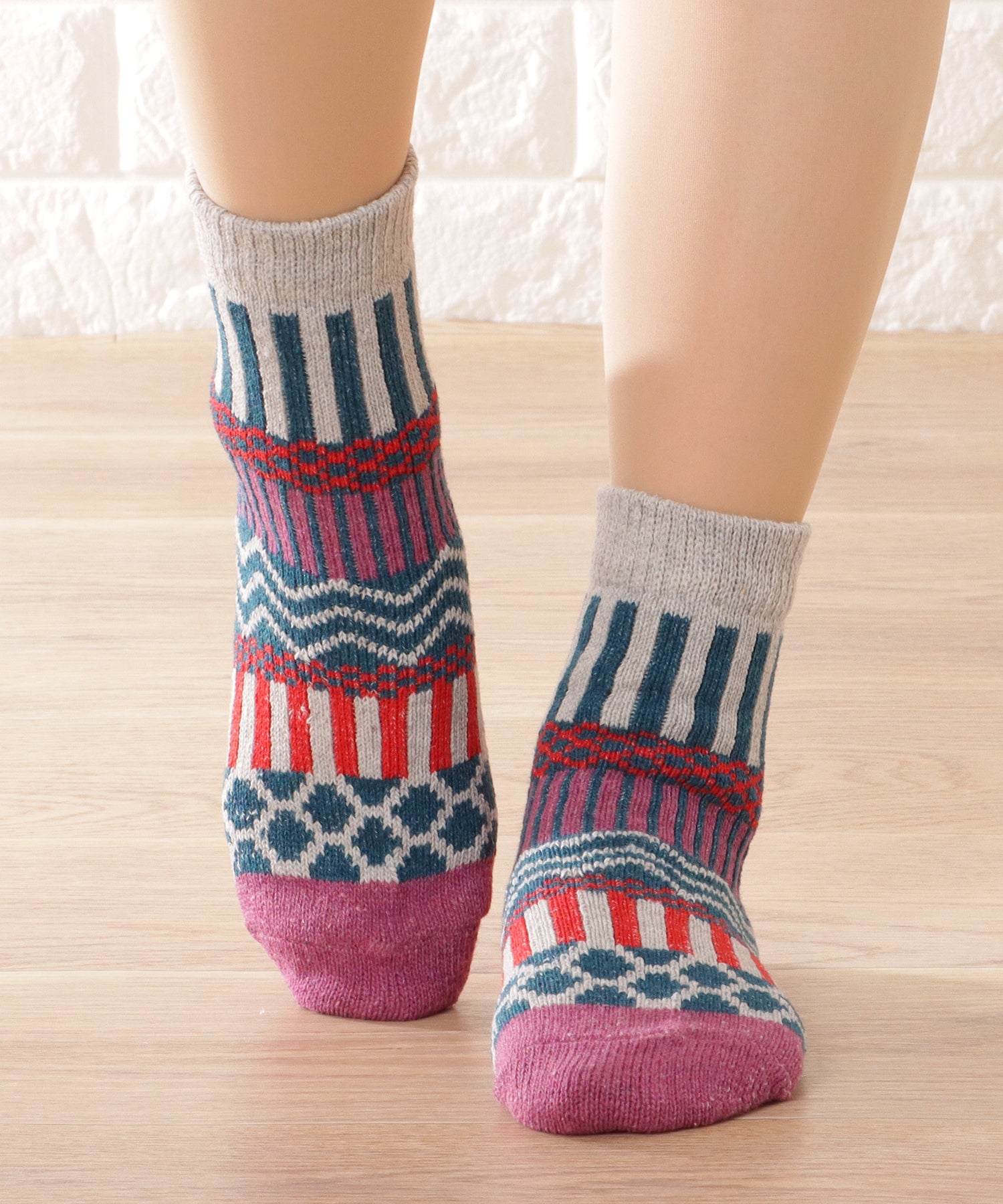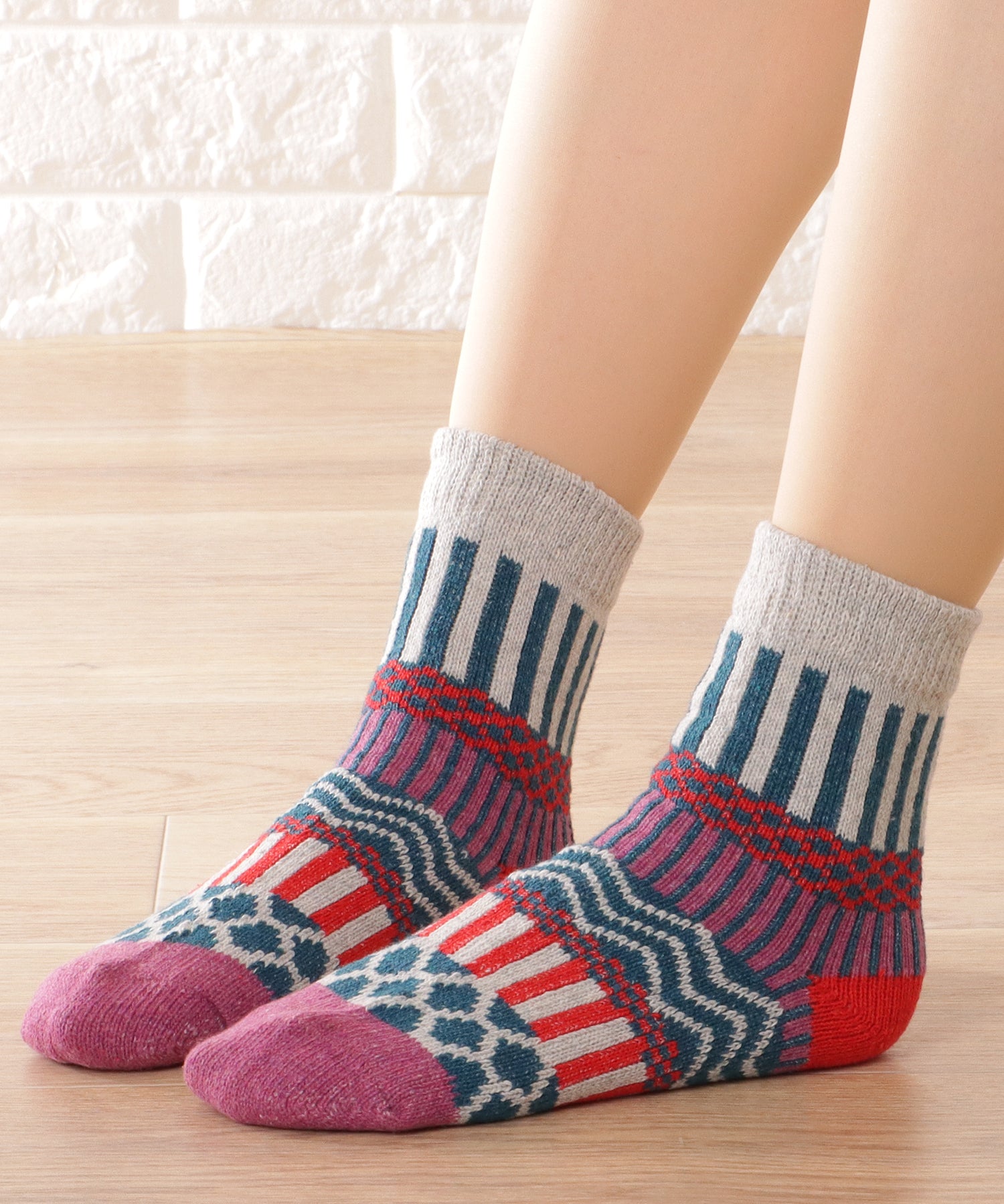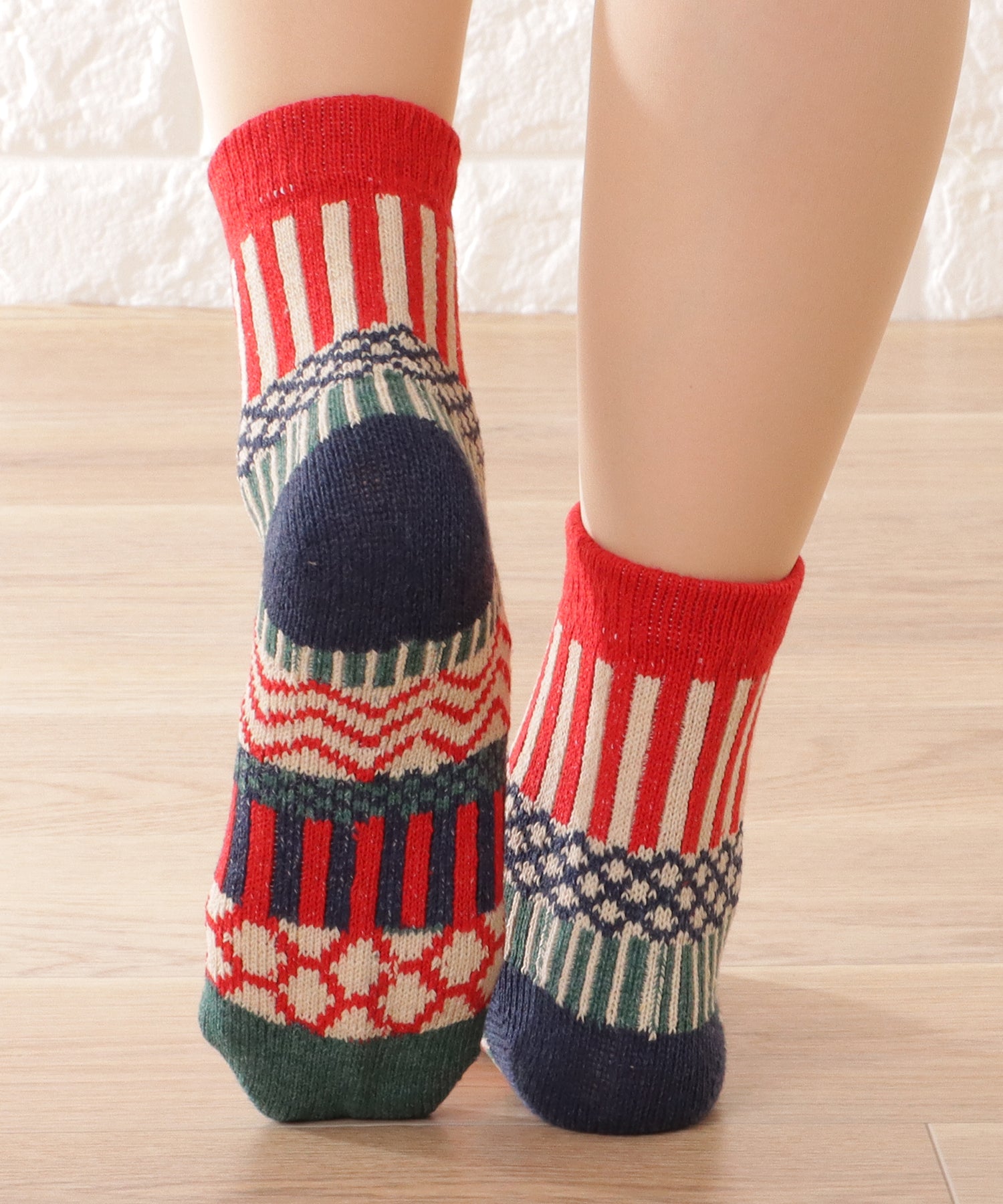 秋冬らしい民族調のデザインでおつくりした、見た目にもウォーミーなクルー丈ソックス。