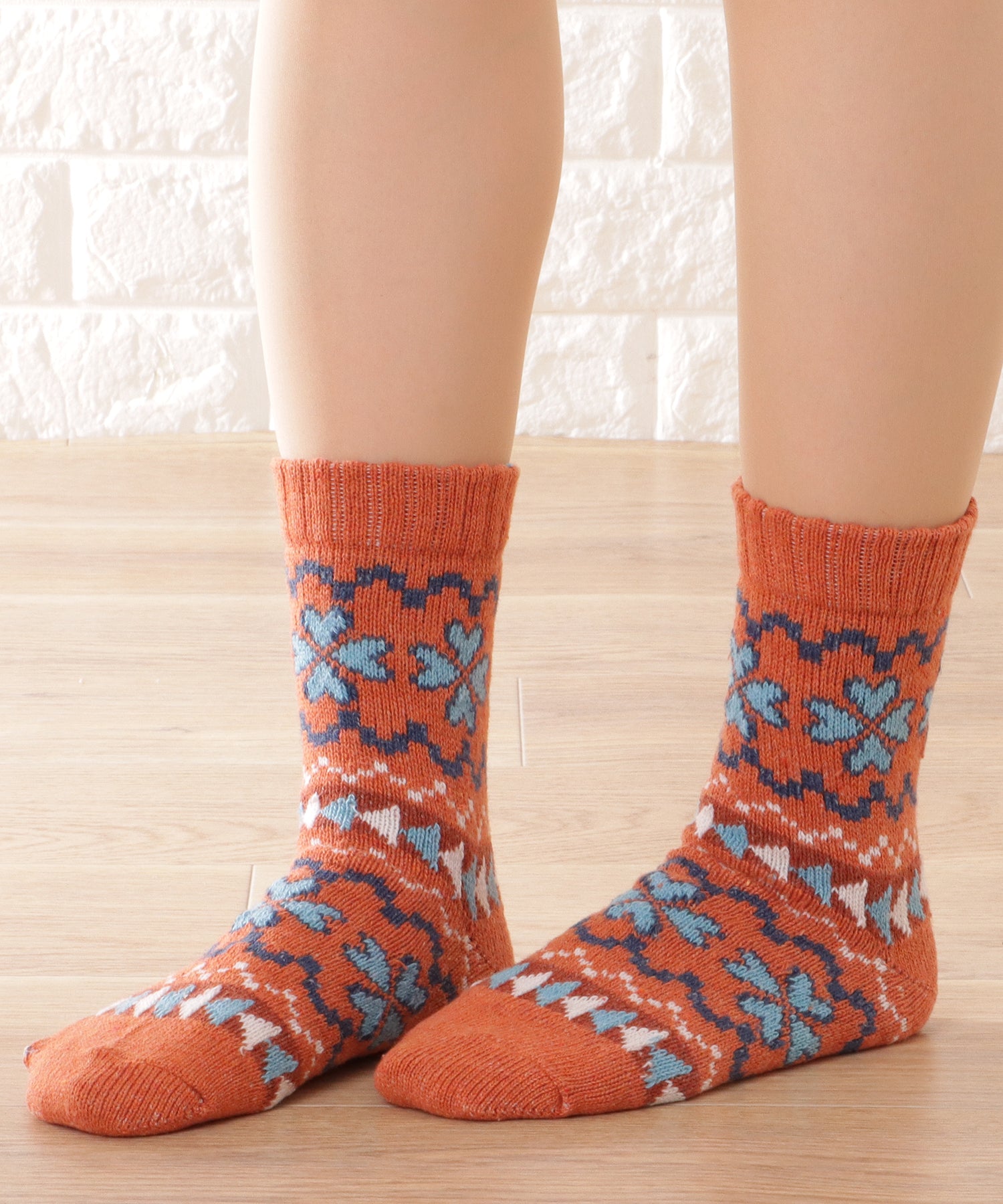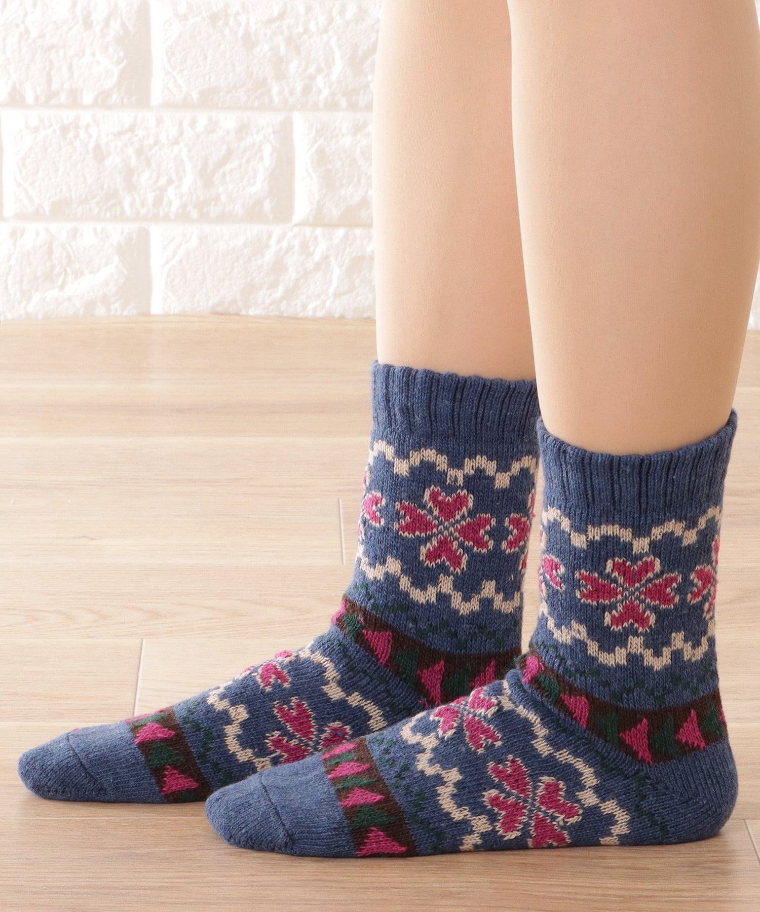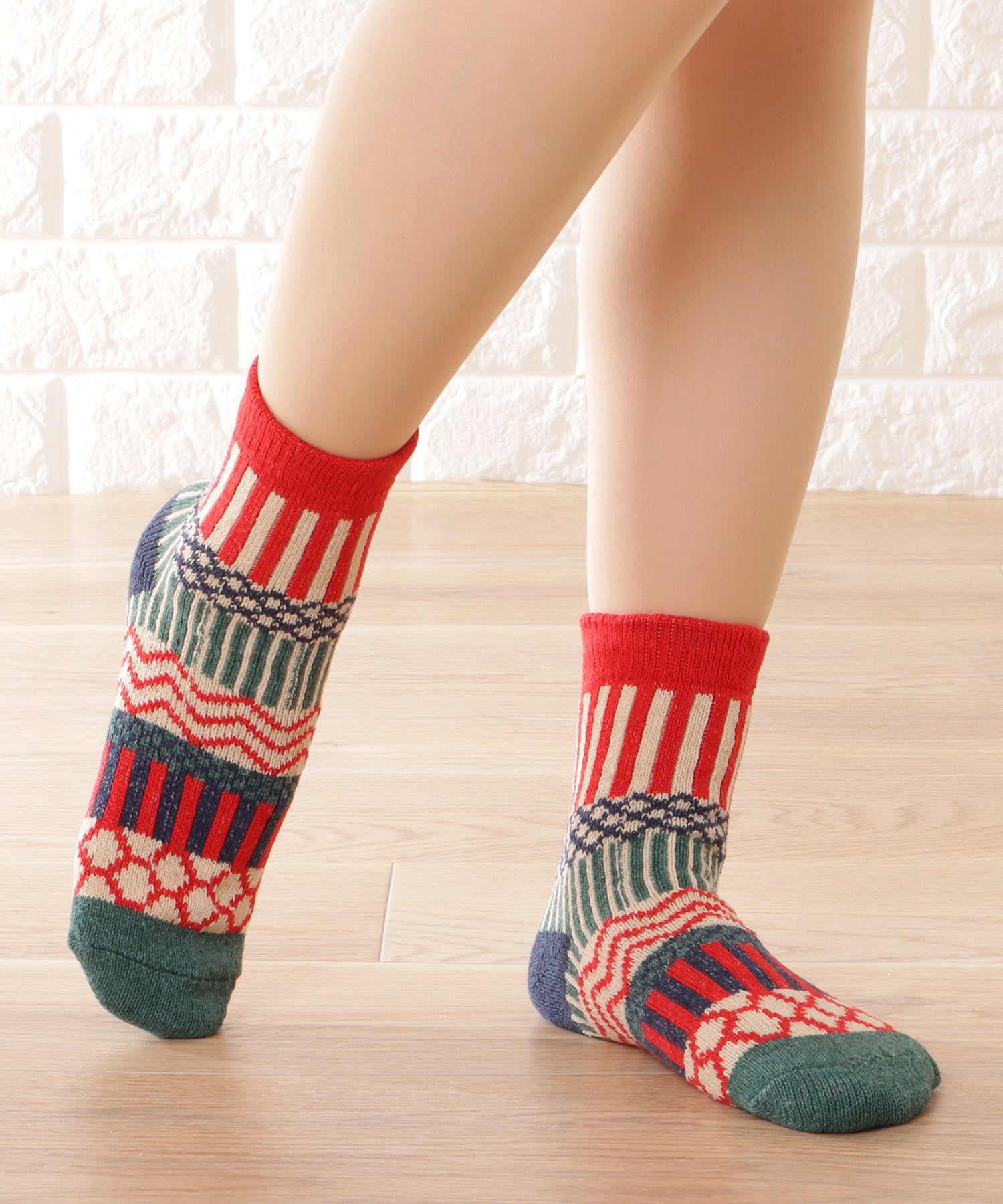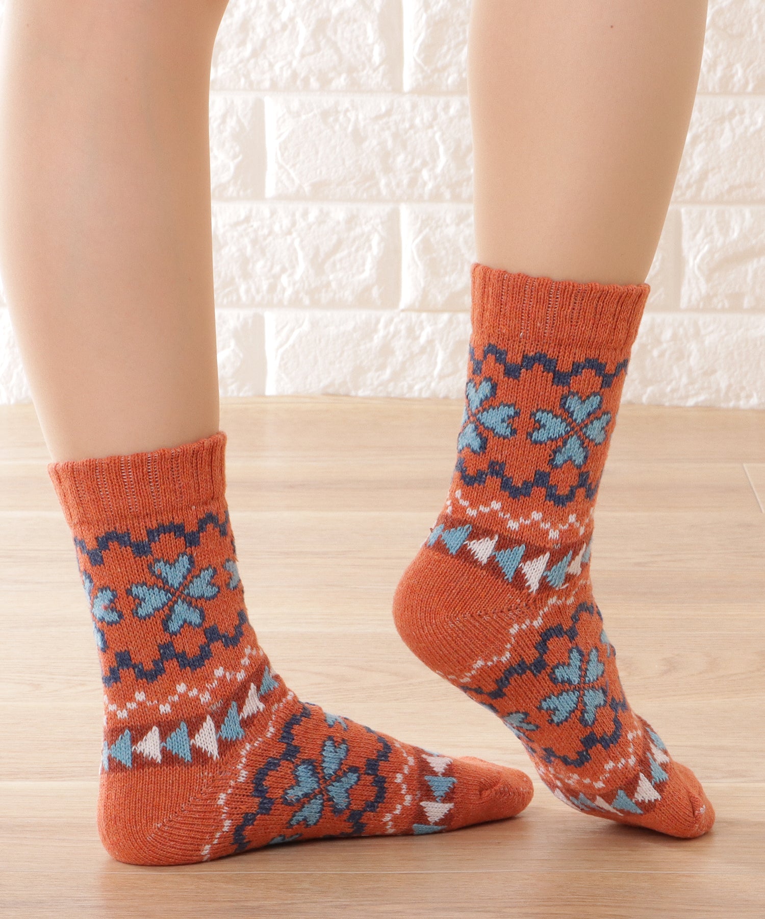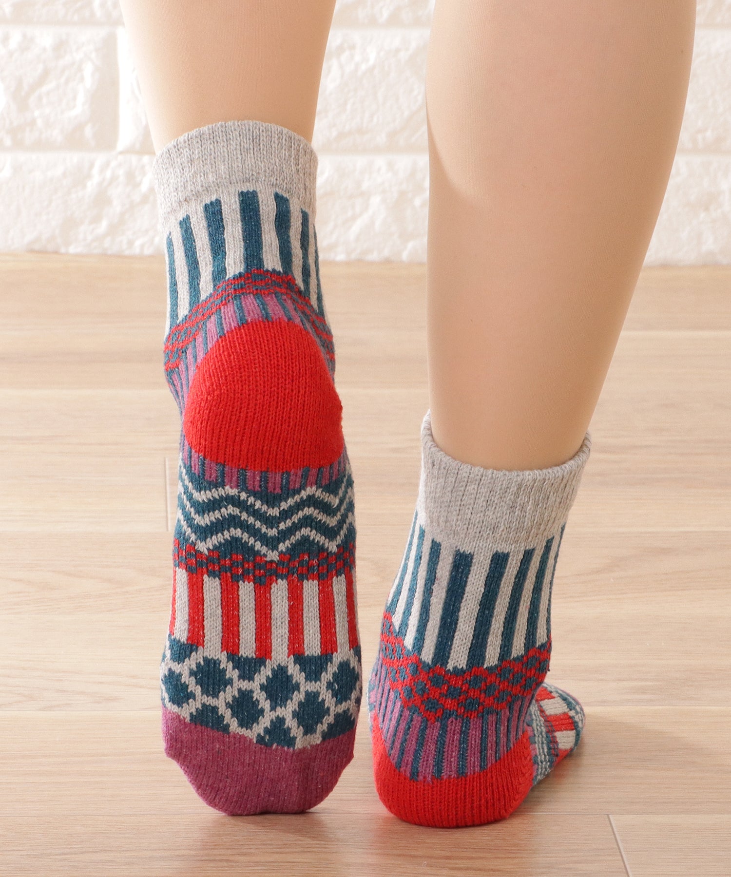 秋冬らしい民族調のデザインでおつくりした、見た目にもウォーミーなクルー丈ソックス。