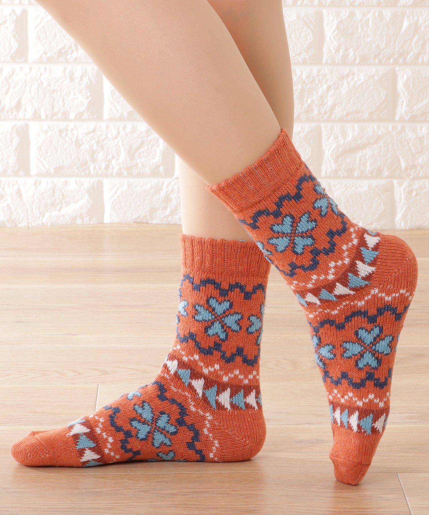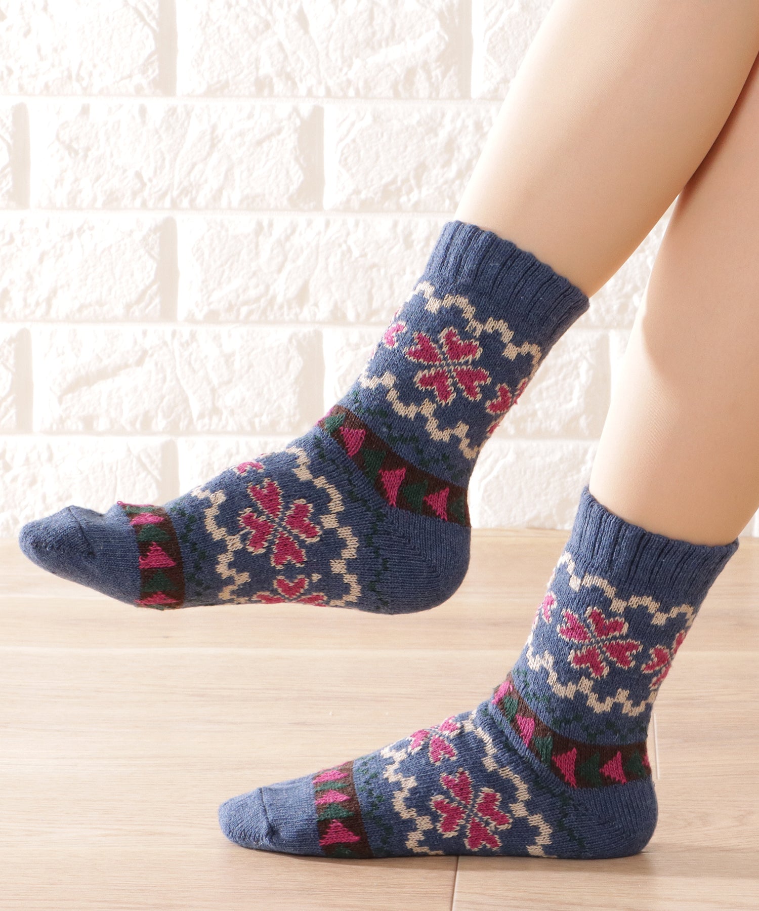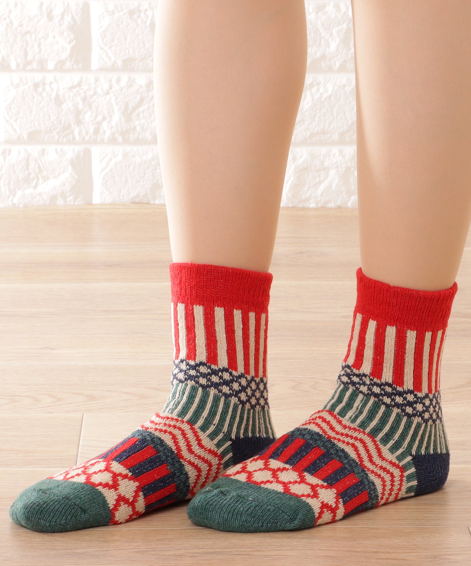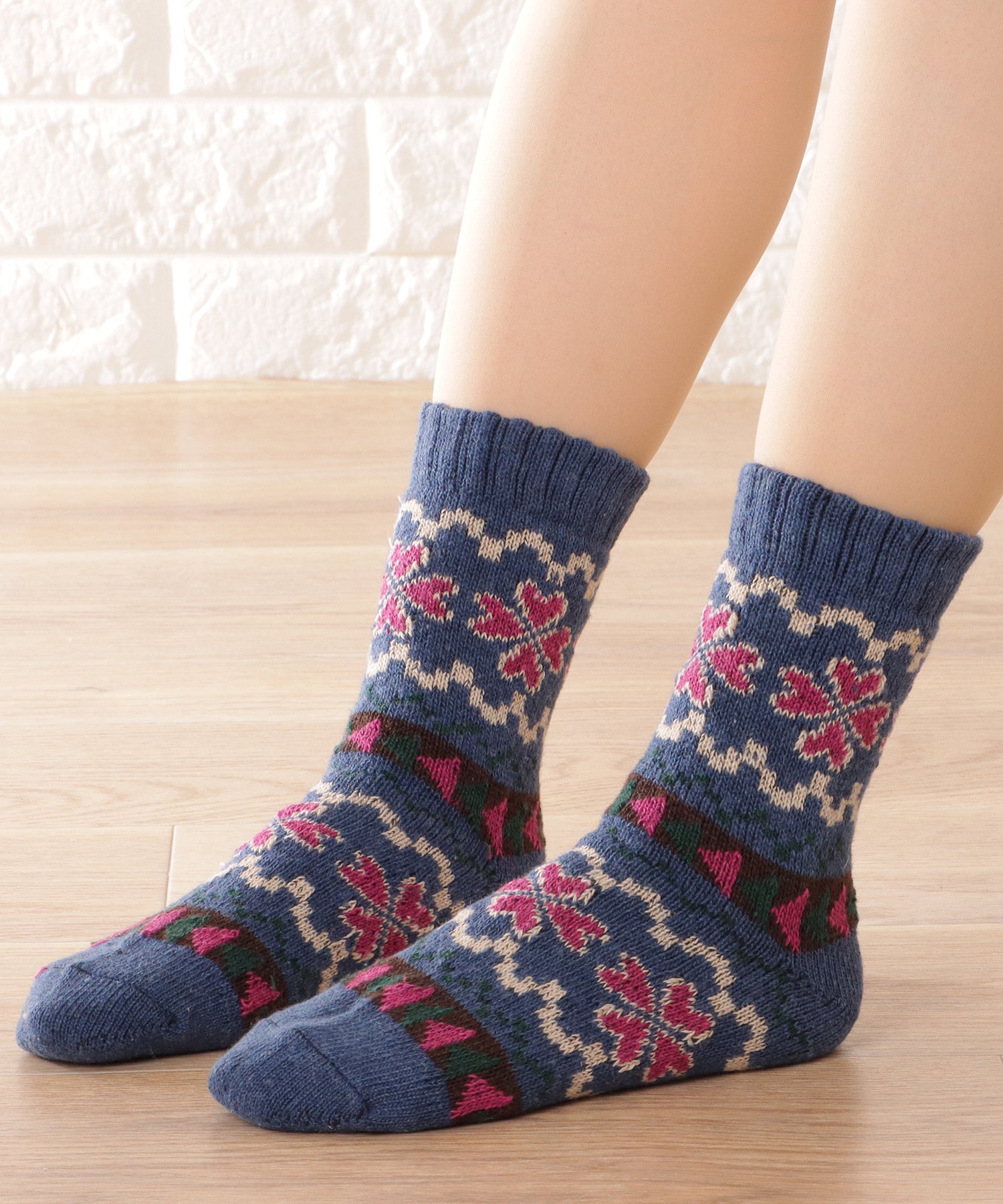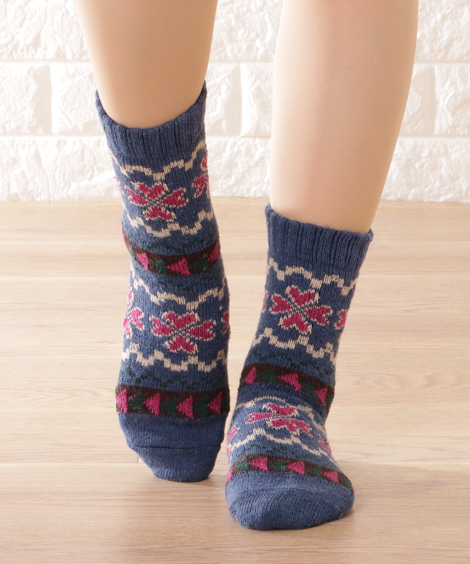 秋冬らしい民族調のデザインでおつくりした、見た目にもウォーミーなクルー丈ソックス。