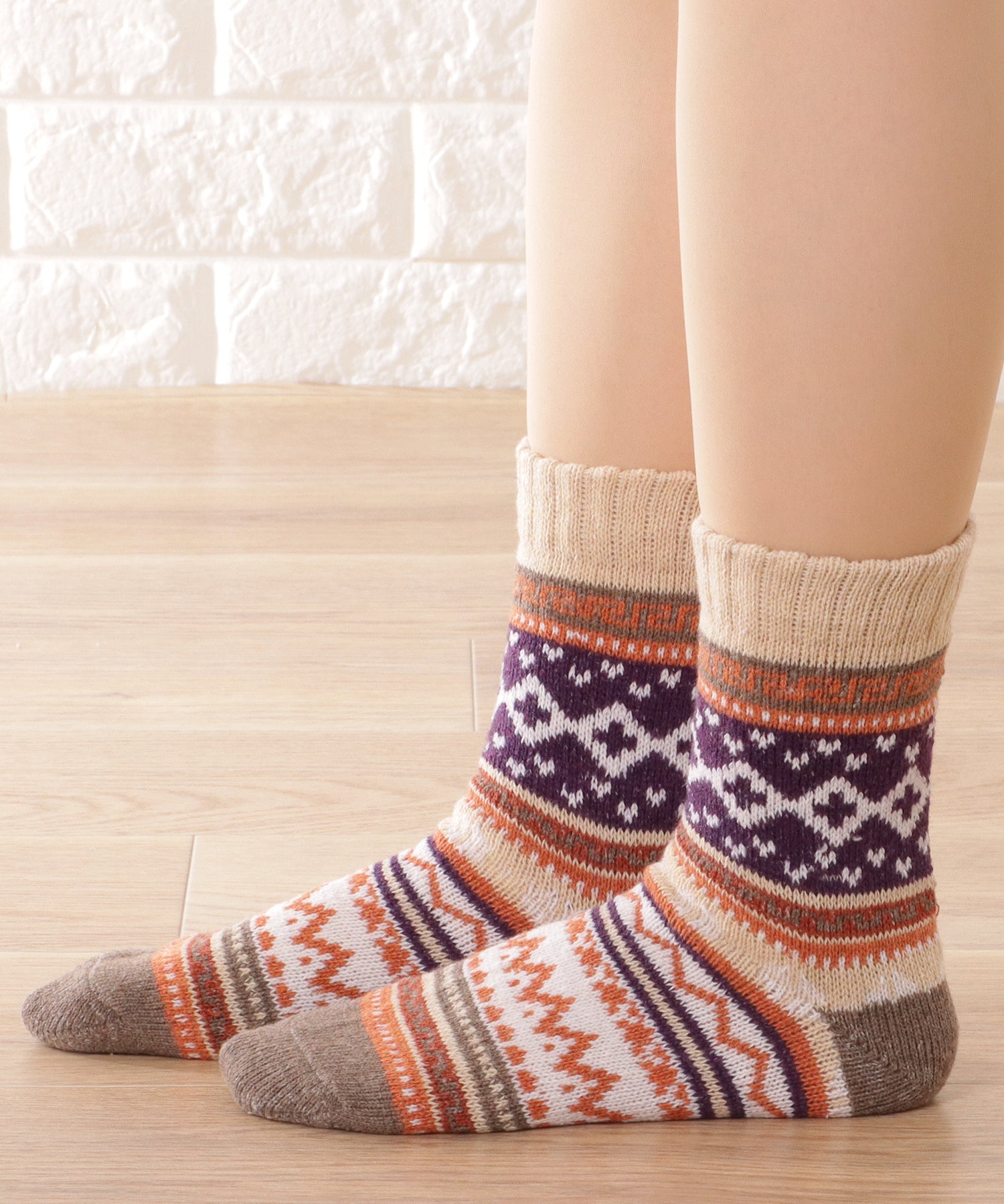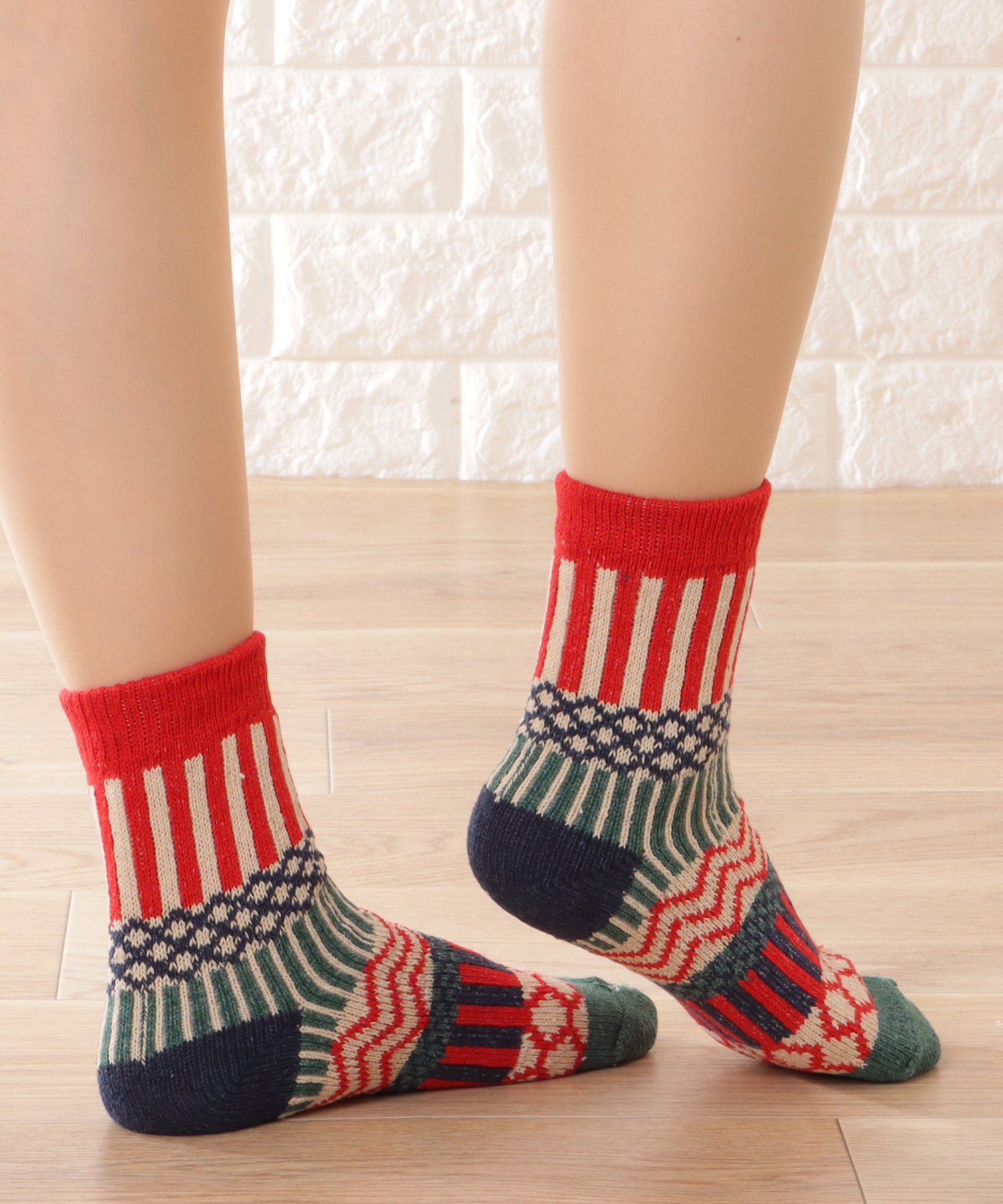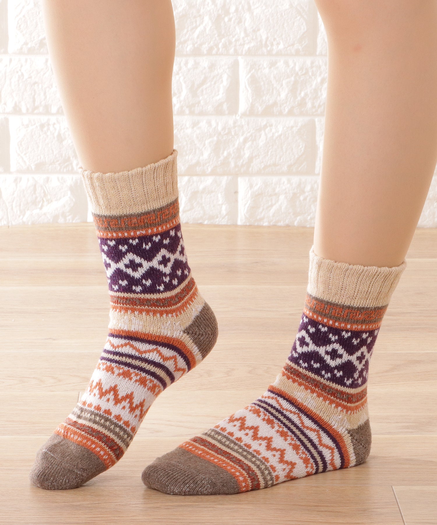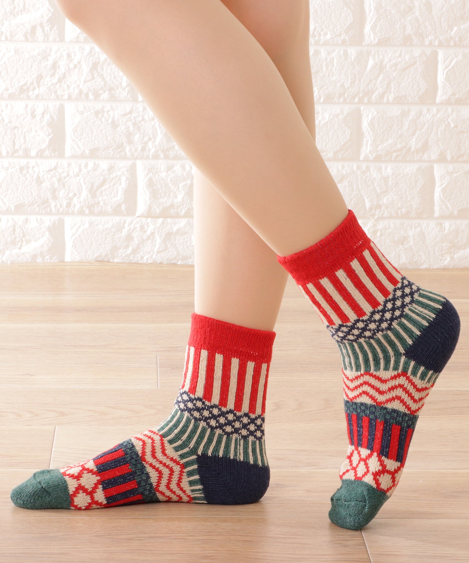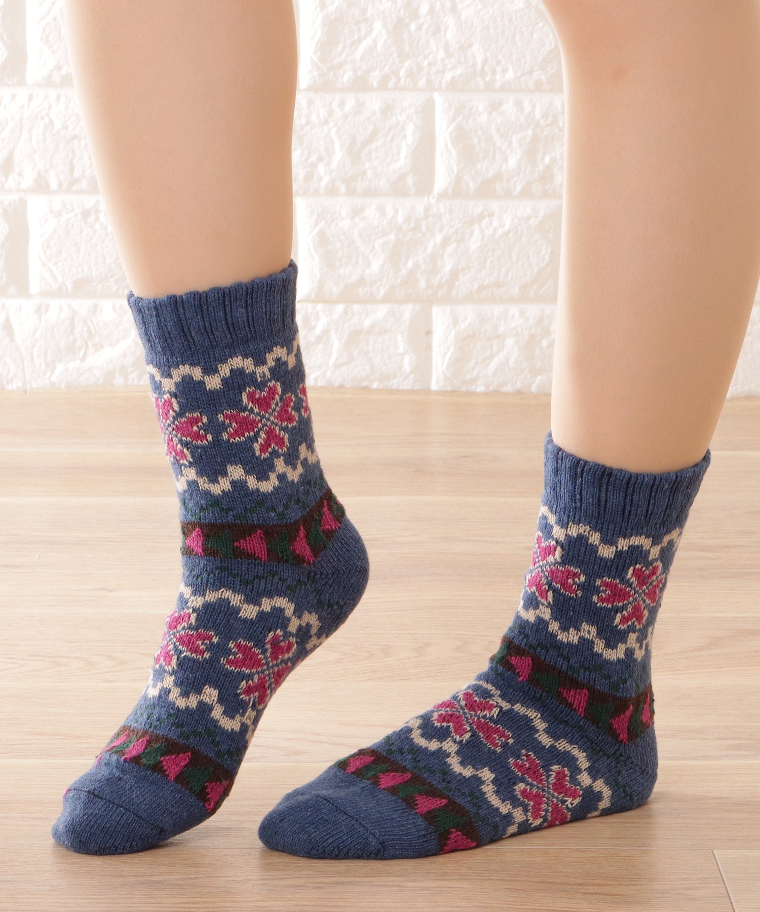 秋冬らしい民族調のデザインでおつくりした、見た目にもウォーミーなクルー丈ソックス。