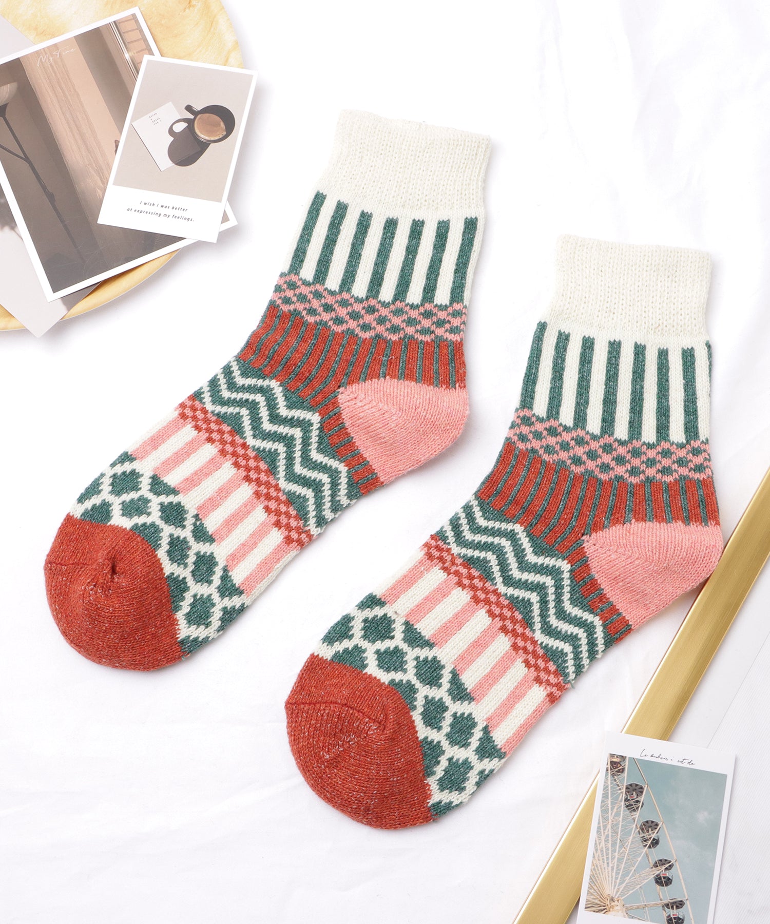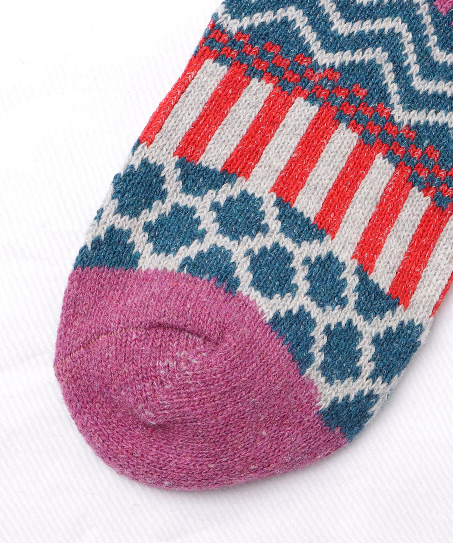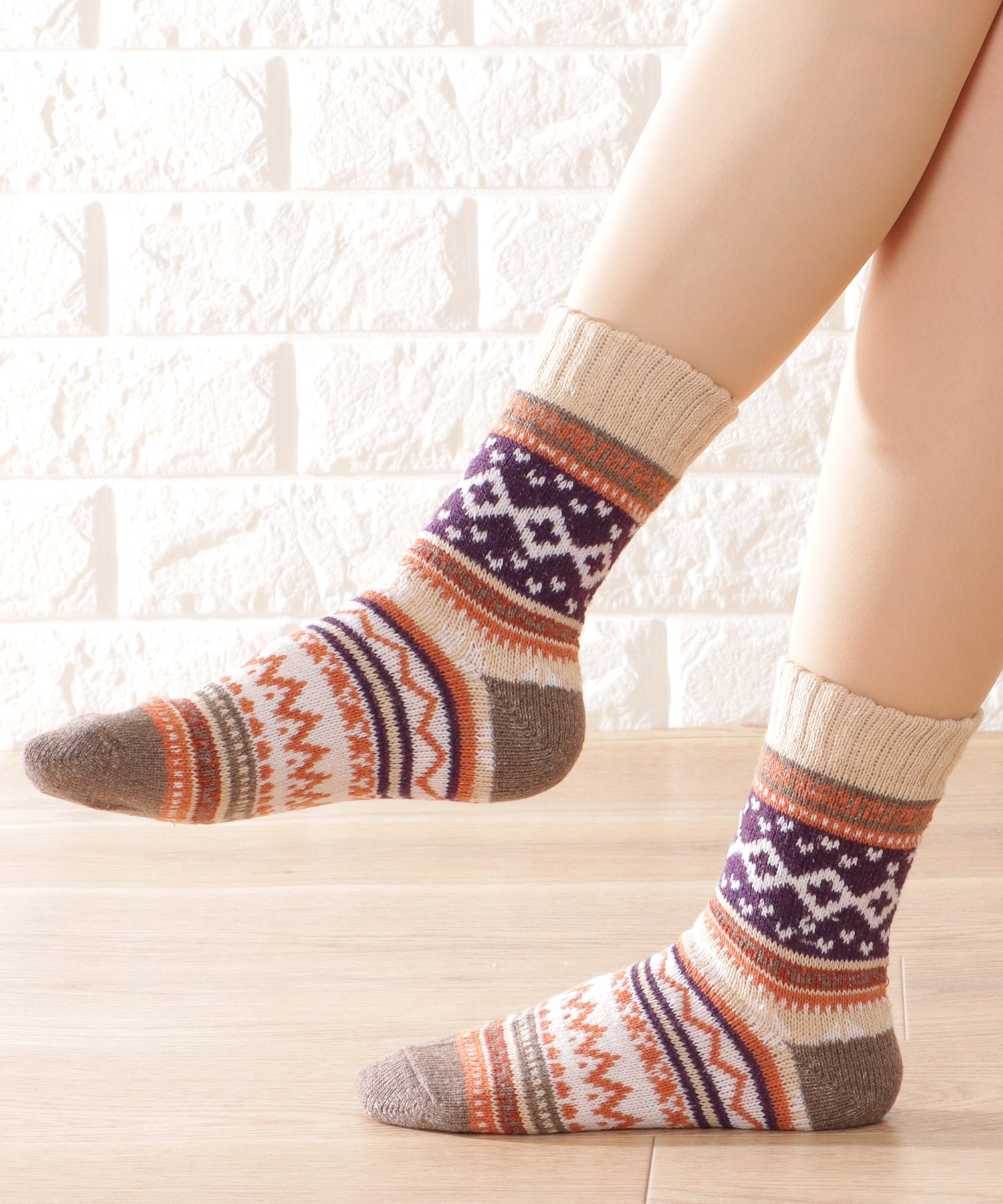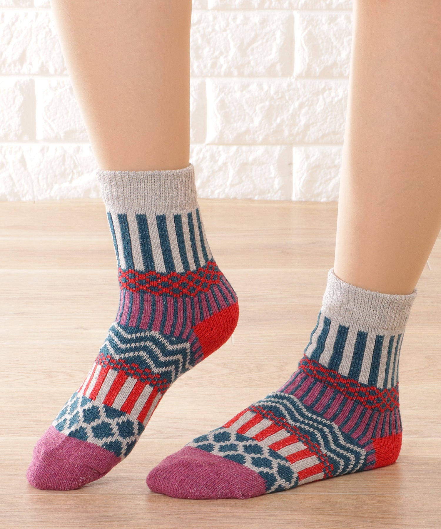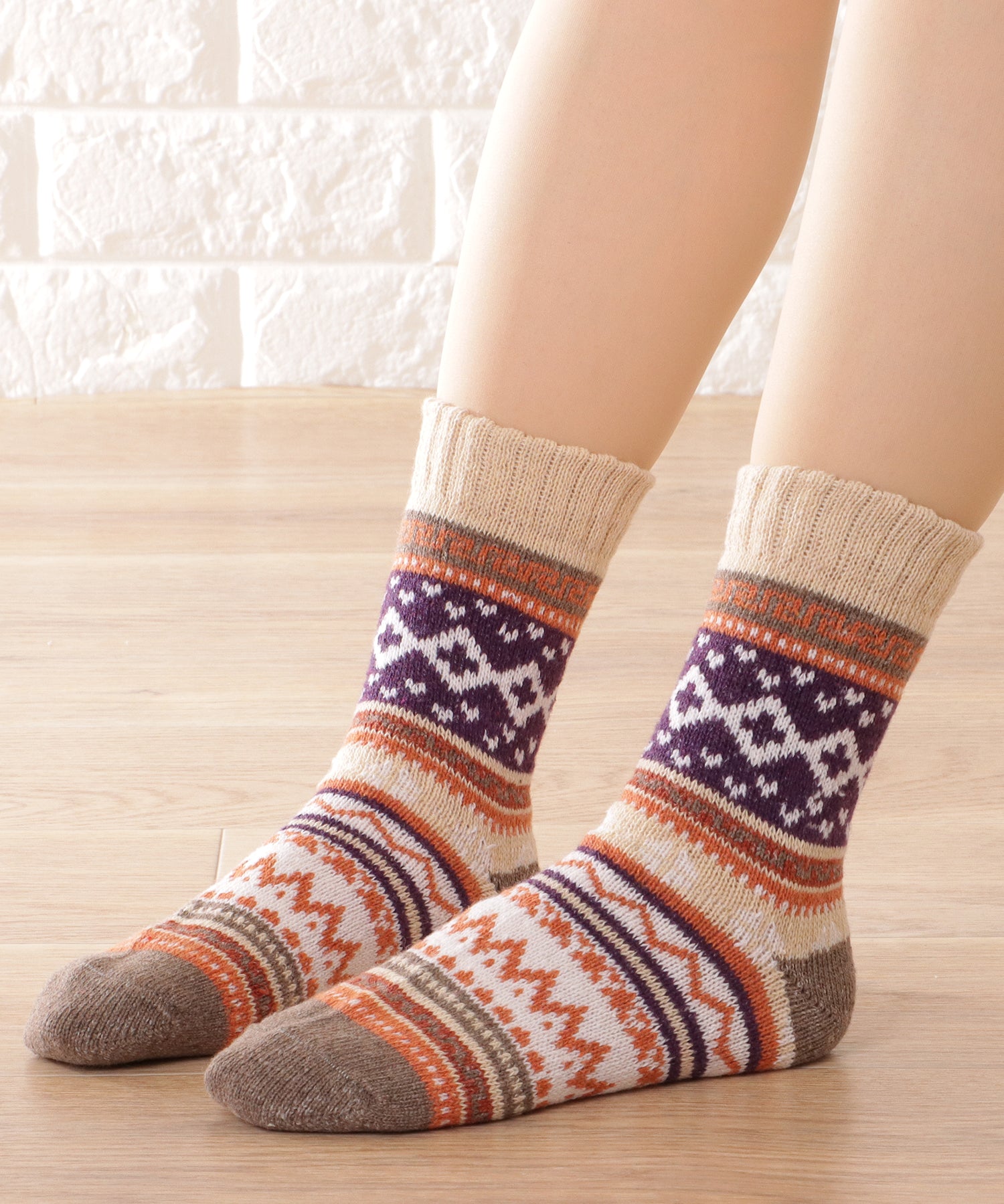 秋冬らしい民族調のデザインでおつくりした、見た目にもウォーミーなクルー丈ソックス。