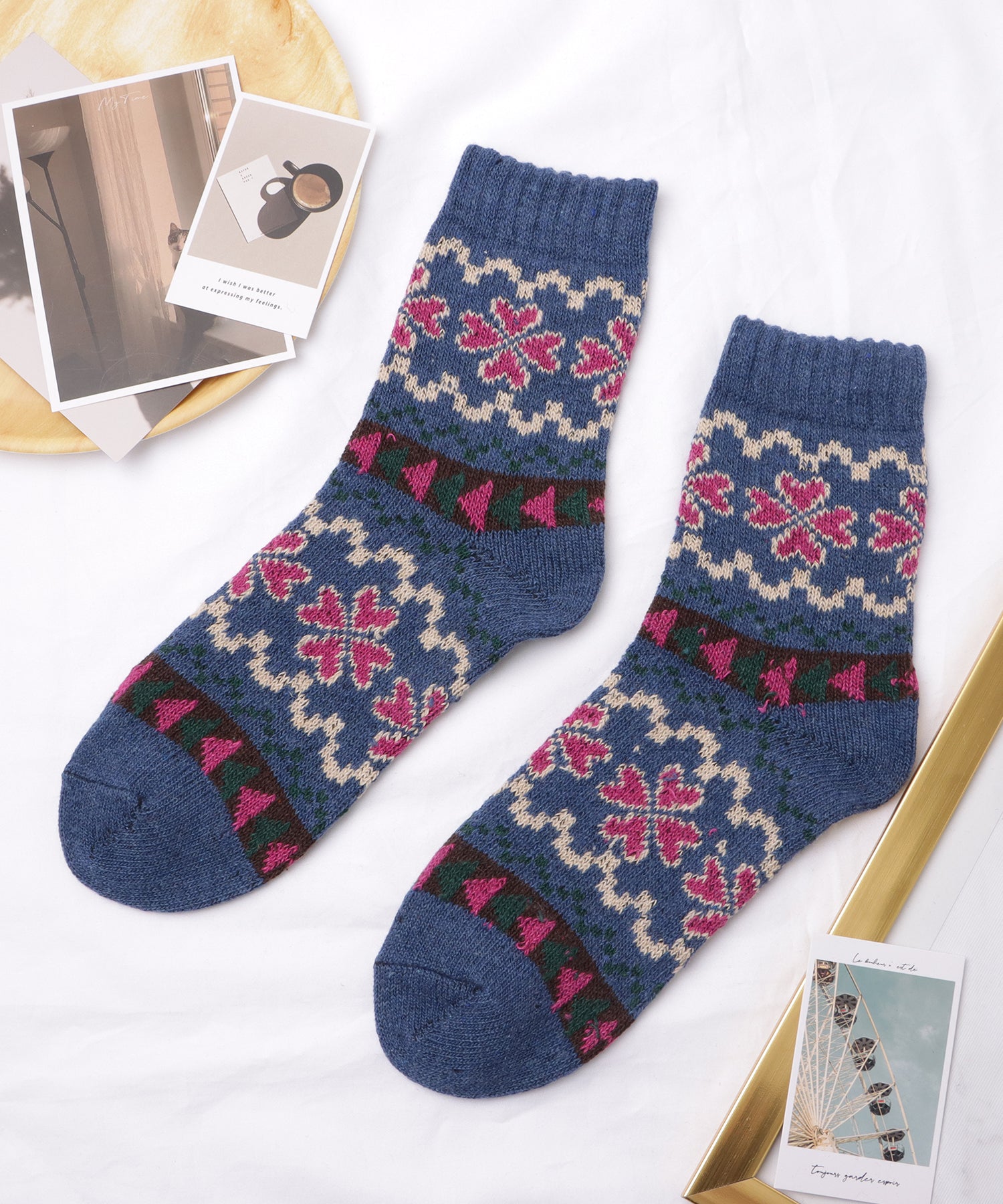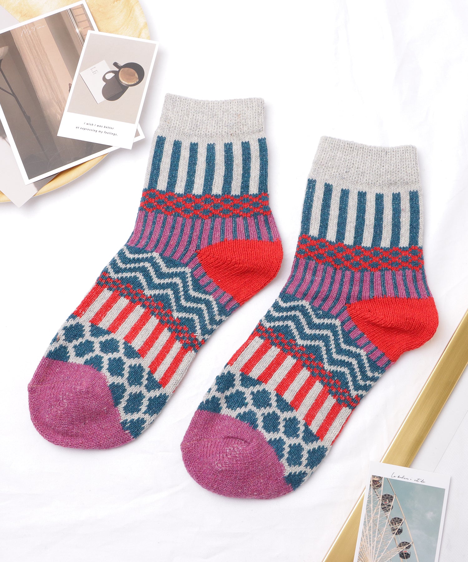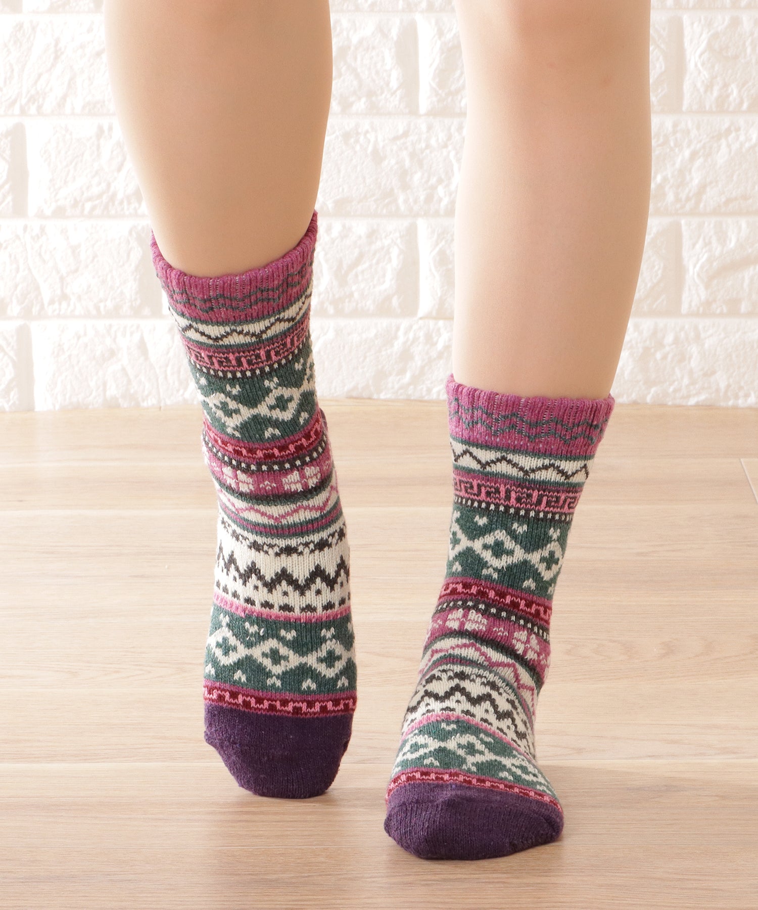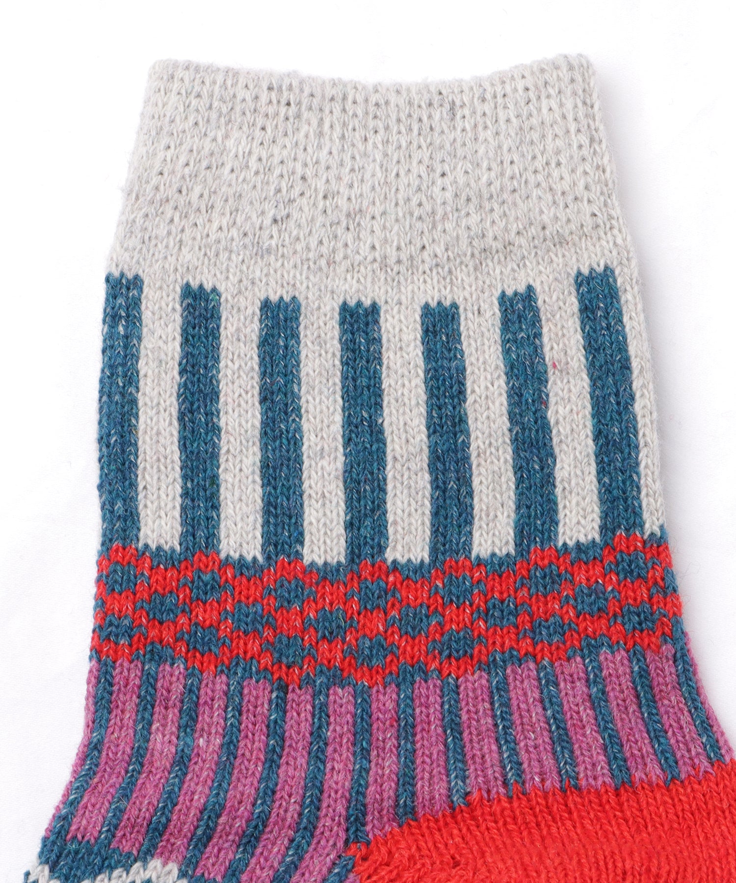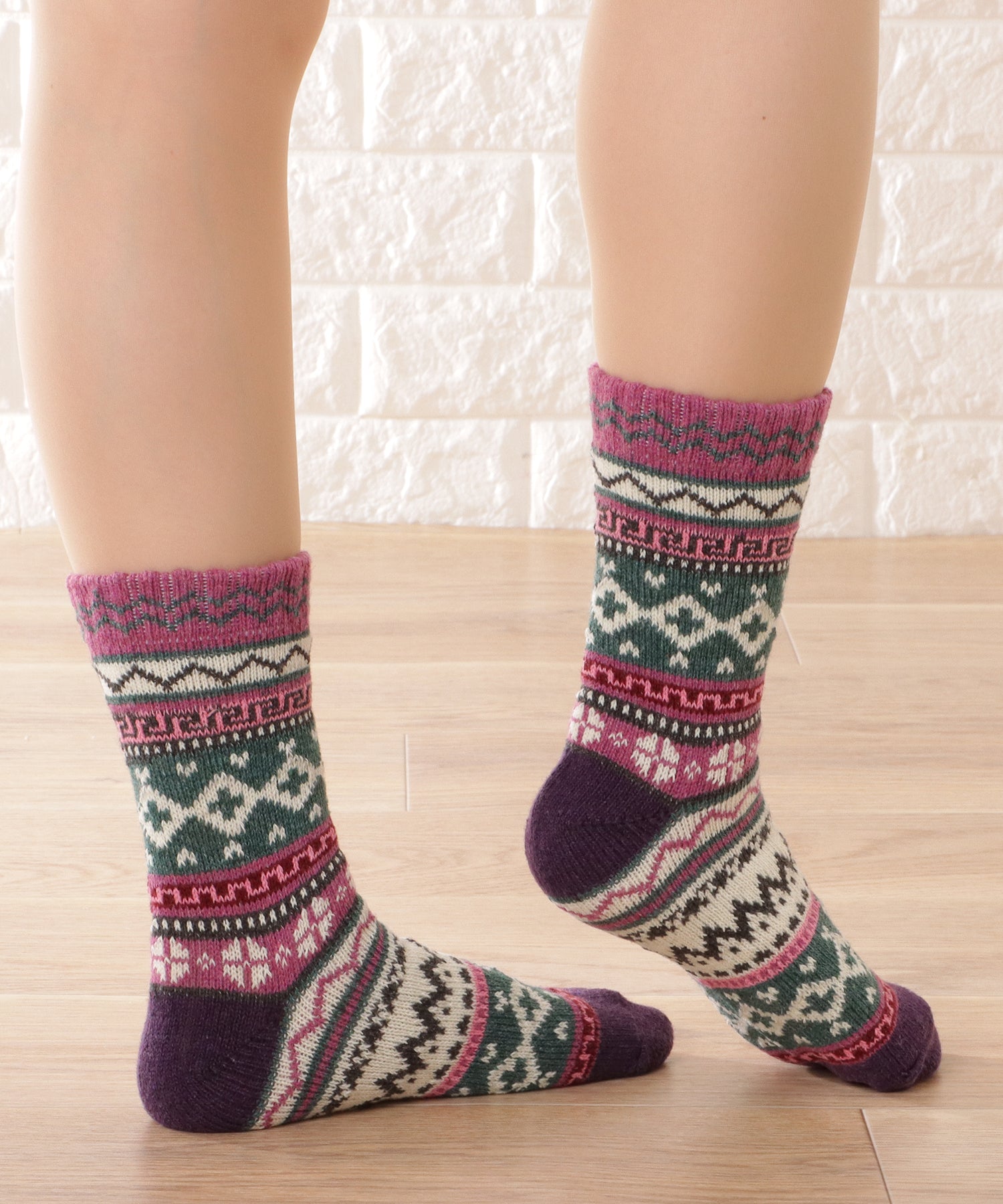 秋冬らしい民族調のデザインでおつくりした、見た目にもウォーミーなクルー丈ソックス。