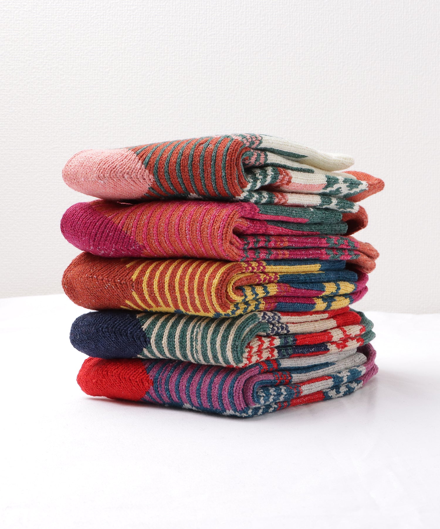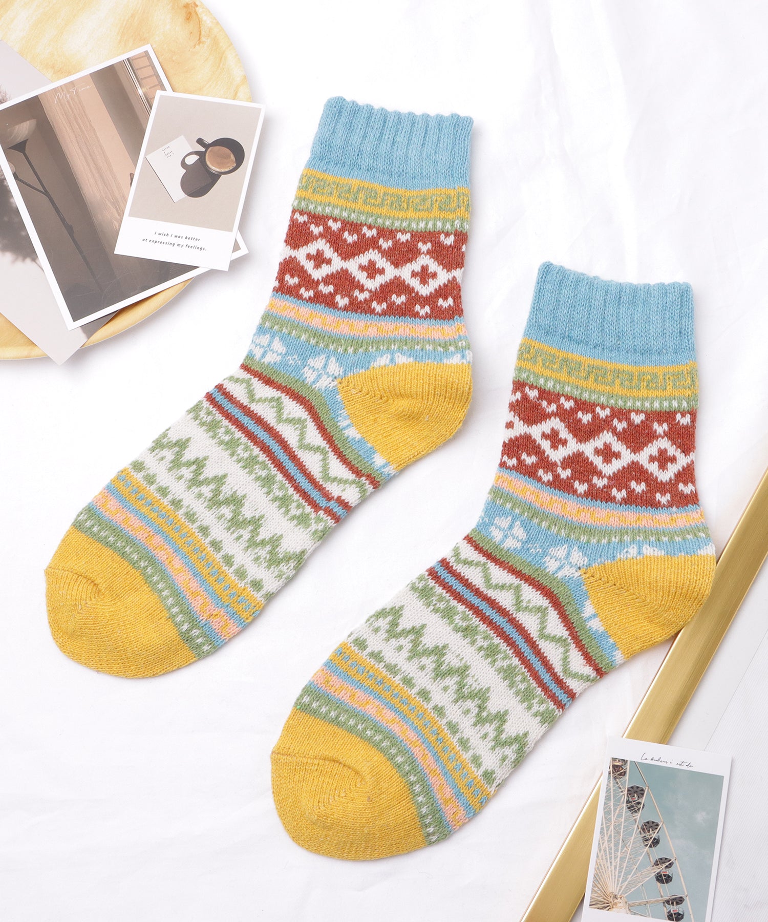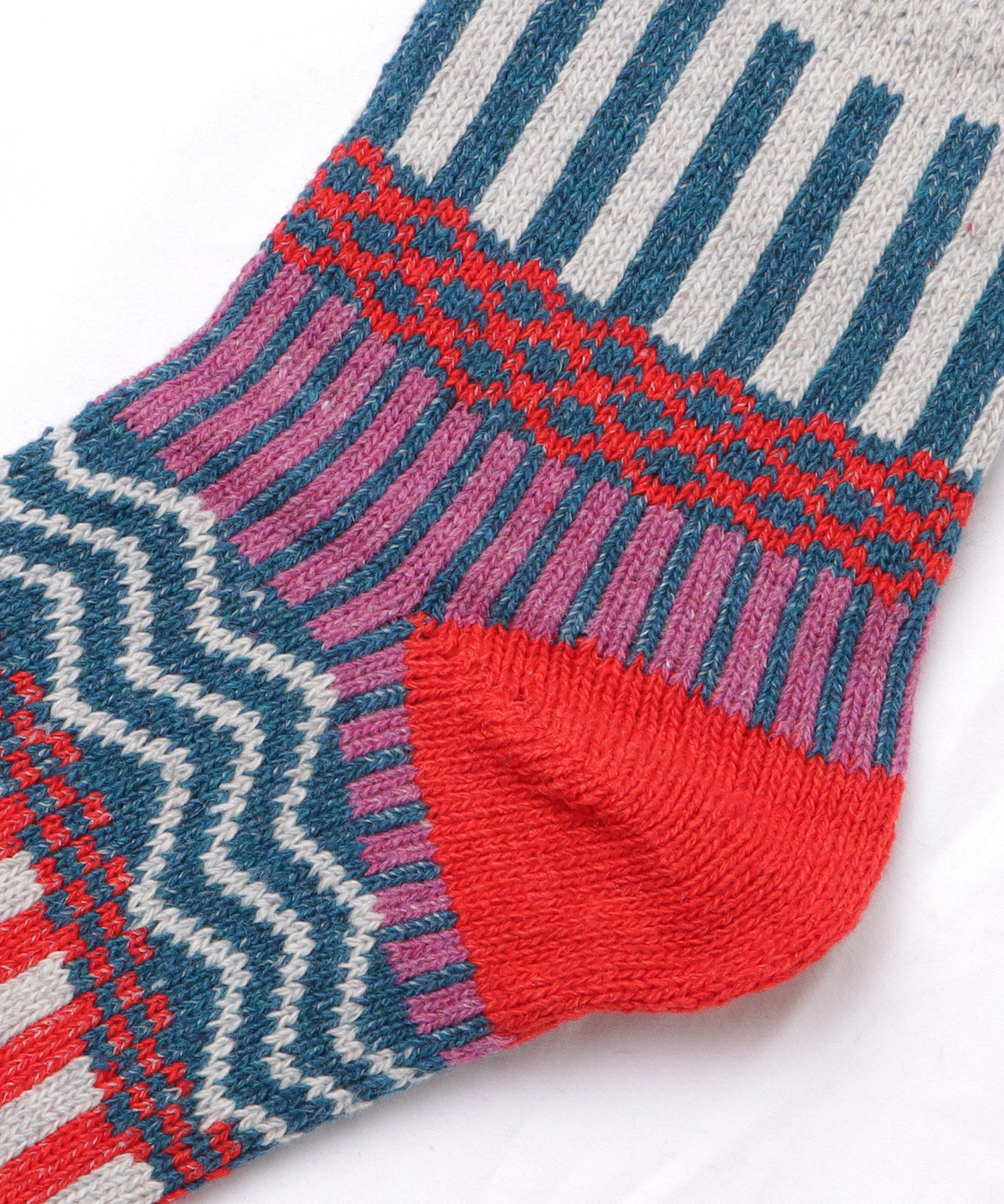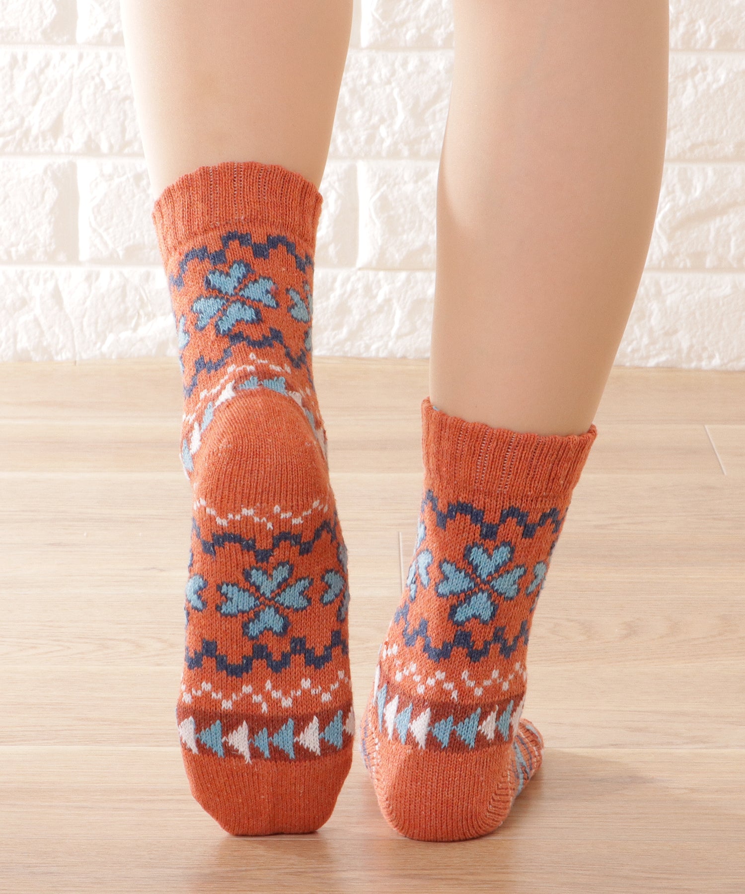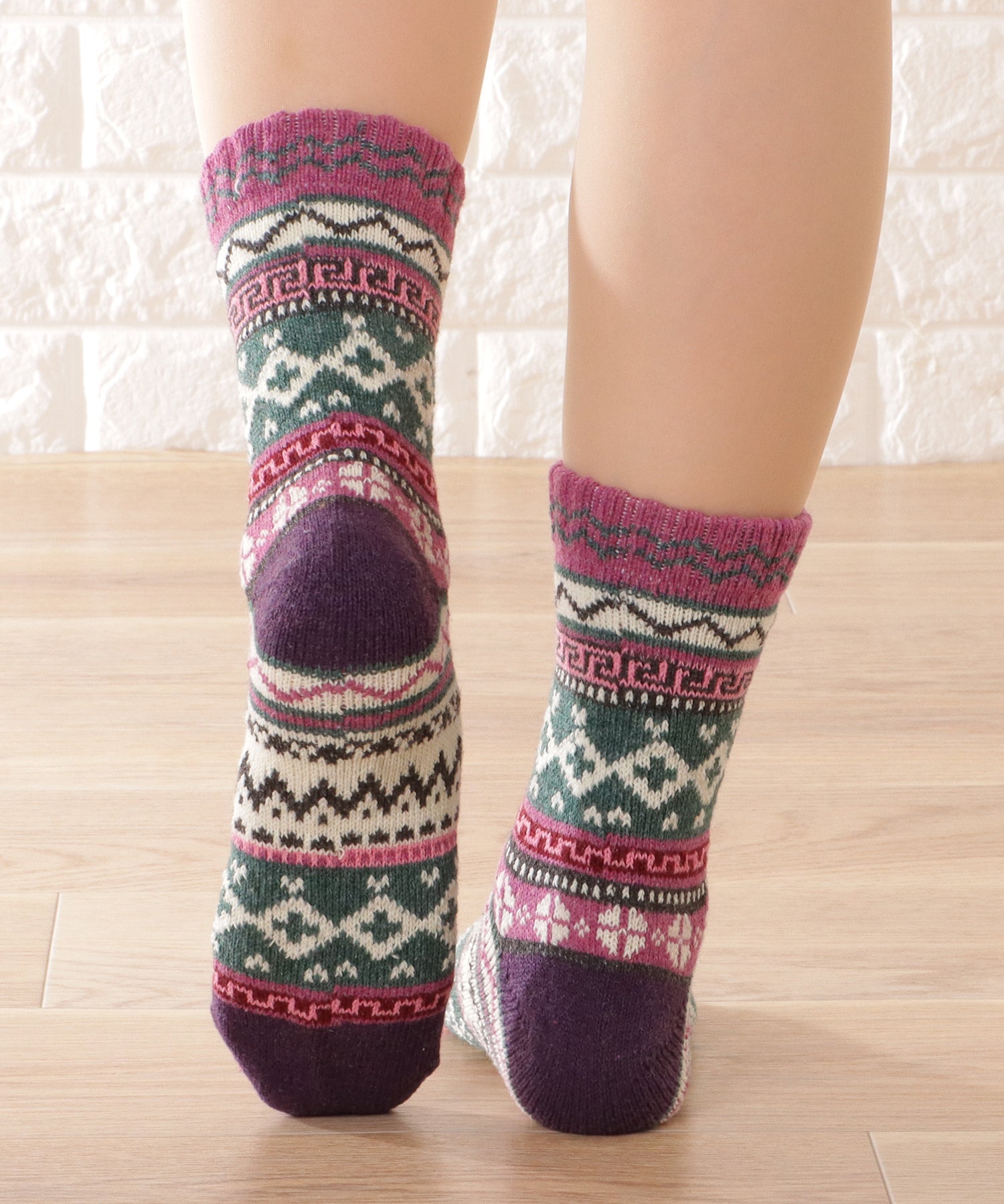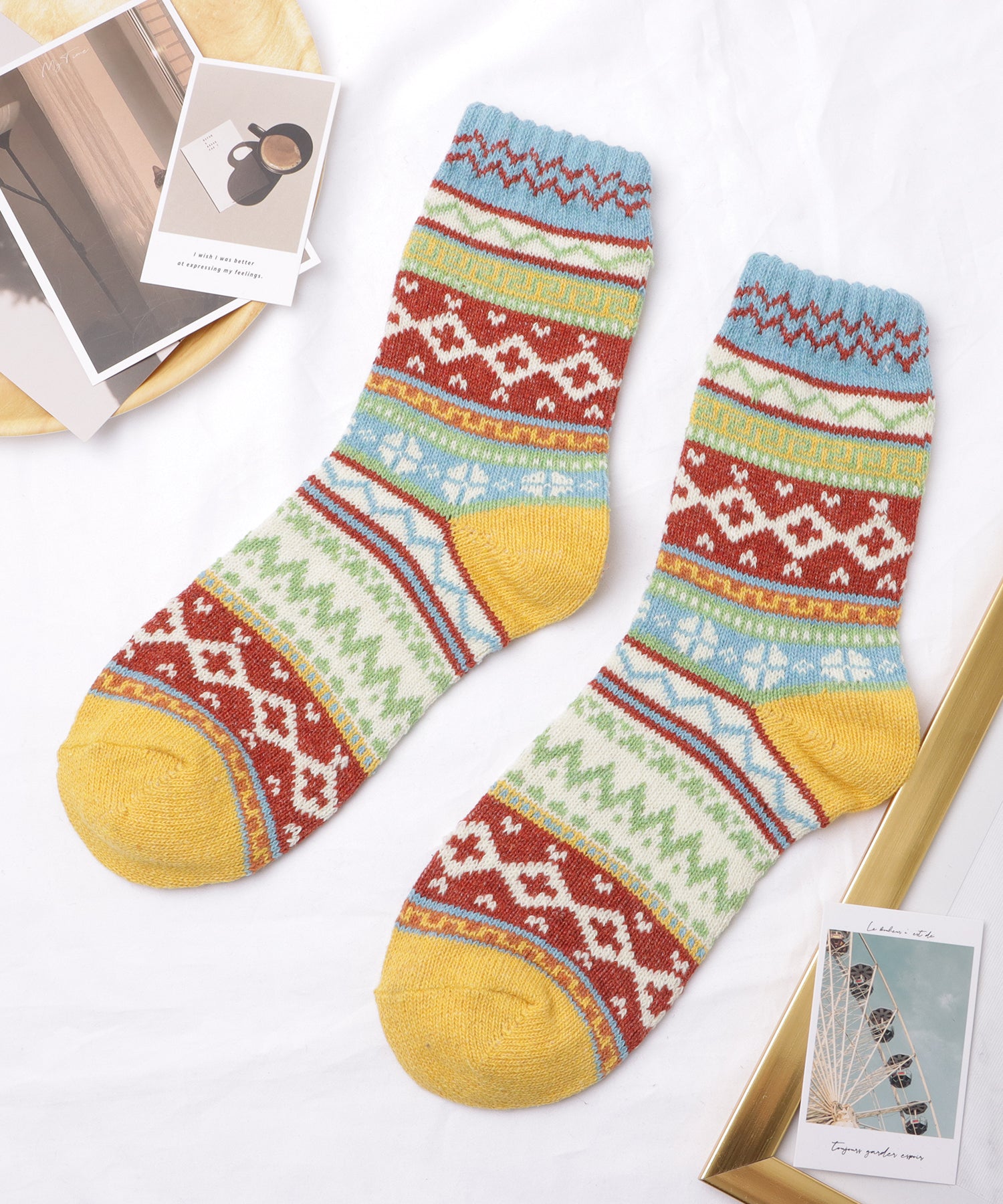 秋冬らしい民族調のデザインでおつくりした、見た目にもウォーミーなクルー丈ソックス。