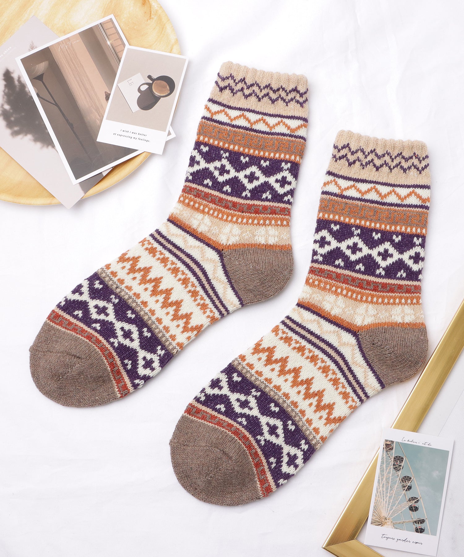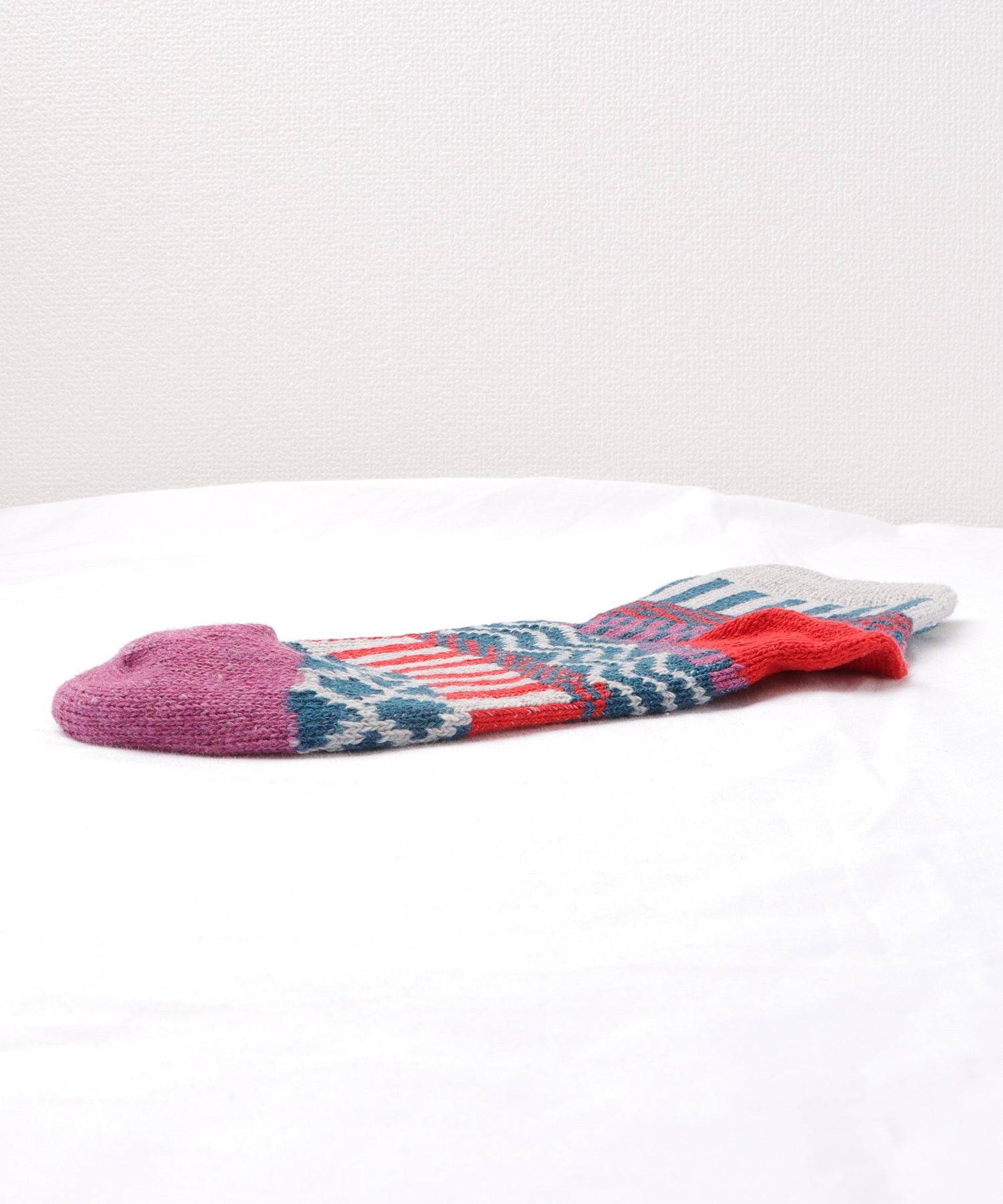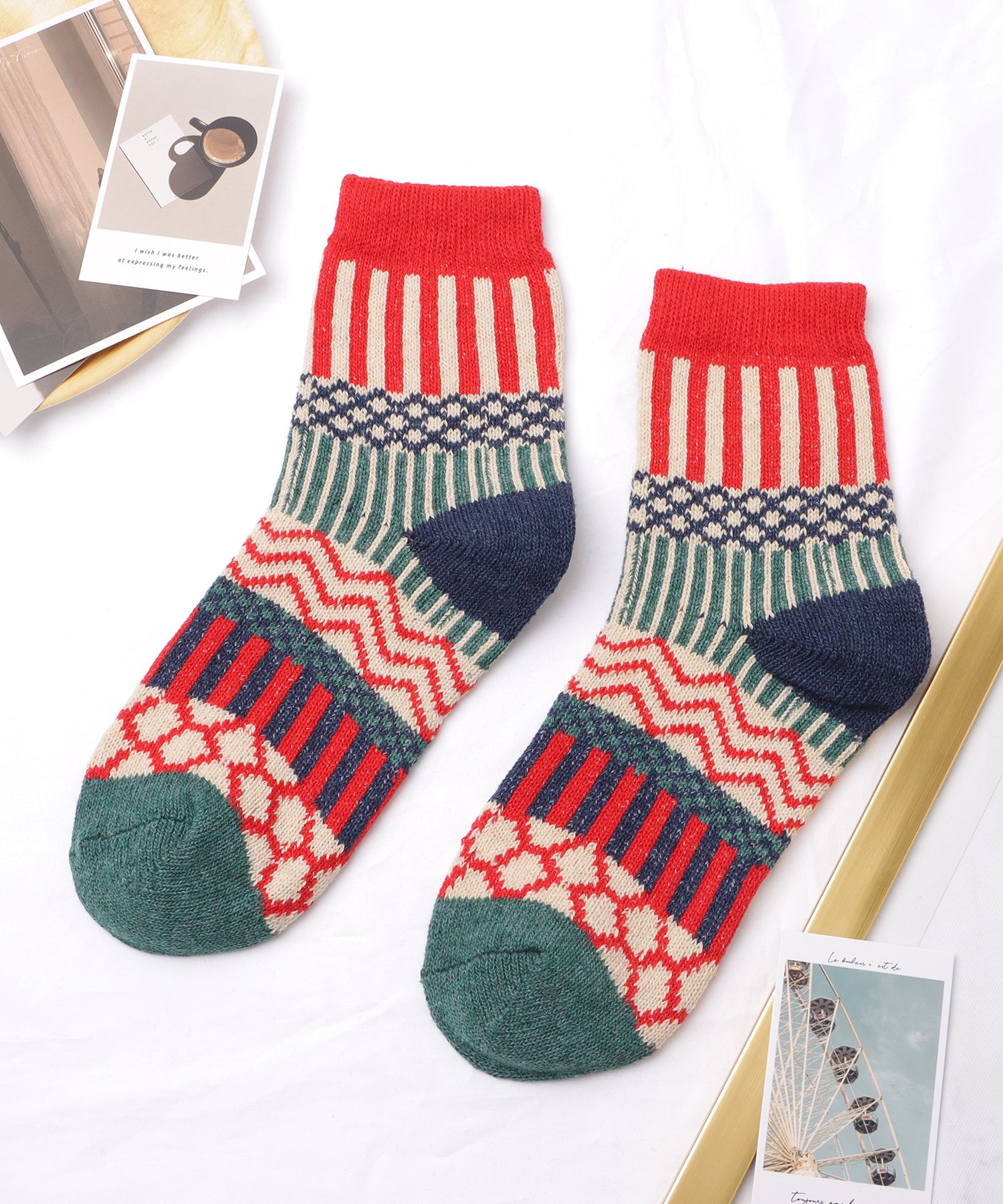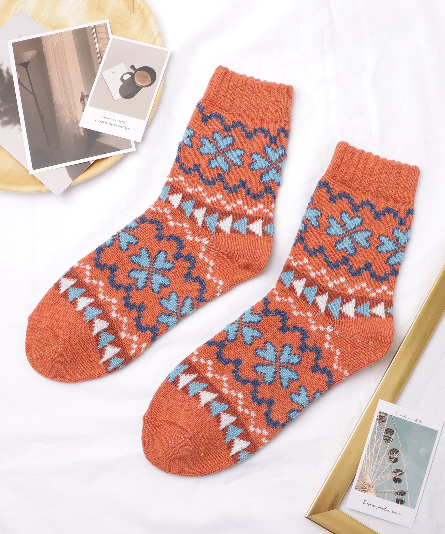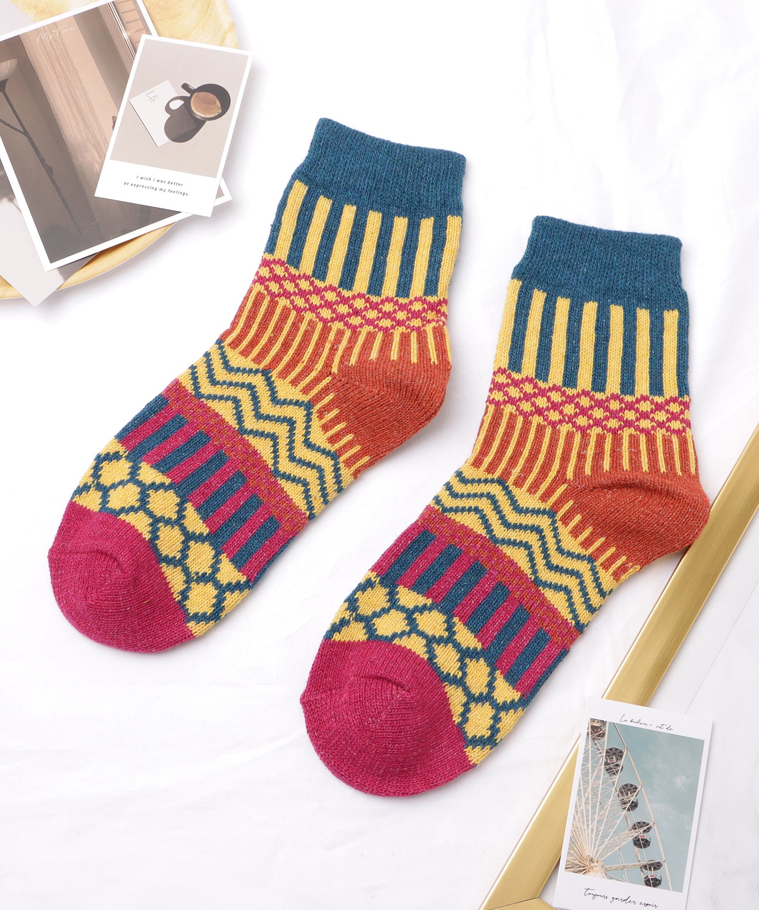秋冬らしい民族調のデザインでおつくりした、見た目にもウォーミーなクルー丈ソックス。