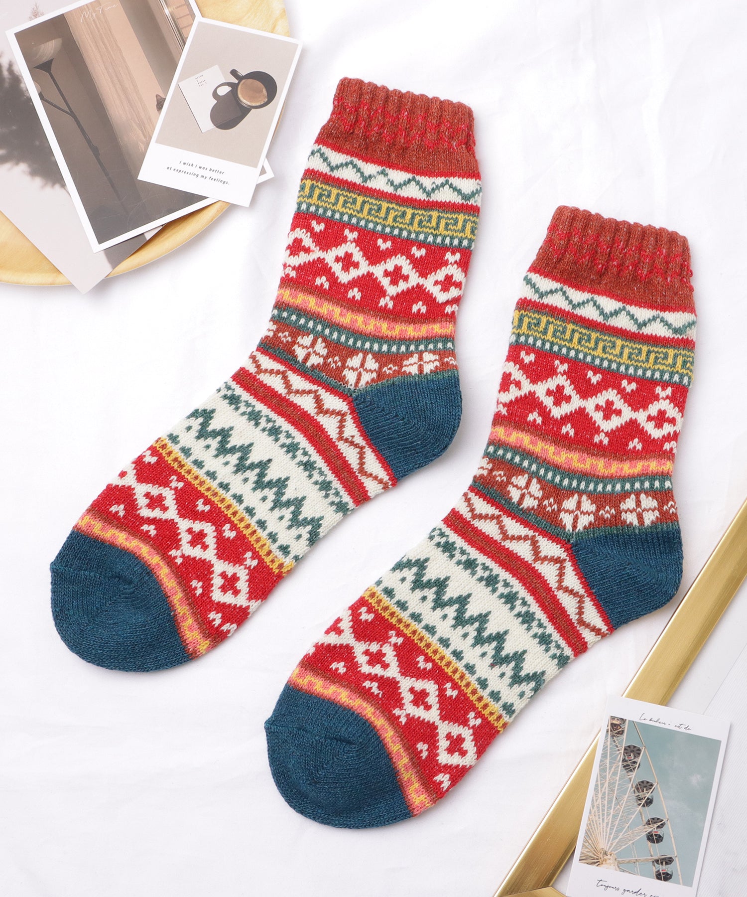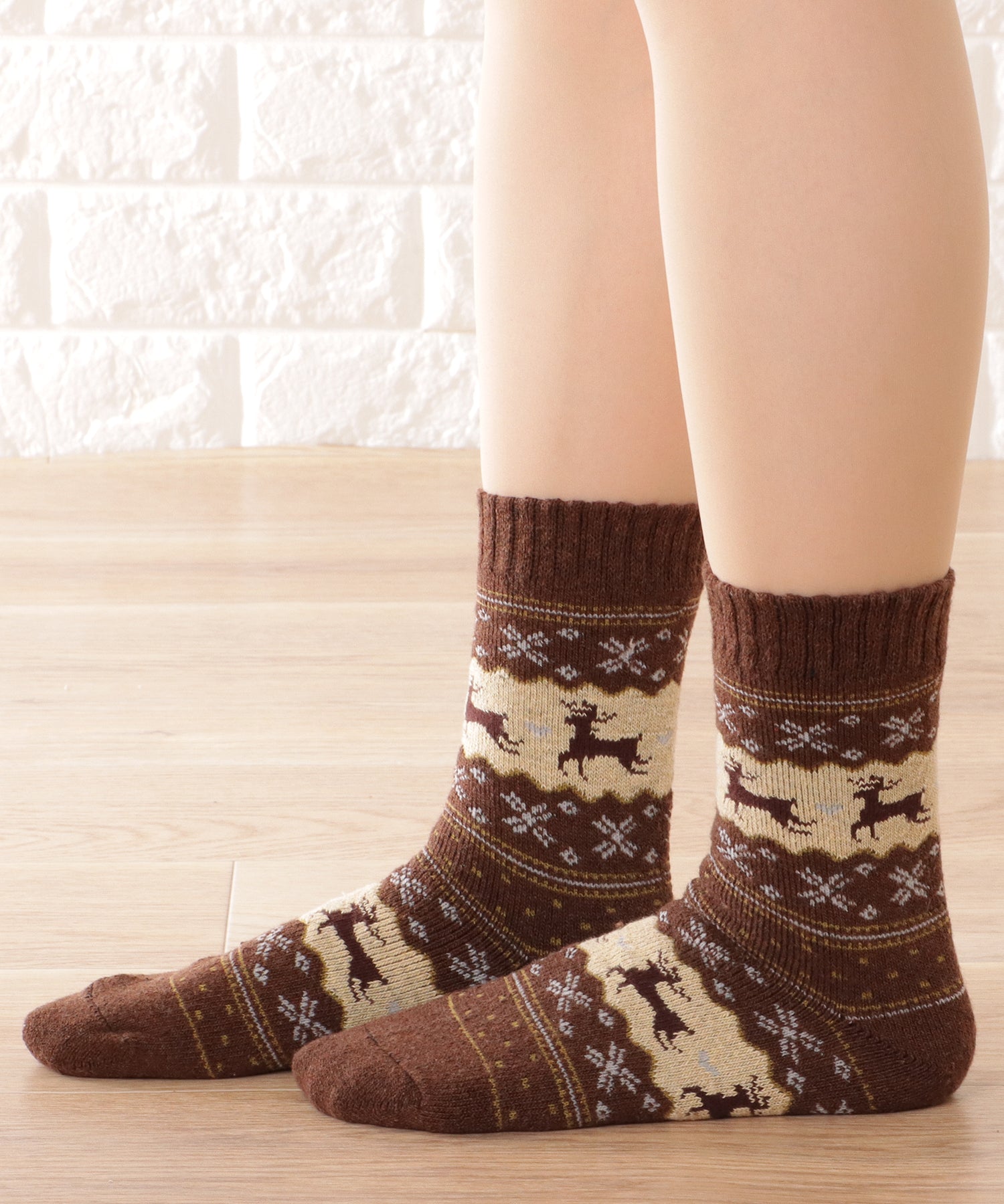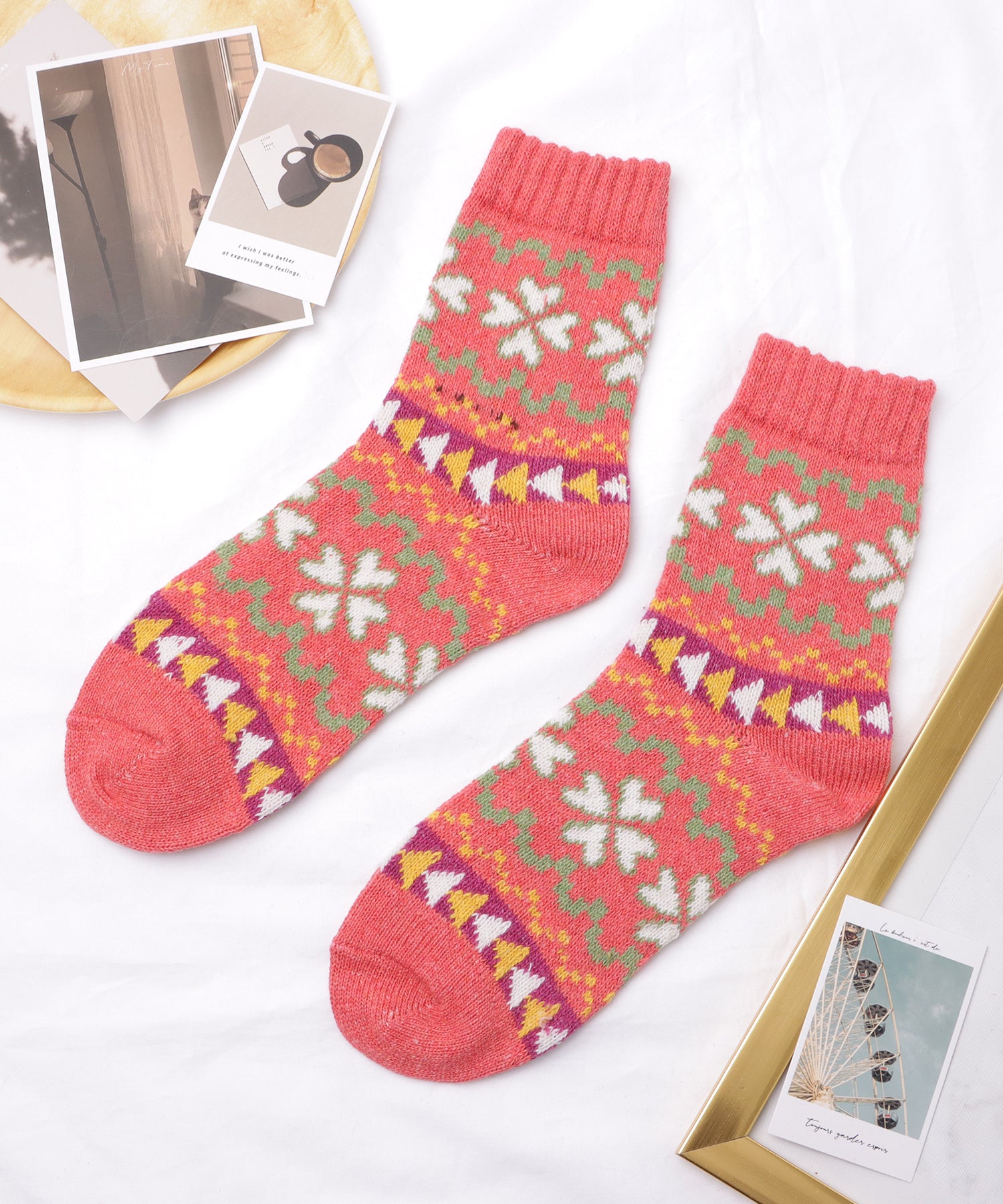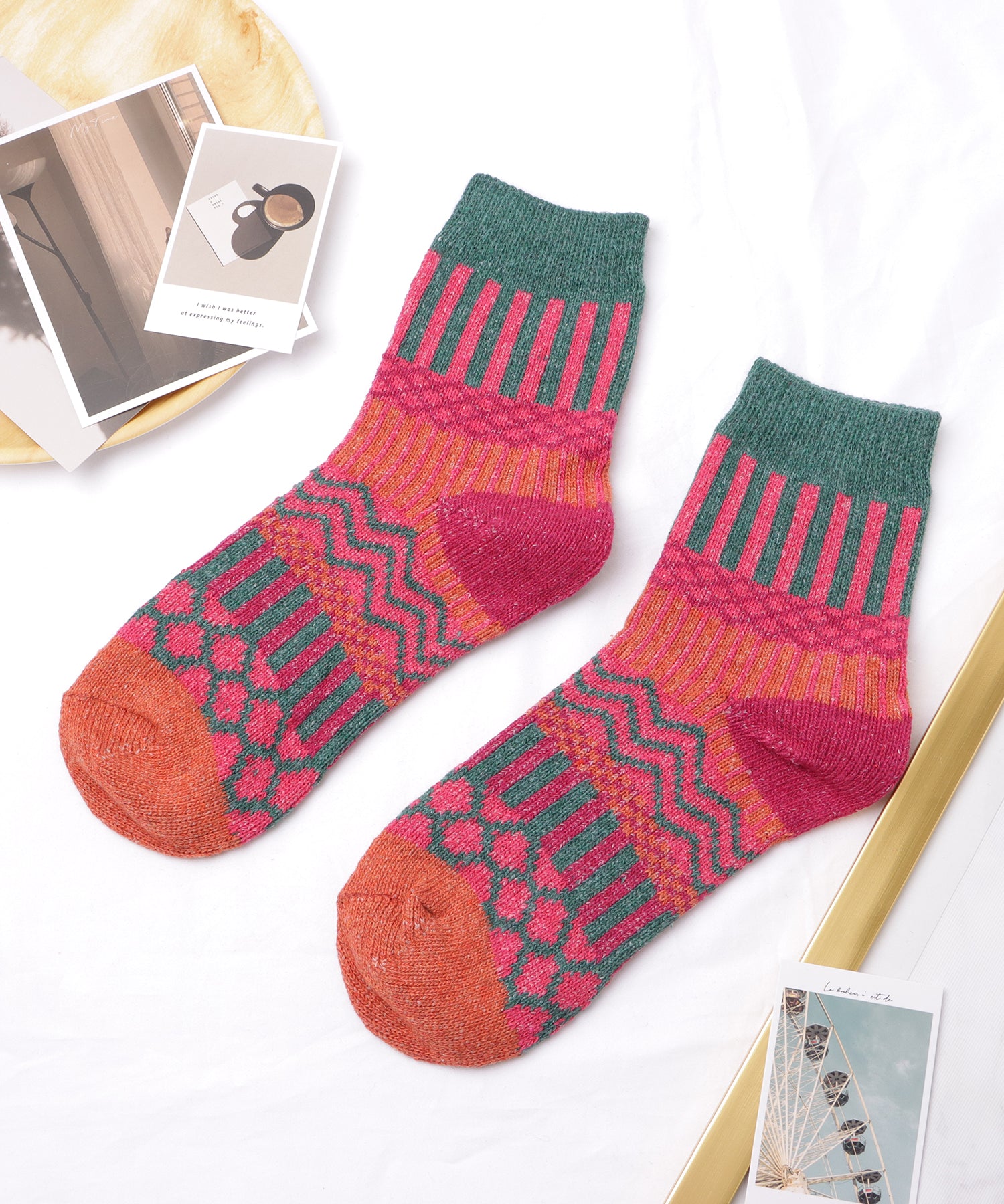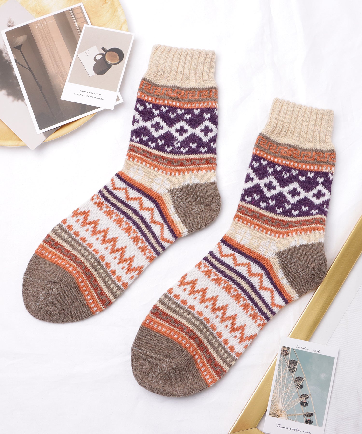 秋冬らしい民族調のデザインでおつくりした、見た目にもウォーミーなクルー丈ソックス。