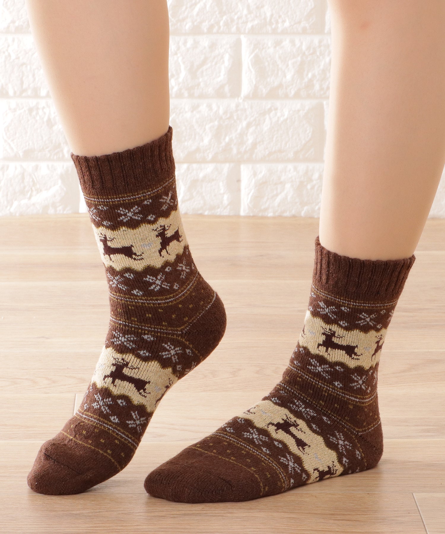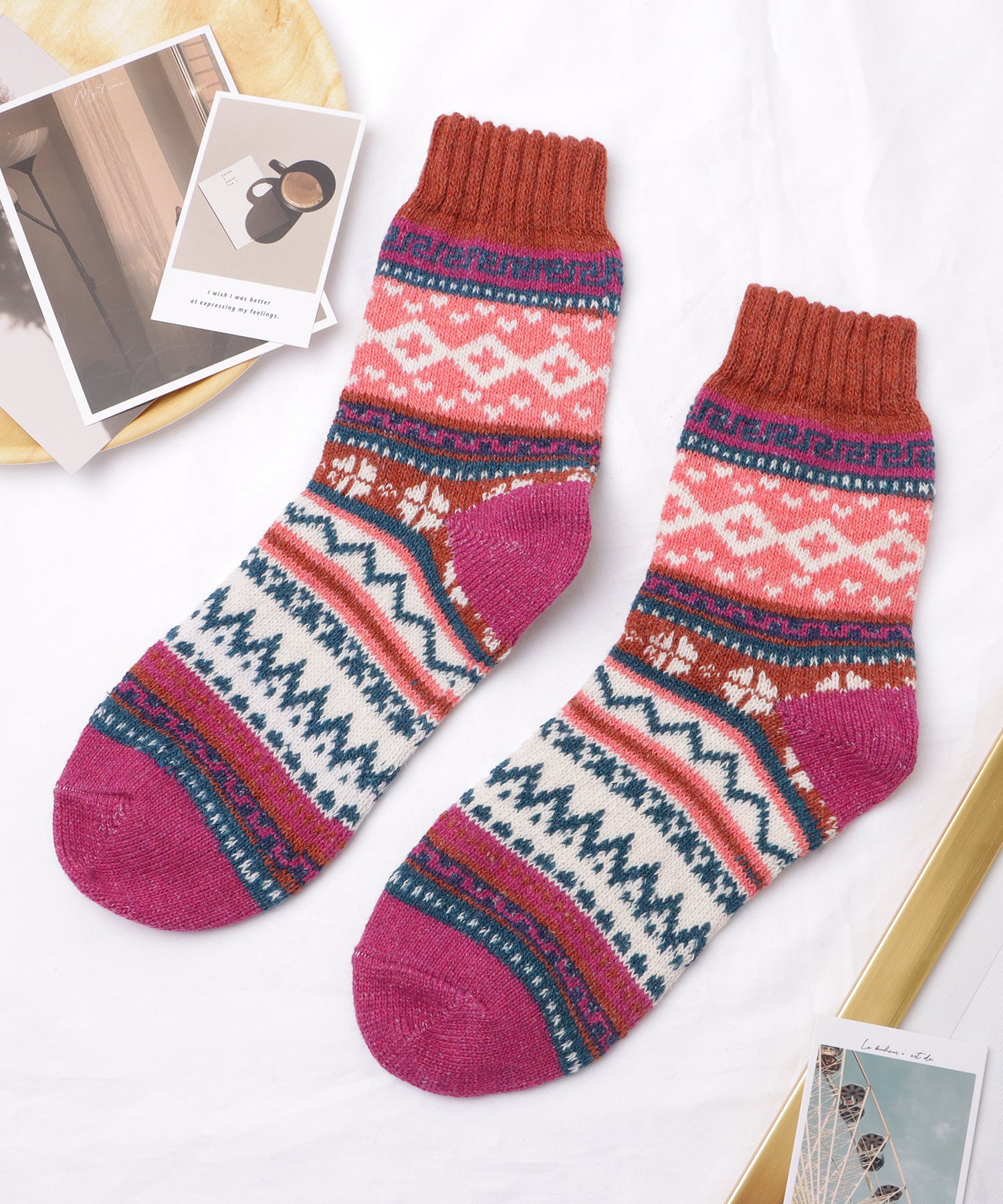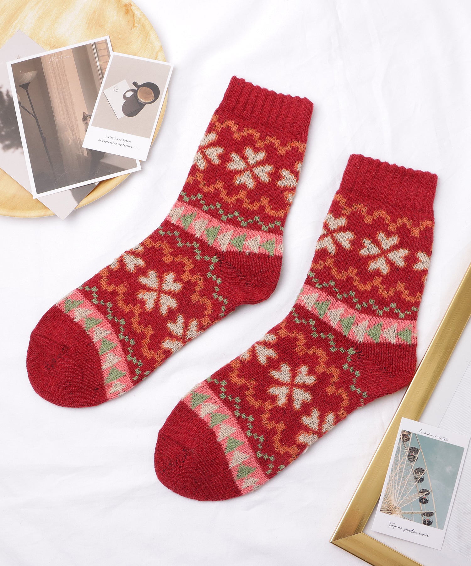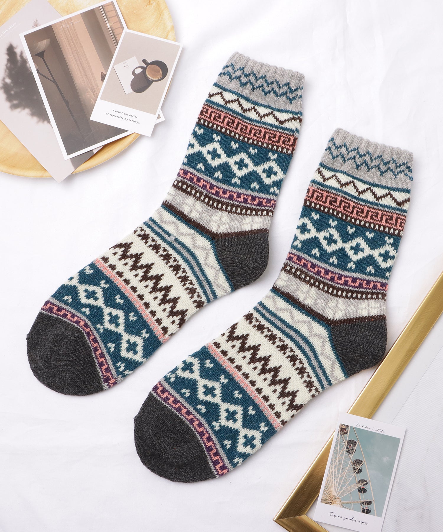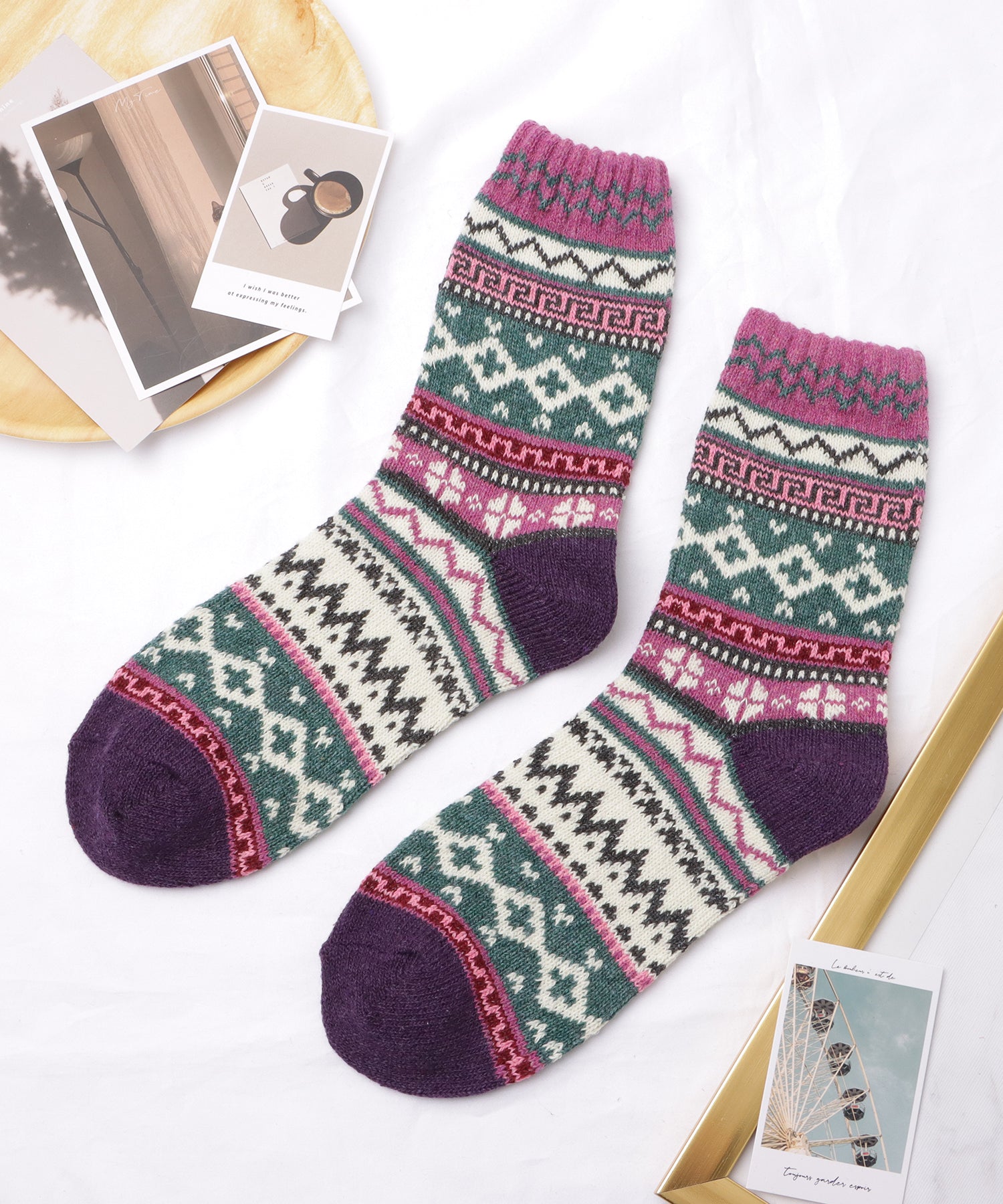 秋冬らしい民族調のデザインでおつくりした、見た目にもウォーミーなクルー丈ソックス。