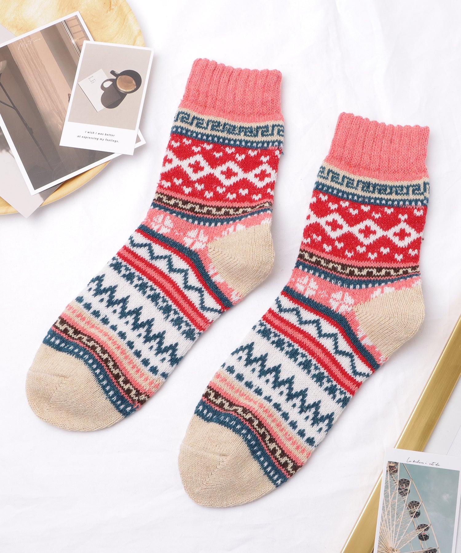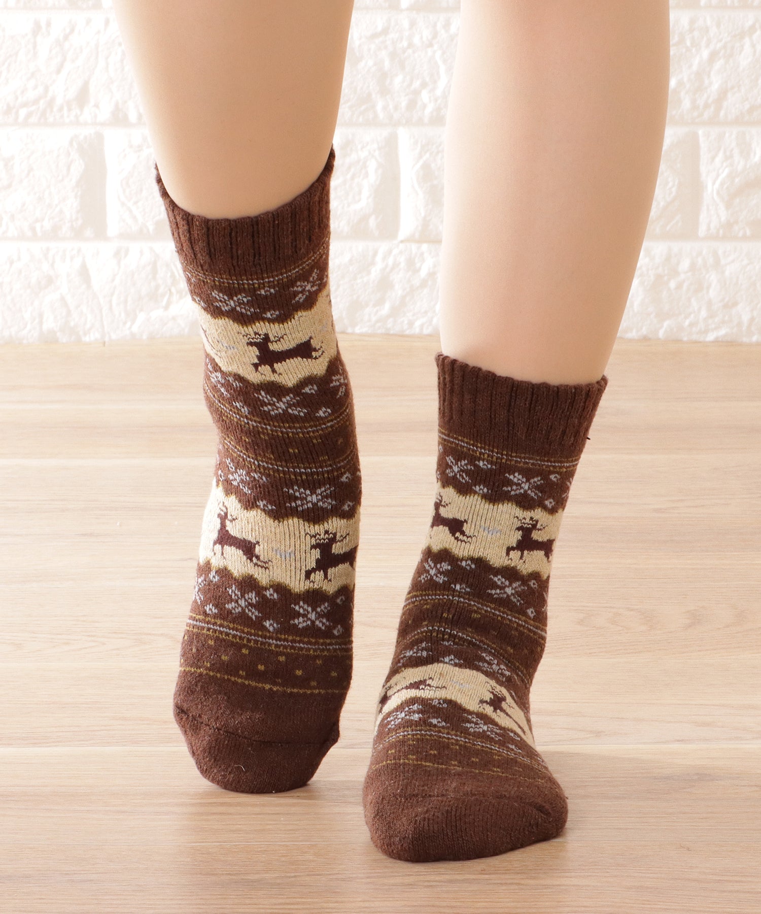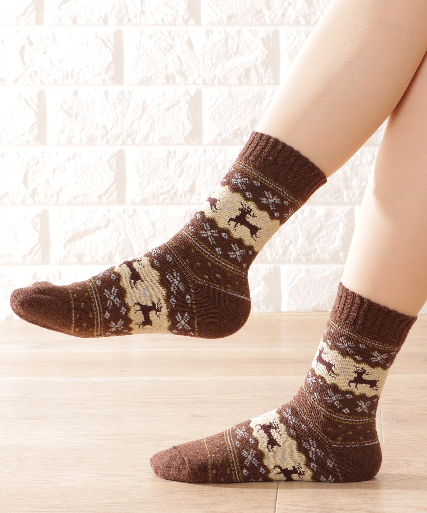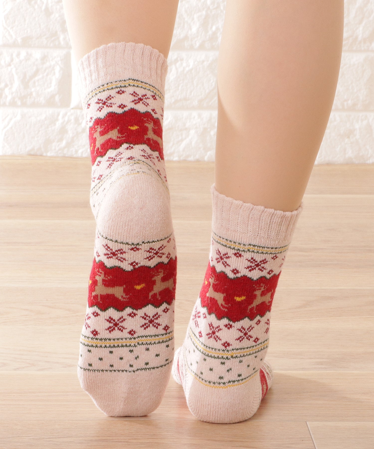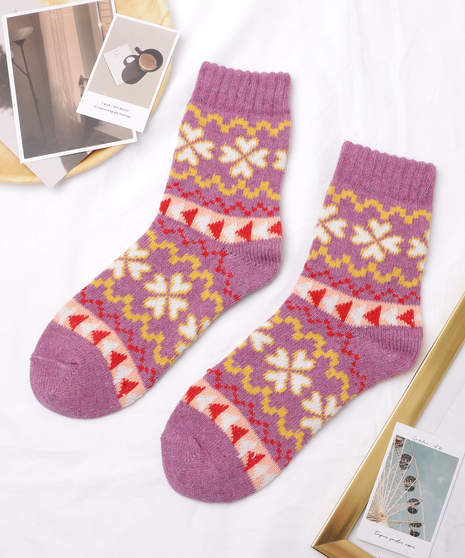 秋冬らしい民族調のデザインでおつくりした、見た目にもウォーミーなクルー丈ソックス。