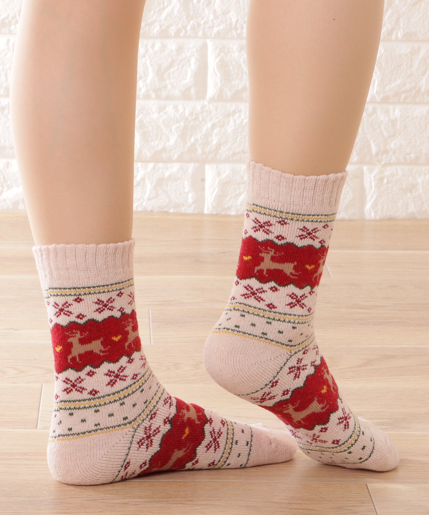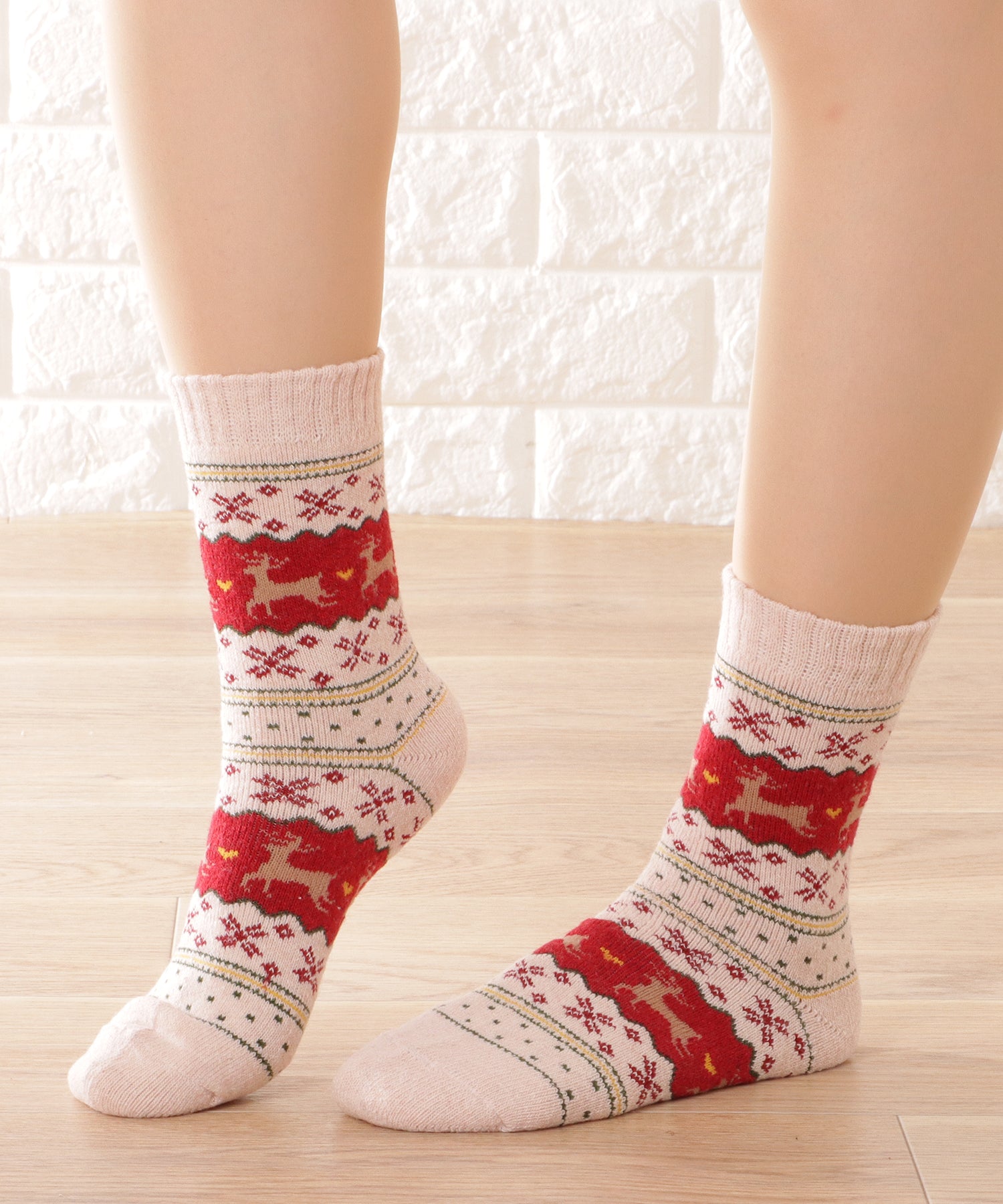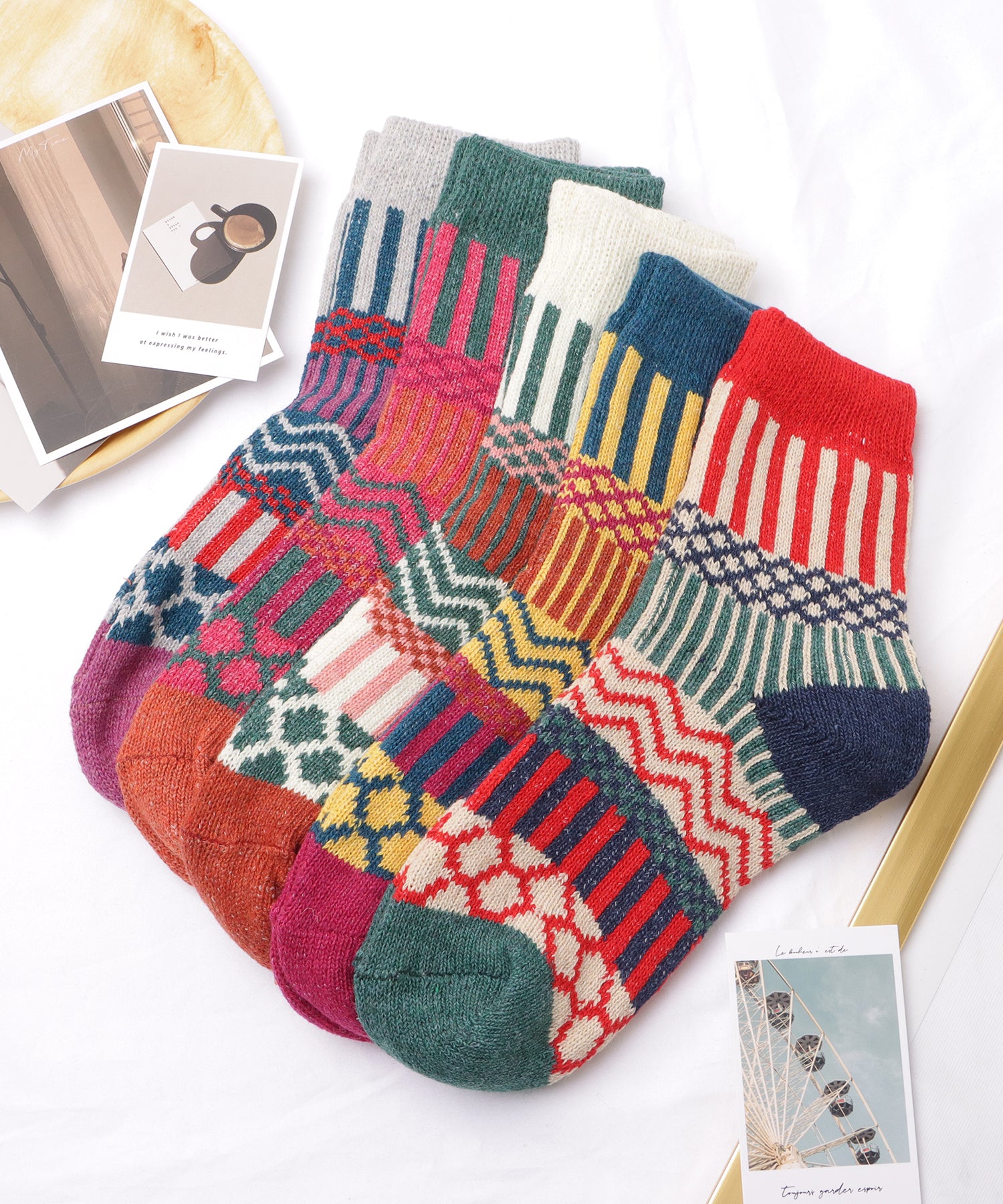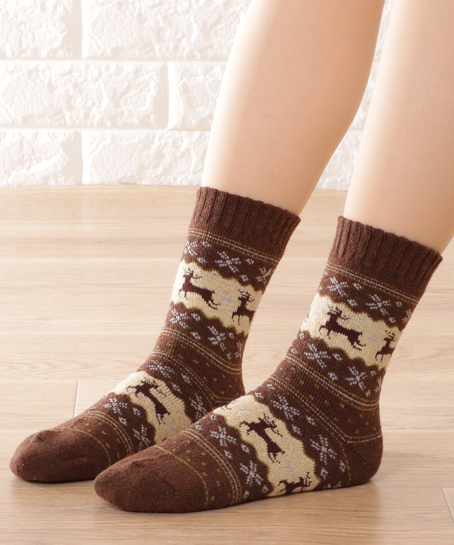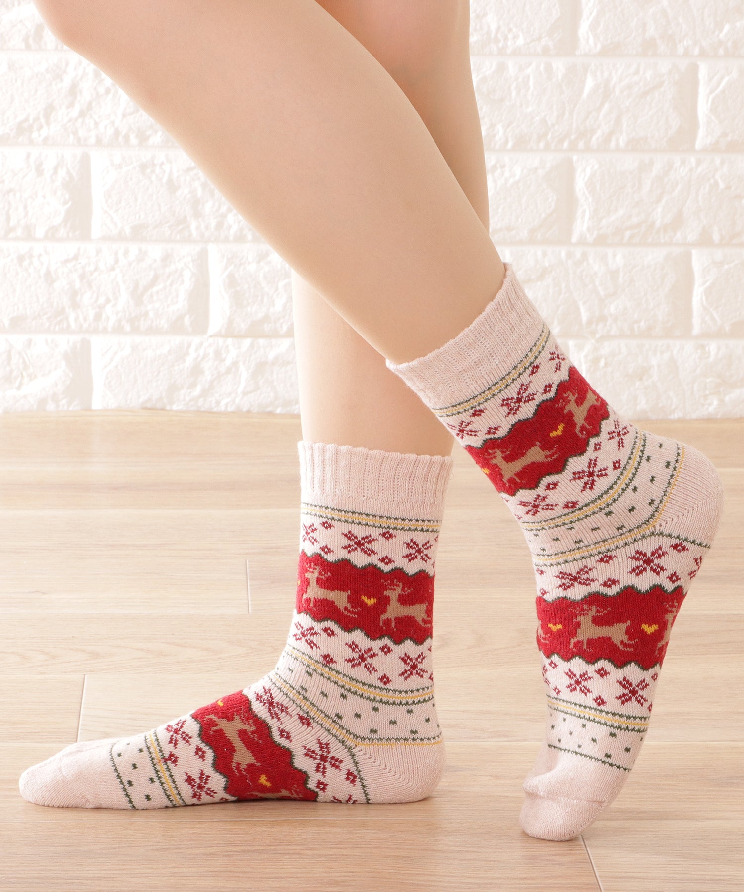 秋冬らしい民族調のデザインでおつくりした、見た目にもウォーミーなクルー丈ソックス。