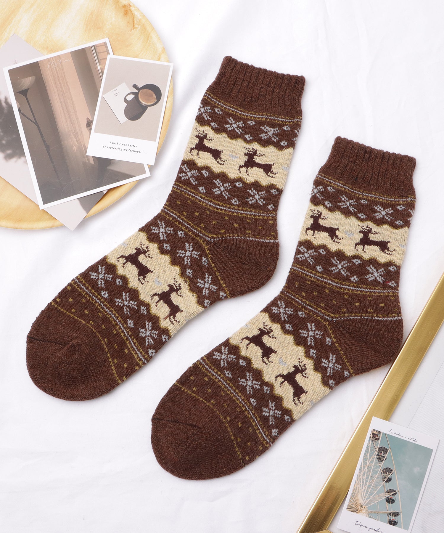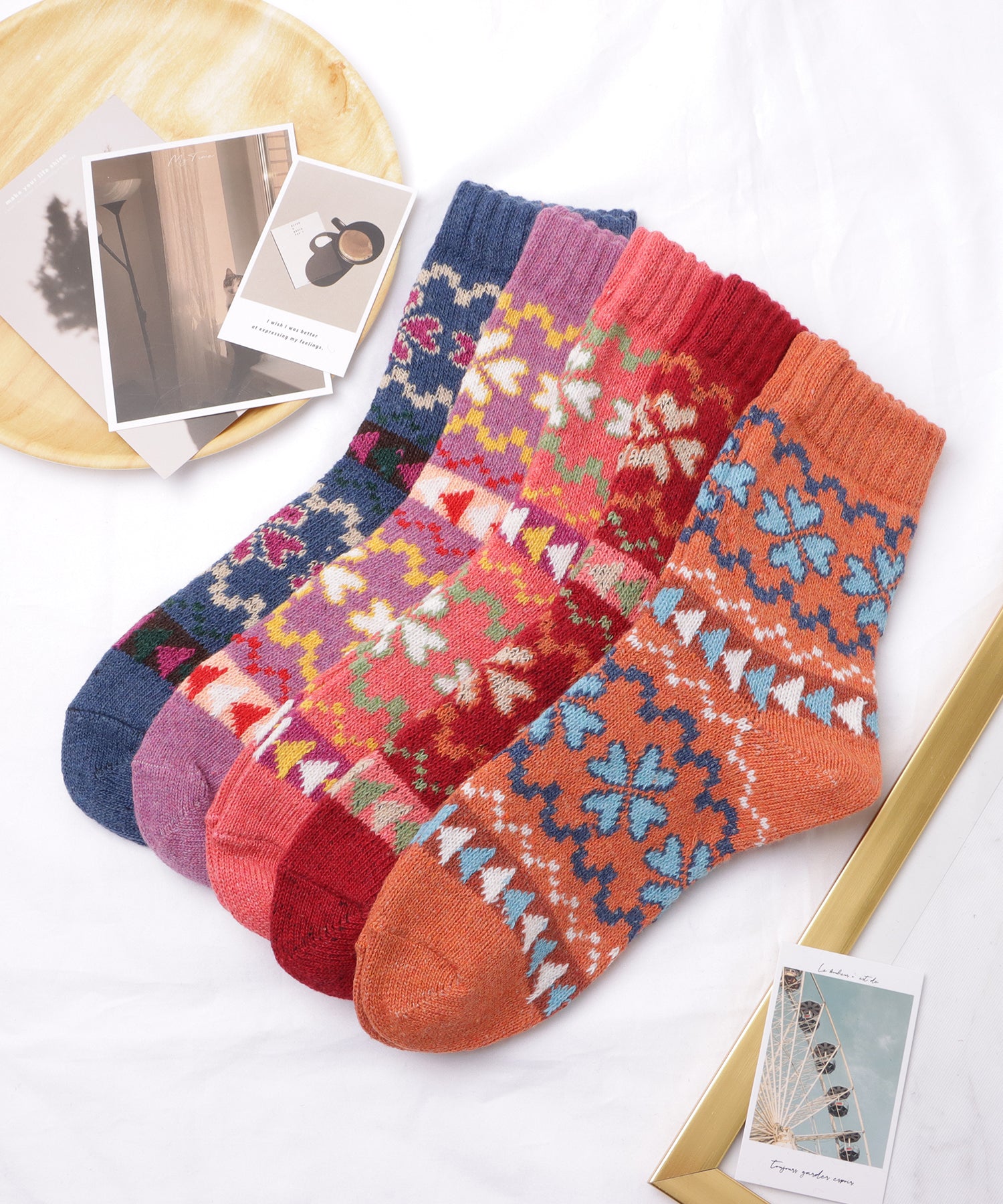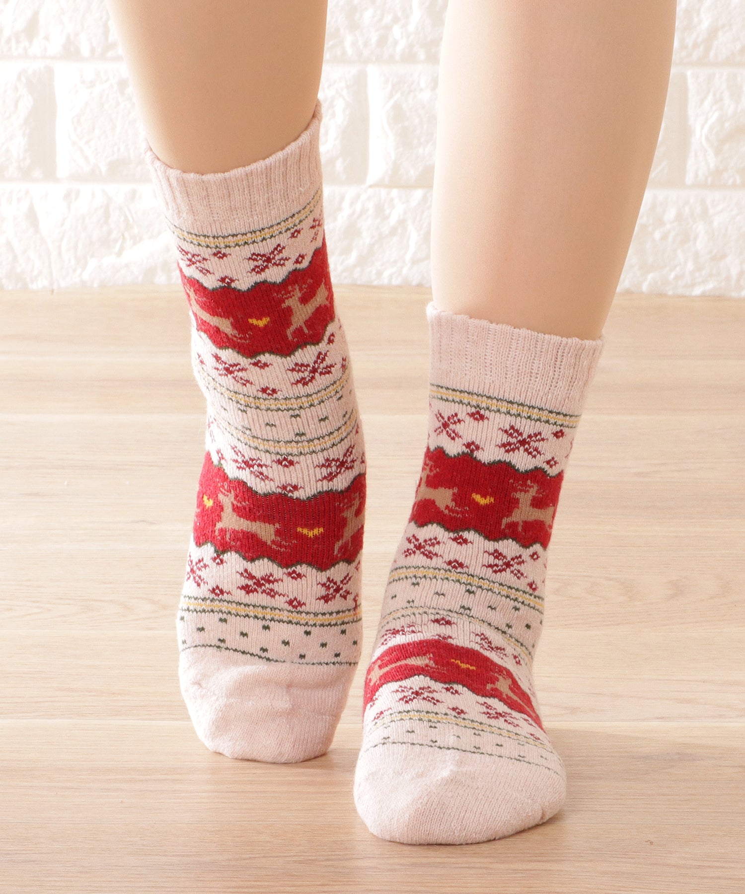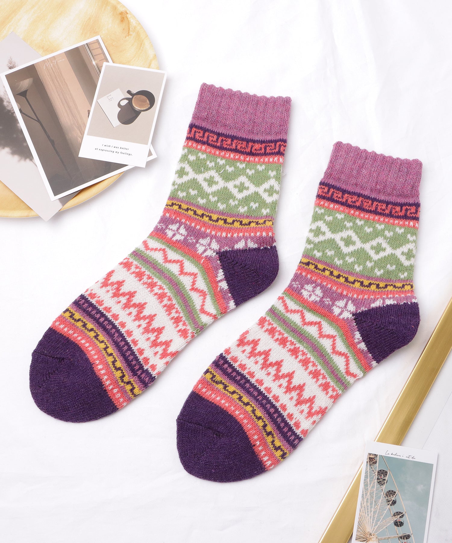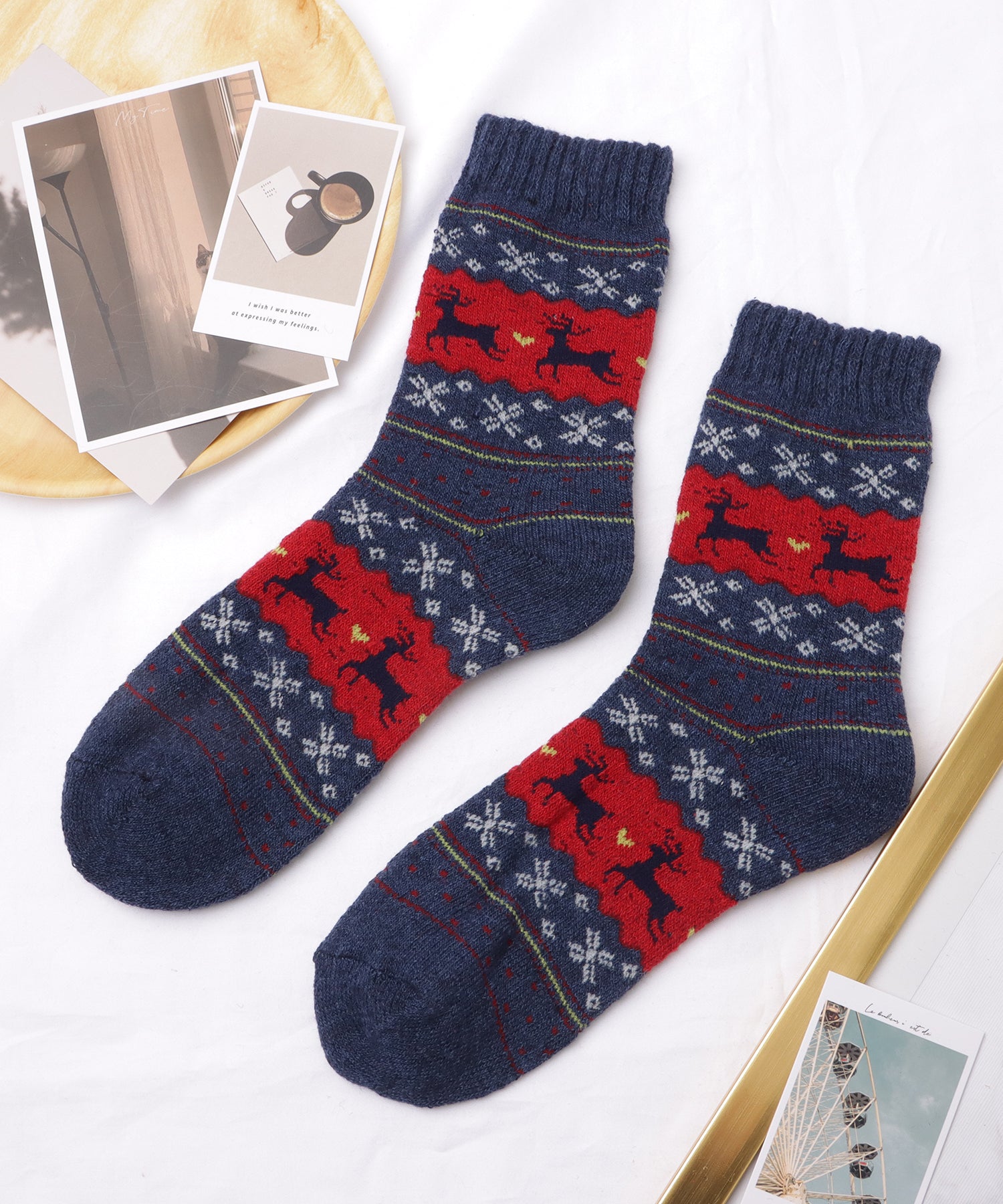 秋冬らしい民族調のデザインでおつくりした、見た目にもウォーミーなクルー丈ソックス。