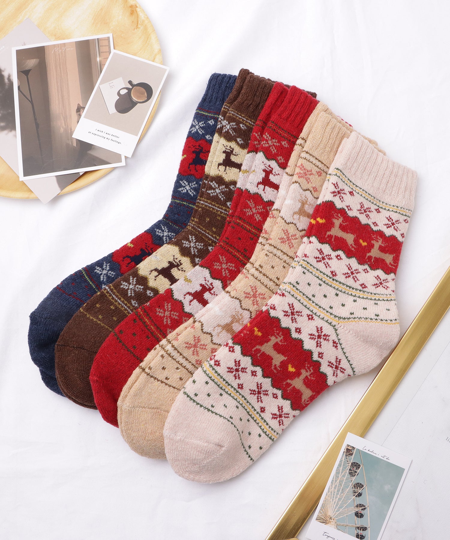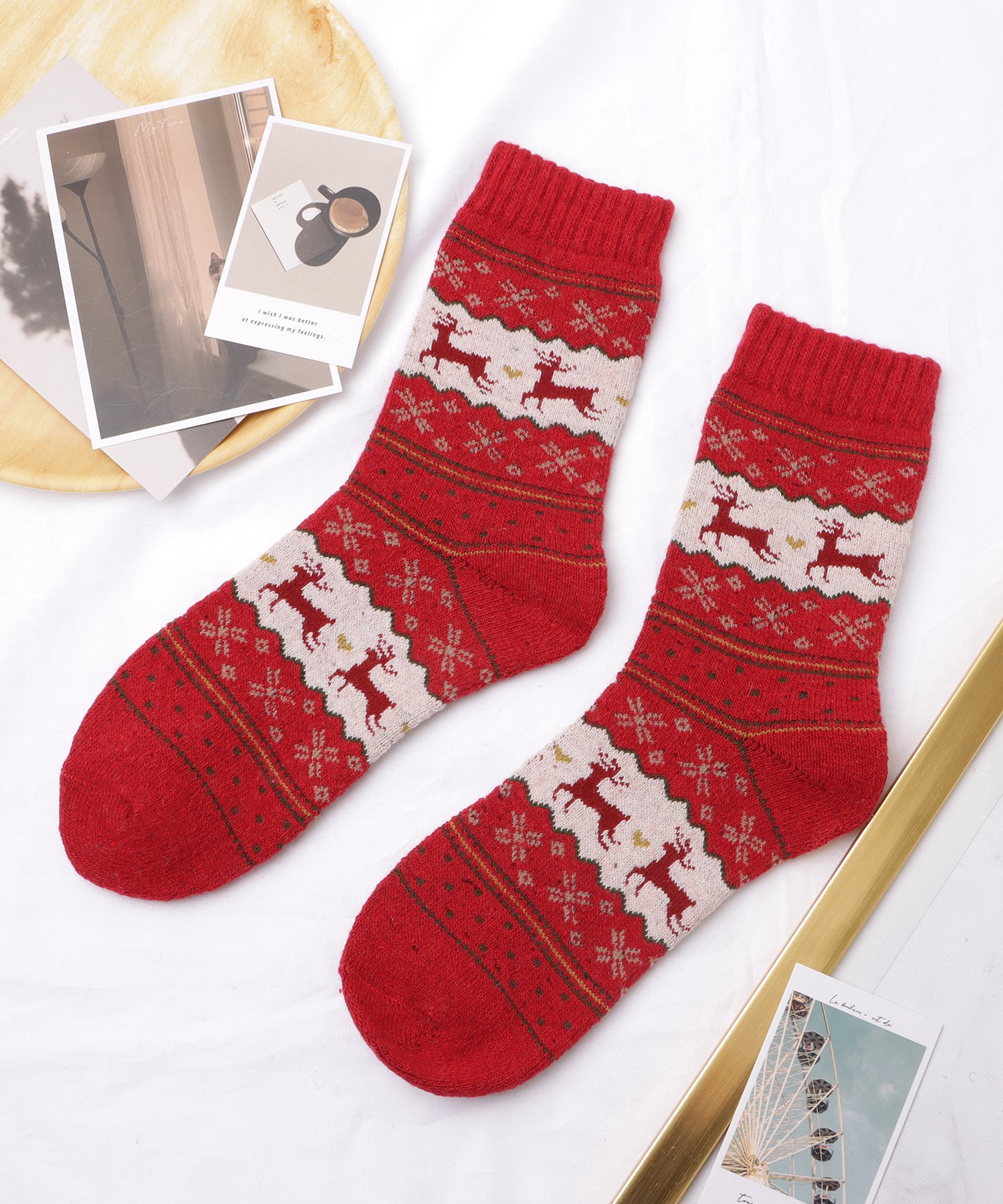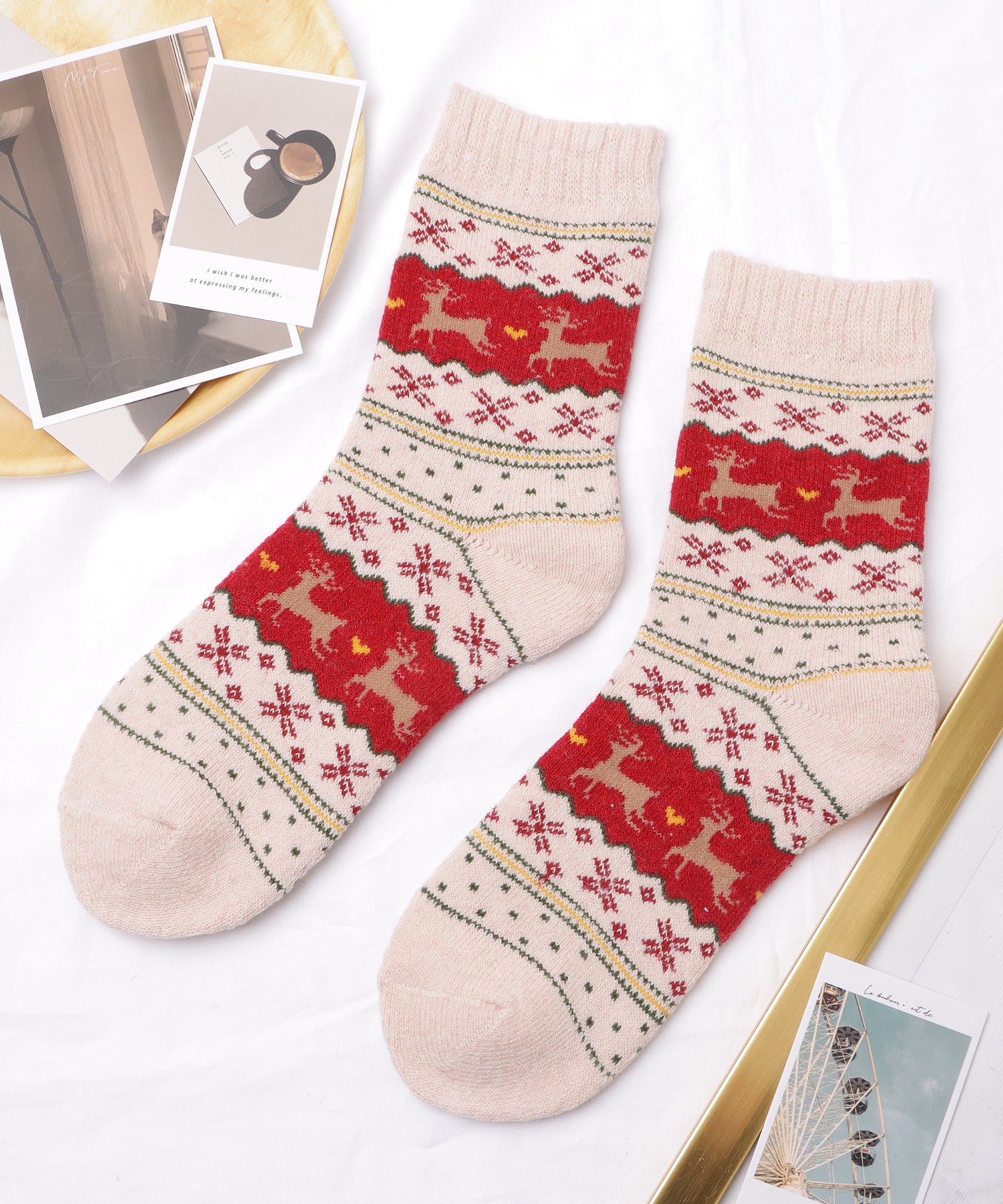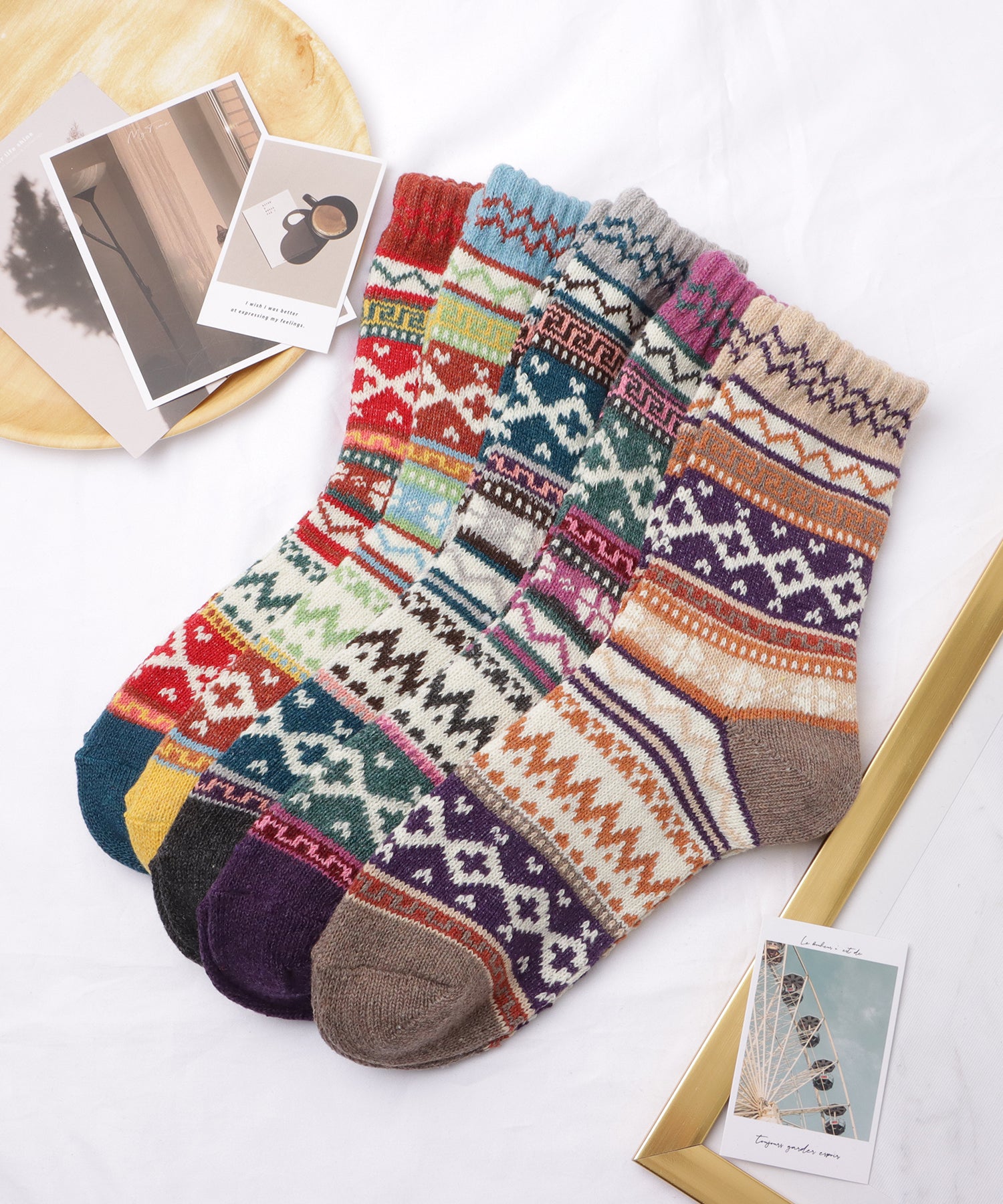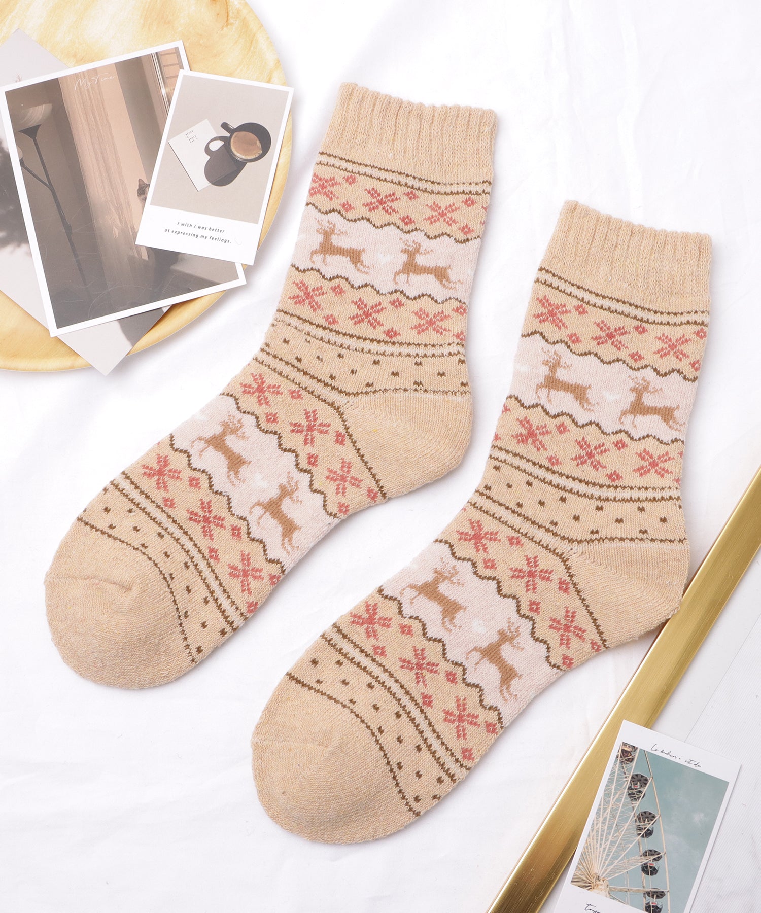 秋冬らしい民族調のデザインでおつくりした、見た目にもウォーミーなクルー丈ソックス。