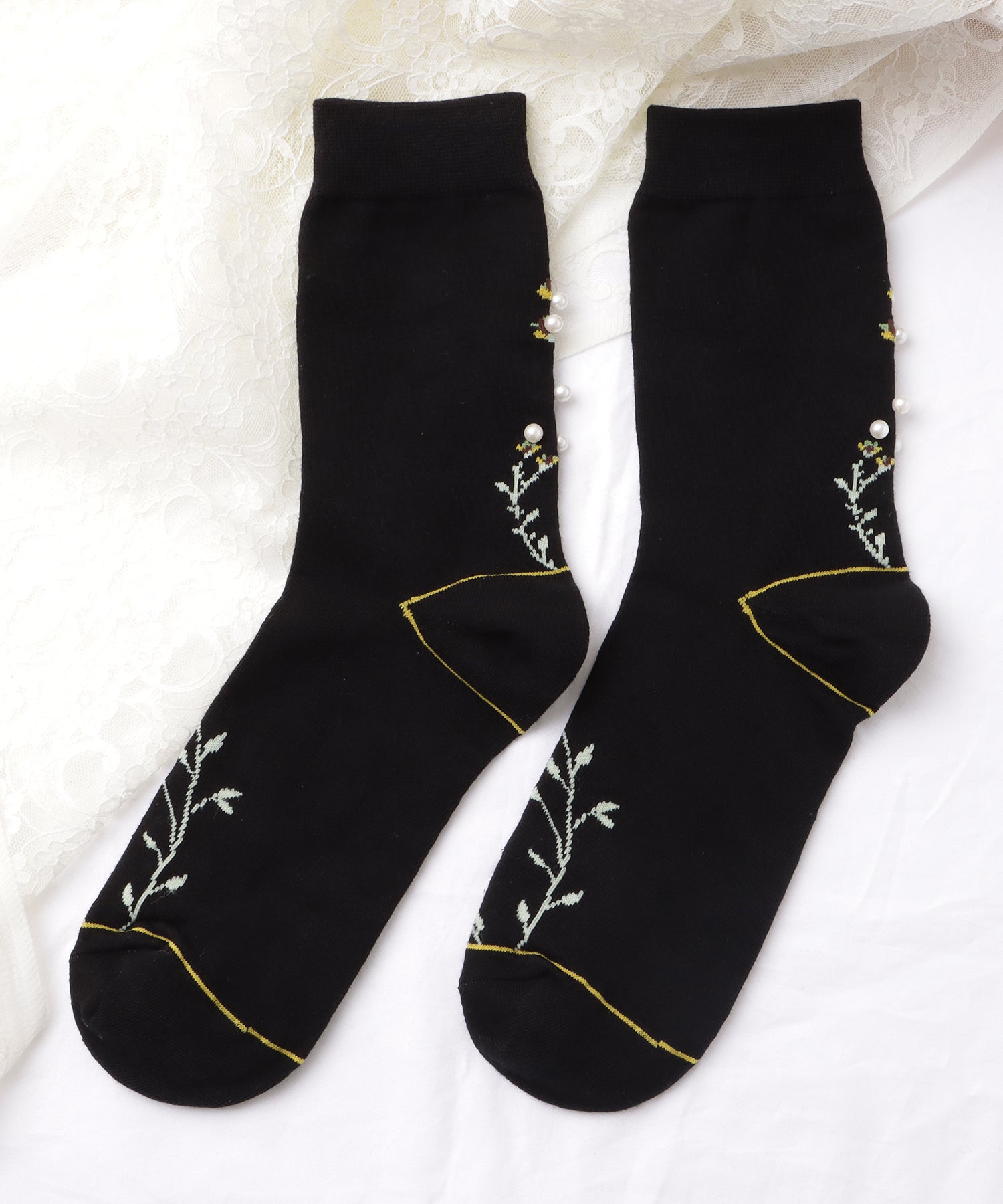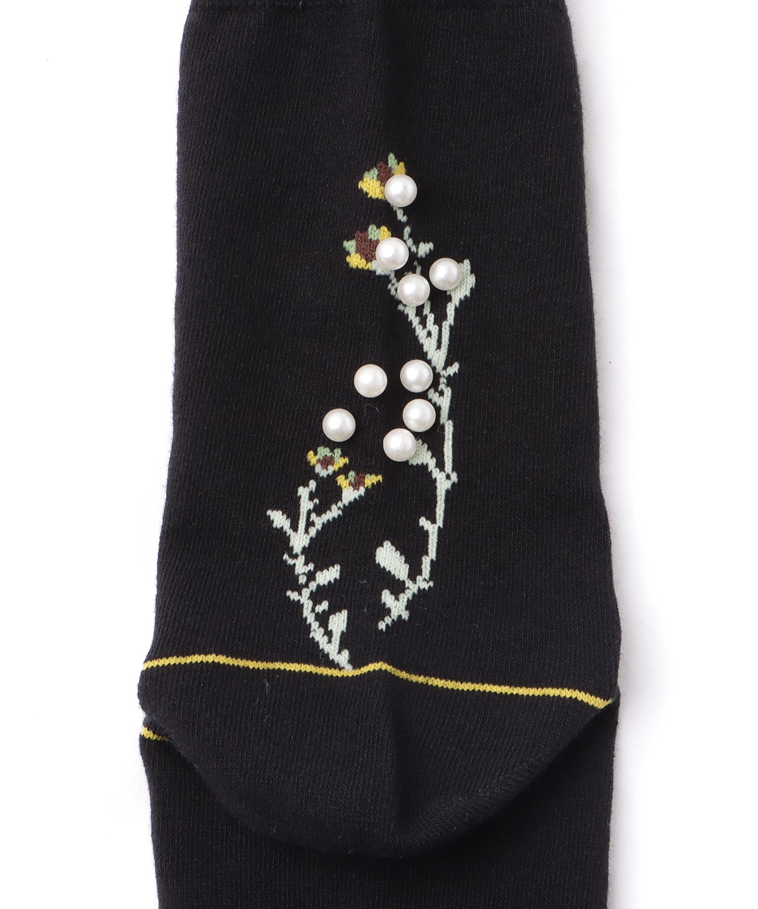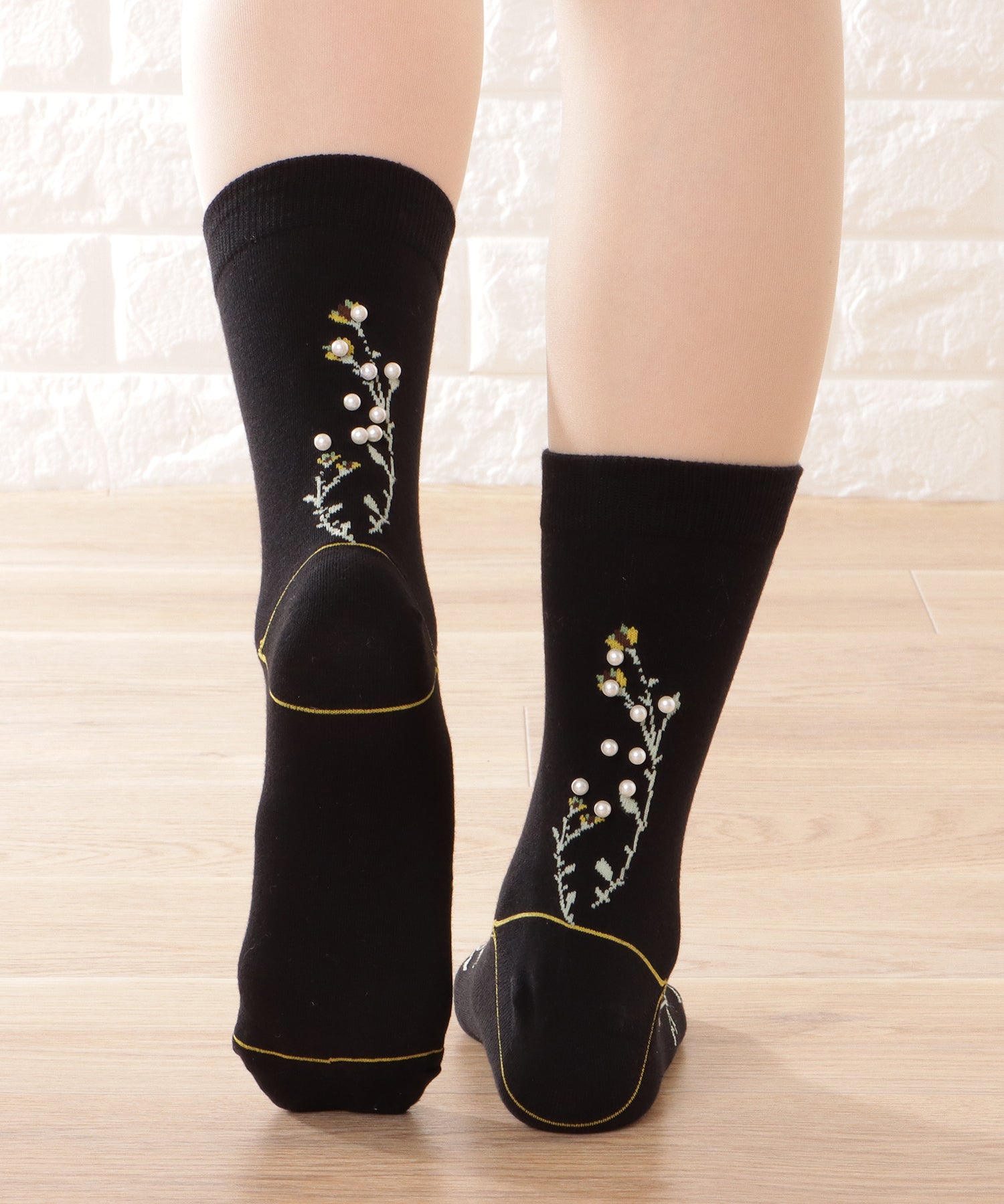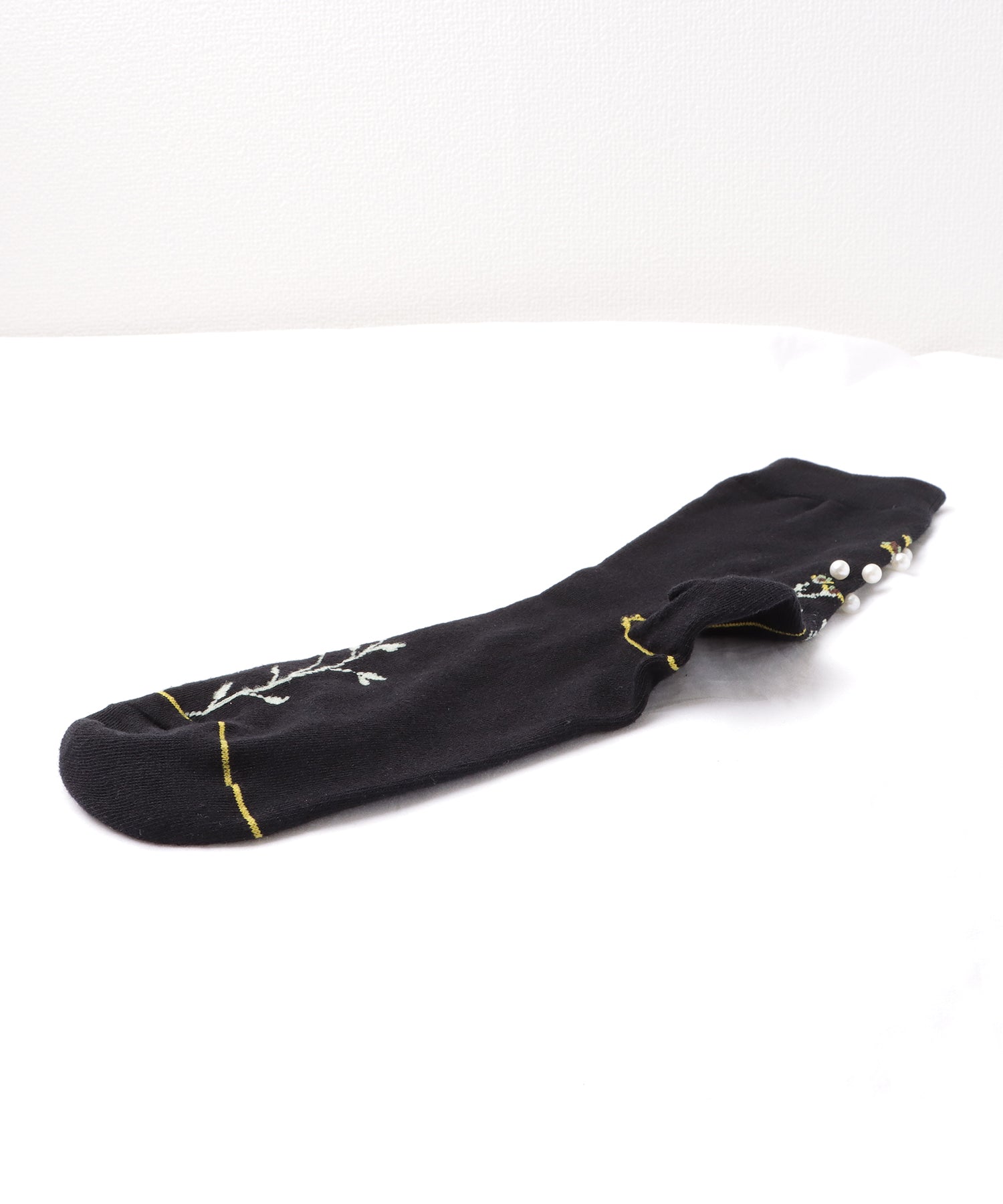 レッグ部分に描かれた植物に、パールのあしらいをほどこした靴下。