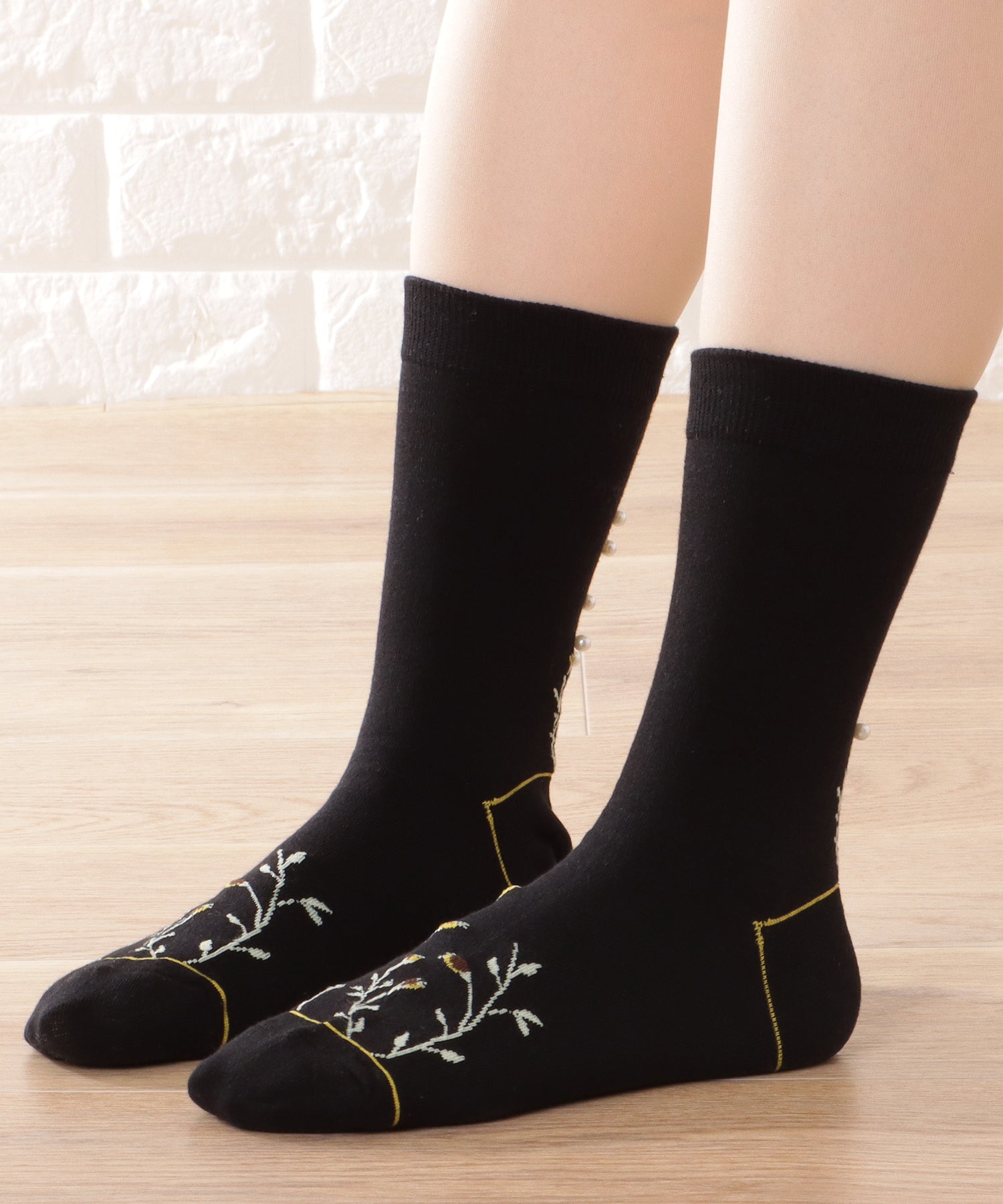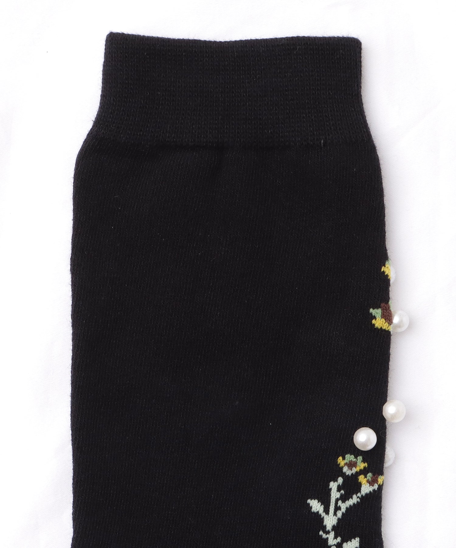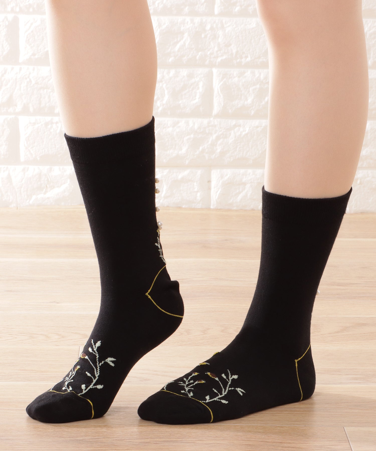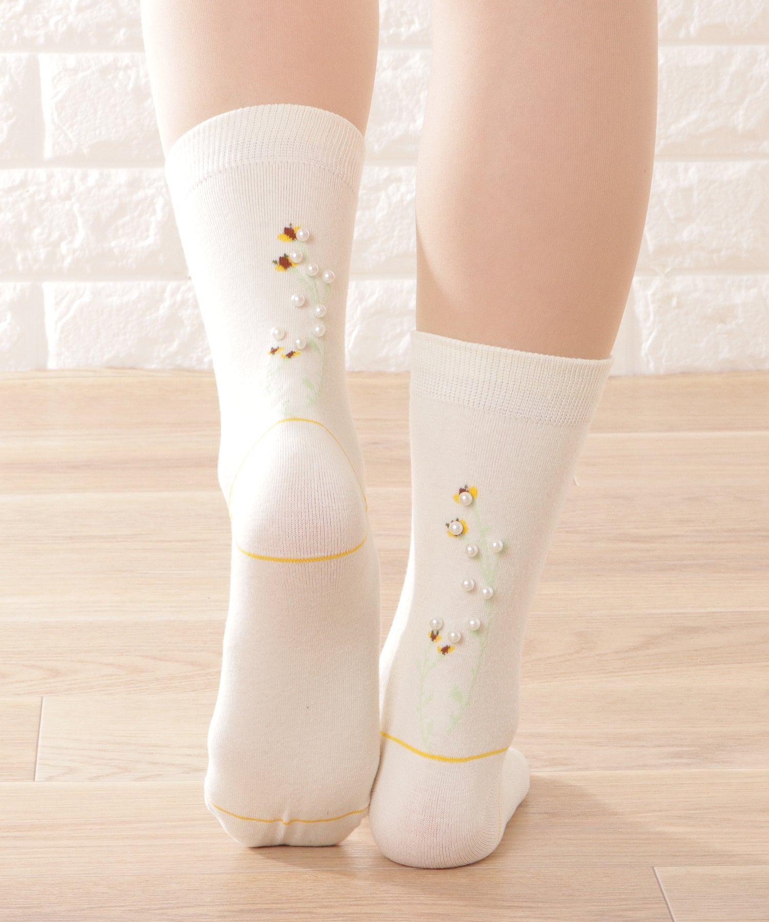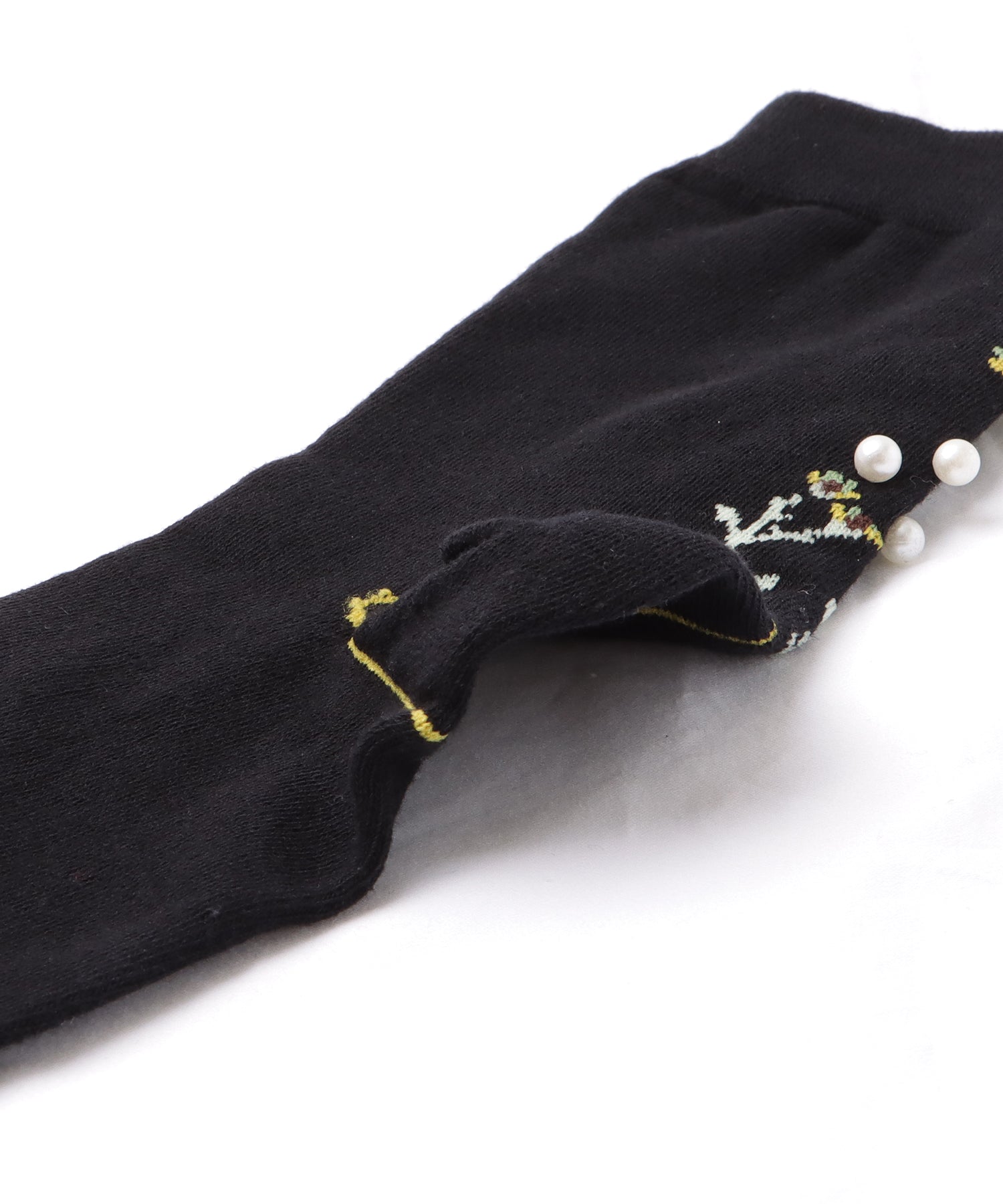 レッグ部分に描かれた植物に、パールのあしらいをほどこした靴下。