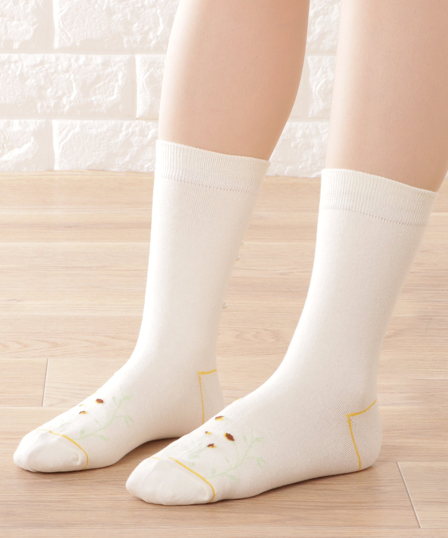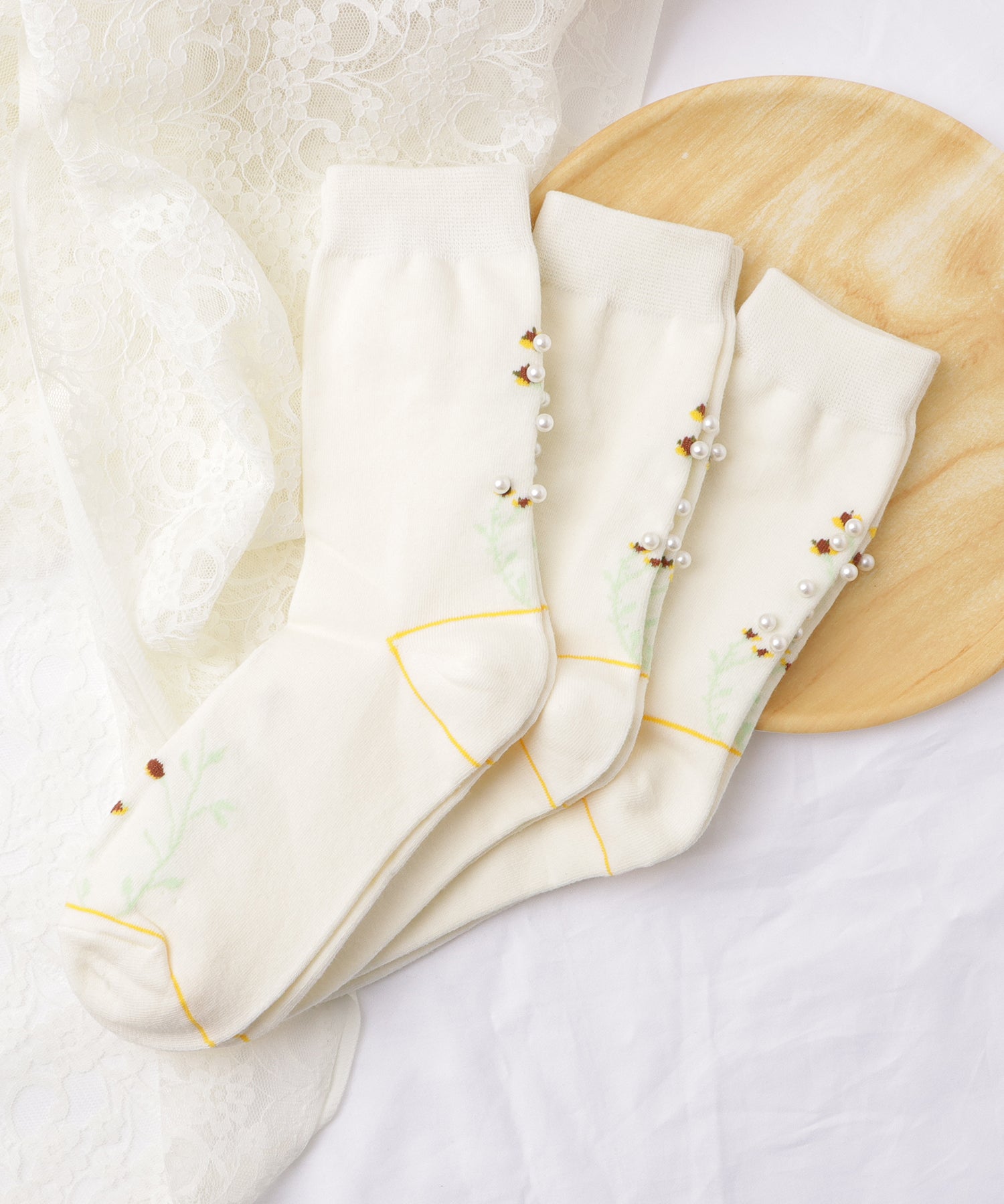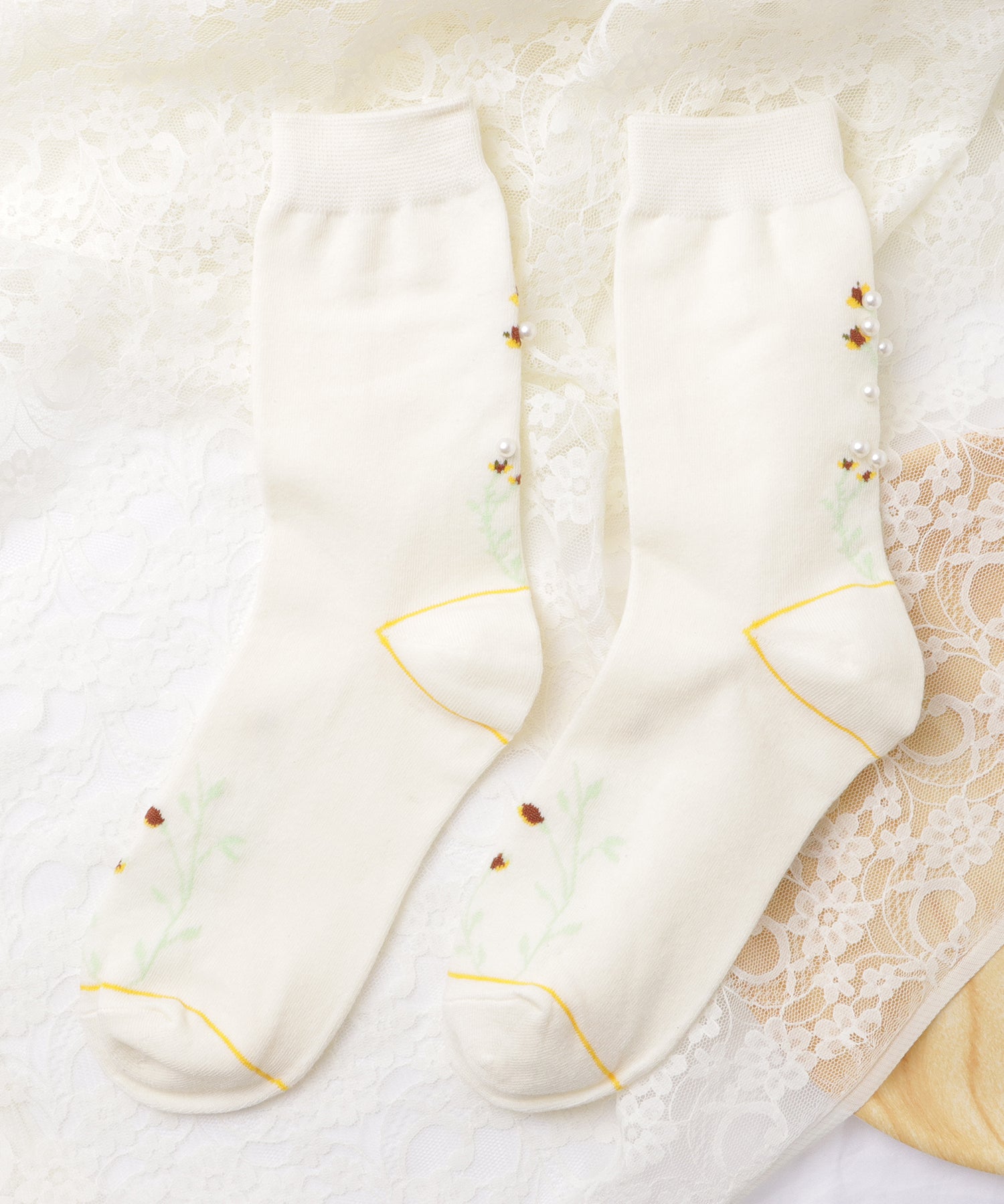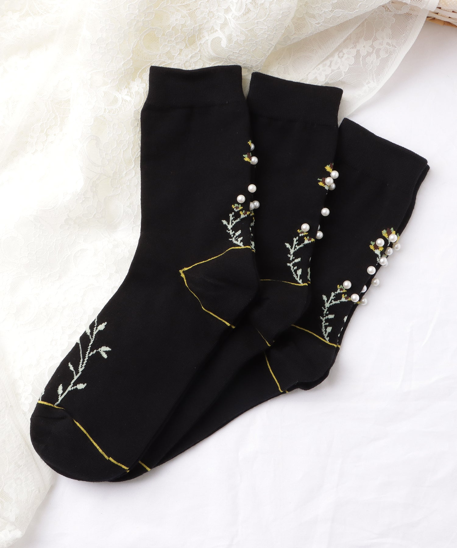レッグ部分に描かれた植物に、パールのあしらいをほどこした靴下。