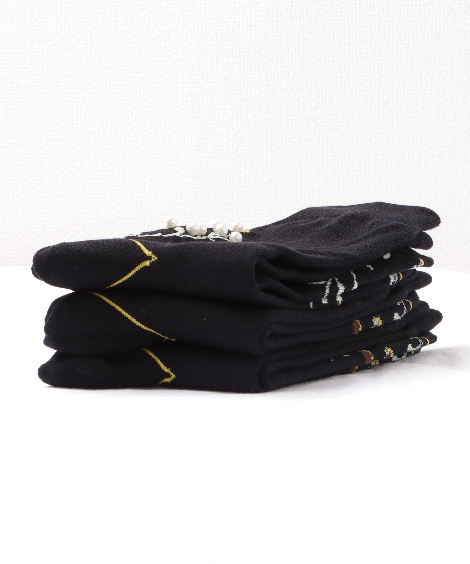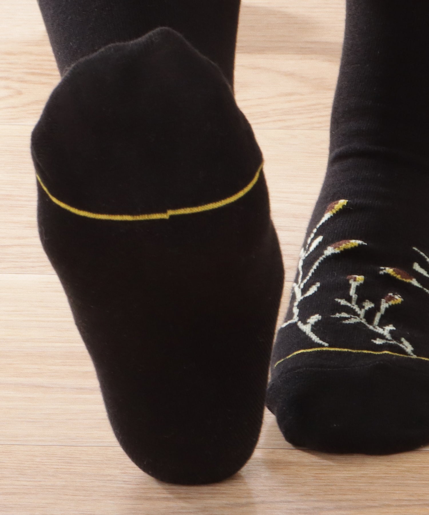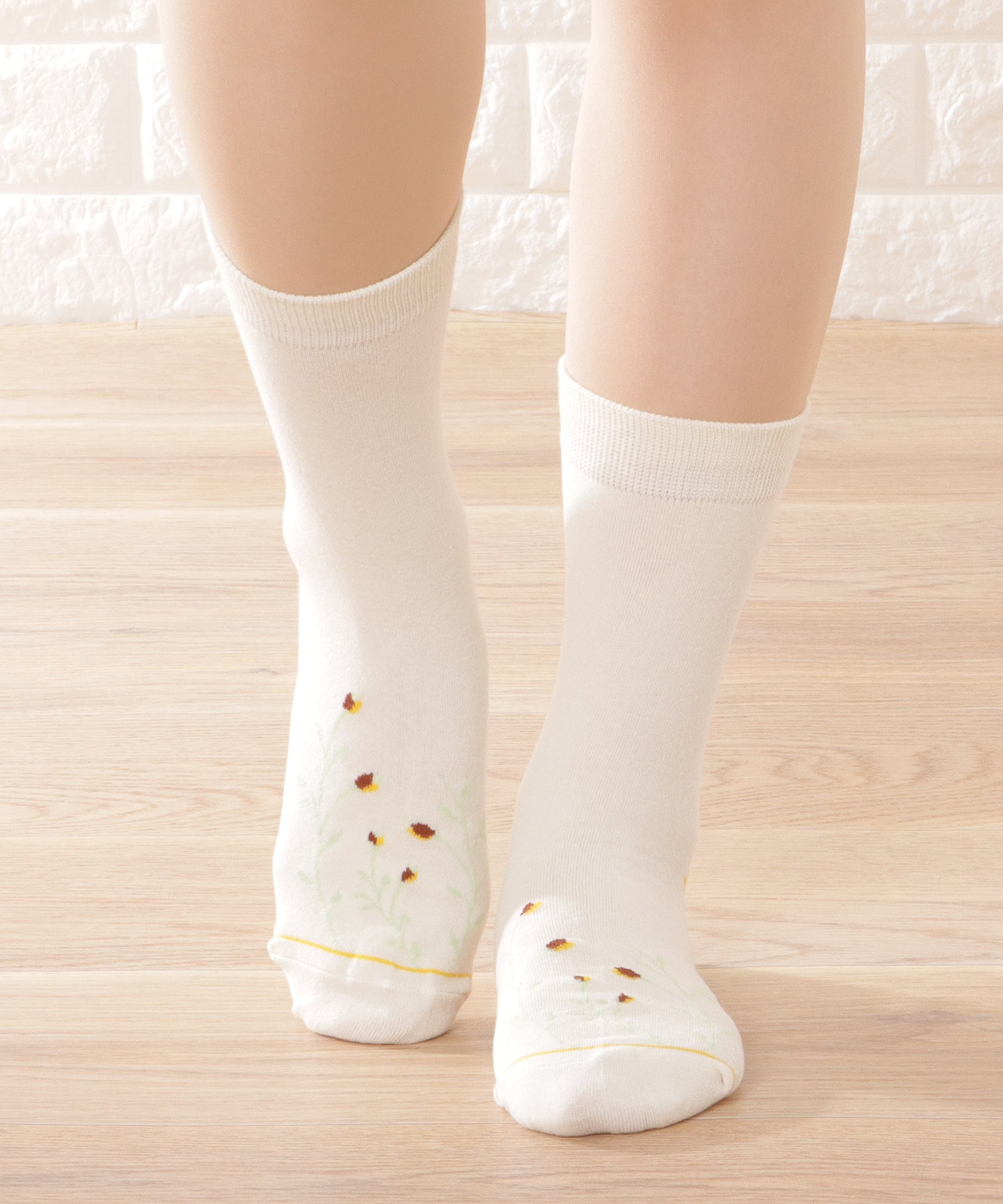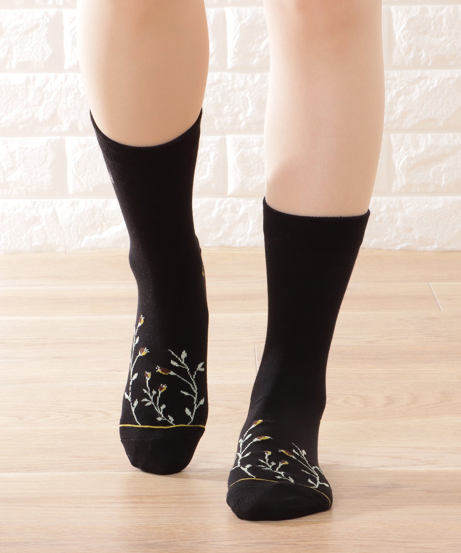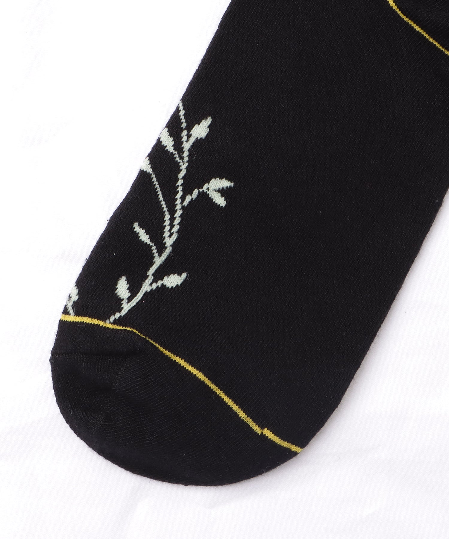 レッグ部分に描かれた植物に、パールのあしらいをほどこした靴下。