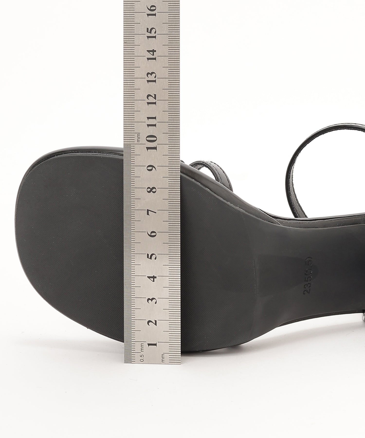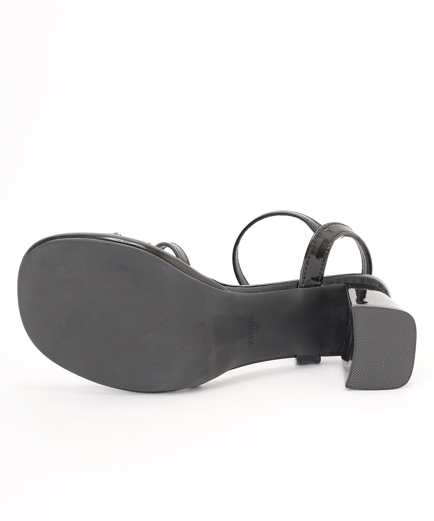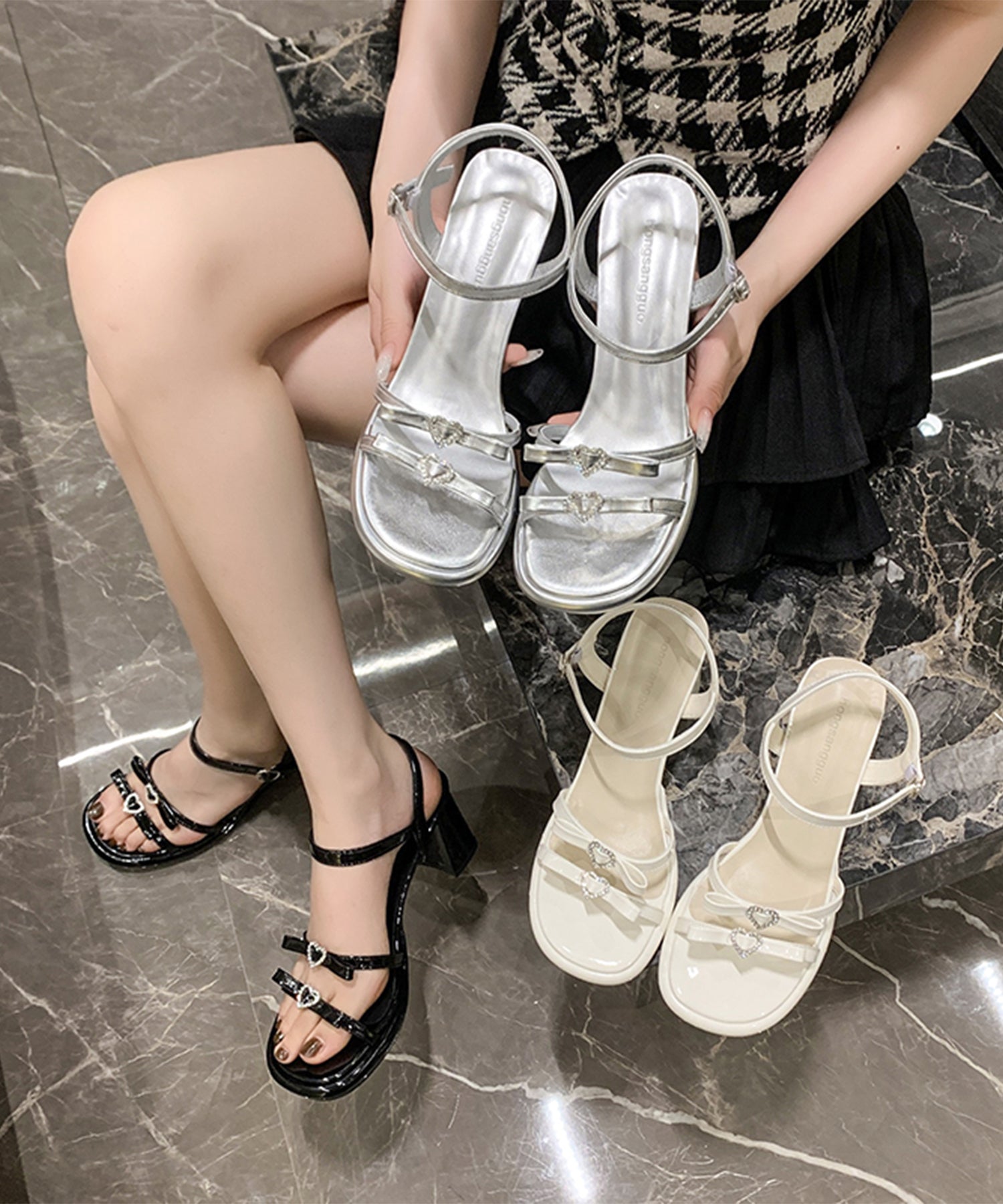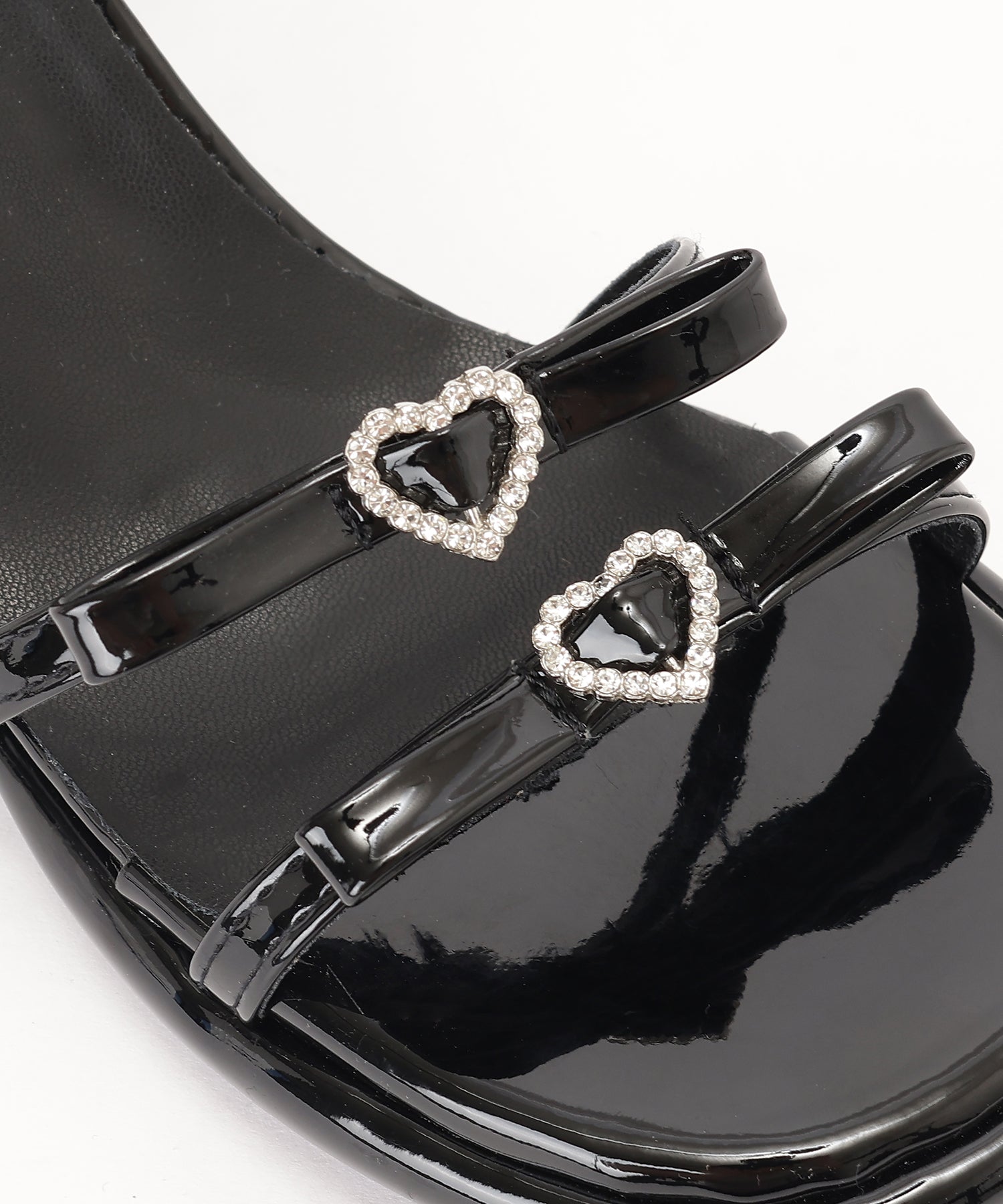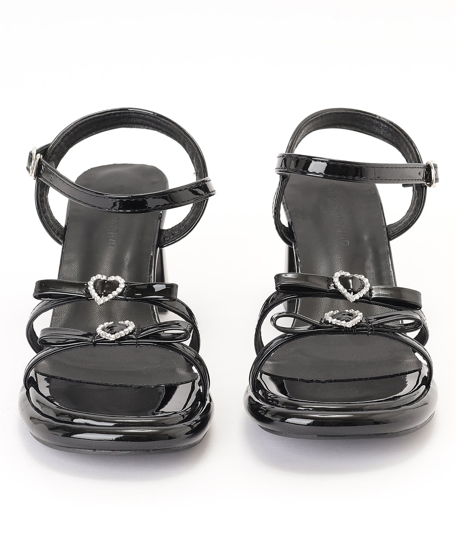 レザー調 ハート ビジュー リボン付き ストラップ ヒール サンダル