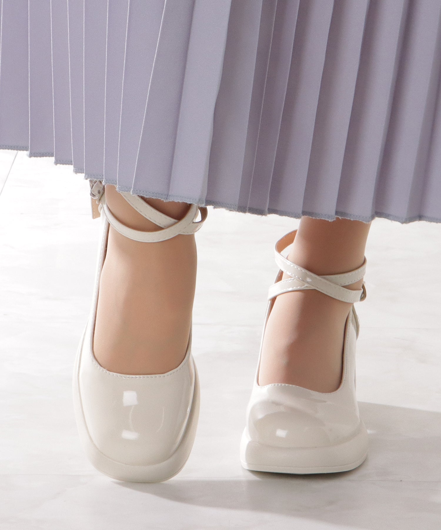 ツヤのあるレザー調素材で、ドレッシーな雰囲気に仕上げた一足です。