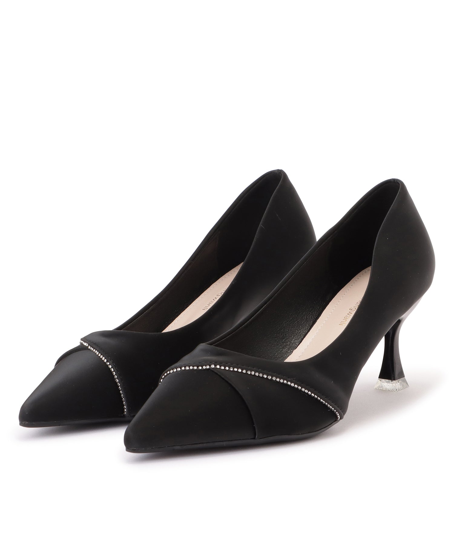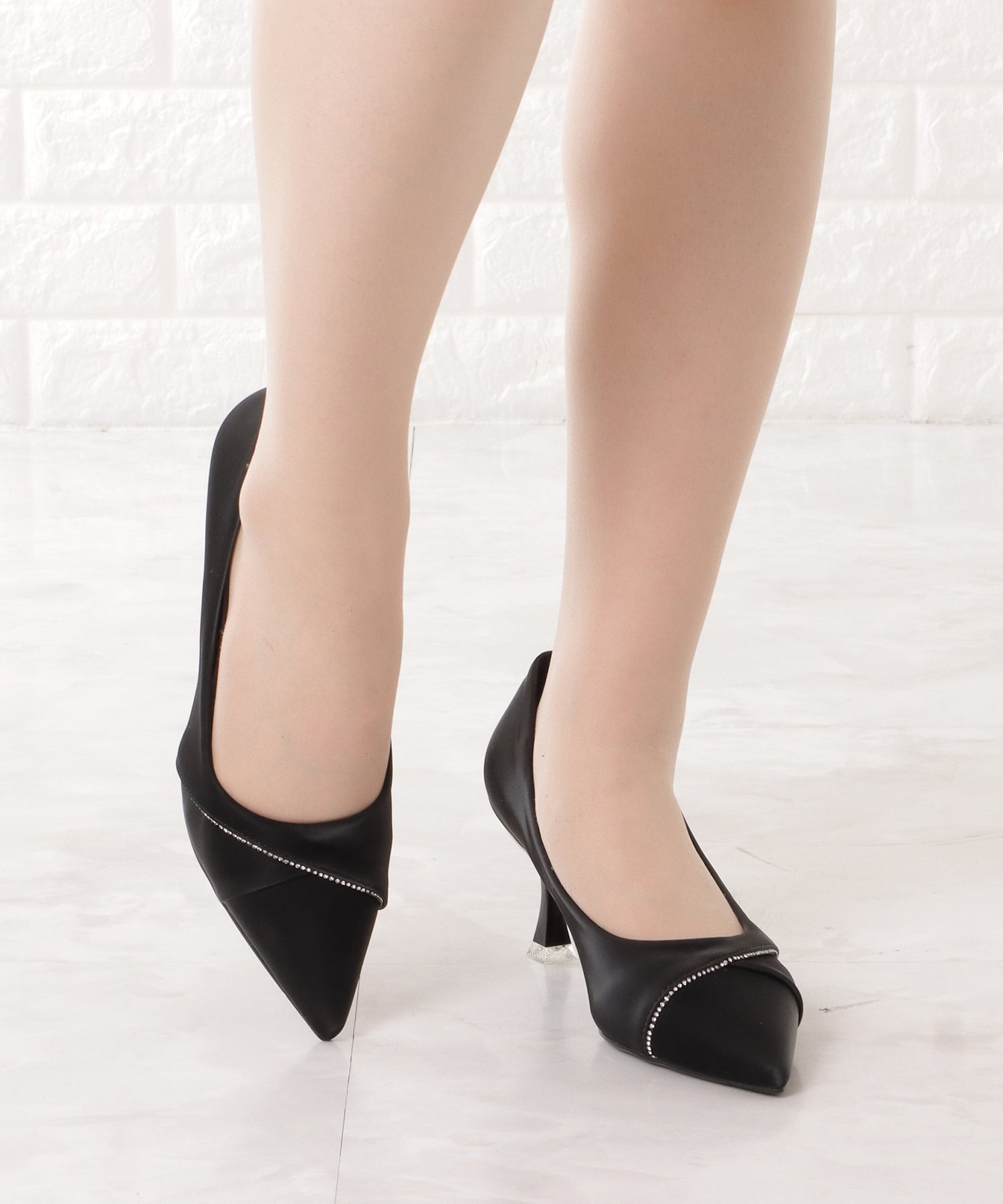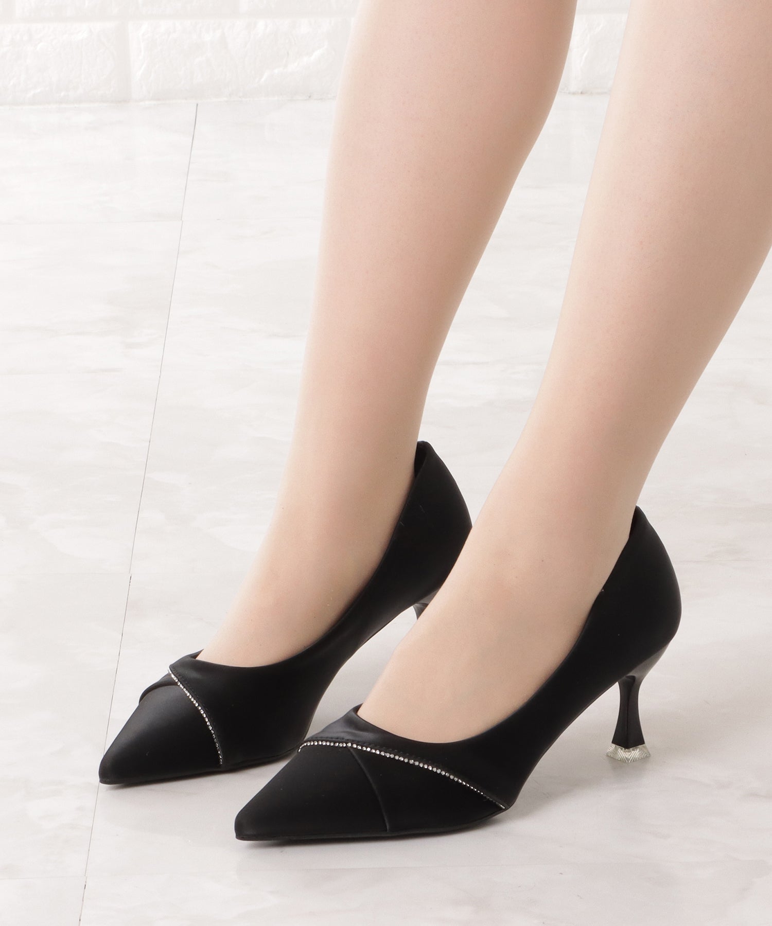 レザー調ラインビジューポインテッドパンプス
