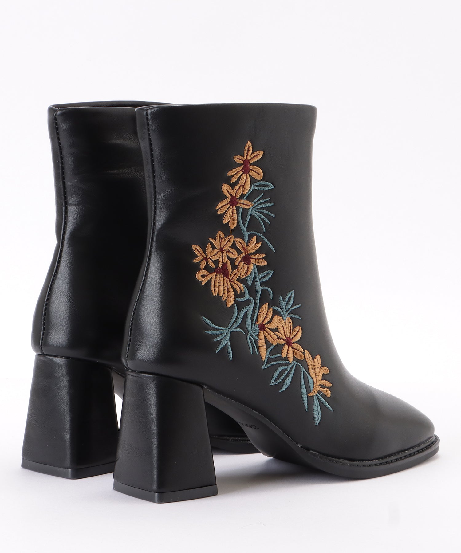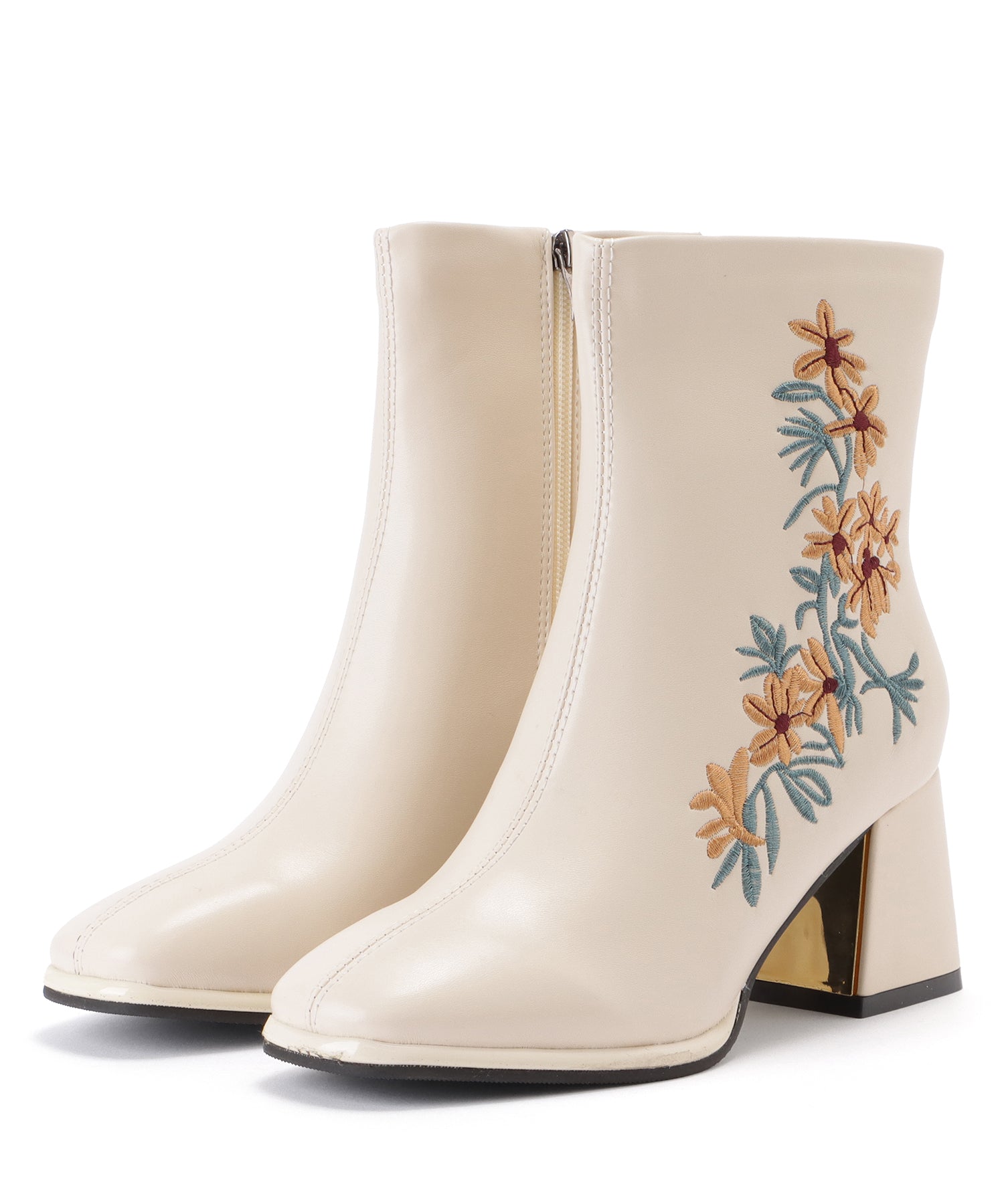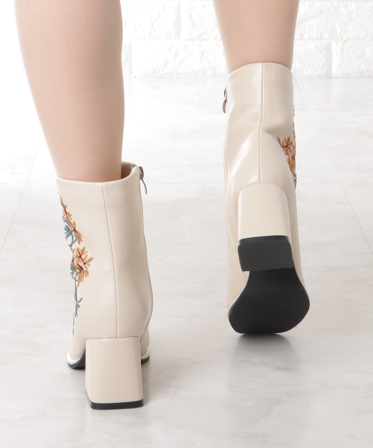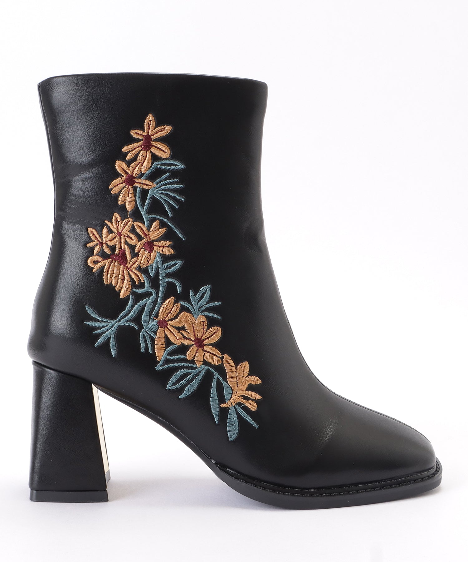 繊細な花柄刺繍がアクセントになった、ショートブーツ。