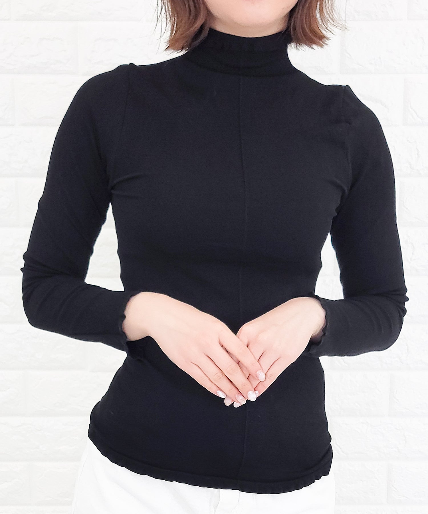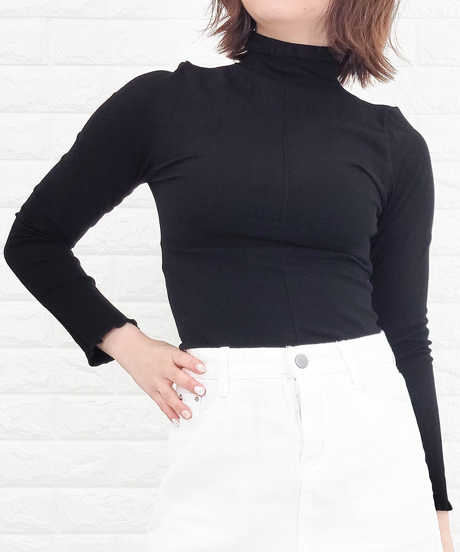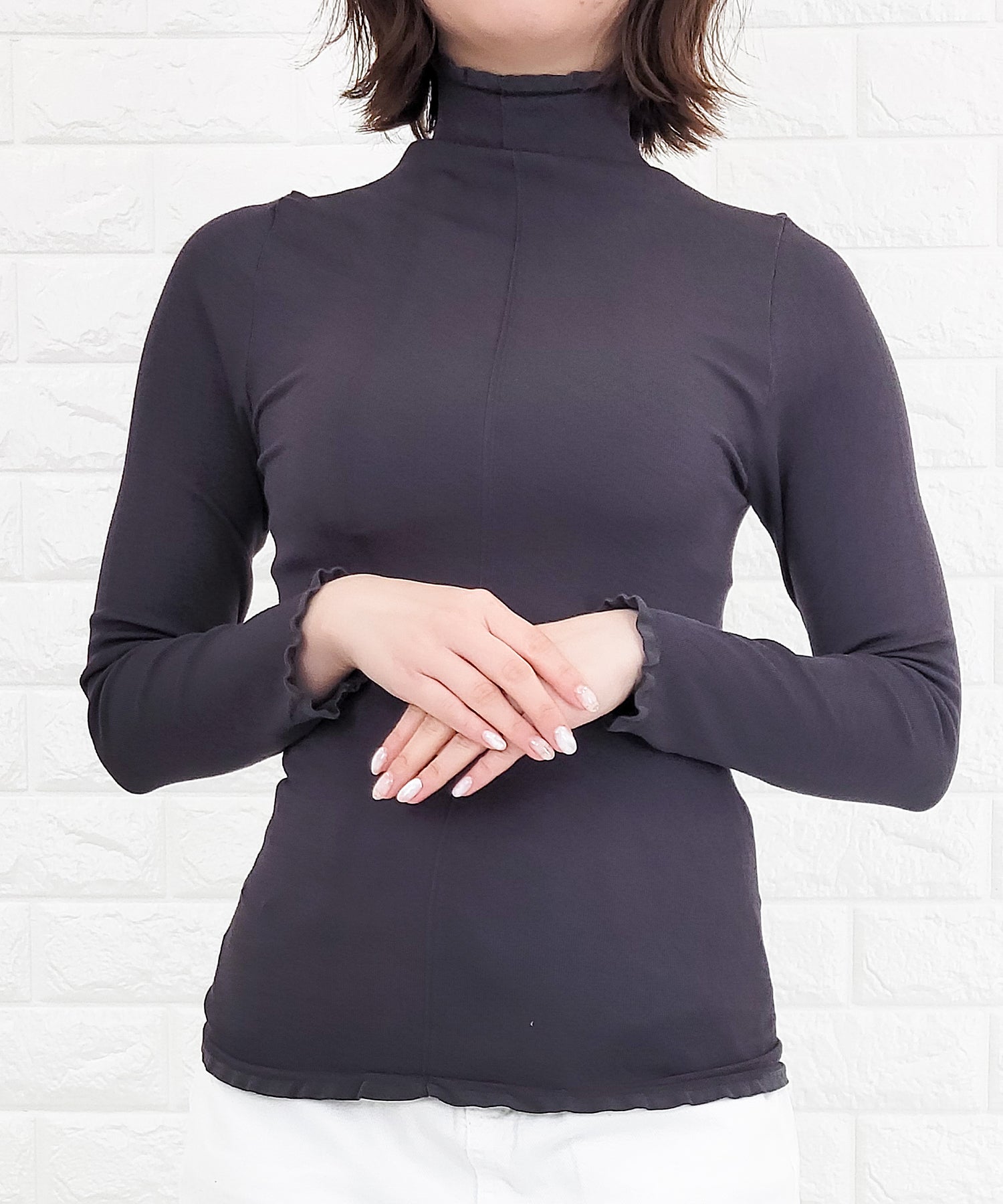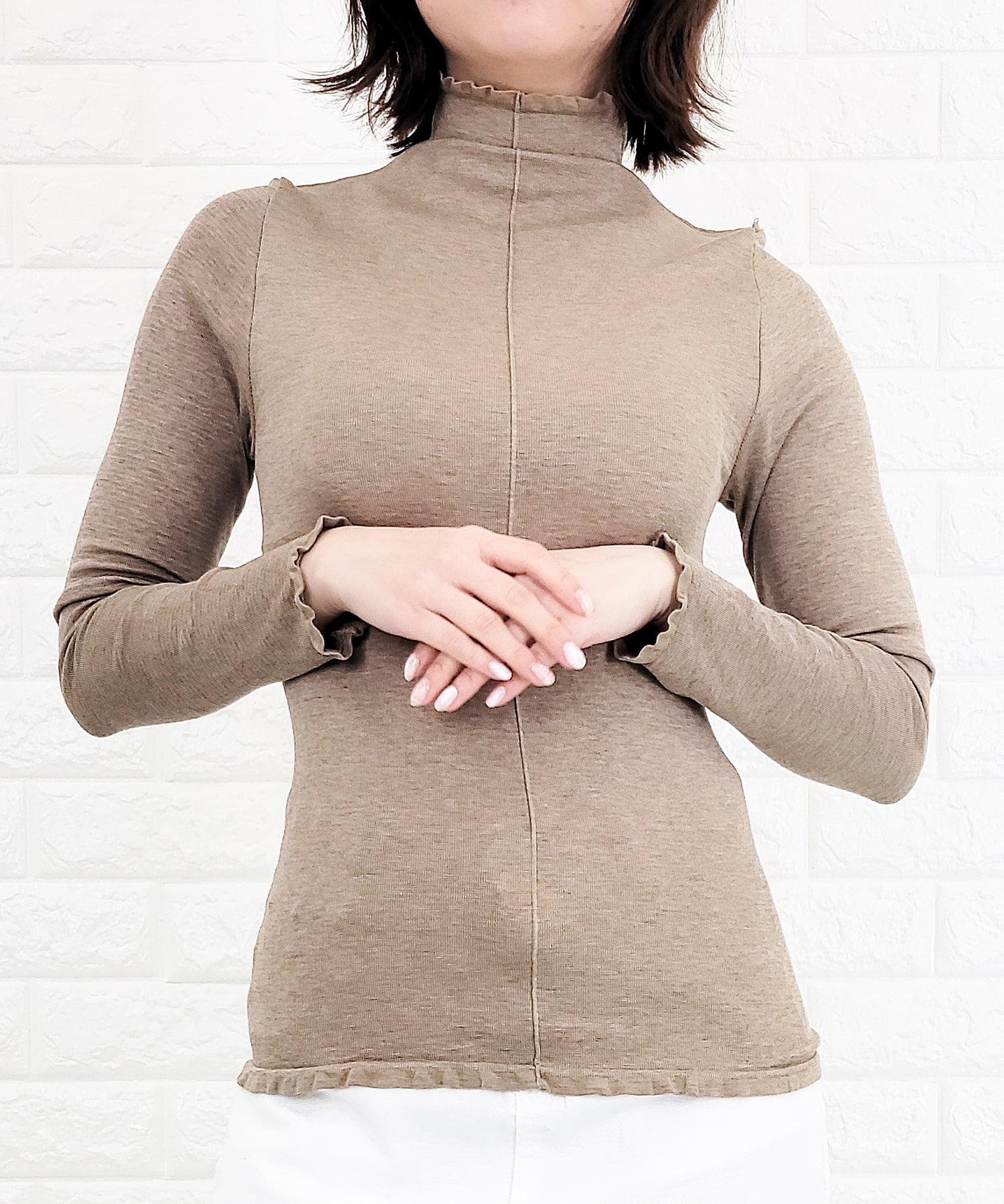 首周りと袖口、裾のゆるやかに波打つデザインがポイント。