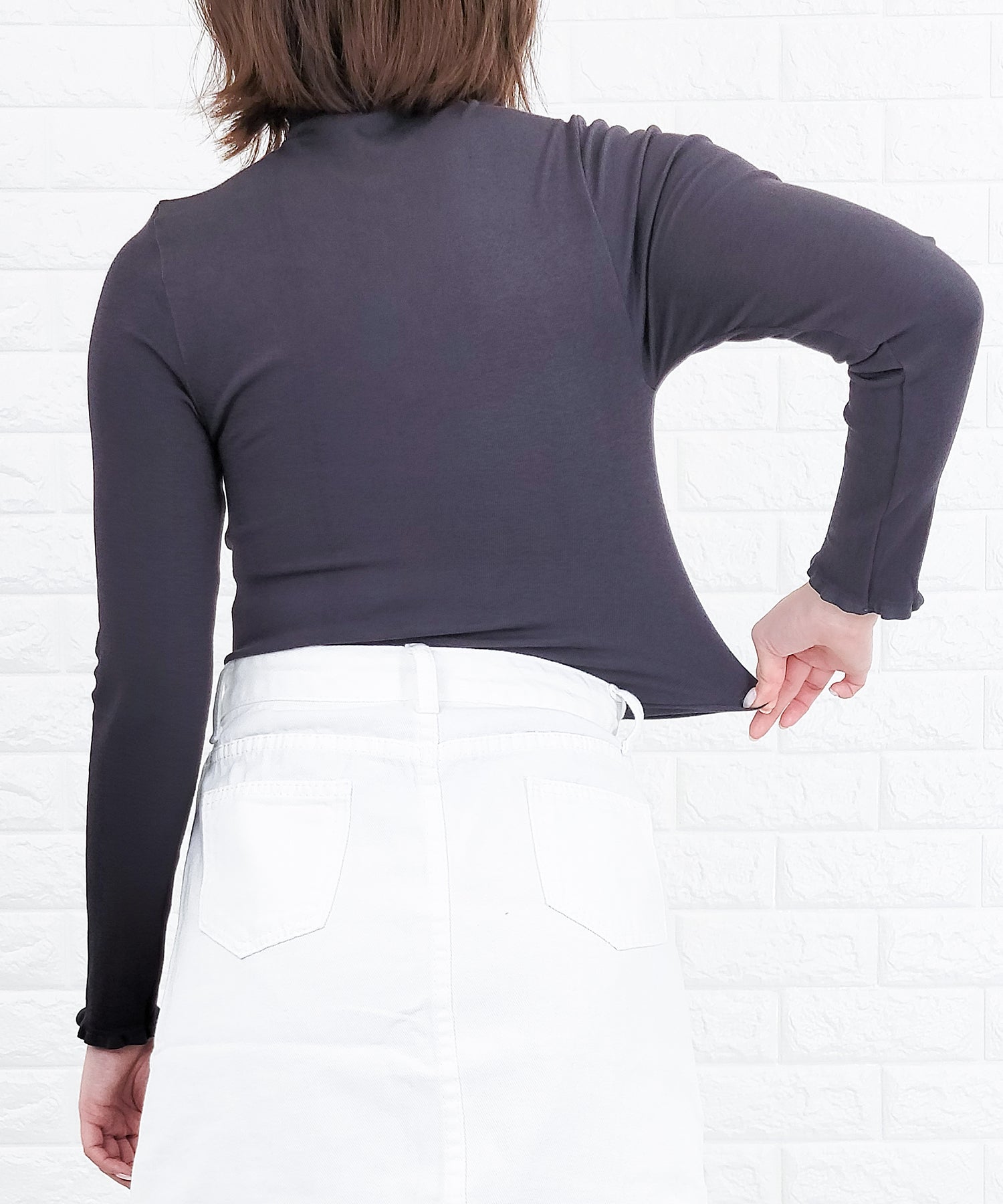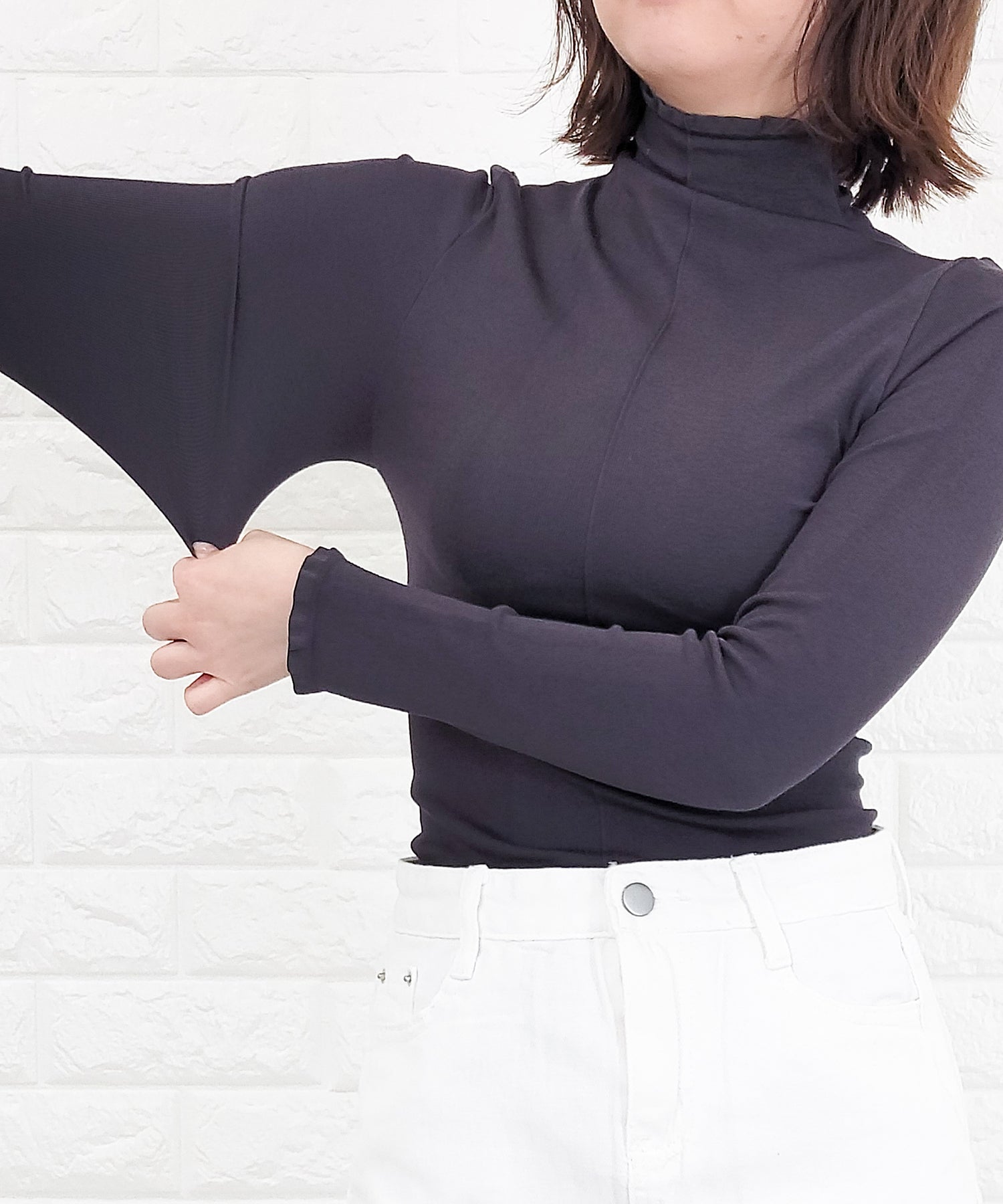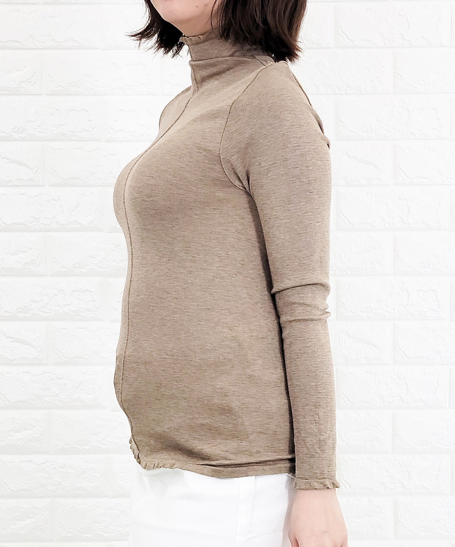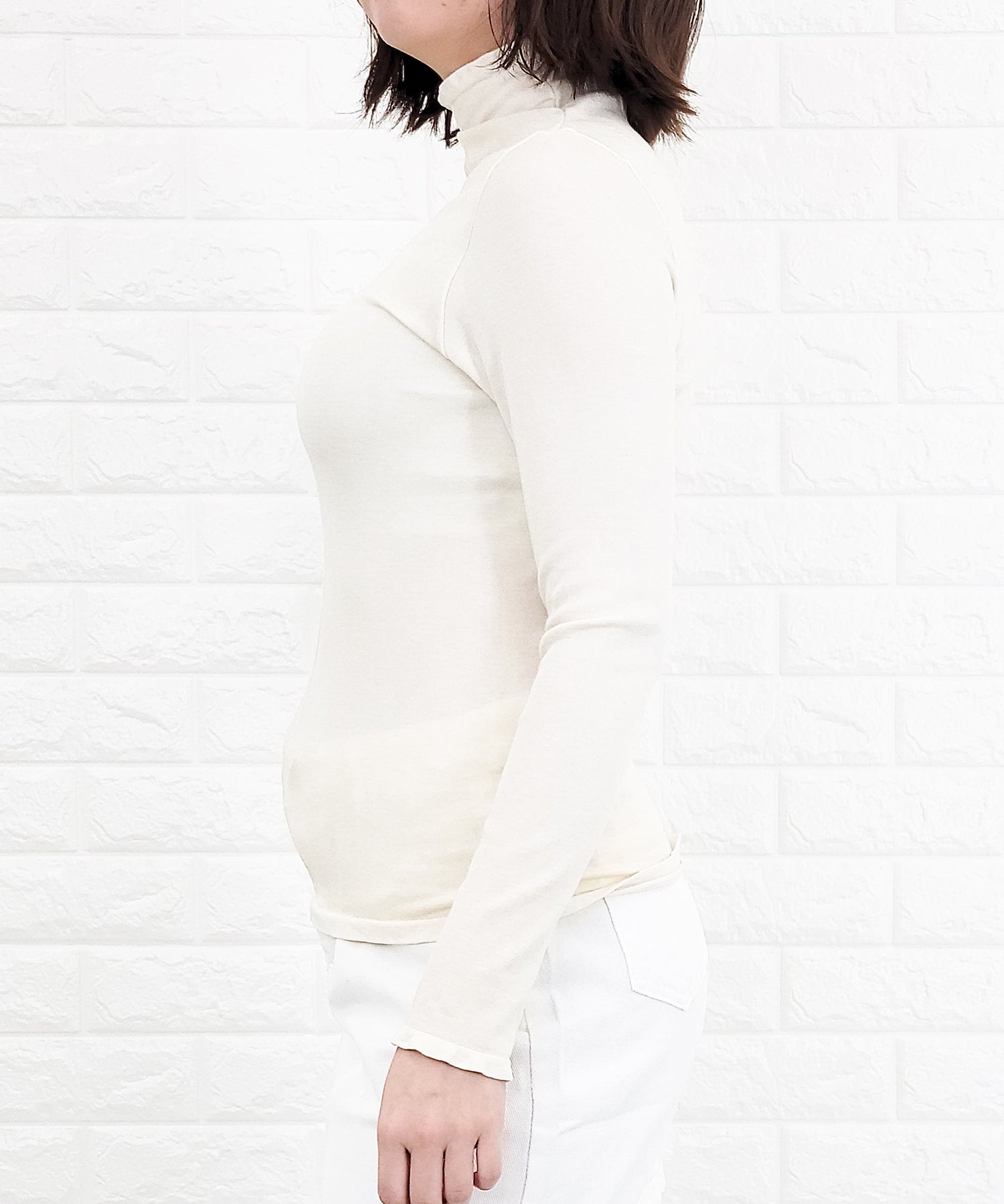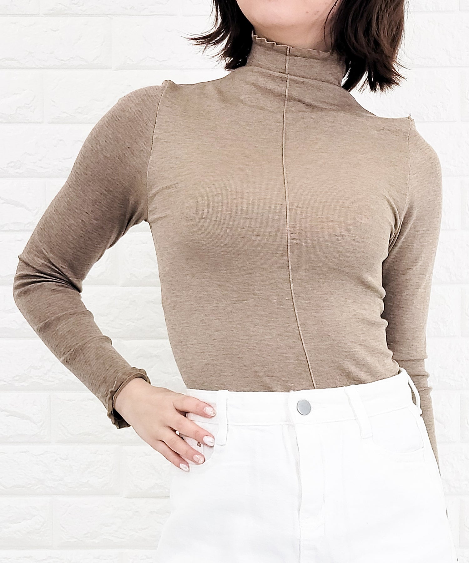首周りと袖口、裾のゆるやかに波打つデザインがポイント。
