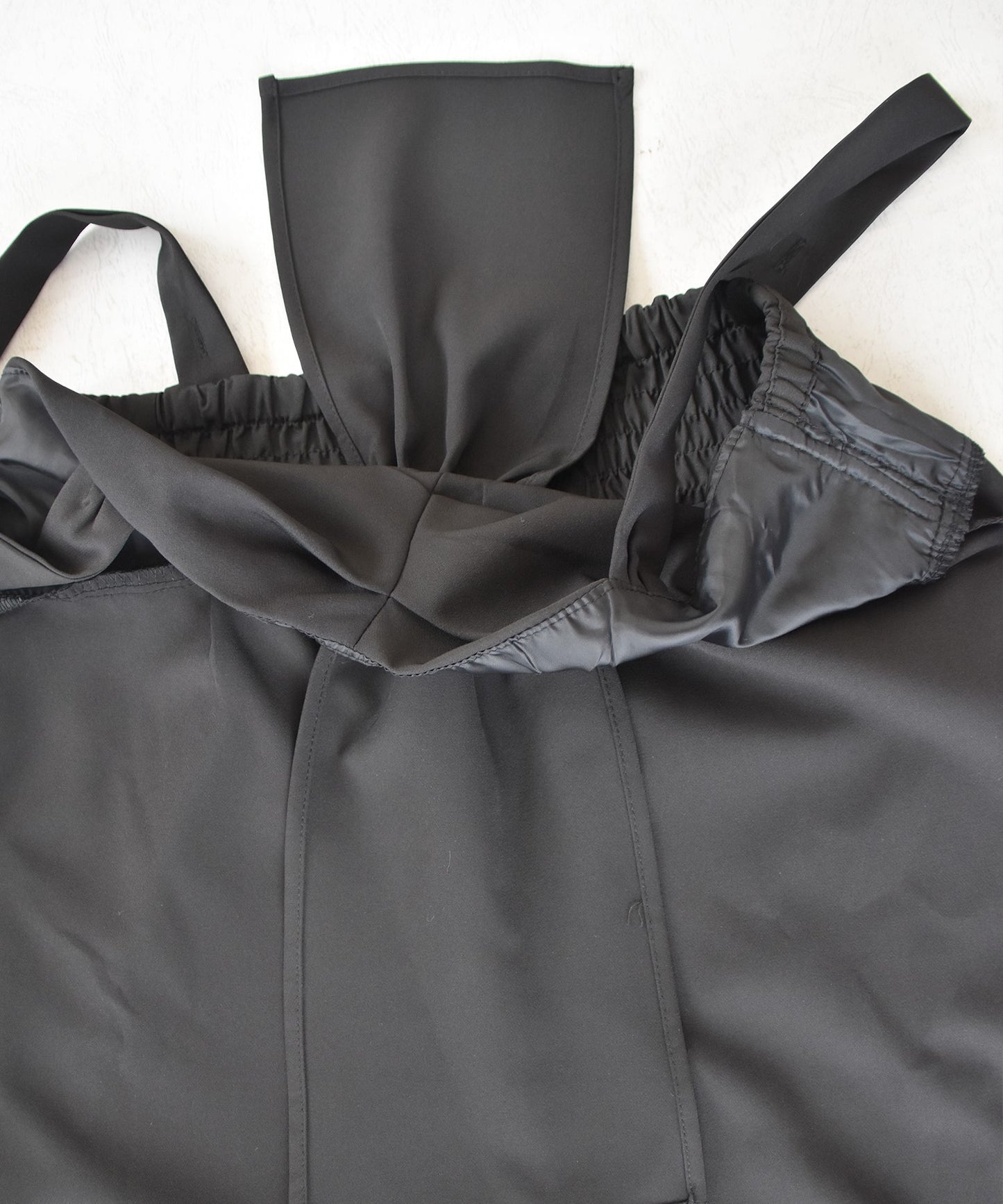商品詳細 | ◆伸縮性:あり ◆透け感:なし ◆裏地:なし ・サイドポケット ・フロントリボン結び ・肩紐2段ボタン調整可能 ・バックシャーリングゴム |