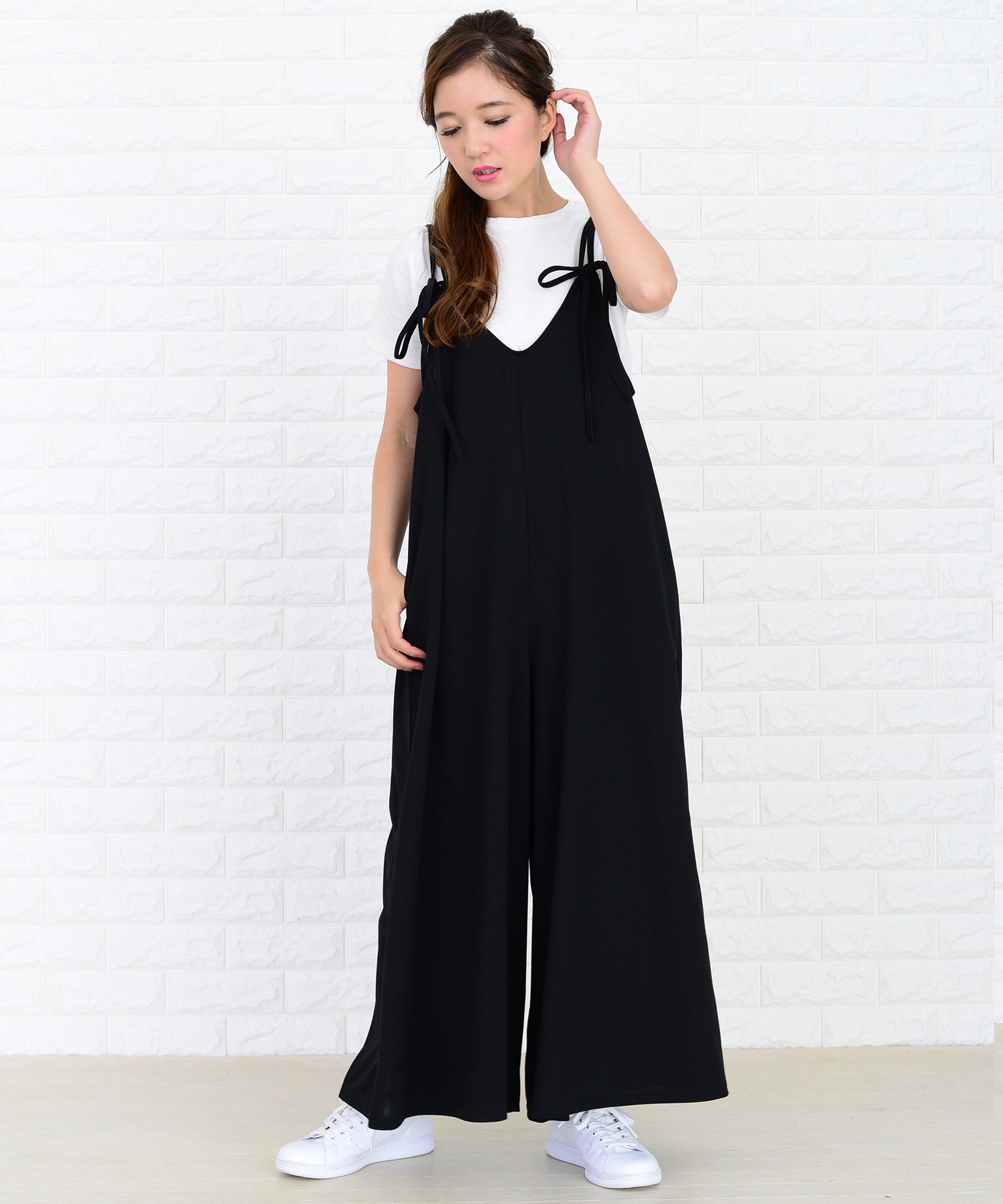 肩ひもリボン付き サロペットワイドパンツ オールインワン・パンツ