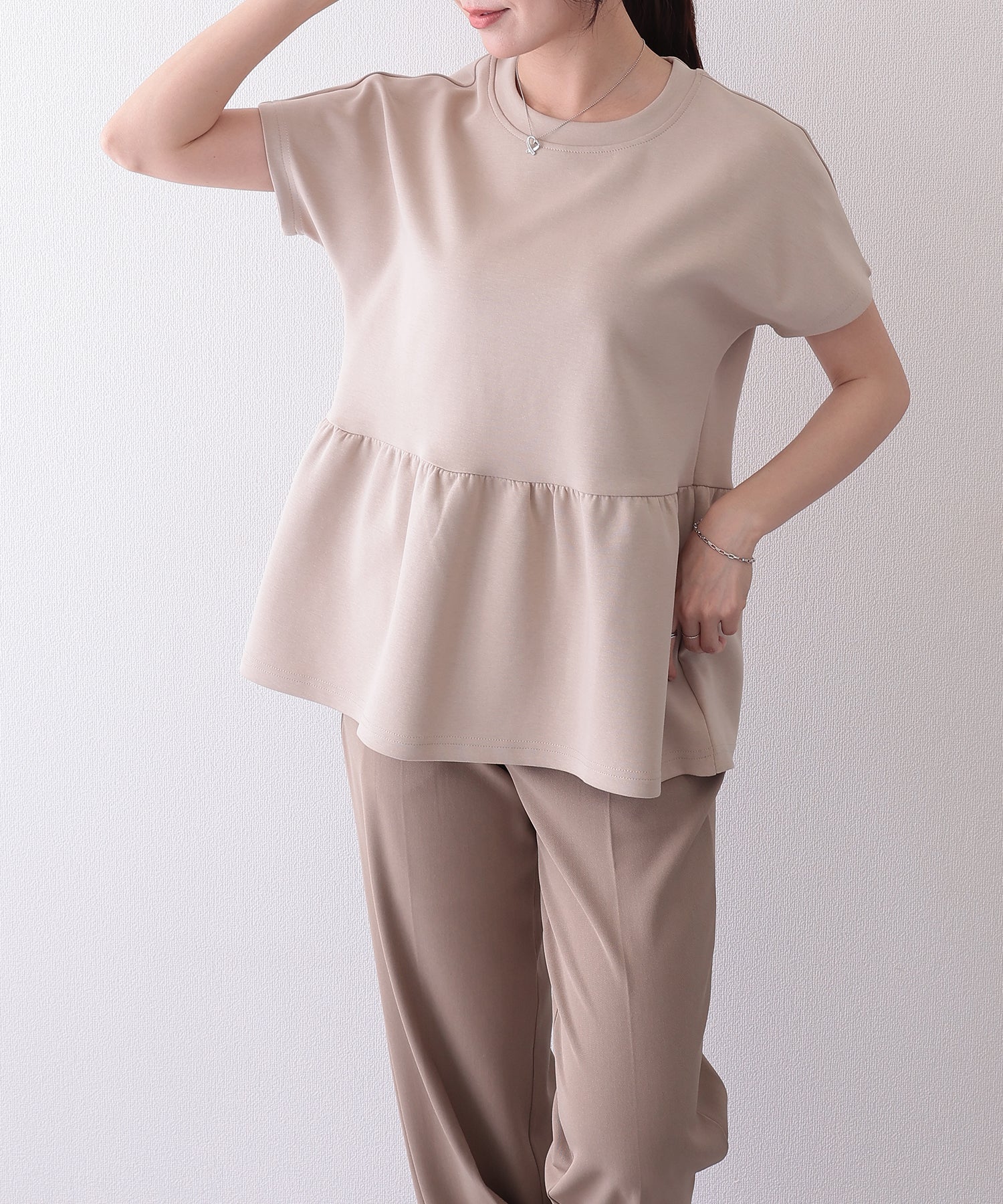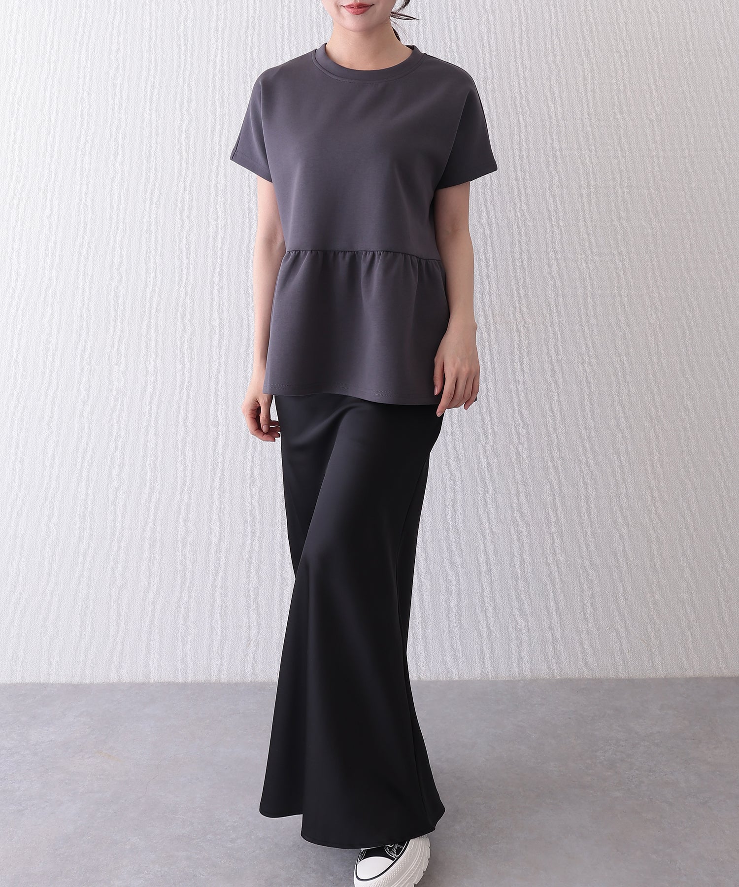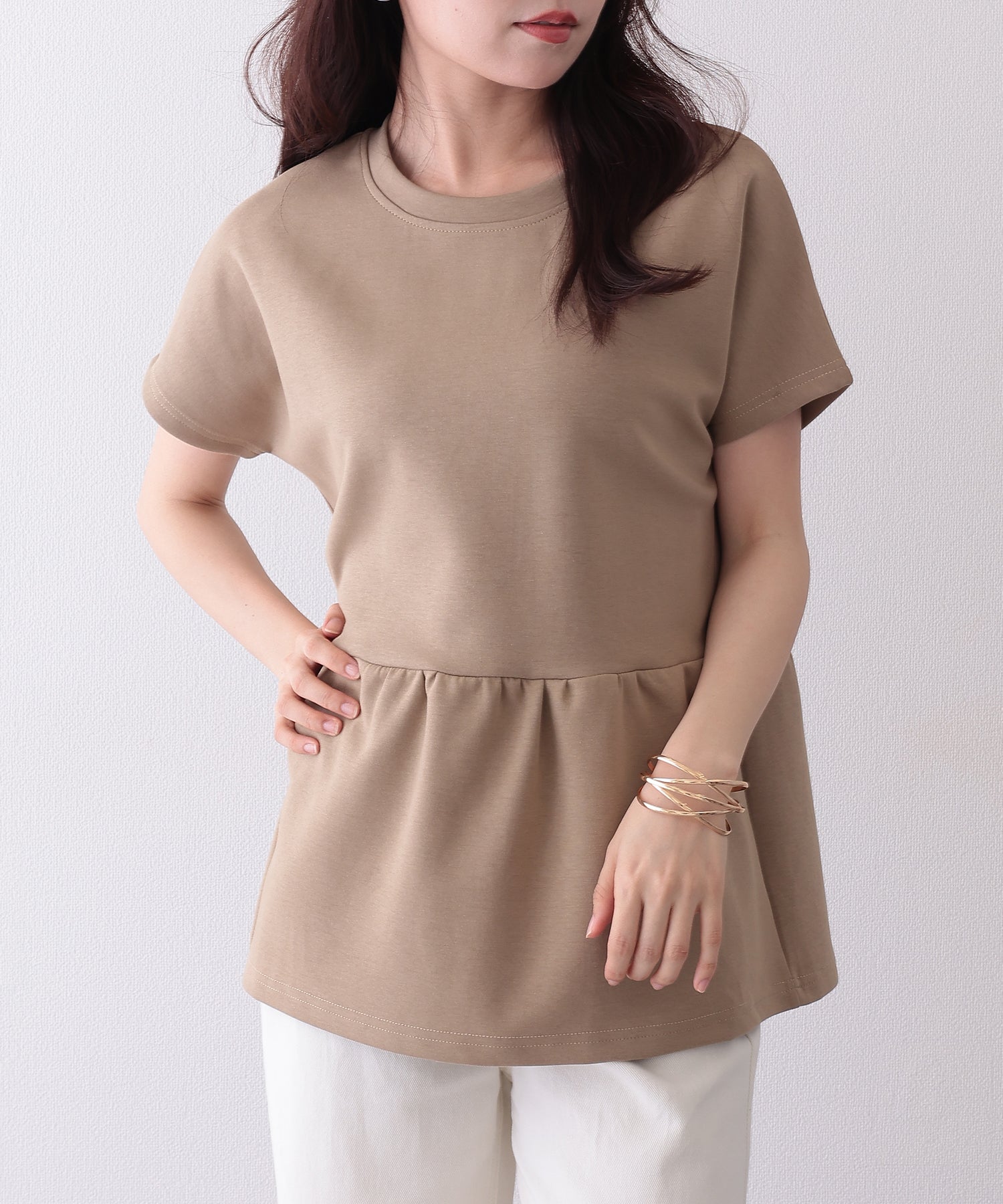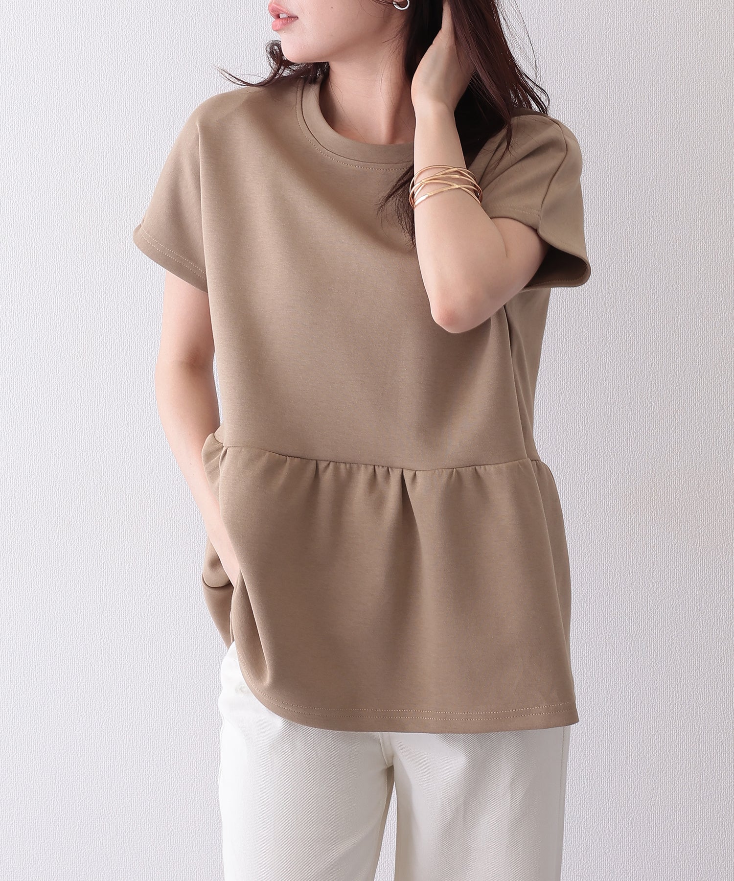 ソリッドカラー クルーネック ペプラム 半袖 Tシャツ