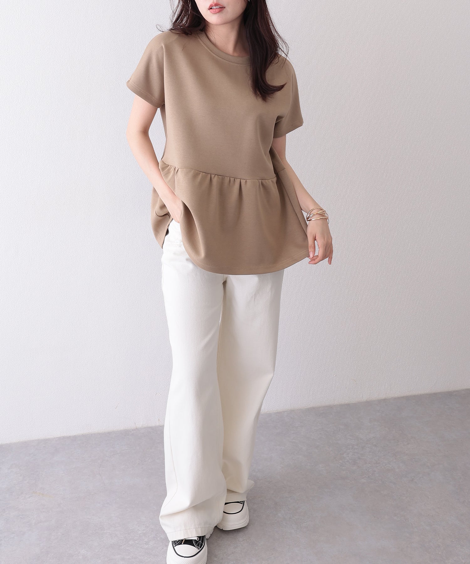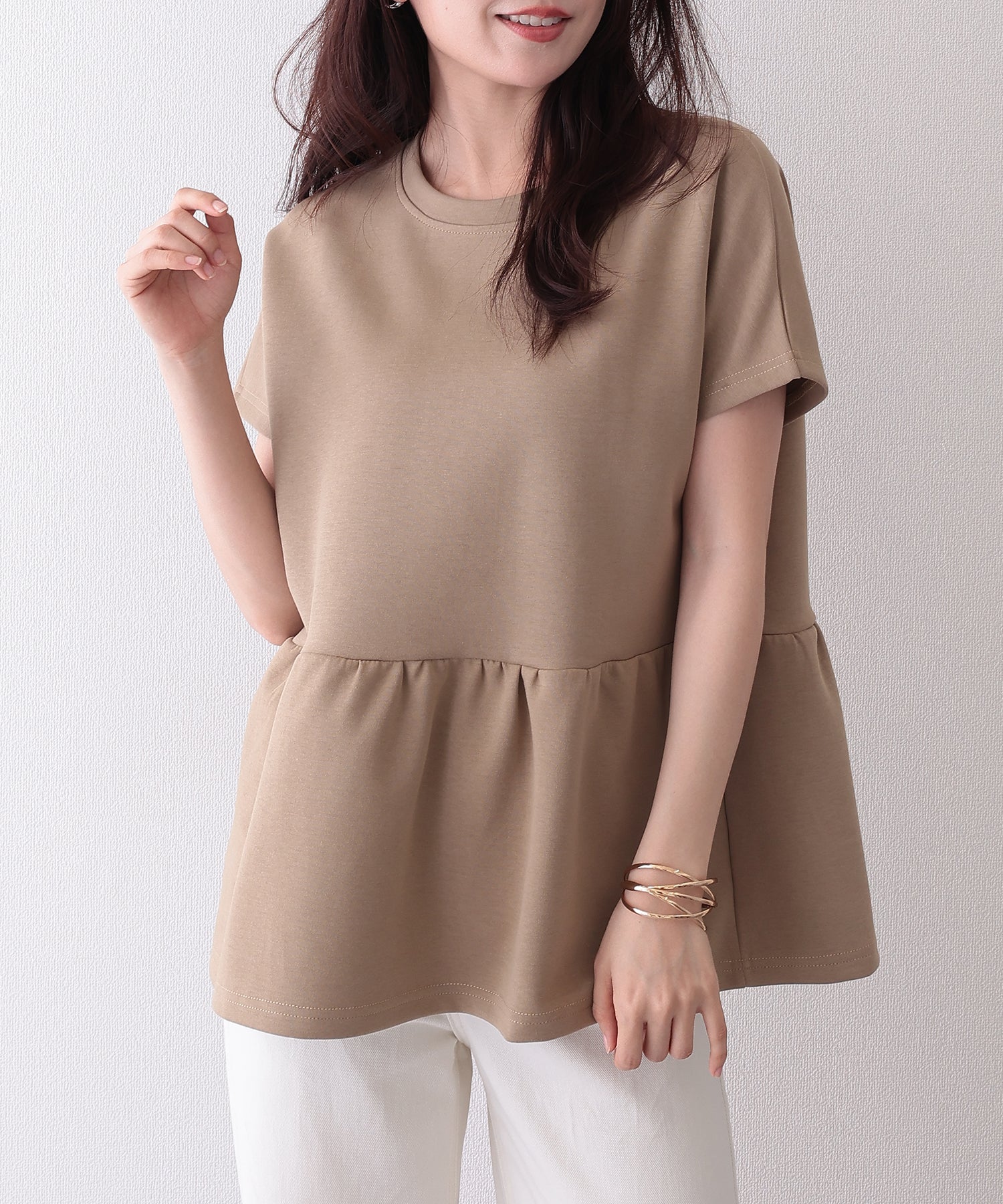 ウエストからふわっと膨らむペプラムラインが可愛いTシャツ。
