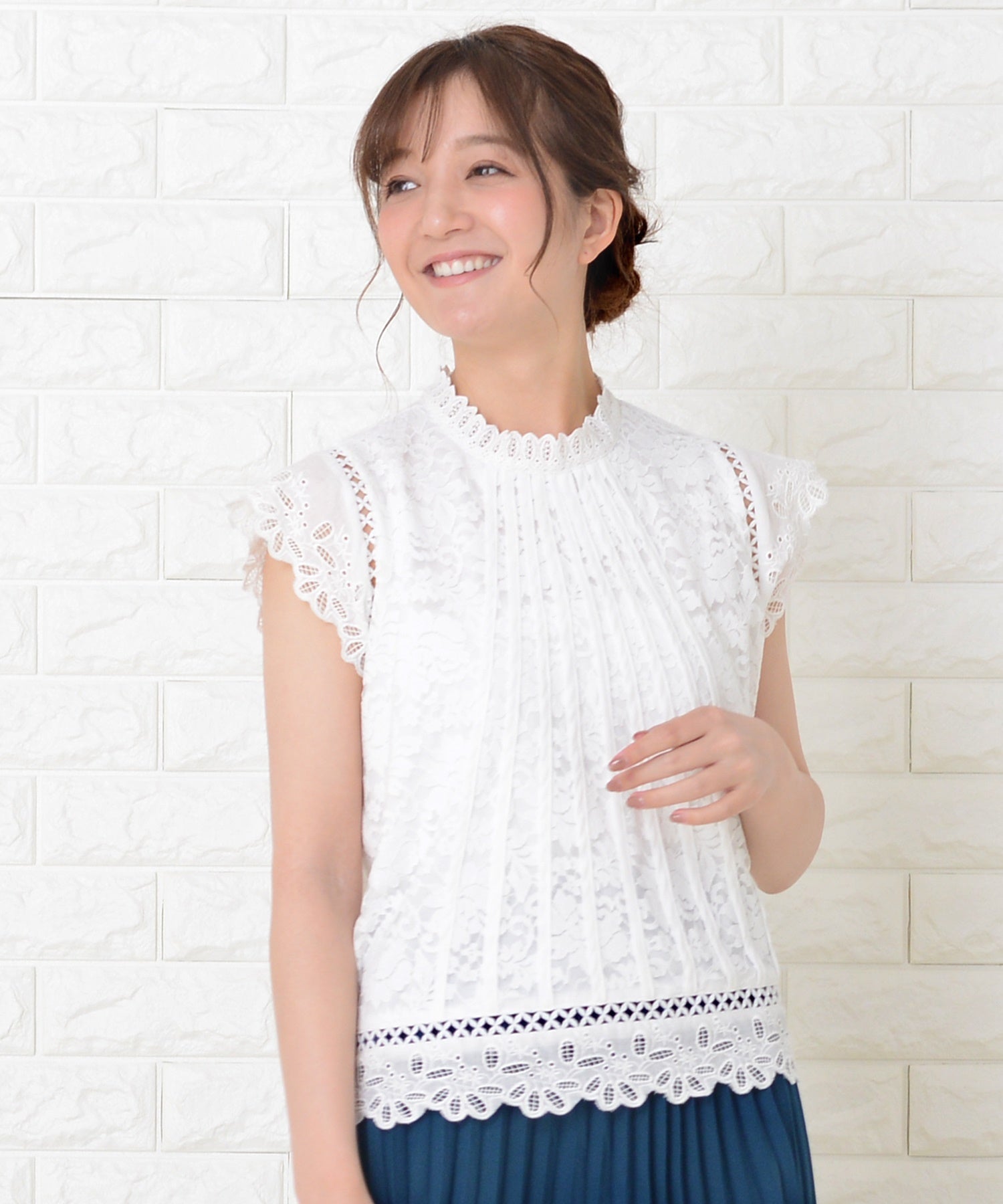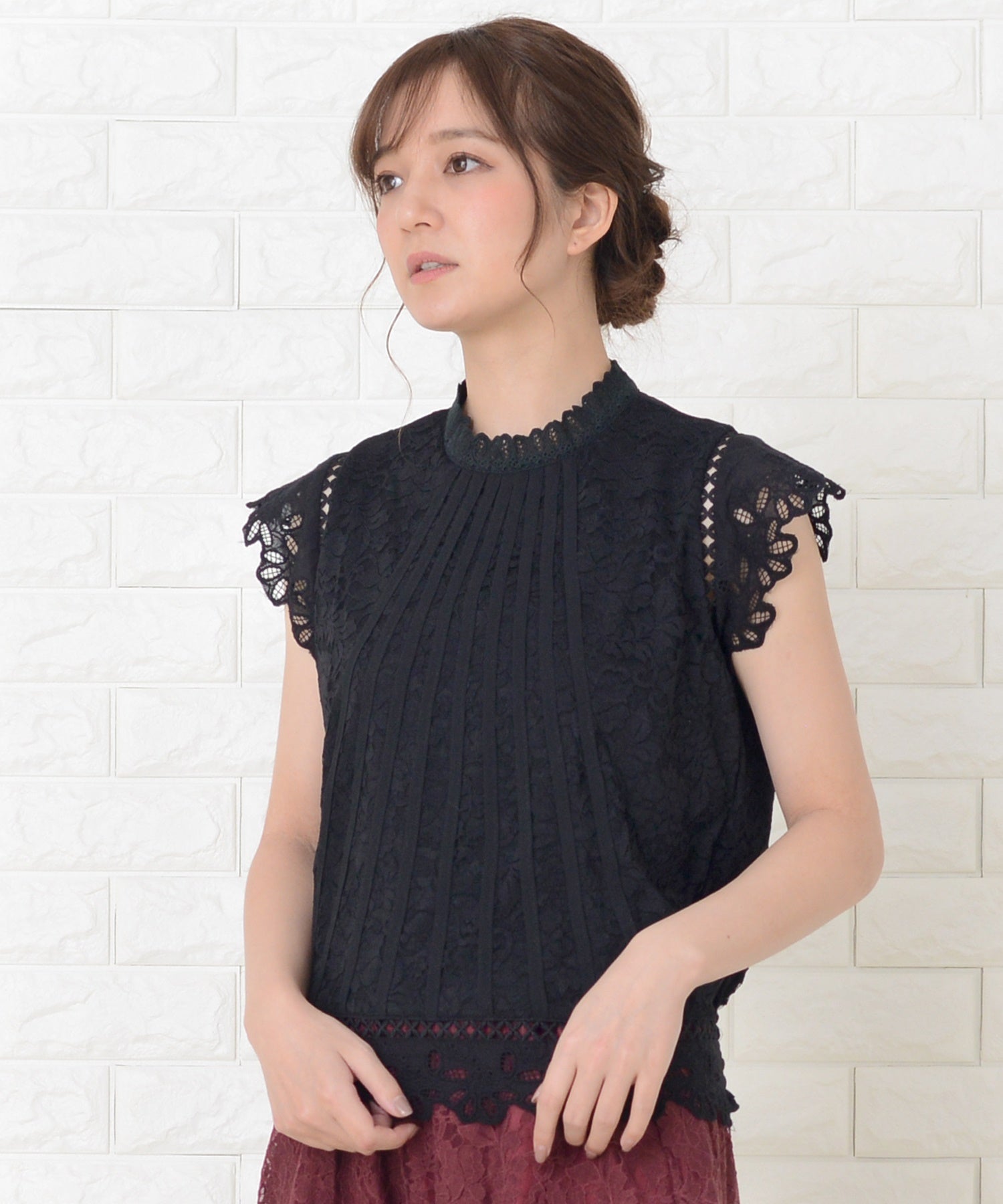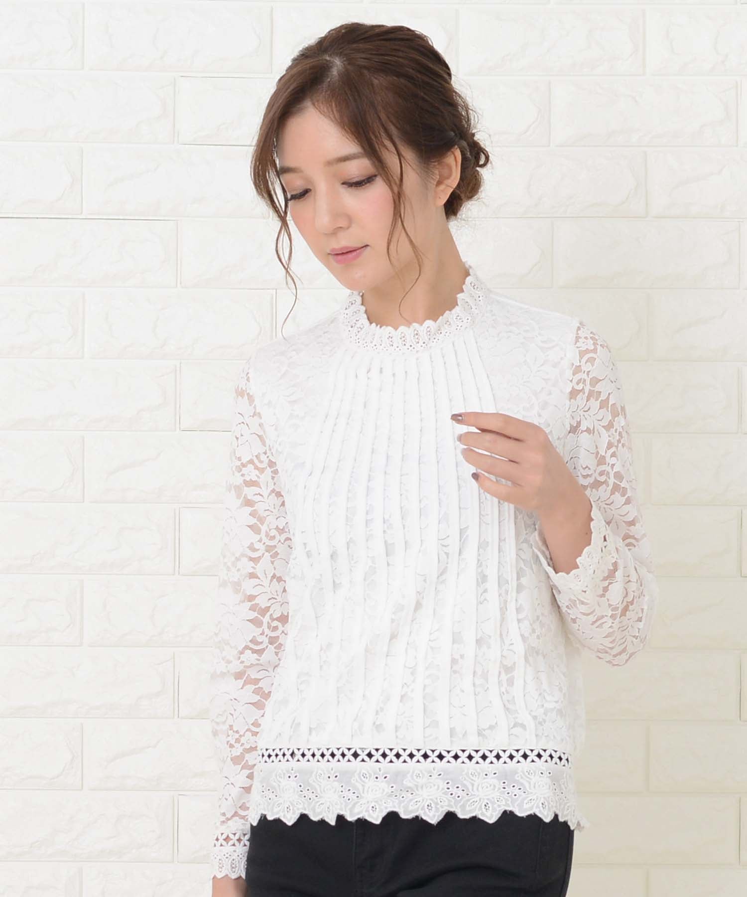 選べる2タイプ スタンドカラー 透かしレーストップス