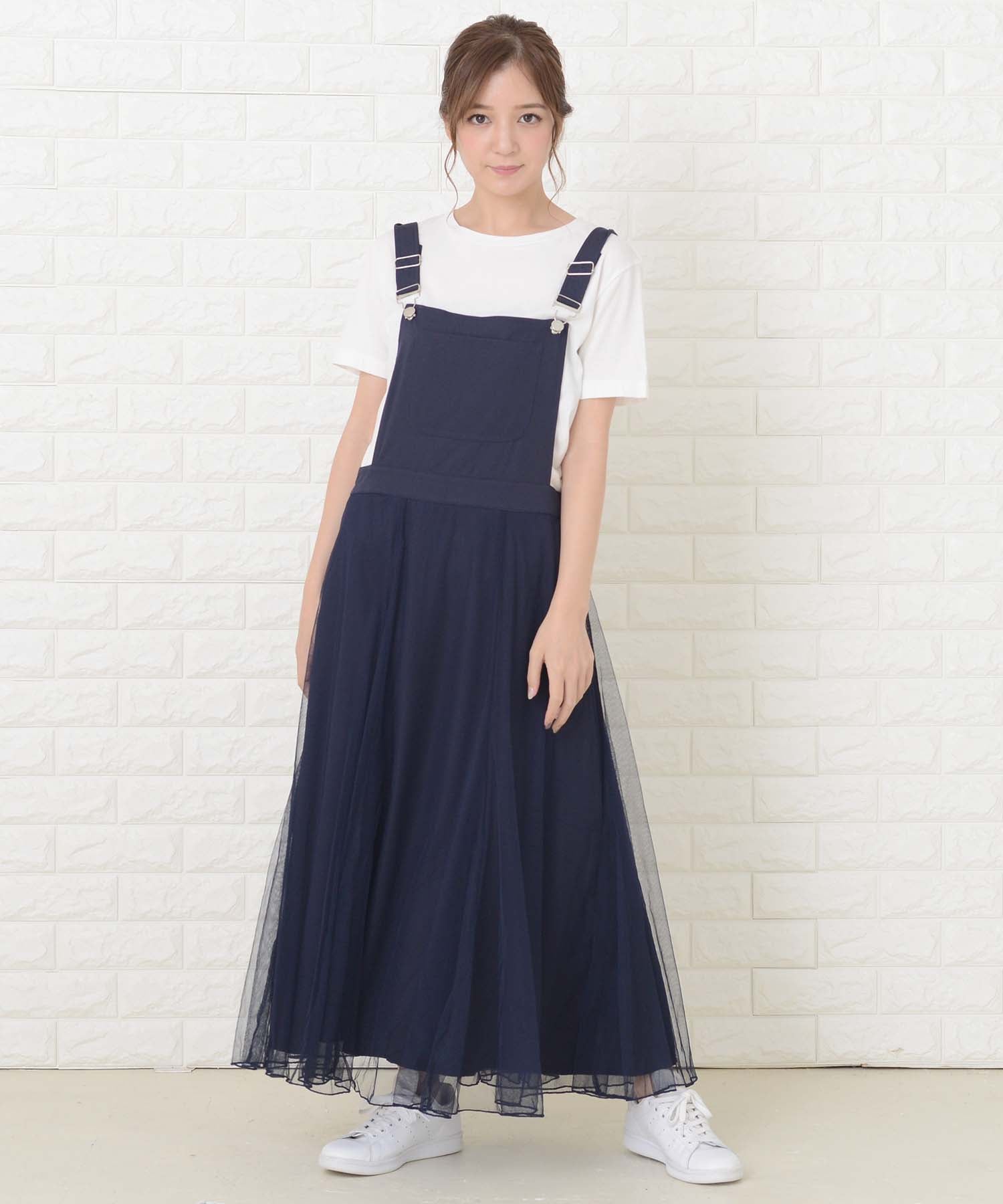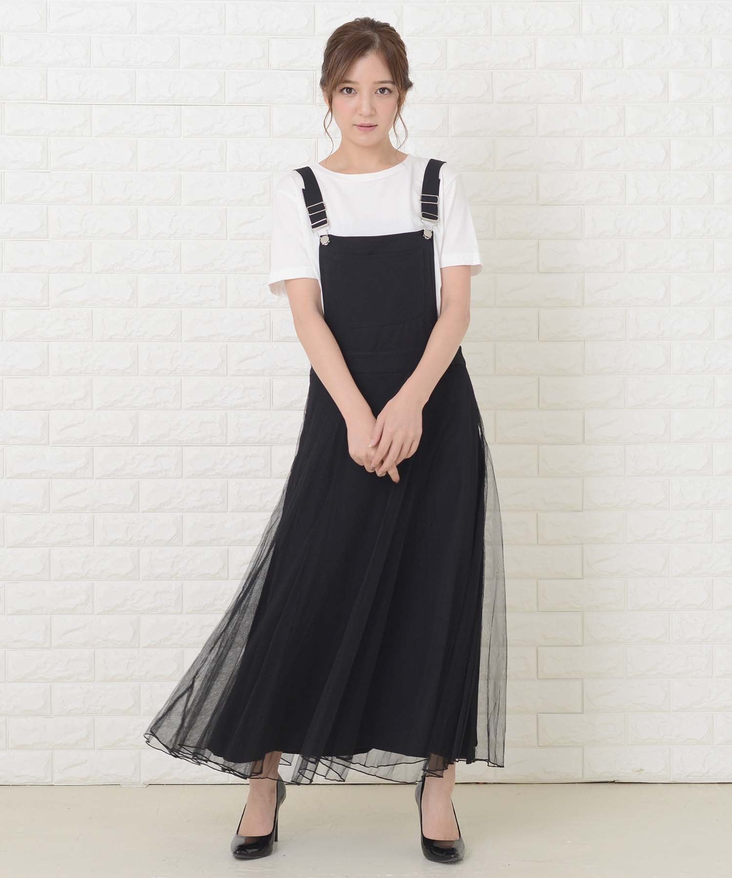 チュールフリル シアー 切り替え フレア ロング ドレス