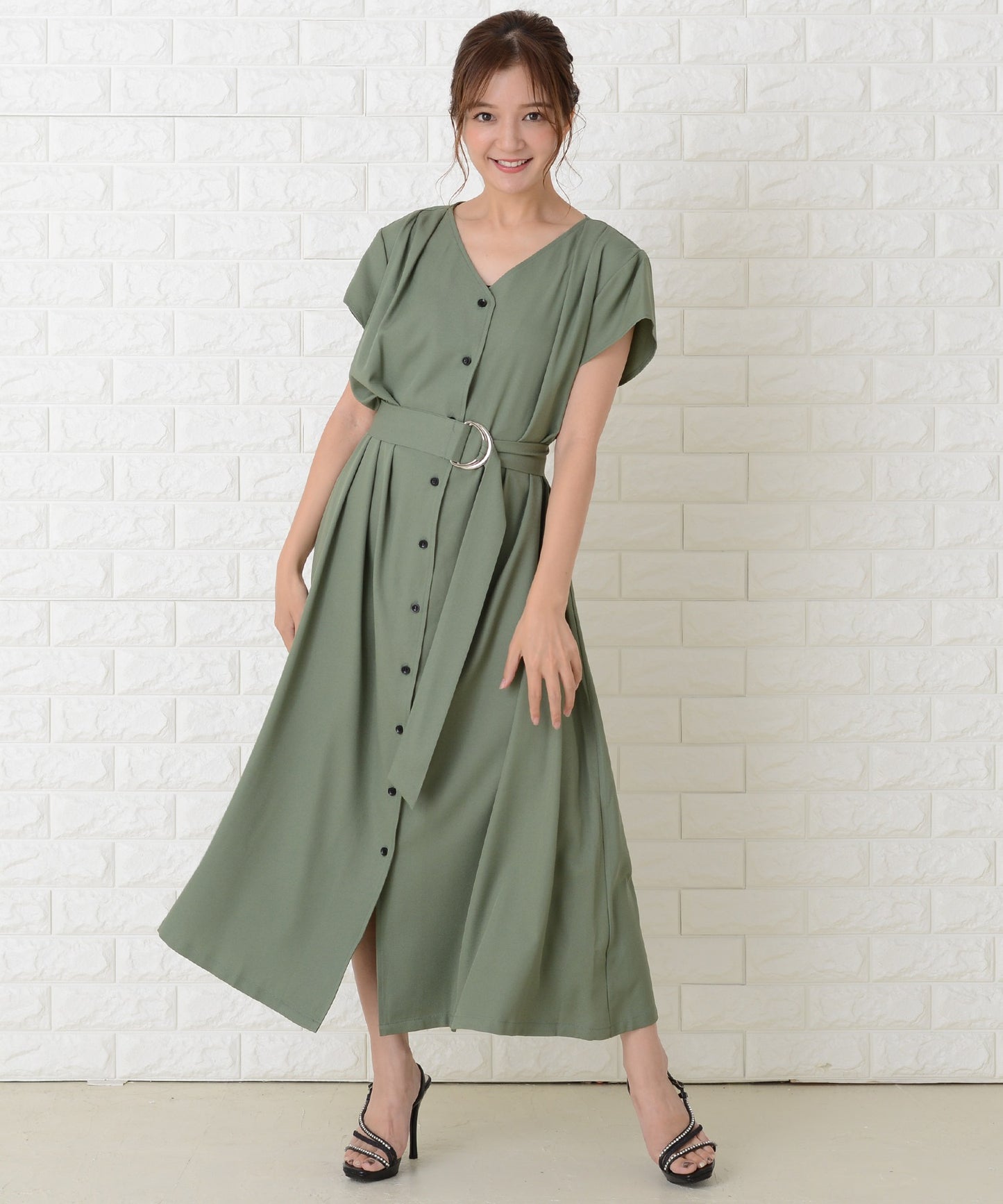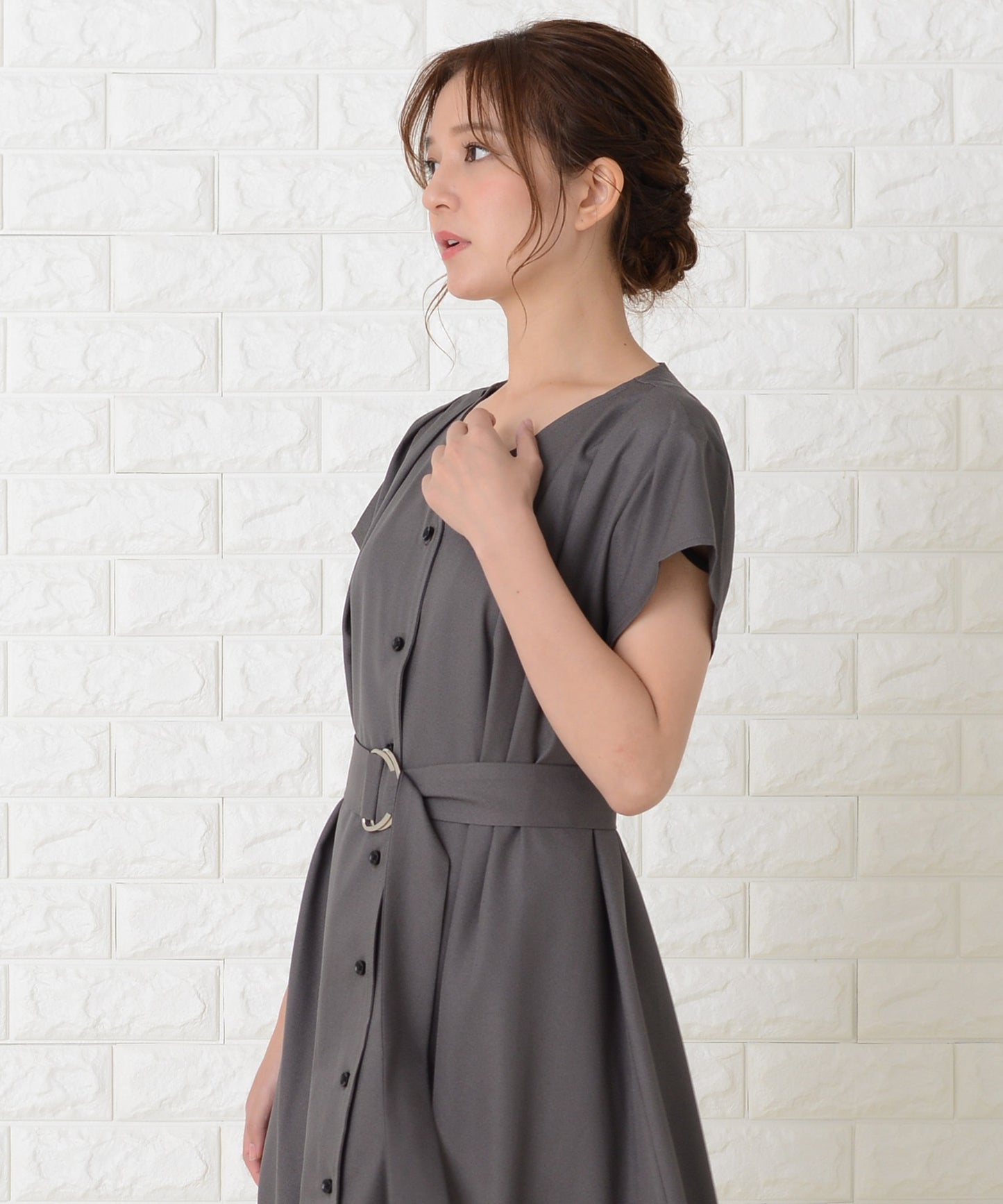 Vネックの襟元でスッキリした印象の半袖ワンピースドレス