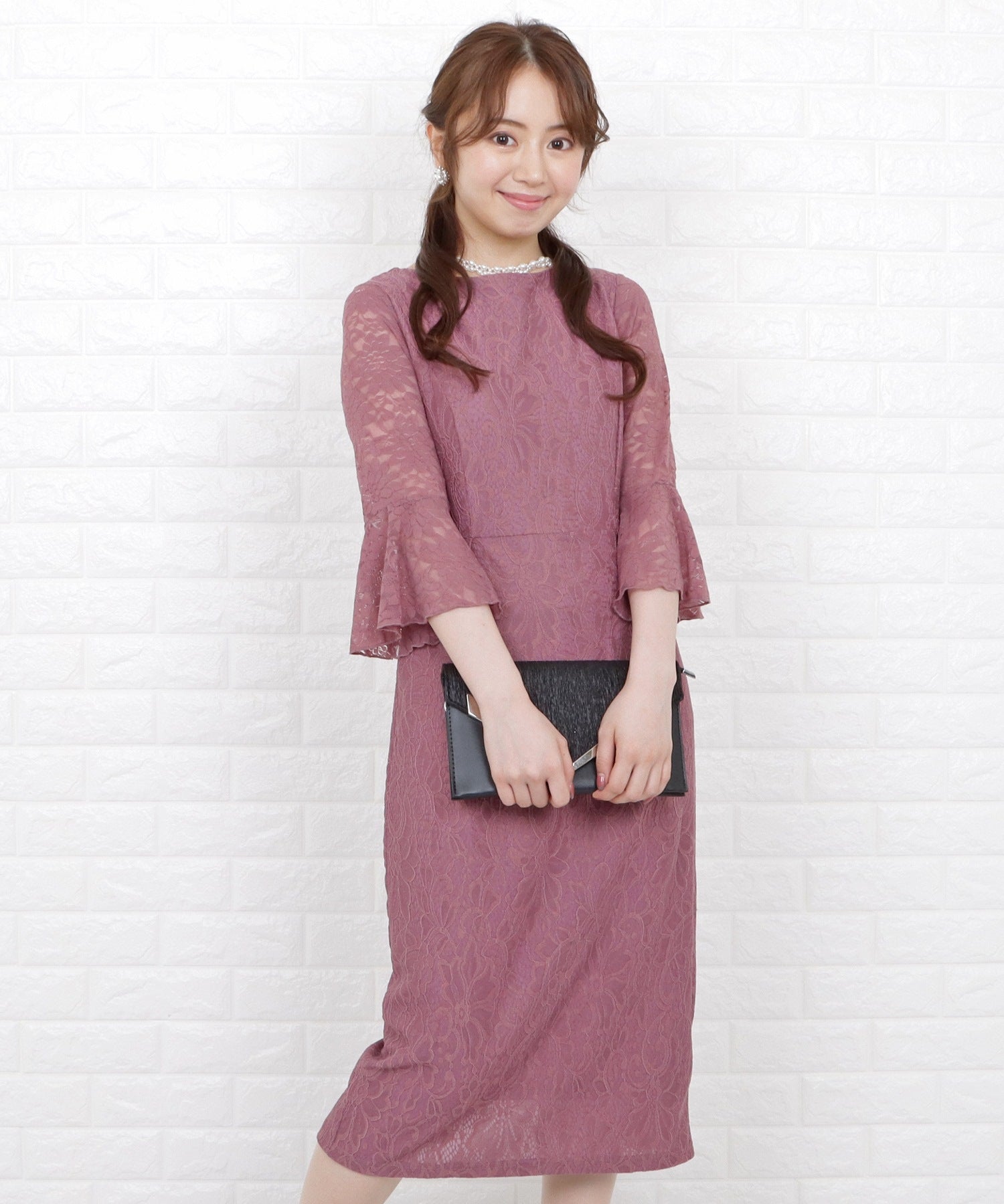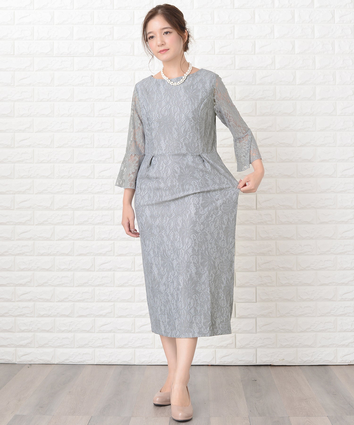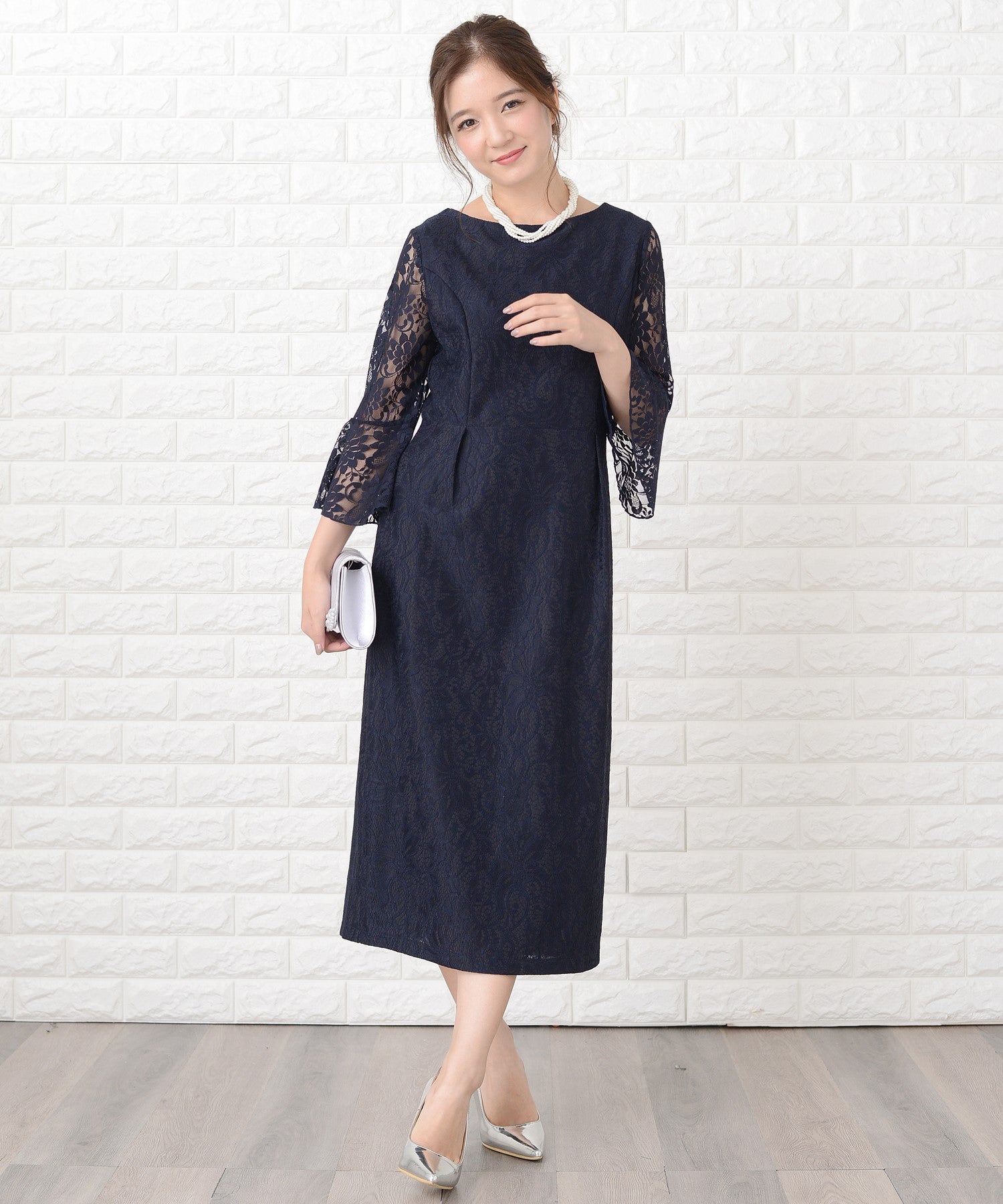 花柄総レースミモレ丈シンプルパーティドレス・ワンピース
