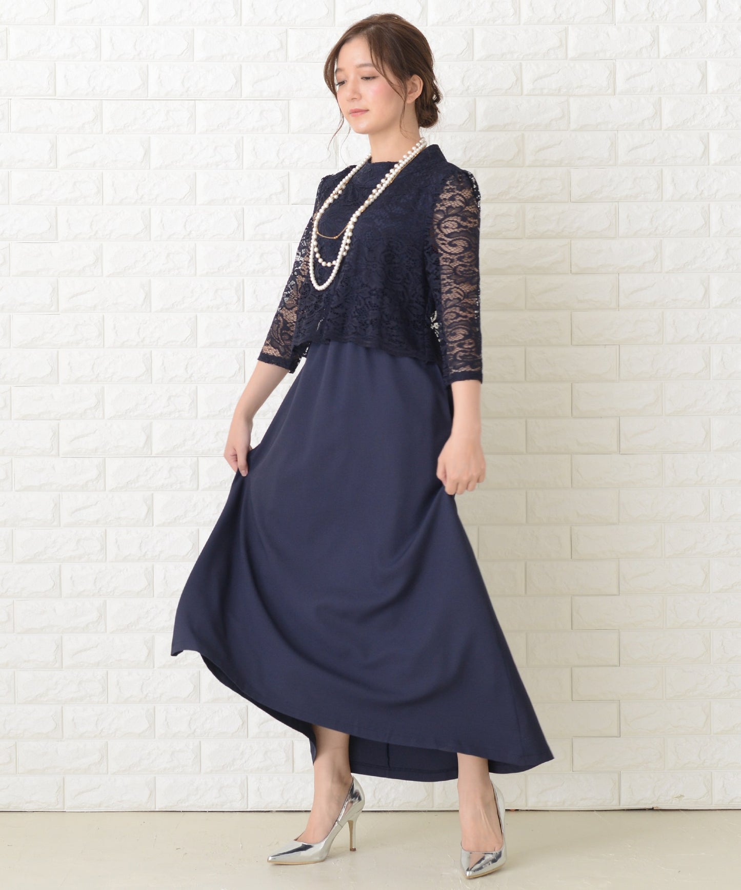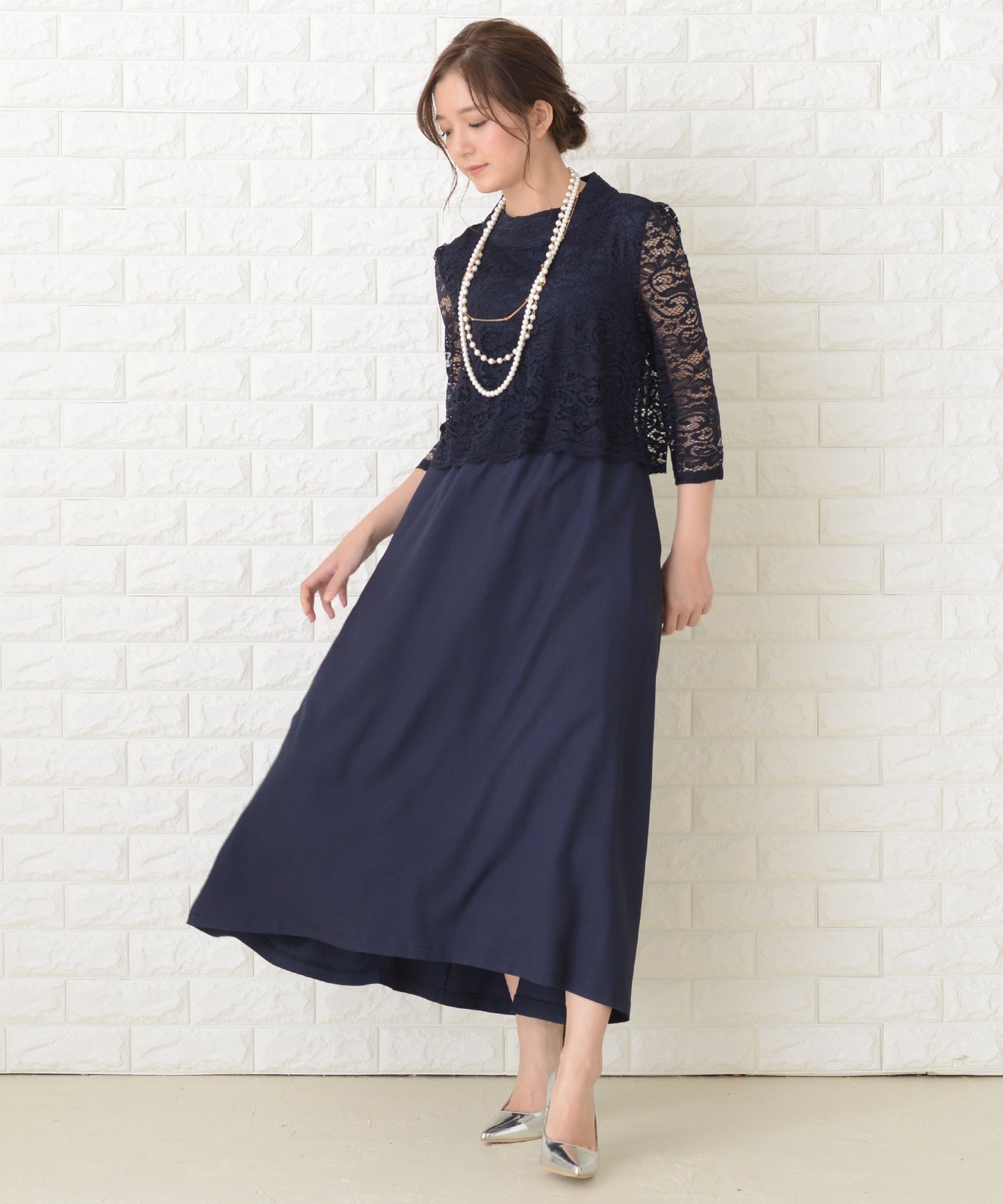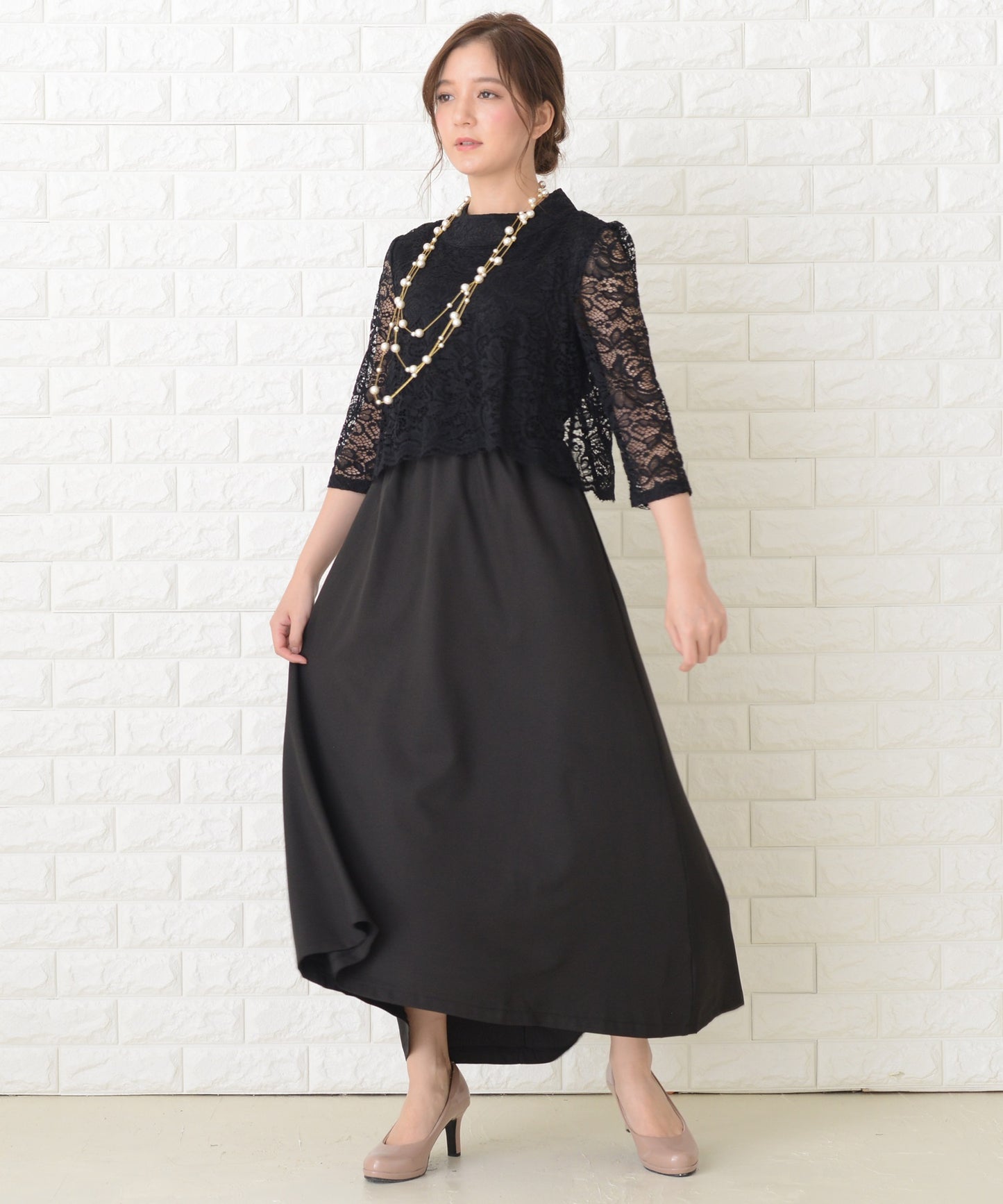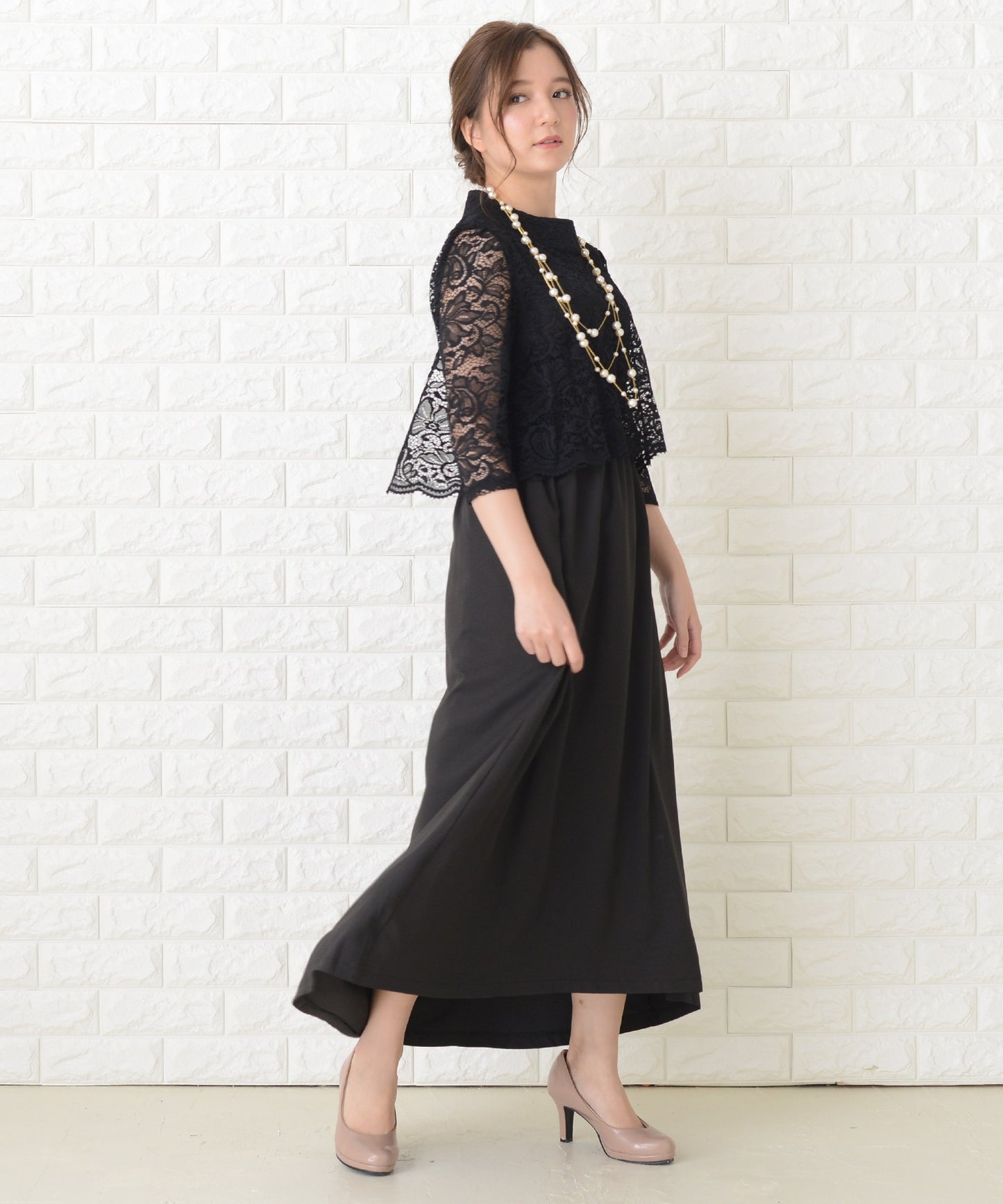 商品説明 | 人気のハイネック+ロング丈のレースドレスです。 レーストップスで高級感を演出。 フィッシュテールタイプのスカートは上品なロング丈。 レース状の七分袖は伸縮性あり。またウエストもゴムタイプなのでゆったり着られます。 結婚式などパーティシーンや、カジュアルダウンして普段のコーディネイトなど幅広いシーンで活躍する一着です。 |
