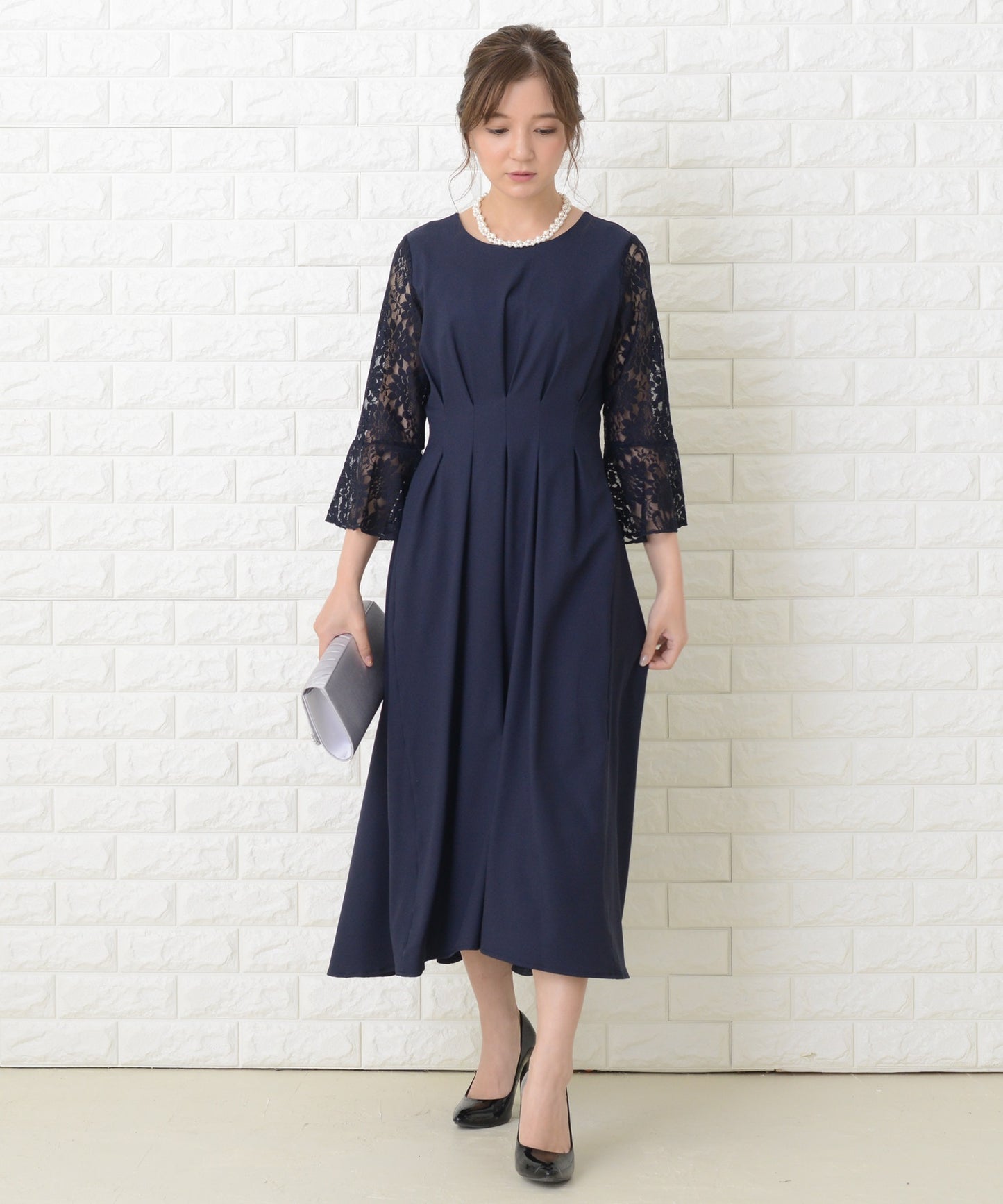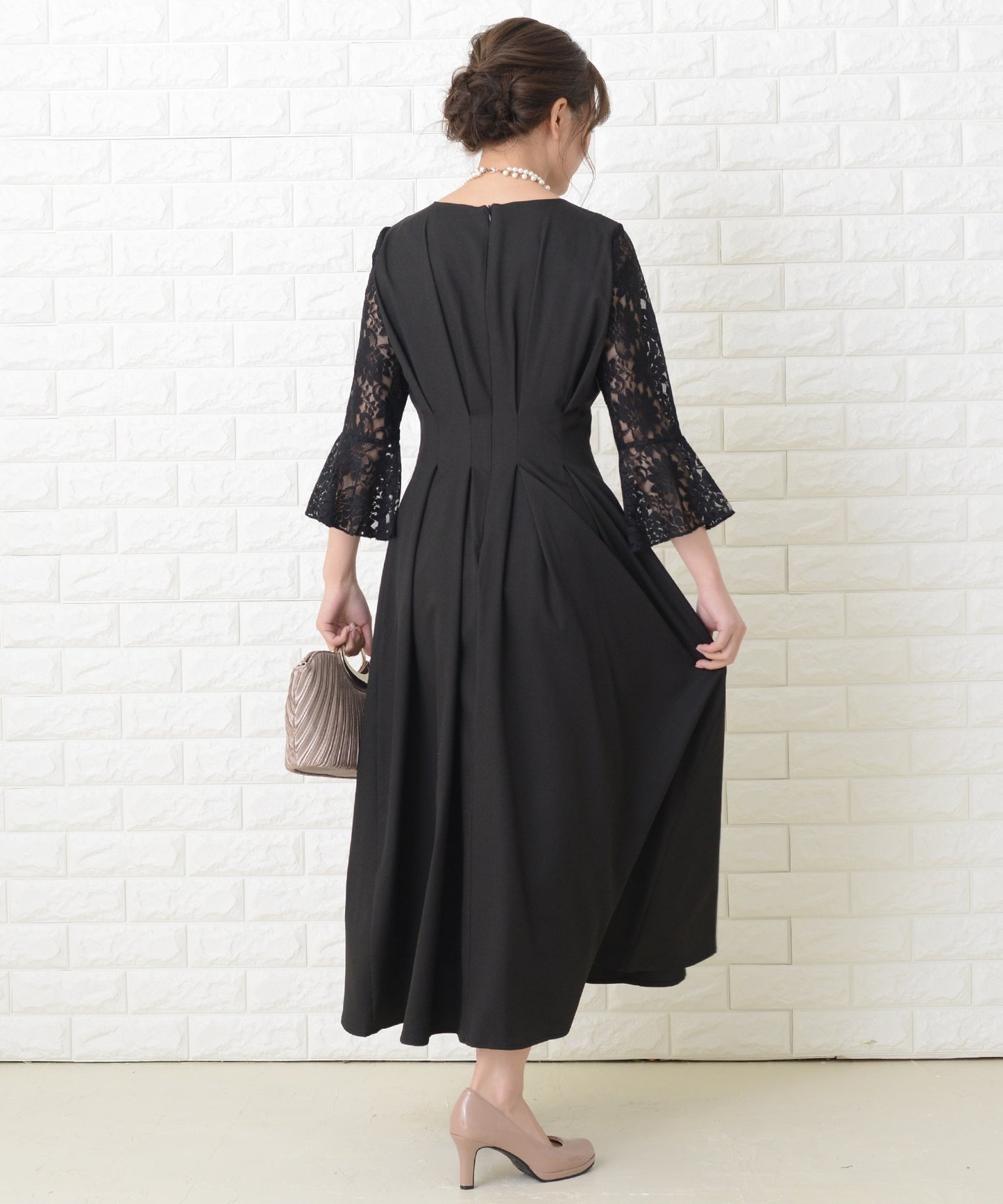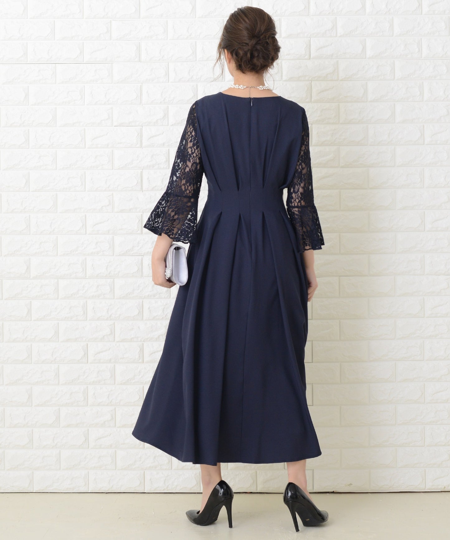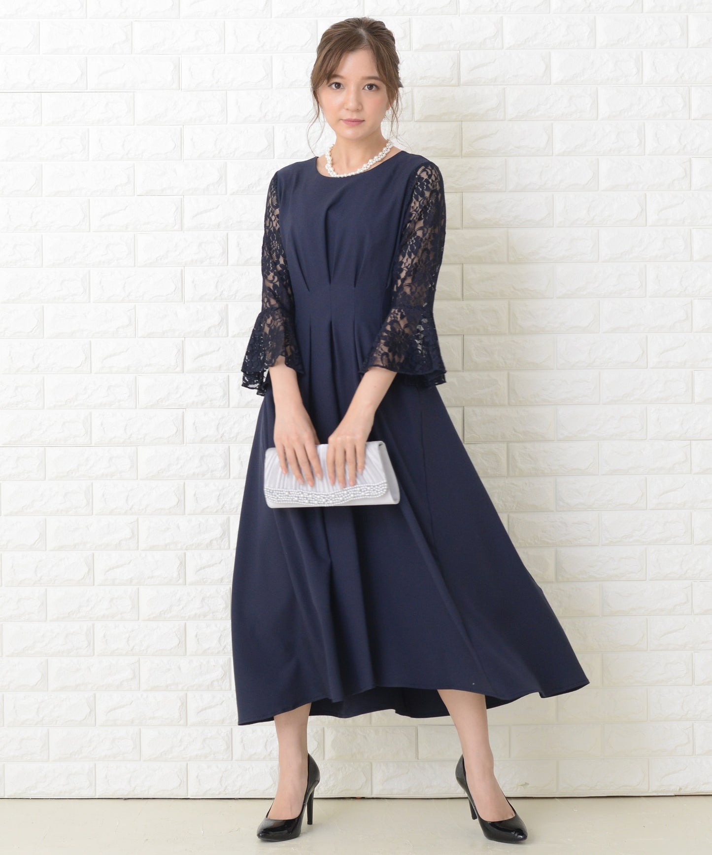 商品説明 | ウエストの上下にあるタックが美しいXラインを作り出す、スタイルアップが叶う魔法ドレスです。 袖は華やかな花柄レースを採用。エレガントなアンブレラスリーブです。 量感のあるフレアロングスカートは足の動きに合わせ様々な表情を作ります。 結婚式などのフォーマルシーンはもちろん、お呼ばれや演奏会などさまざまなシーンに活躍する一着です。 |