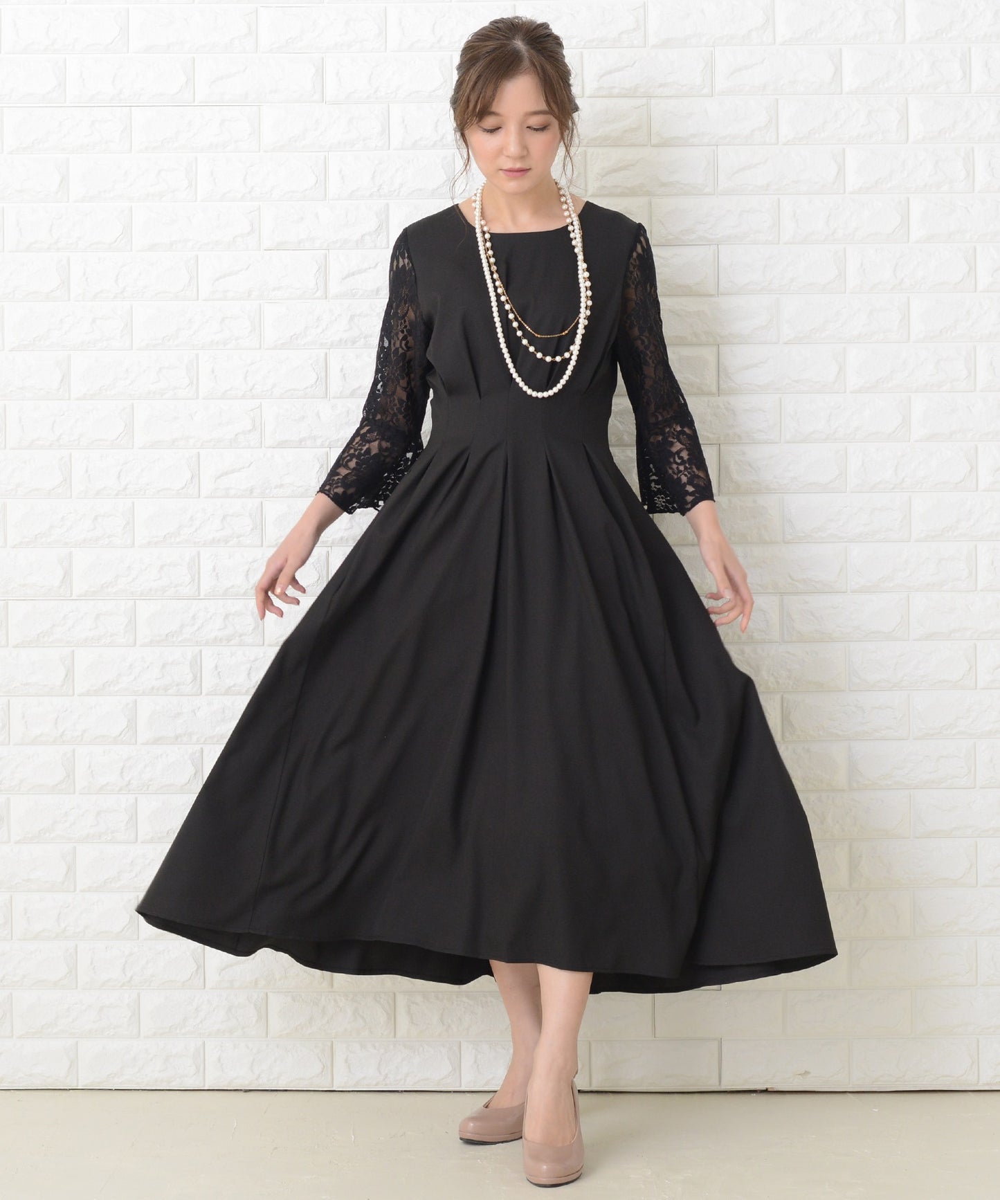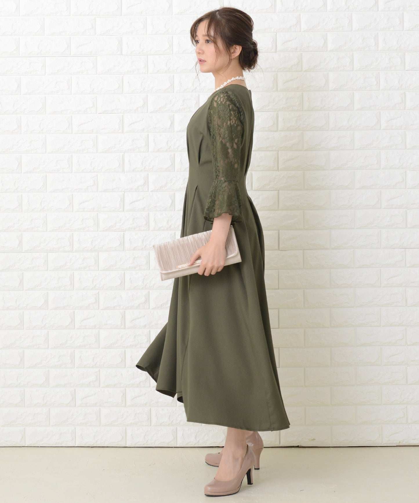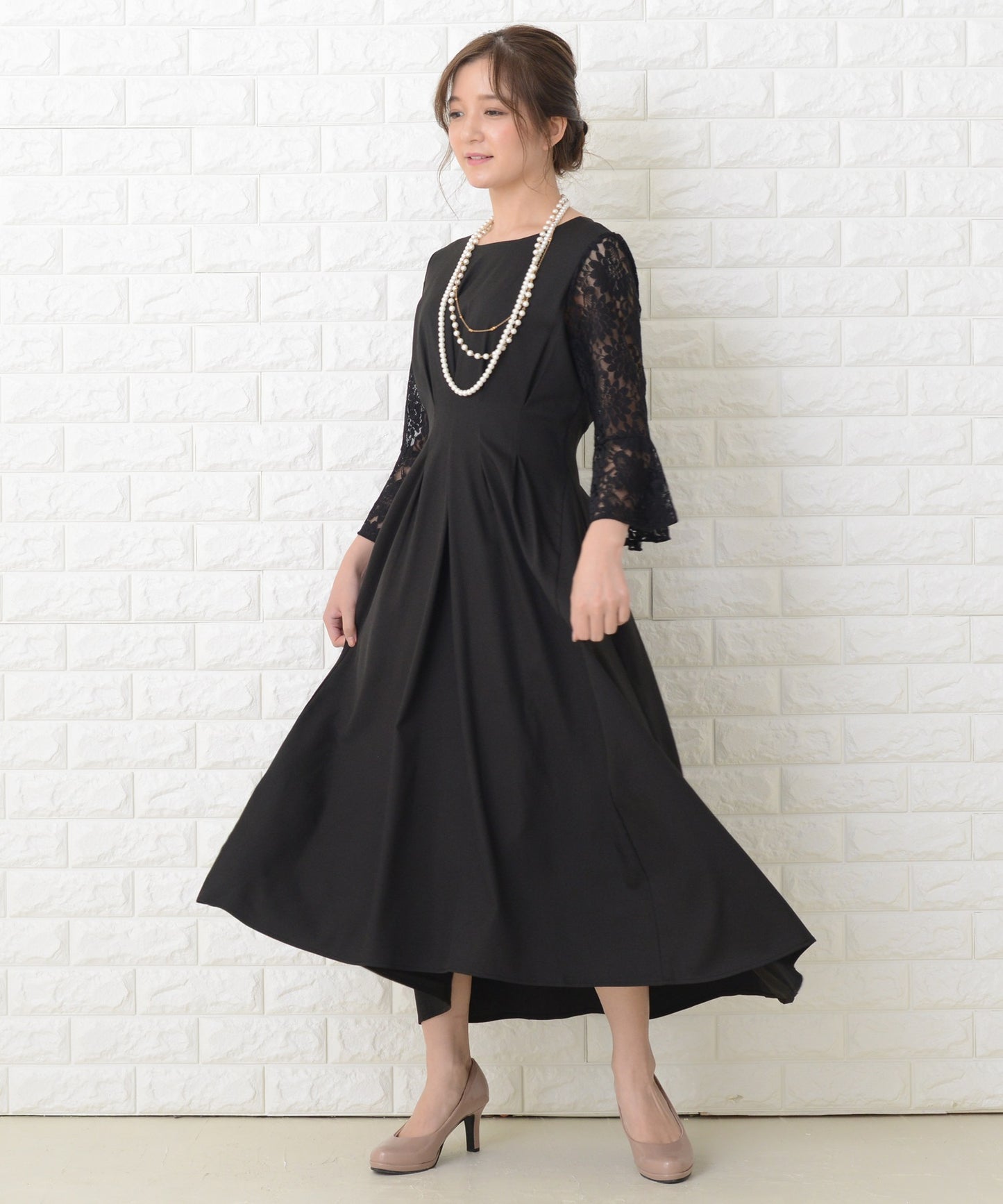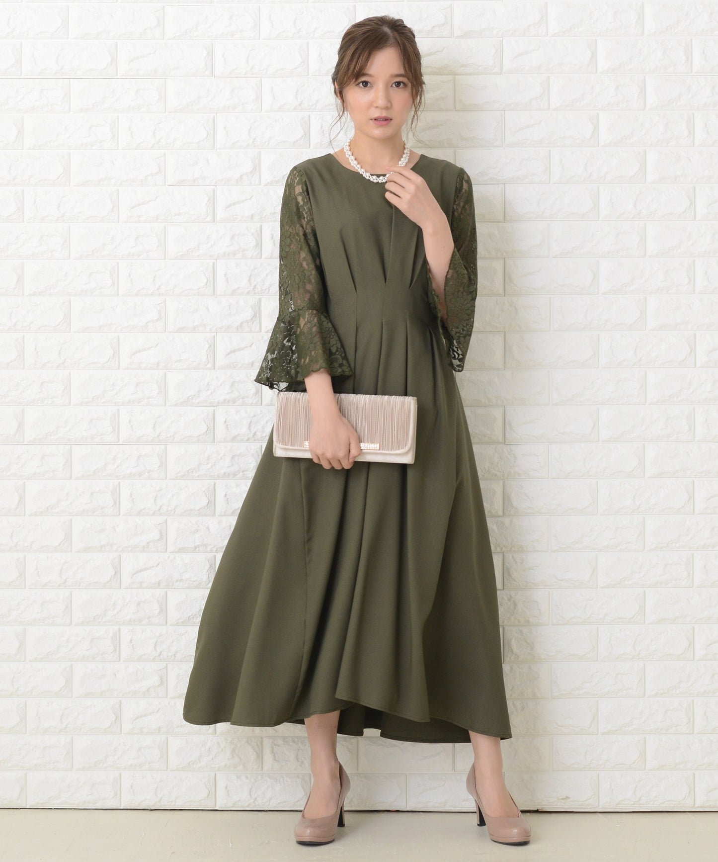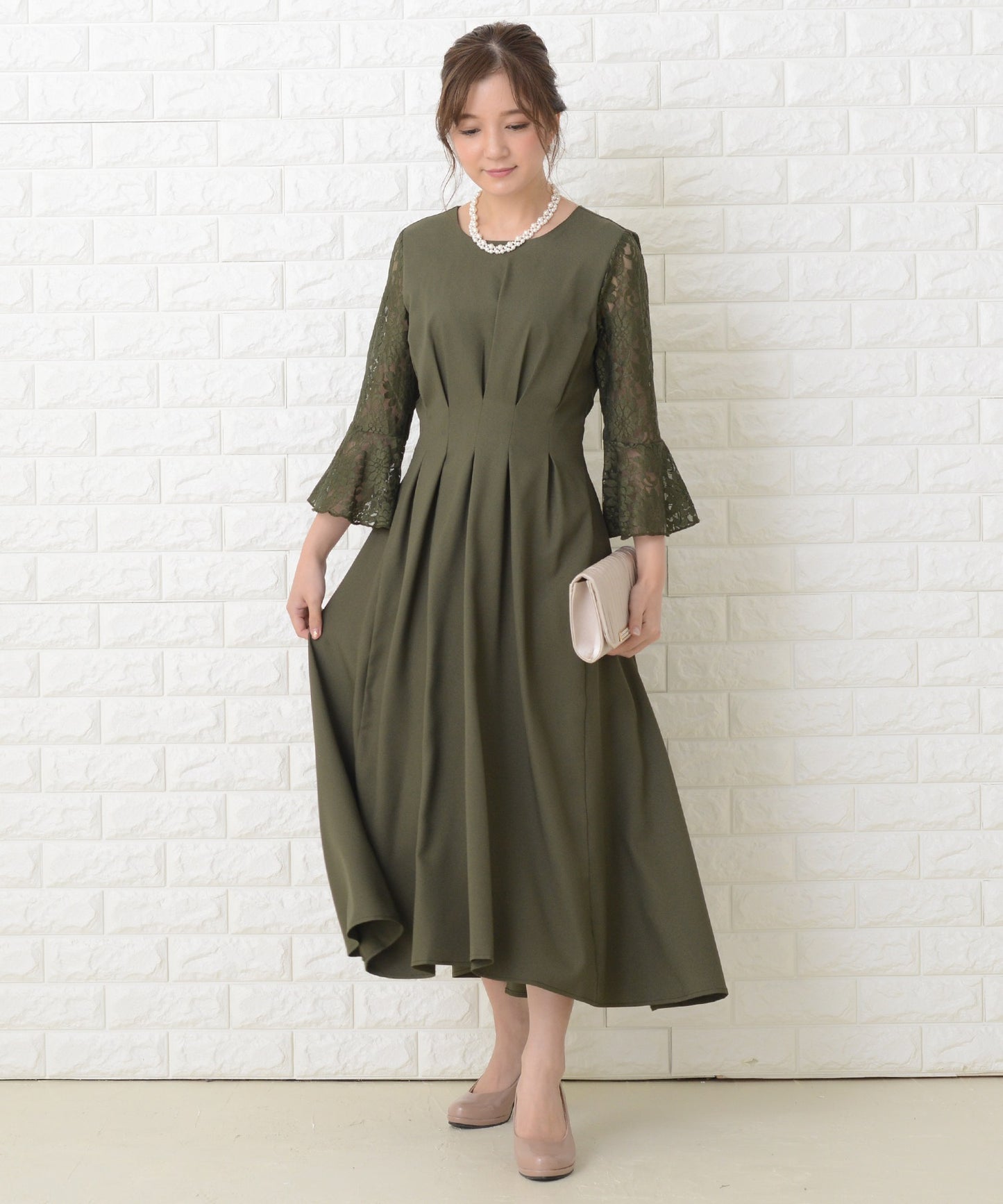 商品説明 | ウエストの上下にあるタックが美しいXラインを作り出す、スタイルアップが叶う魔法ドレスです。 袖は華やかな花柄レースを採用。エレガントなアンブレラスリーブです。 量感のあるフレアロングスカートは足の動きに合わせ様々な表情を作ります。 結婚式などのフォーマルシーンはもちろん、お呼ばれや演奏会などさまざまなシーンに活躍する一着です。 |