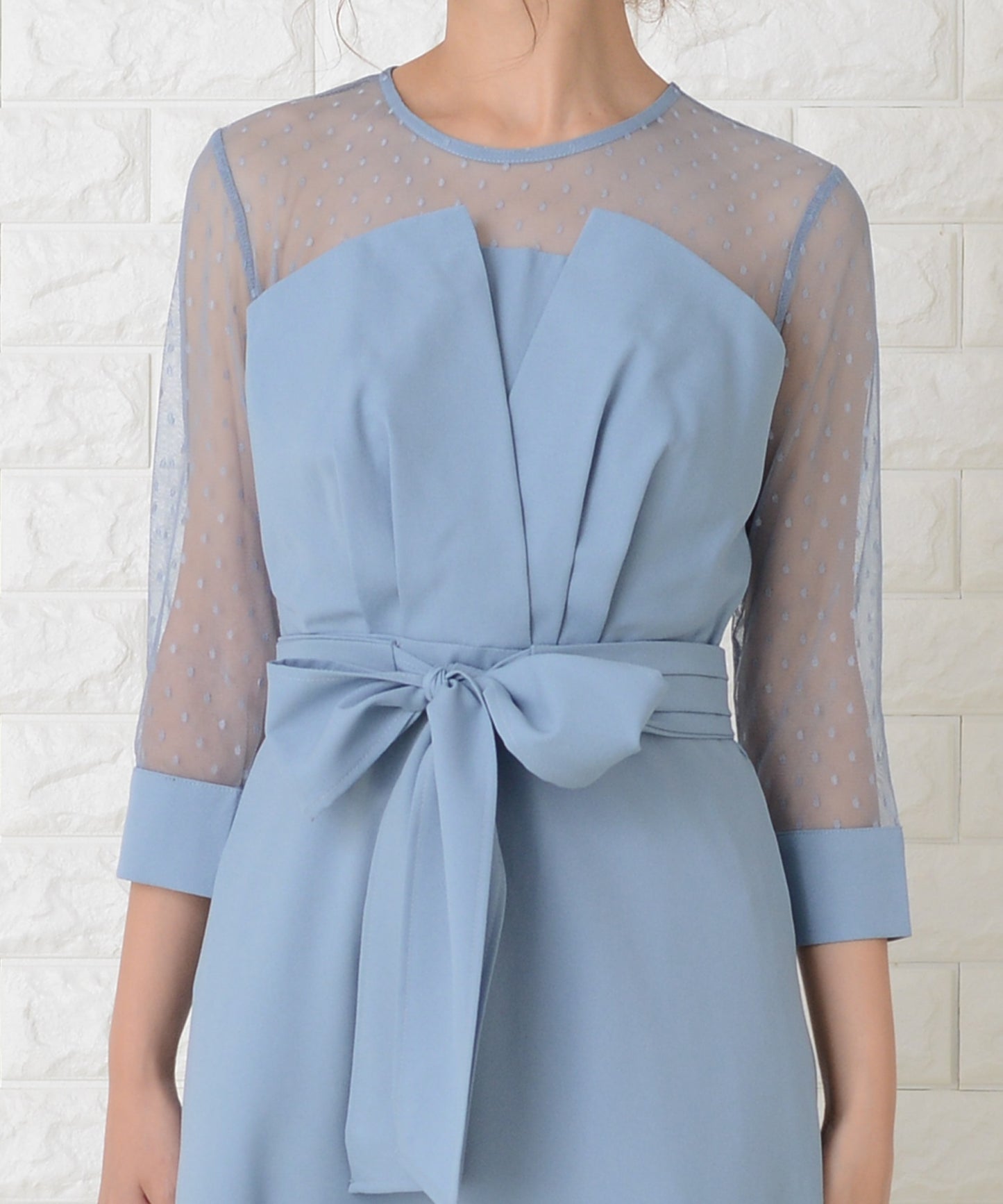 ドット柄7分袖レースリボンベルトフォーマルワンピースドレス