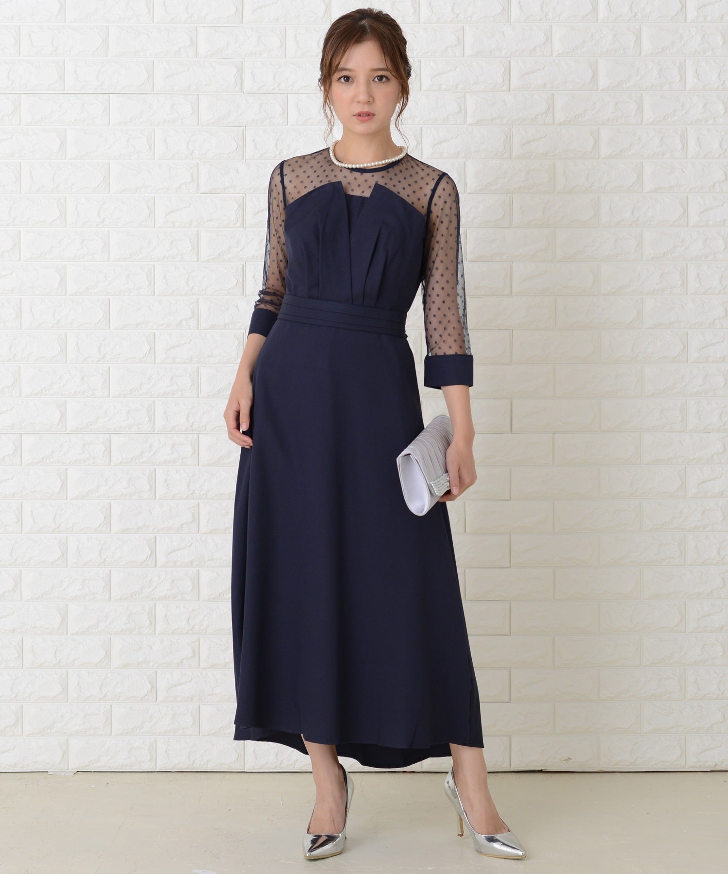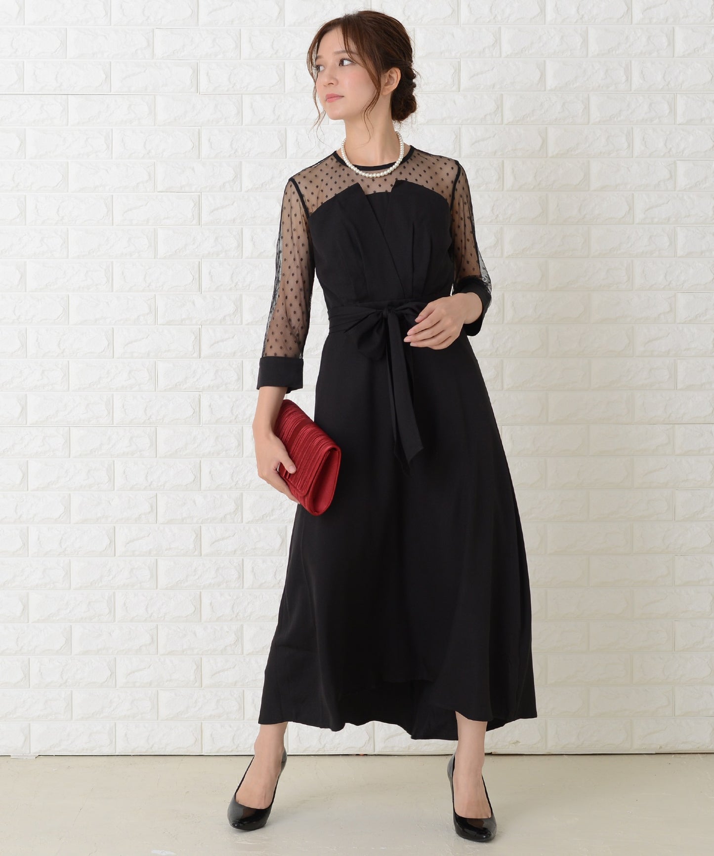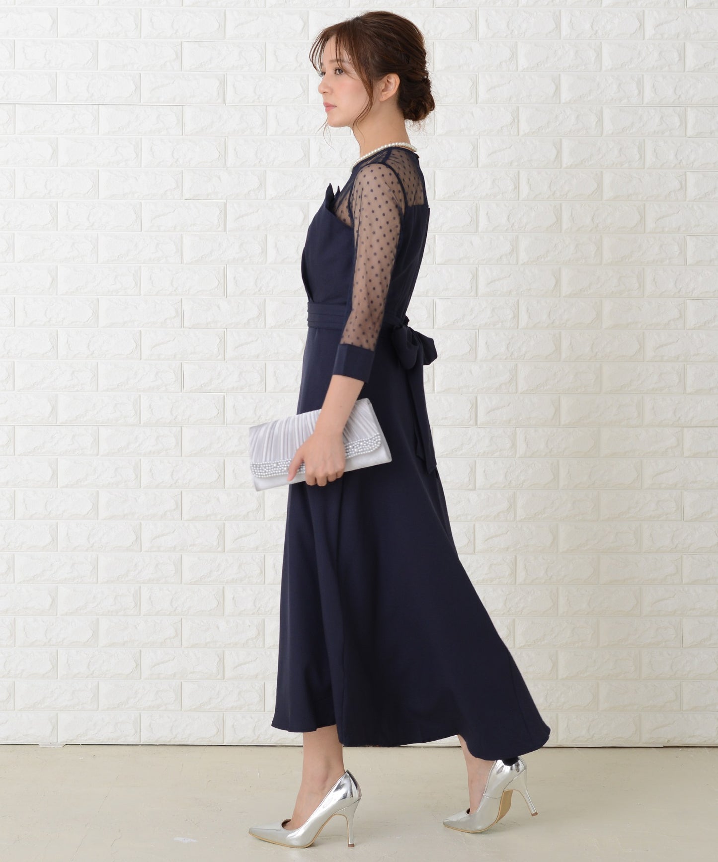 商品説明 | ドット柄のシアー袖が可愛いらしい、上品なロングドレスです。 ウエストのリボンは取り外し可能なので、その日の気分で向きを変えたり、外してみたりと着こなしを選べます。 スカートはきれいなシルエットを描くフレアタイプ。 足の動きに合わせて様々な表情を見せてくれます。 結婚式やパーティなど、華やかなシーンにぴったりのドレスです。 |