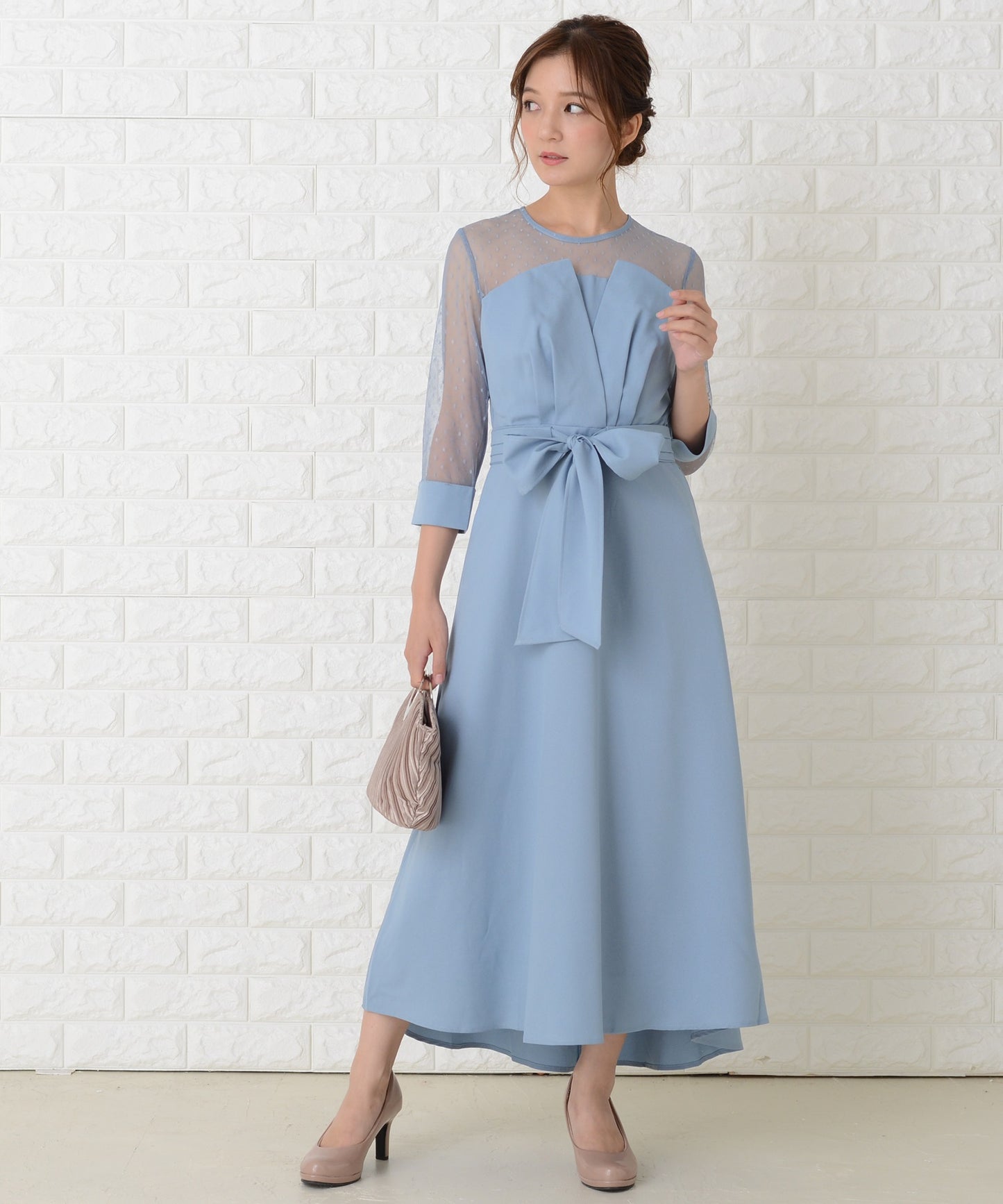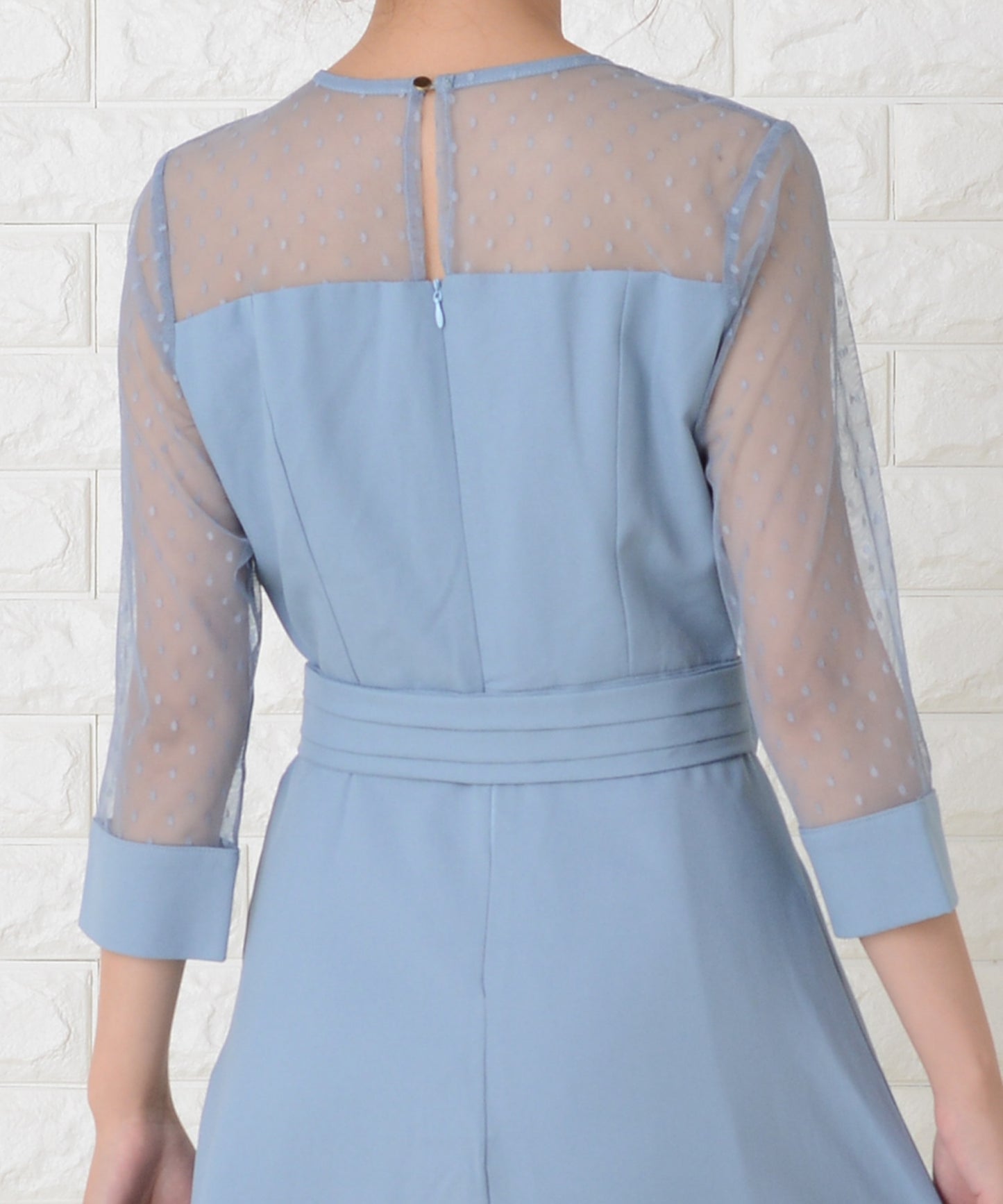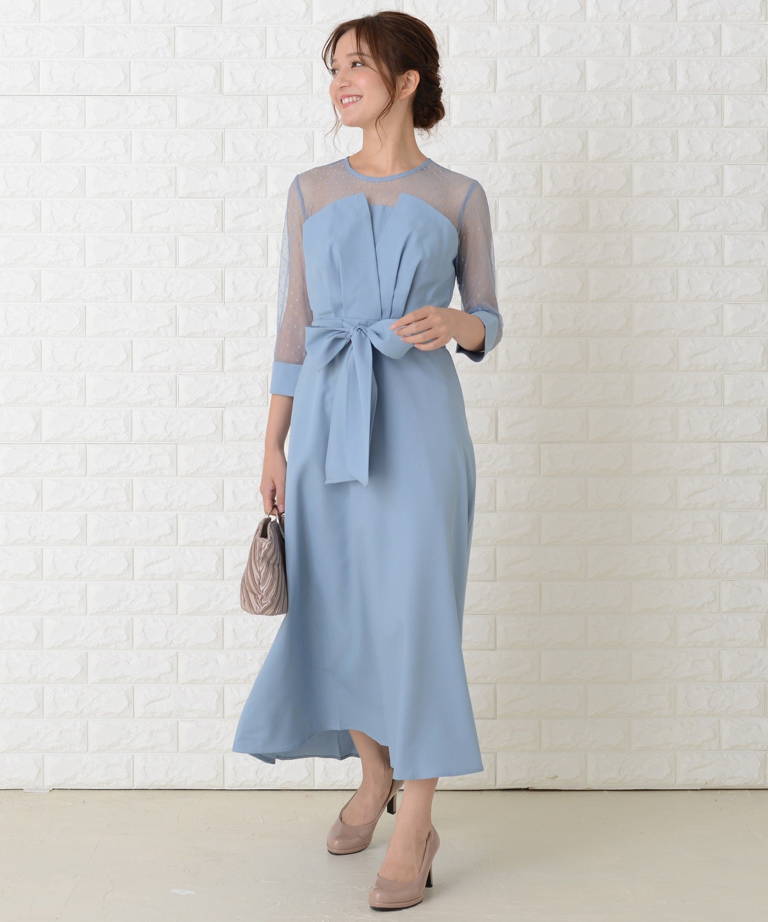 商品説明 | ドット柄のシアー袖が可愛いらしい、上品なロングドレスです。 ウエストのリボンは取り外し可能なので、その日の気分で向きを変えたり、外してみたりと着こなしを選べます。 スカートはきれいなシルエットを描くフレアタイプ。 足の動きに合わせて様々な表情を見せてくれます。 結婚式やパーティなど、華やかなシーンにぴったりのドレスです。 |