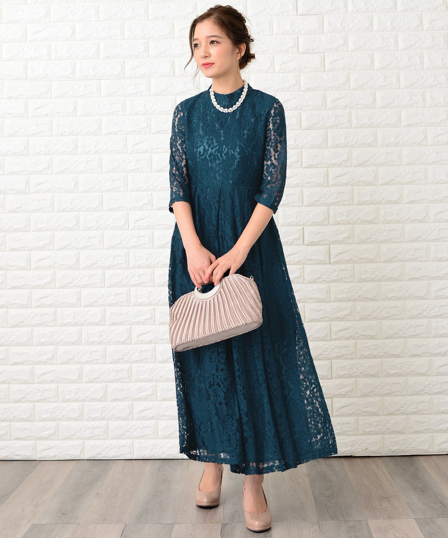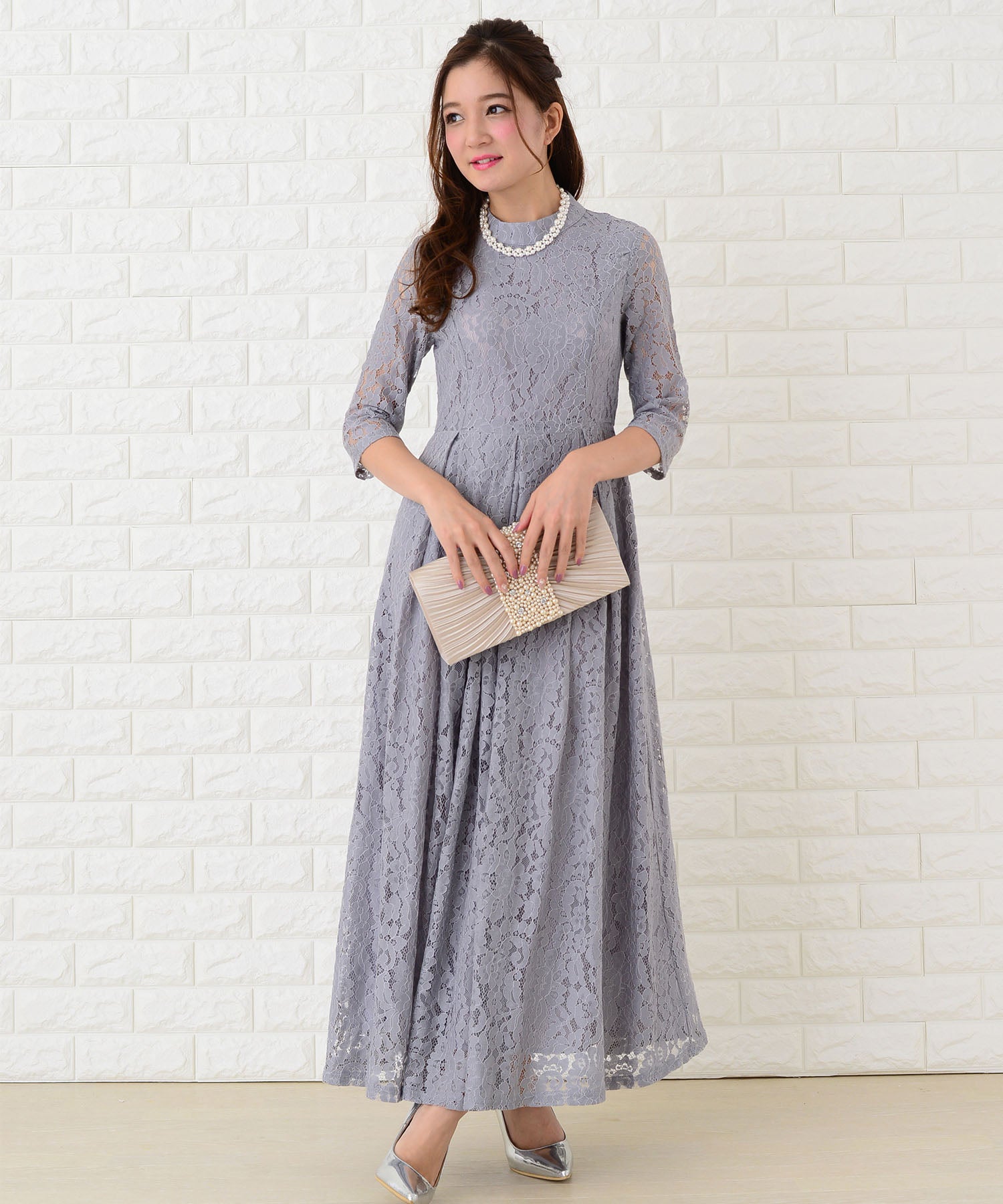 花柄総レースハイネックマキシ丈ワンピース・ドレス
