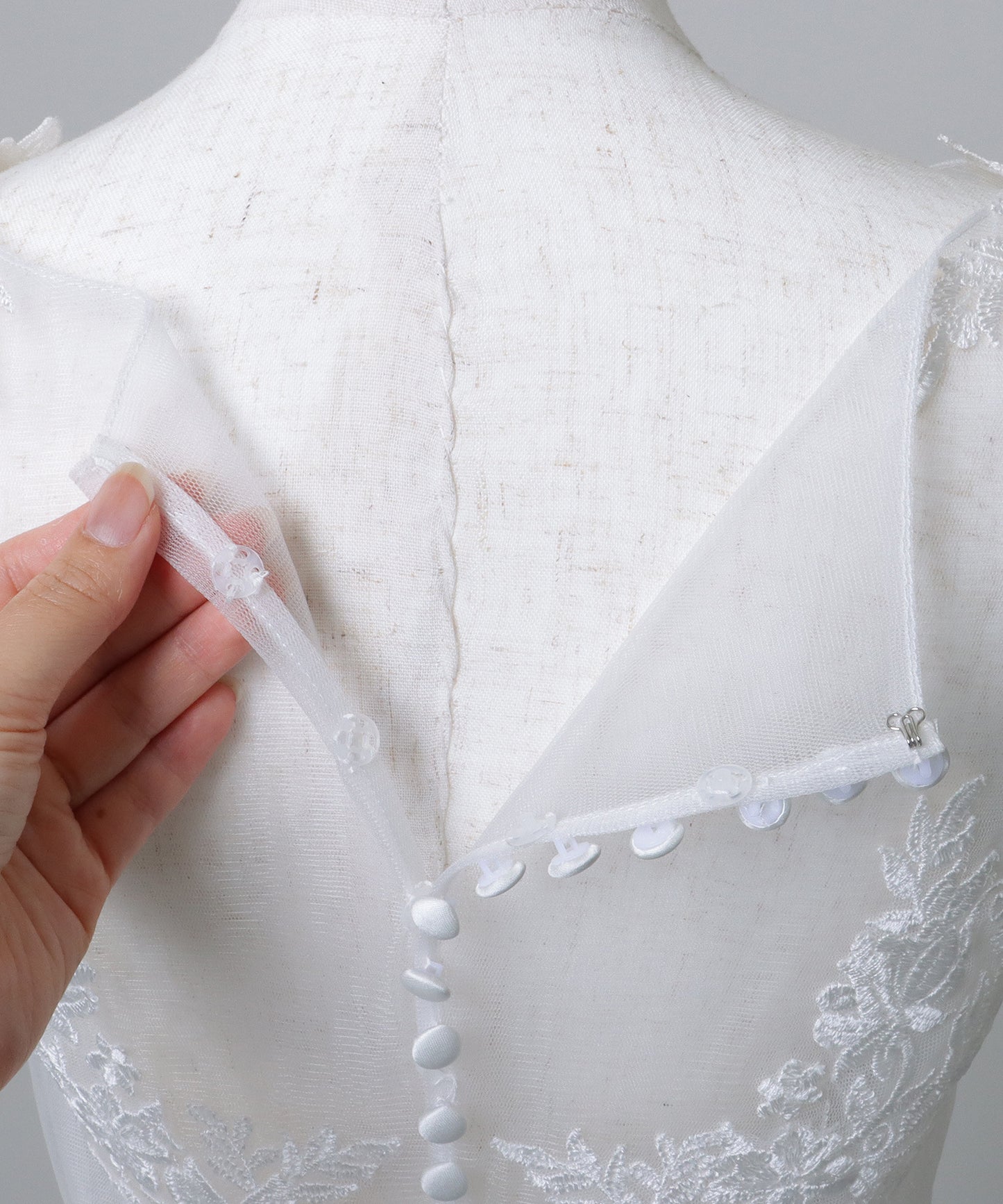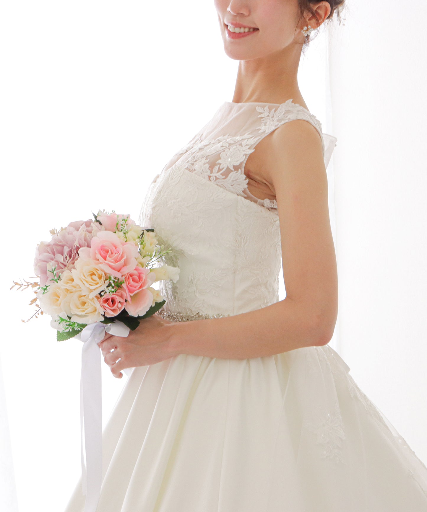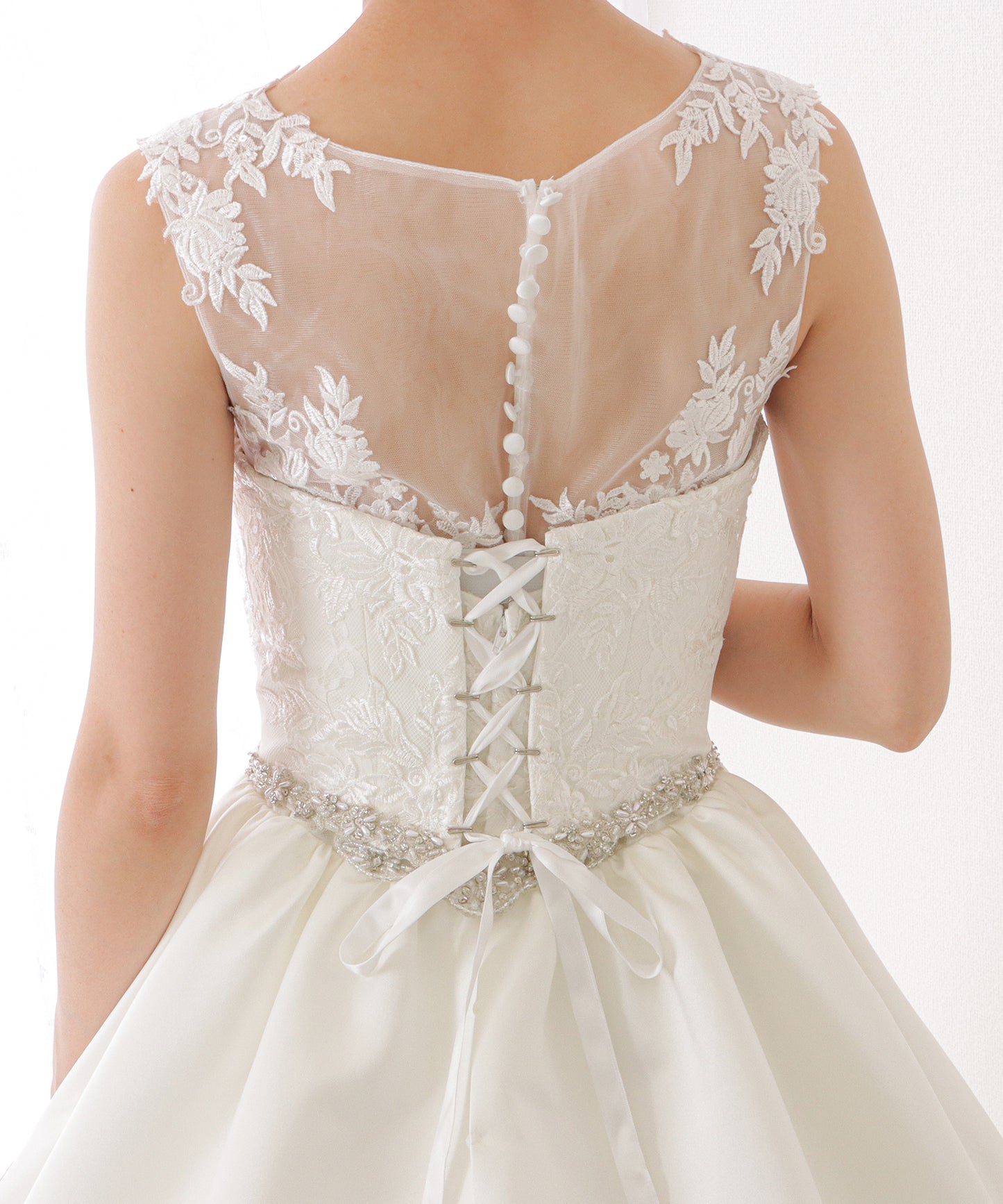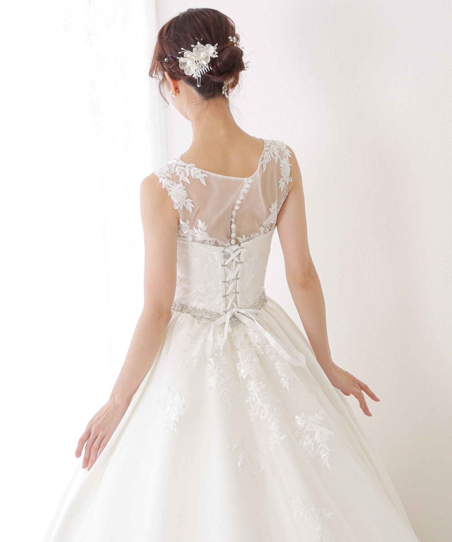 余韻を持たせるように儚げで美しいトレーンは、ほど良い長さで後ろ姿まで可愛らしい印象に。