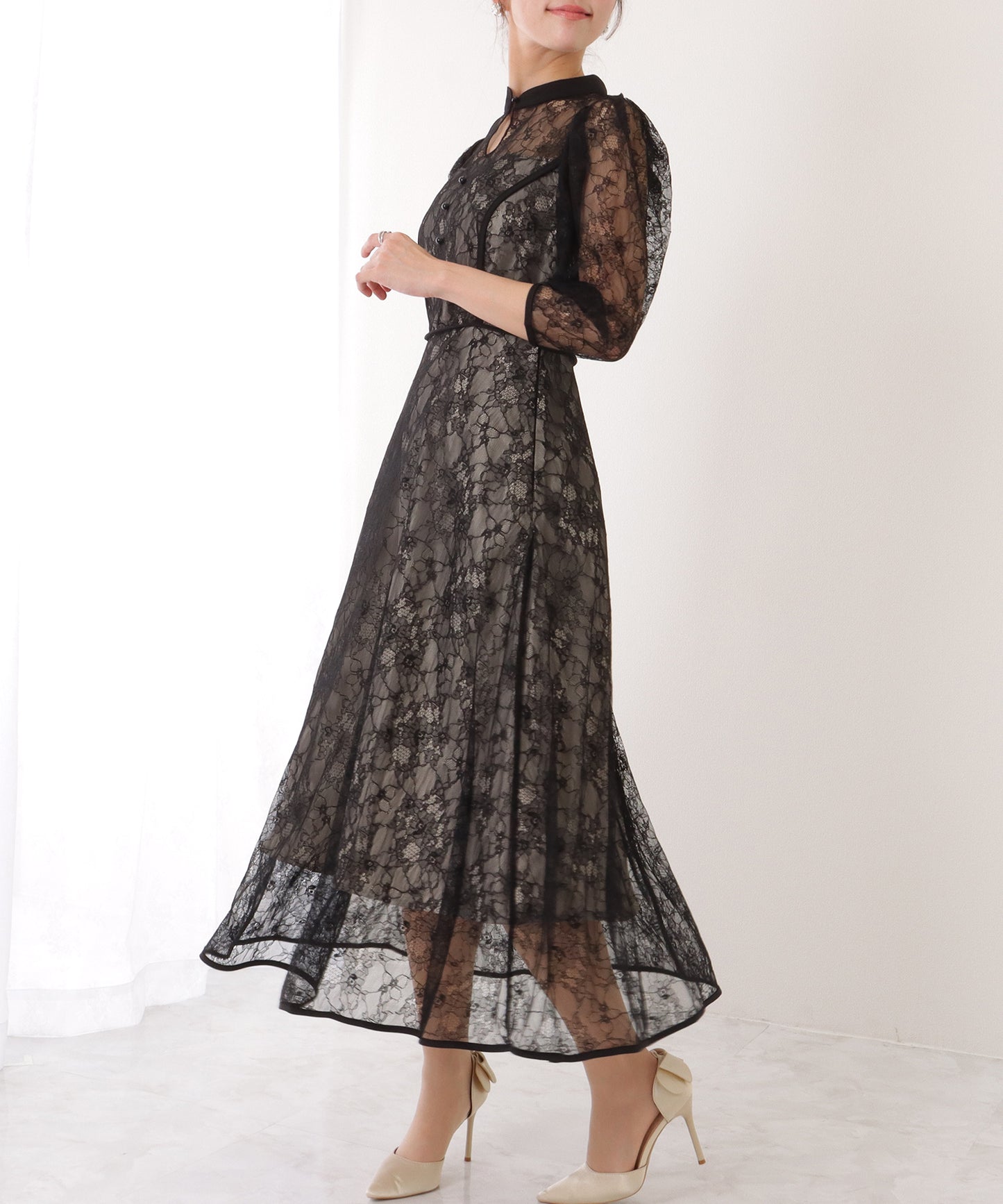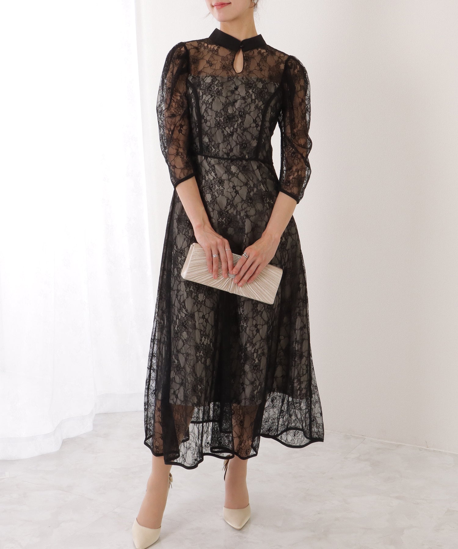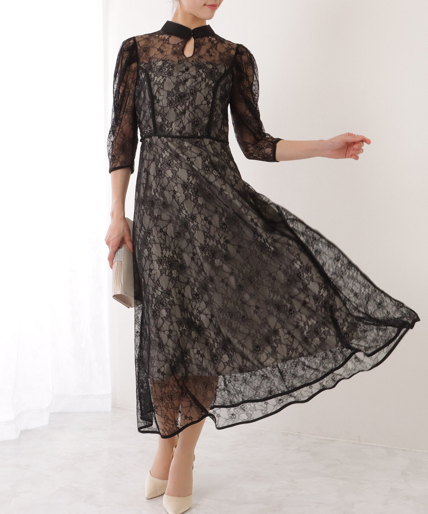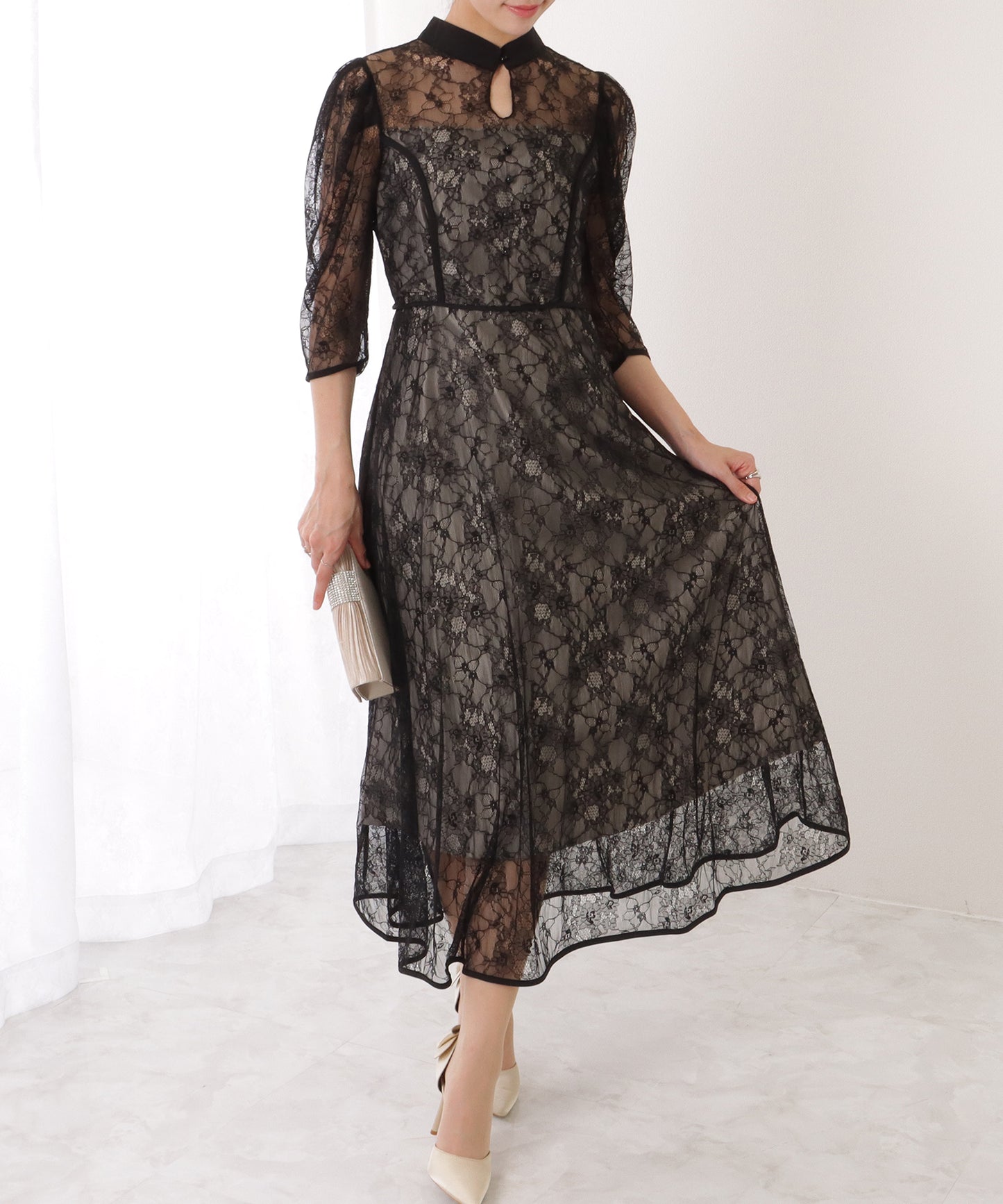 7分袖 総レース 花柄 プチハイネック ワンピース