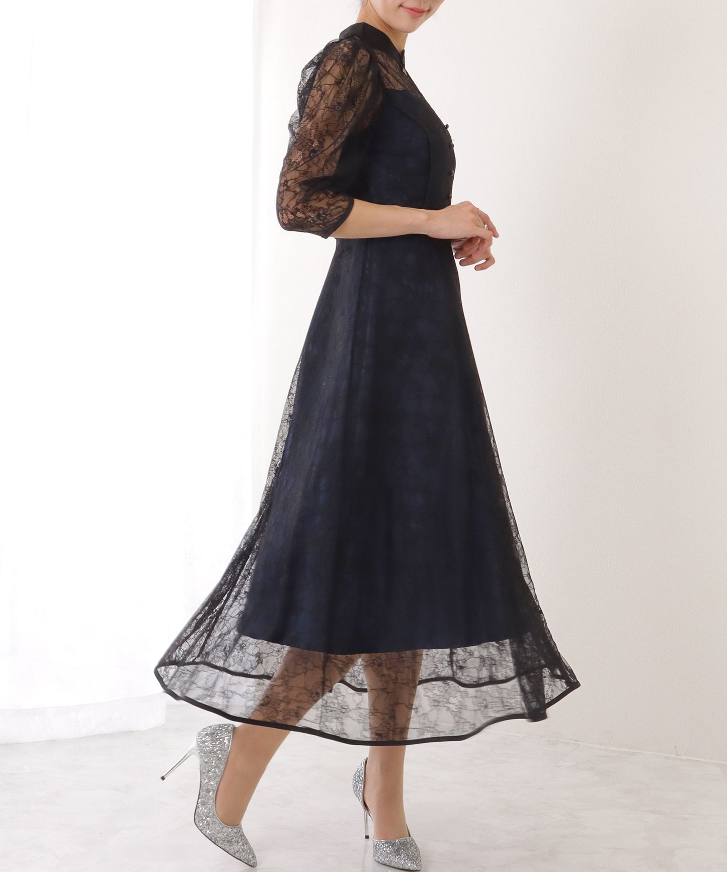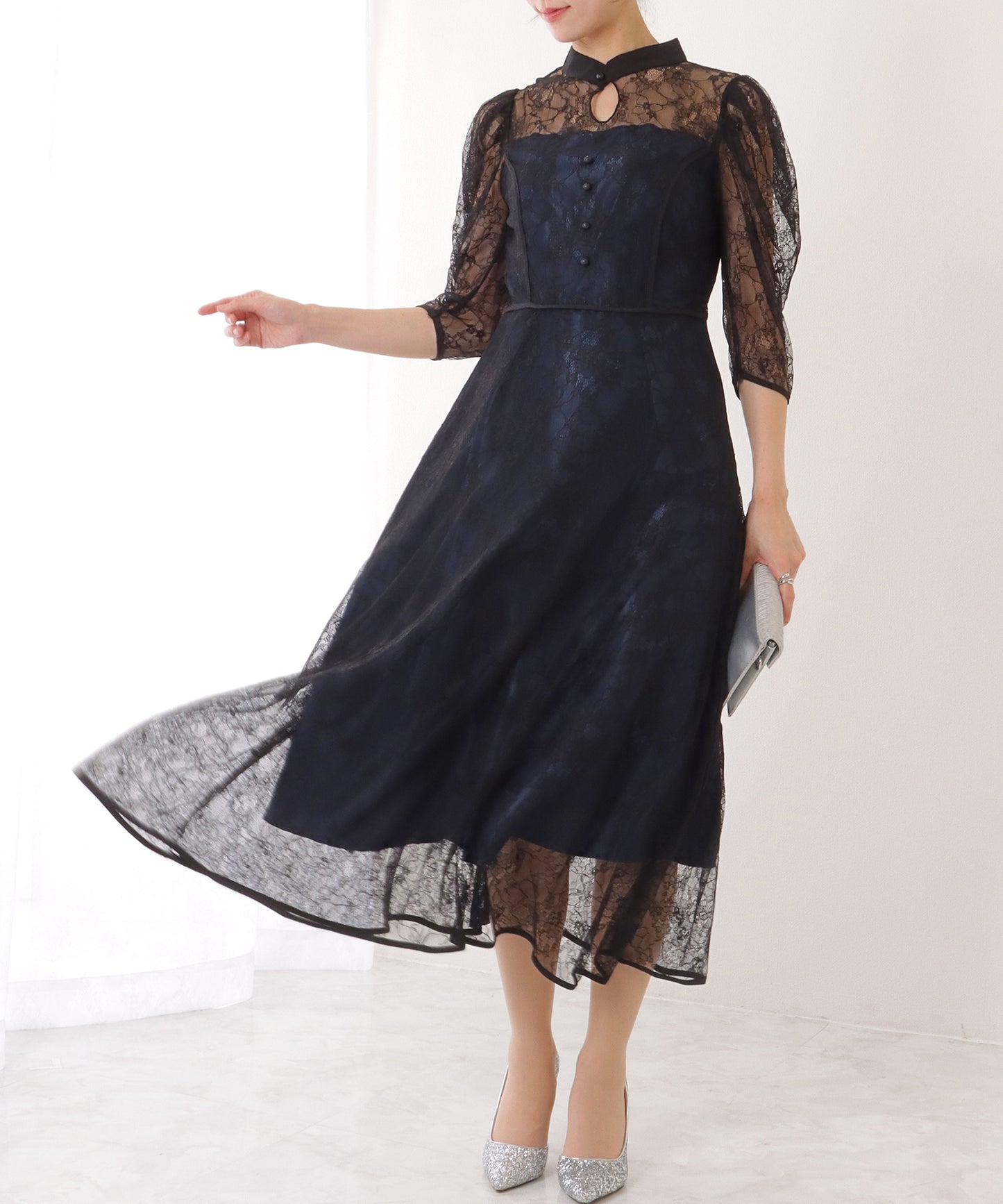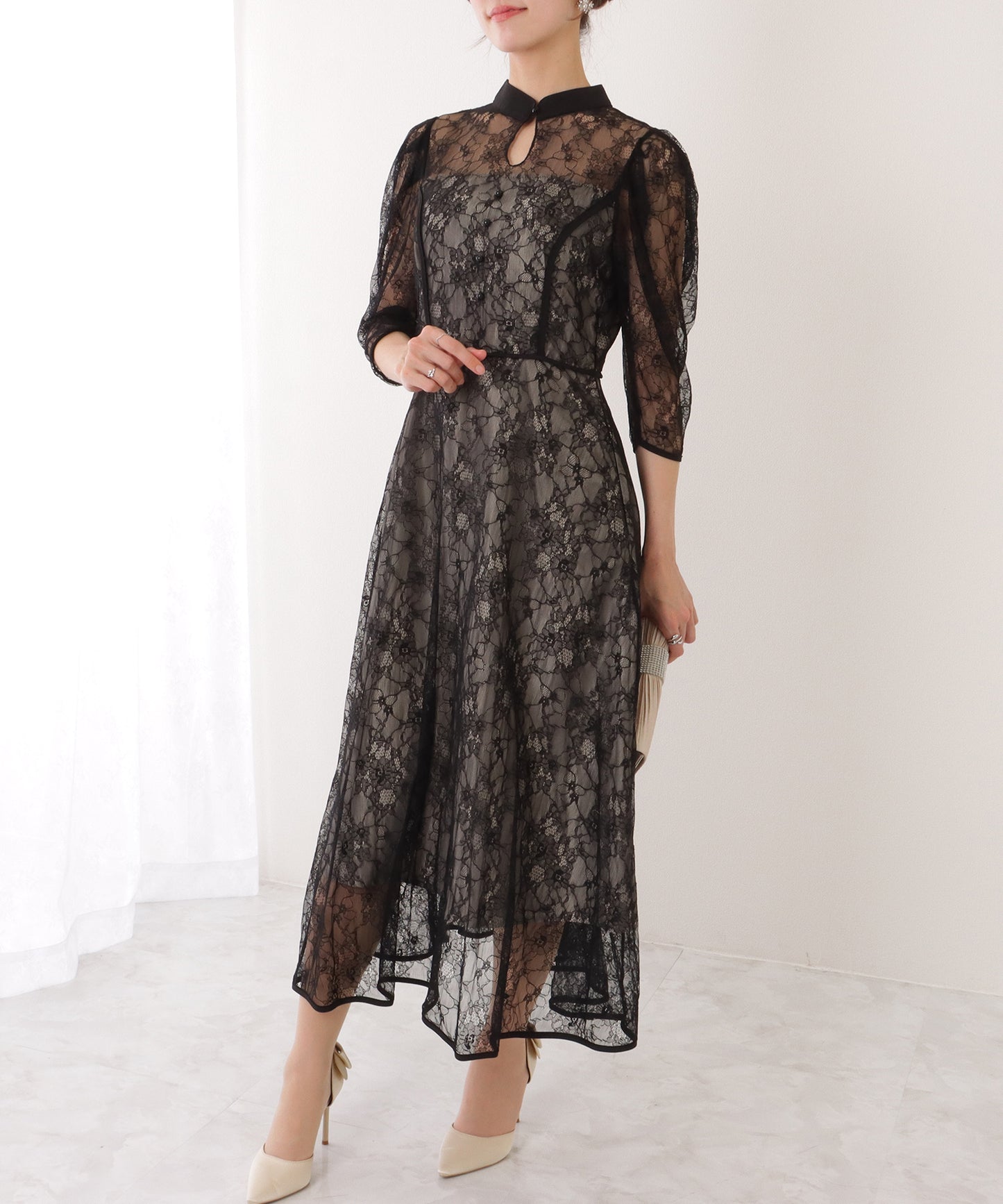 7分袖 総レース 花柄 プチハイネック ワンピース